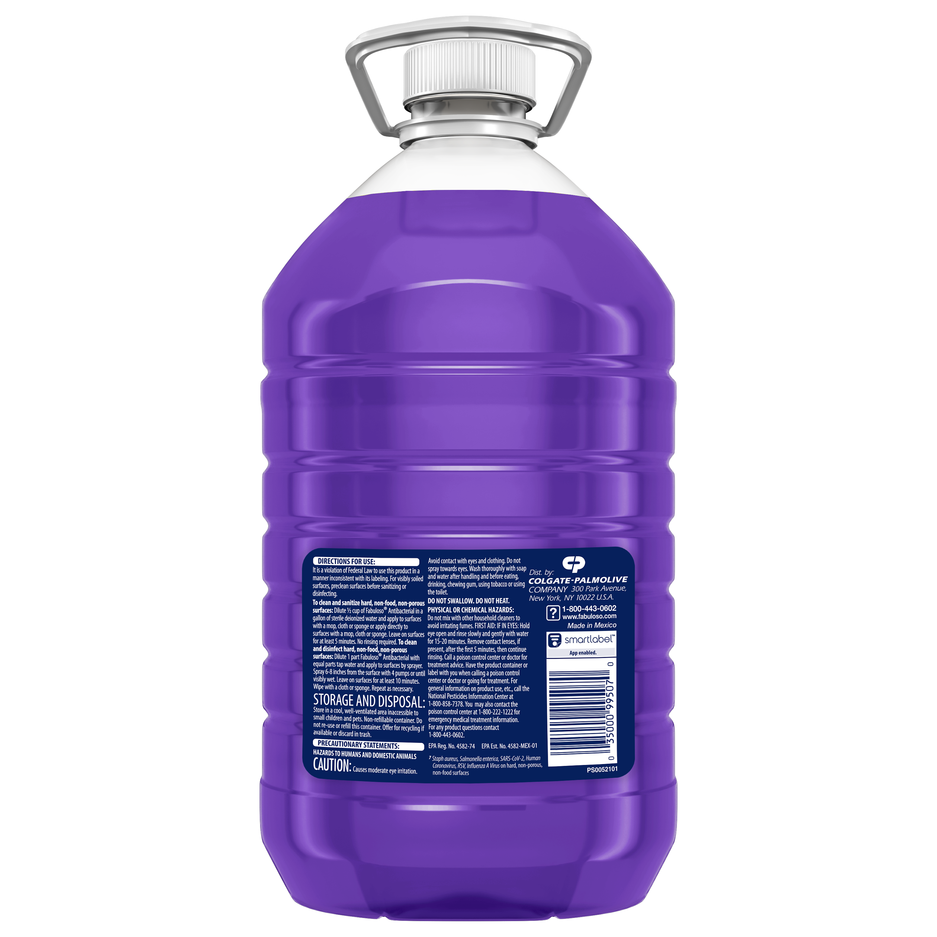 SKU 61018224 Consumer Unit - GTIN 00035000995070 Case - GTIN 10035000995077 Product Category Home Care Product Sub Category Cleaners Liquid / Gel Product Equity (Brand) Fabuloso Product Sub Brand Fabuloso Antibacterial BDC Cln Product Title Fabuloso Antibacterial Multi-Purpose Cleaner, Lavender Scent, 169 oz Product Description Fabuloso Antibacterial multi-purpose cleaner cuts through grease and removes limescale. It also kills 99.9% of viruses and bacteria (7). Fabuloso Antibacterial is an all in one cleaner that can be used on floors, walls, bathrooms, living rooms, and almost every hard surface. For visibly soiled surfaces, preclean surfaces before sanitizing or disinfecting. To clean and sanitize hard, non-food, non-porous surfaces: Dilute 1/2 cup of Fabuloso Antibacterial in a gallon of sterile deionized water and apply to surfaces with a mop, cloth or sponge or apply directly to surfaces with a mop, cloth or sponge. Leave on surfaces for at least 5 minutes. No rinsing required. To clean and disinfect hard, non-food, non-porous surfaces: Dilute 1 part Fabuloso Antibacterial with equal parts tap water and apply to surfaces by sprayer. Spray 6-8 inches from the surface with 4 pumps or until visibly wet. Leave on surfaces for at least 10 minutes. Wipe with a cloth or sponge. Repeat as necessary. And let's not forget the unmistakable fragrance that fills your space with the lavender scent. Experience the power of cleanliness with every wipe! (7) Staph aureus, Salmonella enterica, SARS-CoV-2, Human Coronavirus, RSV, and Influenza A Virus on hard, non-porous, non-food surfaces eCommerce Copy- Long Description Fabuloso® Antibacterial Lavender