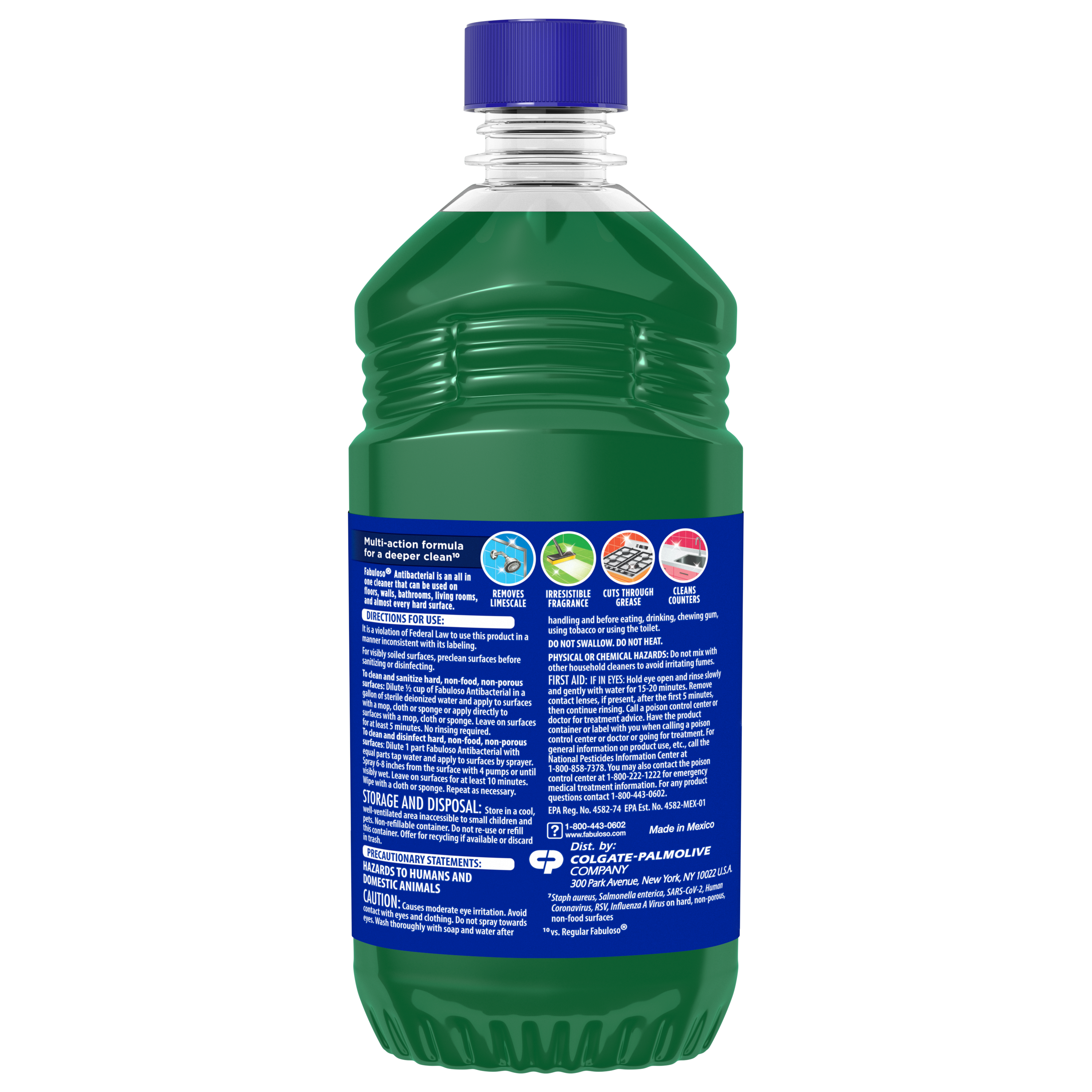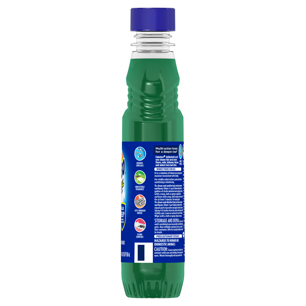 SKU 61018226 Consumer Unit - GTIN 00035000995056 Case - GTIN 10035000995053 Product Category Home Care Product Sub Category Cleaners Liquid / Gel Product Equity (Brand) Fabuloso Product Sub Brand Fabuloso Antibacterial BDC Cln Product Title Fabuloso Antibacterial Multi-Purpose Cleaner, Pine Scent, 16.9 oz Product Description Fabuloso Antibacterial multi-purpose cleaner cuts through grease and removes limescale. It also kills 99.9% of viruses and bacteria (7). Fabuloso Antibacterial is an all in one cleaner that can be used on floors, walls, bathrooms, living rooms, and almost every hard surface. For visibly soiled surfaces, preclean surfaces before sanitizing or disinfecting. To clean and sanitize hard, non-food, non-porous surfaces: Dilute 1/2 cup of Fabuloso Antibacterial in a gallon of sterile deionized water and apply to surfaces with a mop, cloth or sponge or apply directly to surfaces with a mop, cloth or sponge. Leave on surfaces for at least 5 minutes. No rinsing required. To clean and disinfect hard, non-food, non-porous surfaces: Dilute 1 part Fabuloso Antibacterial with equal parts tap water and apply to surfaces by sprayer. Spray 6-8 inches from the surface with 4 pumps or until visibly wet. Leave on surfaces for at least 10 minutes. Wipe with a cloth or sponge. Repeat as necessary. And let's not forget the unmistakable fragrance that fills your space with the pine scent. Experience the power of cleanliness with every wipe! (7) Staph aureus, Salmonella enterica, SARS-CoV-2, Human Coronavirus, RSV, and Influenza A Virus on hard, non-porous, non-food surfaces eCommerce Copy- Long Description Fabuloso® Antibacterial Pine