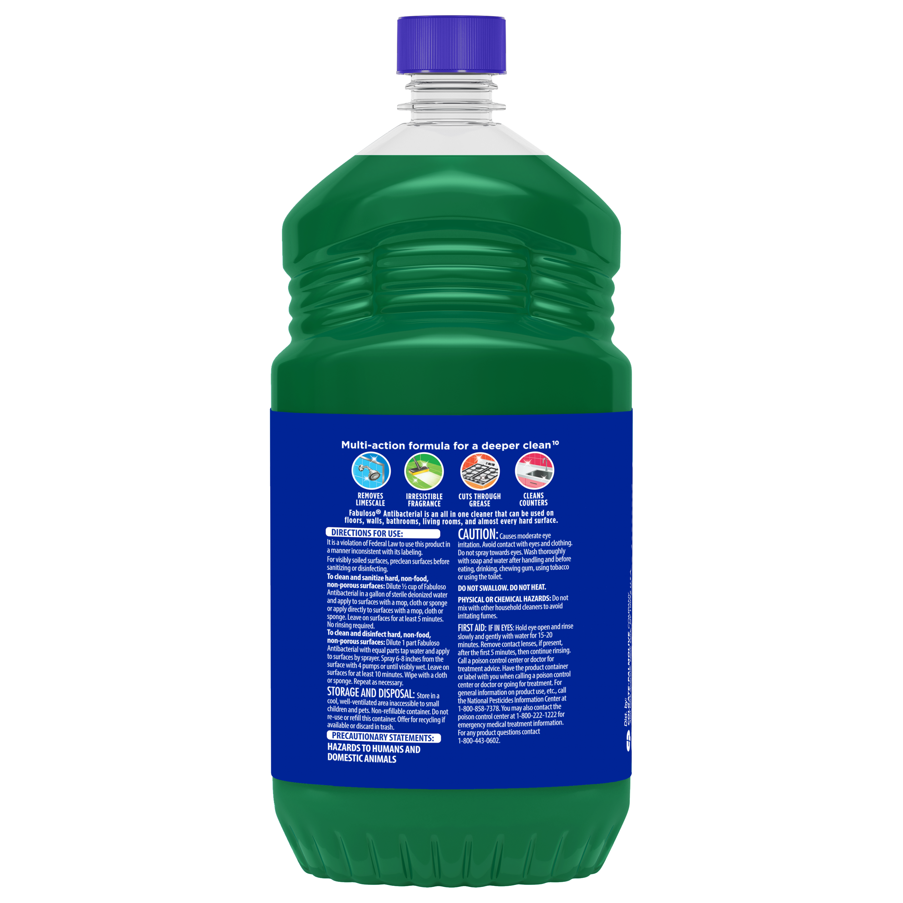 SKU 61018228 Consumer Unit - GTIN 00035000995032 Case - GTIN 10035000995039 Product Category Home Care Product Sub Category Cleaners Liquid / Gel Product Equity (Brand) Fabuloso Product Sub Brand Fabuloso Antibacterial BDC Cln Product Title Fabuloso Antibacterial Multi-Purpose Cleaner, Pine Scent, 48 oz Product Description Fabuloso Antibacterial multi-purpose cleaner cuts through grease and removes limescale. It also kills 99.9% of viruses and bacteria (7). Fabuloso Antibacterial is an all in one cleaner that can be used on floors, walls, bathrooms, living rooms, and almost every hard surface. For visibly soiled surfaces, preclean surfaces before sanitizing or disinfecting. To clean and sanitize hard, non-food, non-porous surfaces: Dilute 1/2 cup of Fabuloso Antibacterial in a gallon of sterile deionized water and apply to surfaces with a mop, cloth or sponge or apply directly to surfaces with a mop, cloth or sponge. Leave on surfaces for at least 5 minutes. No rinsing required. To clean and disinfect hard, non-food, non-porous surfaces: Dilute 1 part Fabuloso Antibacterial with equal parts tap water and apply to surfaces by sprayer. Spray 6-8 inches from the surface with 4 pumps or until visibly wet. Leave on surfaces for at least 10 minutes. Wipe with a cloth or sponge. Repeat as necessary. And let's not forget the unmistakable fragrance that fills your space with the pine scent. Experience the power of cleanliness with every wipe! (7) Staph aureus, Salmonella enterica, SARS-CoV-2, Human Coronavirus, RSV, and Influenza A Virus on hard, non-porous, non-food surfaces eCommerce Copy- Long Description Fabuloso® Antibacterial Pine