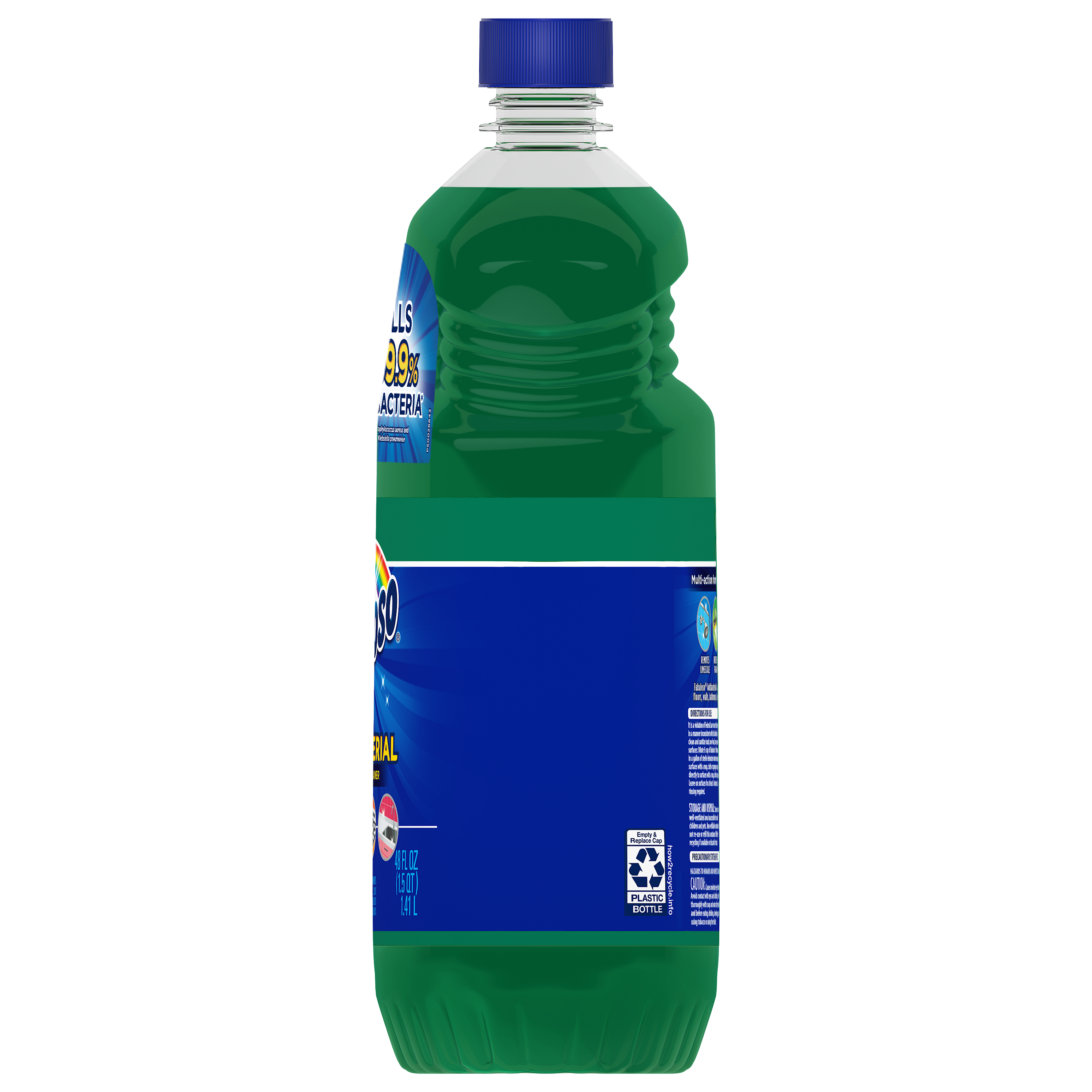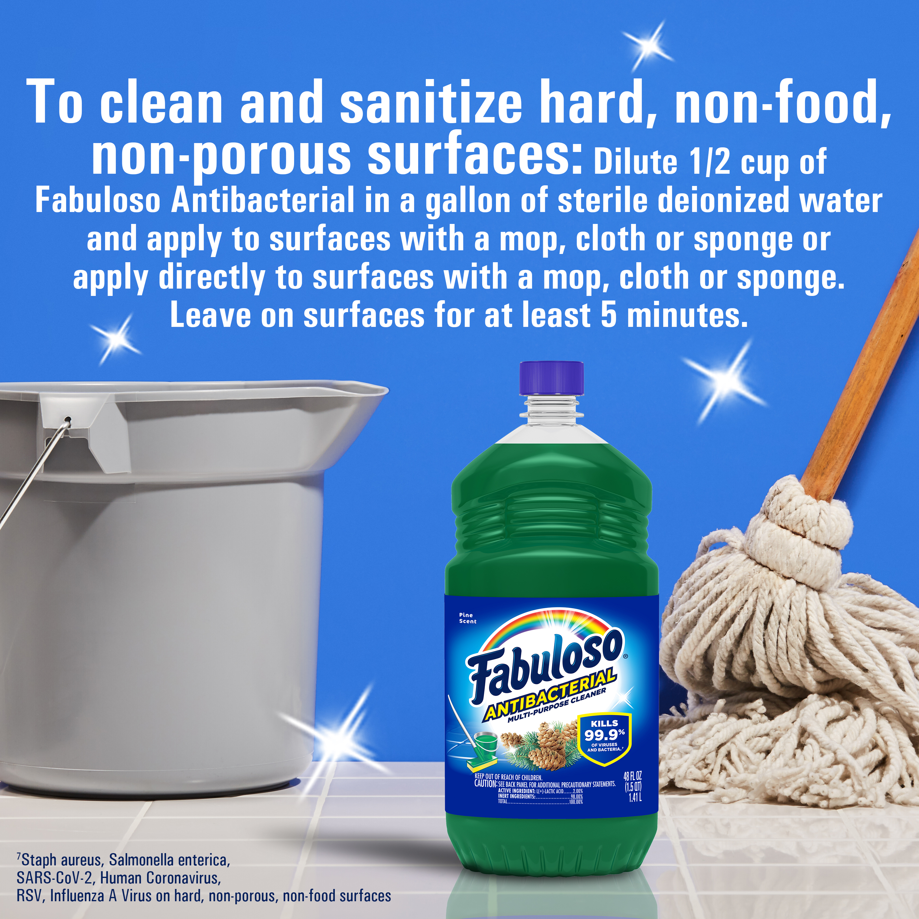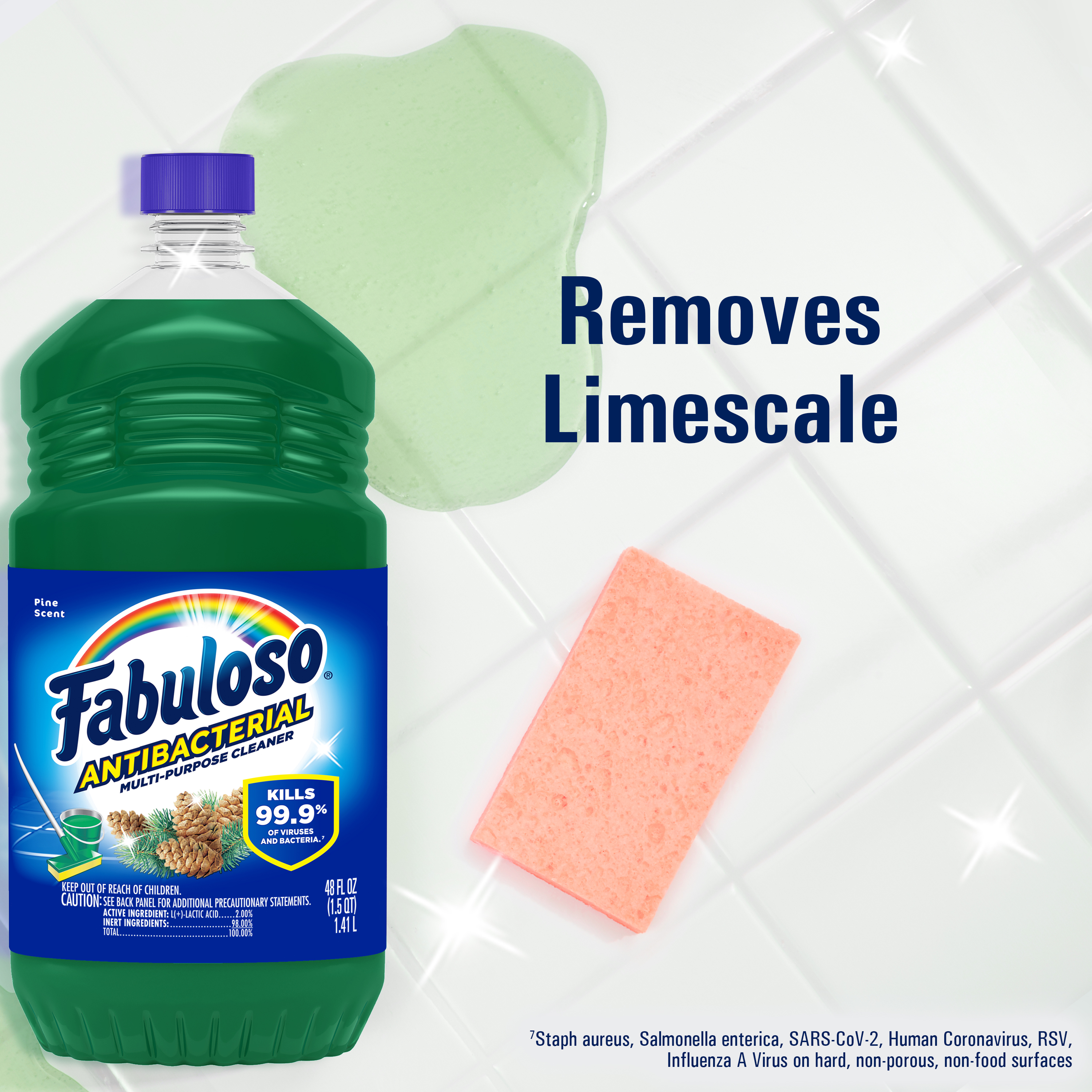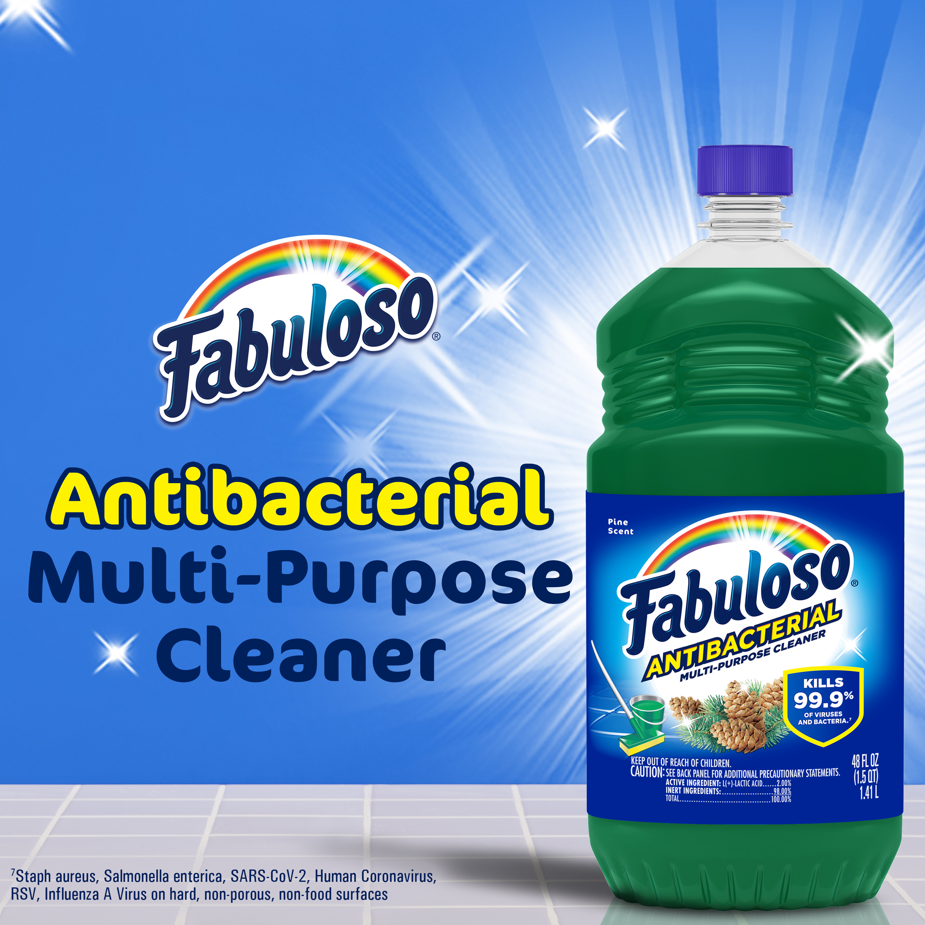 Bullet 1 One 48 oz Bottle of Fabuloso Antibacterial Multi-Purpose Cleaner, Pine Scent Bullet 2 Kills 99.9% of viruses and bacteria (7) and leaves surfaces clean and disinfected Bullet 3 This multi-action formula cuts through grease, removes limescale, cleans counters, and has an irresistible fragrance Bullet 4 Fills your space with the pine scent Bullet 5 This all in one cleaner can be used on floors, walls, bathrooms, living rooms, and almost every hard surface Bullet 6 For visibly soiled surfaces, preclean surfaces before sanitizing or disinfecting Bullet 7 See the back of bottle for directions for use Active Ingredients L-Lactic Acid (2.00%)