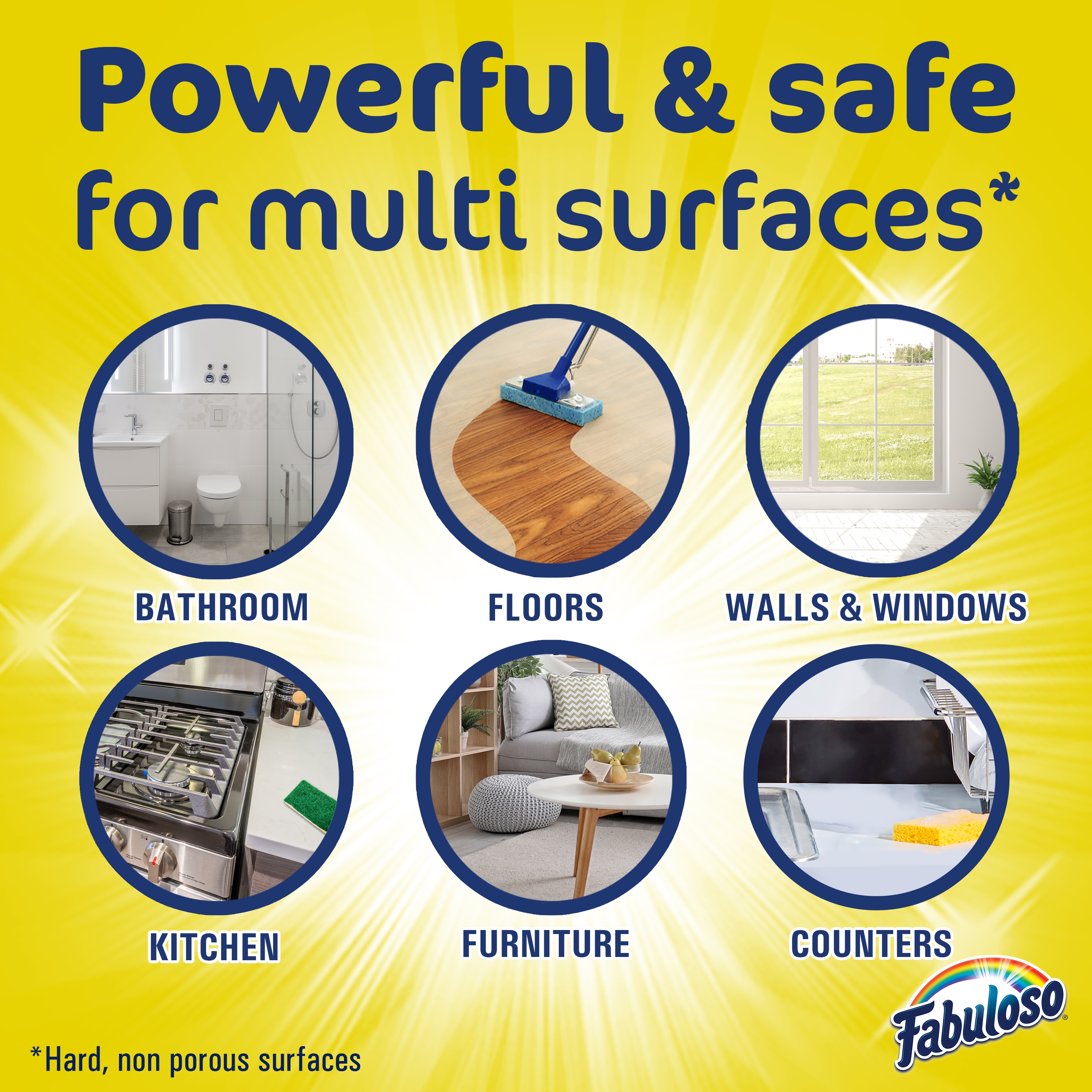 SKU 61018230 Consumer Unit - GTIN 00035000995018 Case - GTIN 10035000995015 Product Category Home Care Product Sub Category Cleaners Liquid / Gel Product Equity (Brand) Fabuloso Product Sub Brand Fabuloso Liq Cln Product Title Fabuloso Original Multi-Purpose Cleaner, Lemon Scent, 22 oz Product Description Experience the incredible cleaning power of Fabuloso Original Multi-Purpose Cleaner for your household cleaning needs. Fabuloso Original combines powerful cleaning capabilities with a refreshing, long-lasting lemon scent, ensuring that your home is left pristine and fragrant. Say goodbye to visible residue and the hassle of rinsing. Versatility is key, and Fabuloso Original delivers. From sinks and toilets to tubs, showers, and floors, Fabuloso Original is suitable for a wide range of surfaces. It's also safe for use on sealed wood surfaces, appliances, counters, windows, mirrors, walls, doorknobs, and even furniture. With Fabuloso Original, you have one powerful cleaner for your cleaning needs. Whether you prefer using a bucket or a sponge, Fabuloso Original offers flexibility in application. For bucket cleaning, just mix 1/4 cup of Fabuloso Original with a gallon of water, and you're ready to tackle any mess. Alternatively, pour Fabuloso Original directly onto a sponge for convenient and effective spot cleaning. Experience the joy of a clean and fresh home with Fabuloso Original Multi-Purpose Cleaner. Its delightful lemon scent will provide long lasting freshness, creating an inviting and pleasant atmosphere. Make Fabuloso Original a part of your cleaning routine and enjoy the benefits of a versatile, residue-free cleaner that leaves a long-lasting scent. eCommerce Copy- Long Description Fabuloso® Original Multi-Purpose Cleaner, Lemon Scent Fabuloso® Original Multi-Purpose Cleaner transforms your entire home with a fresh, uplifting scent that lasts and lasts. Bring the soothing fragrance of lemon indoors, and experience a warm, joyful feeling your friends and family will love. Every colorful pour from the easy-pour mechanism delivers a long-lasting, unmistakable freshness that leaves your home bright, shiny and sparkling clean, without having to rinse or scrub. Use Fabuloso® Multi-Purpose Cleaner on sinks, toilets, tubs, showers, floors, sealed wood surfaces, appliances, counter tops, windows, mirrors, walls, doorknobs and furniture, and fill every room in your home with joy. Uplifting fragrances. Spotless surfaces. Irresistible joy. Life isn’t always easy, but cleaning it up sure can be. Fabuloso® combines unmistakable cleaning power with fresh scents that fill your home with joy, to make it a welcoming place no matter how hard your day. From the kitchen to the bathroom and beyond, Fabuloso® Multi-Purpose cleaner leaves surfaces sparkling, with a wide variety of long-lasting fragrances that deliver hope for a better tomorrow. Try all of our uplifting scents: Lavender, Lemon, Passion of Fruits, Apple Scent with Vinegar, and Orange Scent with Baking Soda. Shared Moments of Joy All Over the World Our story begins in Venezuela, circa the 1980’s. Cleaning products lacked fragrance and distinction. But families wanted lasting scents that kept their homes fresh and clean for hours. Enter the bold colors and joyful fragrances of Fabuloso®! 16 years later, families across America also got to experience the joy: we became a household staple thanks to our rainbow of colors and playful, distinctive scents. Today, across the world, we’re more than cleaning products. We’re a catalyst for joy. Bullet 1 One 22 oz bottle Fabuloso Original Multi-Purpose Cleaner, Lemon Scent Bullet 2 Convenient and no rinsing required Bullet 3 Long-lasting lemon scent for a fresh and inviting atmosphere Bullet 4 Versatile usage on sinks, toilets, tubs, showers, floors, and more Bullet 5 Safe for sealed wood surfaces, appliances, counters, and furniture Bullet 6 With a bucket: Mix 1/4 cup in a gallon of water Bullet 7 With a sponge: Pour on a sponge and clean Dollar Tree RPC 363895