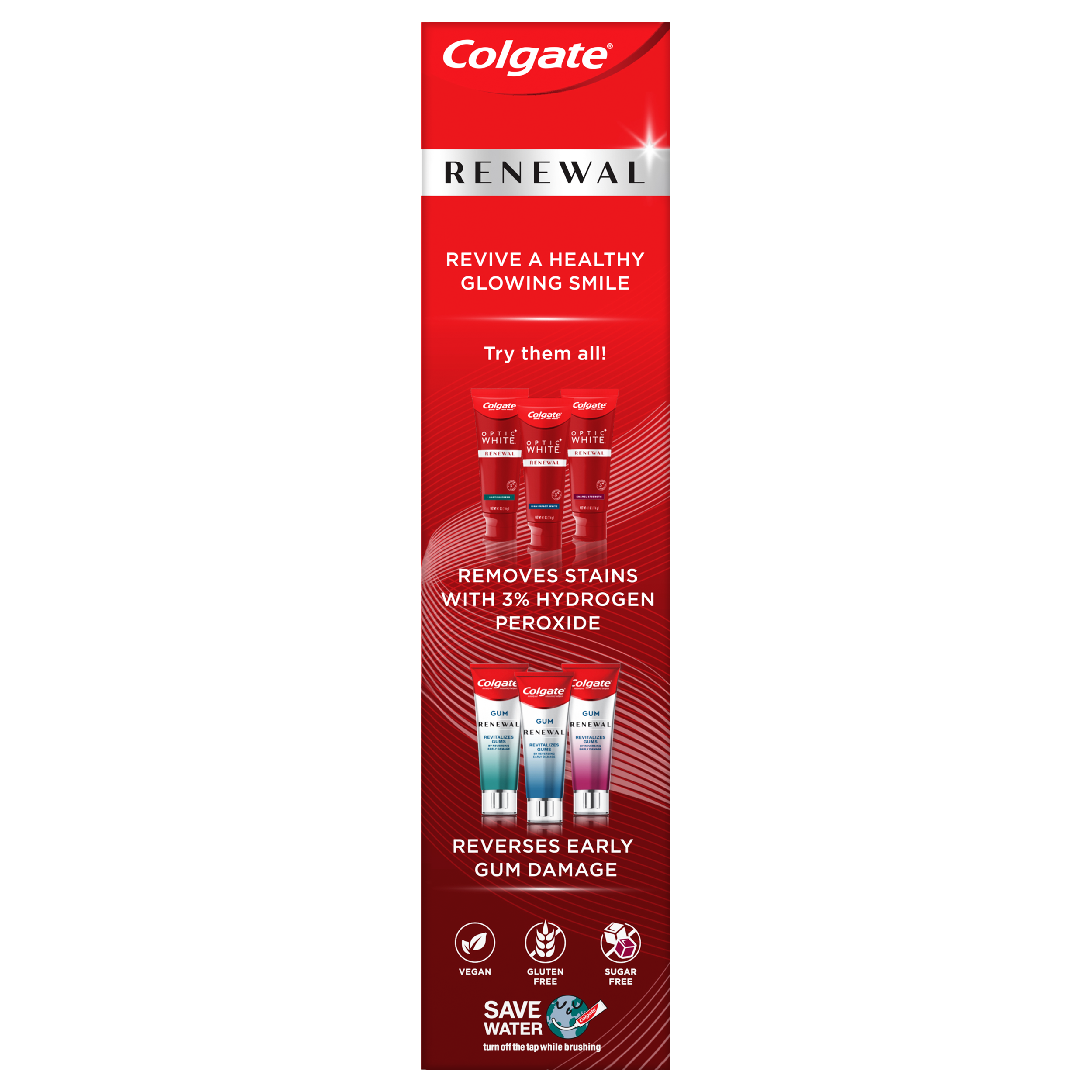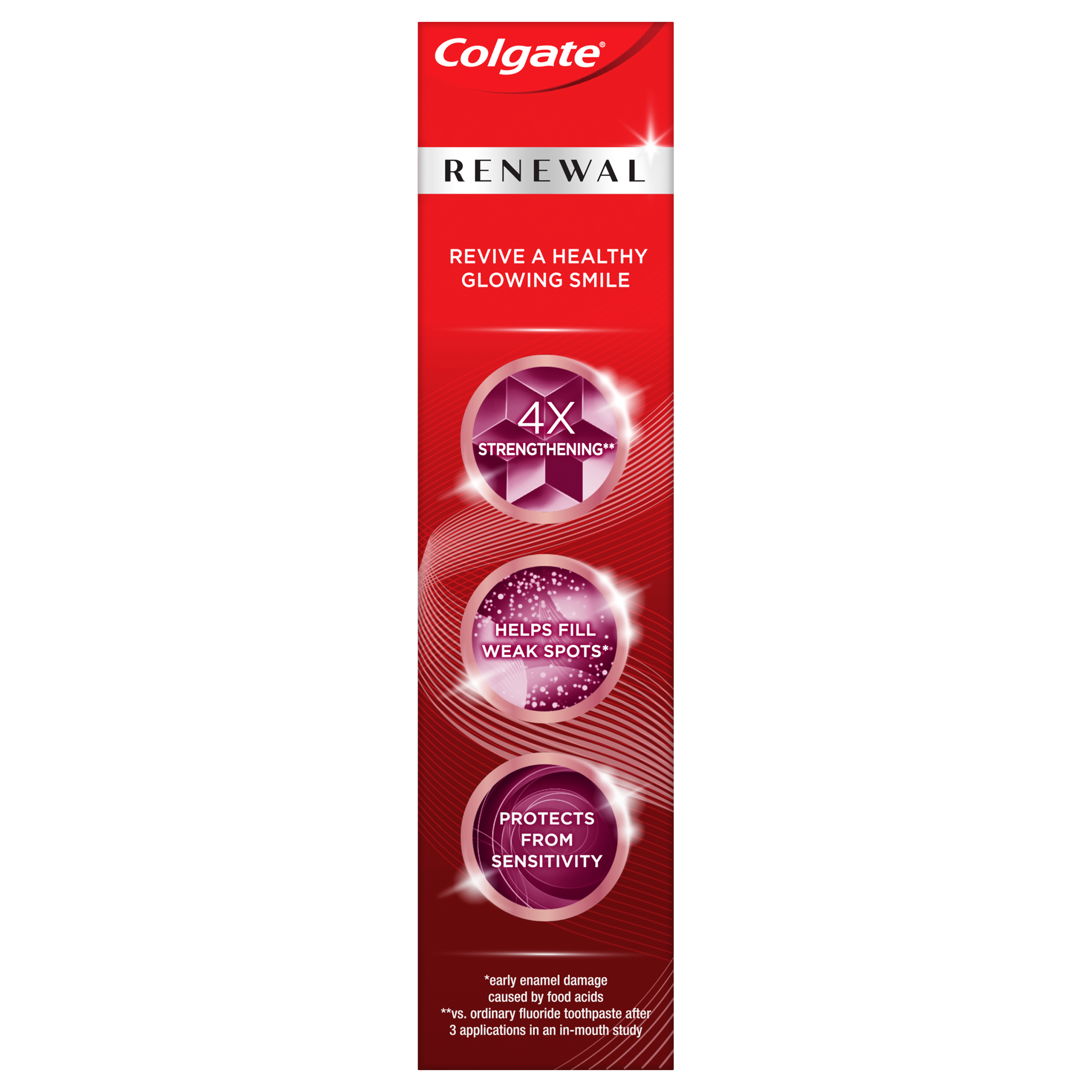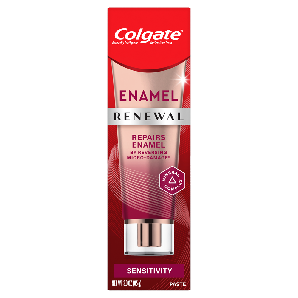 SKU 61018260 Consumer Unit - GTIN 00035000995209 Case - GTIN 10035000995206 Product Category Oral Care Product Sub Category Toothpaste Product Equity (Brand) Colgate Product Sub Brand Colgate Renewal TP Product Title Colgate Enamel Renewal Enamel Repair Toothpaste Sensitivity, Mint Sensitive Toothpaste, 3 Oz Product Description Colgate Enamel Renewal, Sensitivity, 3 Oz Tube Colgate Enamel Renewal Sensitivity repairs enamel by reversing micro-damage.* Revive a healthy glowing smile with this daily enamel repair toothpaste, which protects from sensitivity. Plus, Colgate Enamel Renewal enamel toothpaste strengthens enamel and is enamel-safe for daily use. Help fill weak spots* and repair enamel* with this 4X strengthening** enamel toothpaste. Colgate Enamel Renewal enamel repair toothpaste helps reverse sensitivity, repair enamel through remineralization and renew your smile by removing surface stains. Repair Enamel by Reversing Early Micro-Damage* Colgate Enamel Renewal is an enamel repair toothpaste that repairs enamel by reversing early micro-damage.* It also builds protection from tooth sensitivity so that your smile is healthy and revitalized. Help fill weak spots* and repair enamel* with this 4X strengthening** enamel toothpaste. Try all of the different types of Colgate Enamel Renewal enamel repair toothpaste: Whitening paste for teeth whitening; Sensitivity paste for teeth sensitivity; and Deep Clean to strengthen weakened enamel. Enamel Repair Sensitive Toothpaste That’s Enamel-Safe Colgate Enamel Renewal Sensitivity is a paste toothpaste with a minty flavor that leaves breath fresh and the mouth clean. Plus, this sensitive toothpaste is vegan, sugar-free, gluten-free, and enamel-safe for daily use. Revive a healthy, glowing smile with Colgate Renewal Reverse. Repair. Renew.*** The Colgate Renewal line has solutions for both gum health and enamel health. Try Colgate Gum Renewal to revitalize gums and reverse early damage and Colgate Enamel Renewal to repair enamel by reversing micro-damage.* *early enamel damage caused by food acids **vs. ordinary fluoride toothpaste after 3 applications in an in-mouth study ***Gum Renewal helps reverse early gum disease, repair sensitive areas of the tooth and renew your smile by removing surface stains. Enamel Renewal helps reverse sensitivity, repair enamel through remineralization and renew your smile by removing surface stains. Bullet 1 One 3 oz tube of Colgate Enamel Renewal Enamel Repair Toothpaste Sensitivity Bullet 2 Colgate Enamel Renewal repairs enamel by reversing early micro-damage* Bullet 3 Sensitive toothpaste is enamel-safe for daily use protects from sensitivity Bullet 4 4X strengthening** enamel toothpaste with mineral complex that helps fill weak spots* (*early enamel damage caused by food acids; **vs. ordinary fluoride toothpaste after 3 applications in an in-mouth study) Bullet 5 Helps relieve sensitivity while whitening and repairing enamel* with Colgate Enamel Renewal (*early enamel damage caused by food acids) Bullet 7 Mint toothpaste freshens breath and leaves your mouth feeling clean Bullet 8 Sugar free, gluten free and vegan toothpaste Bullet 9 Sugar free, gluten free and vegan toothpaste