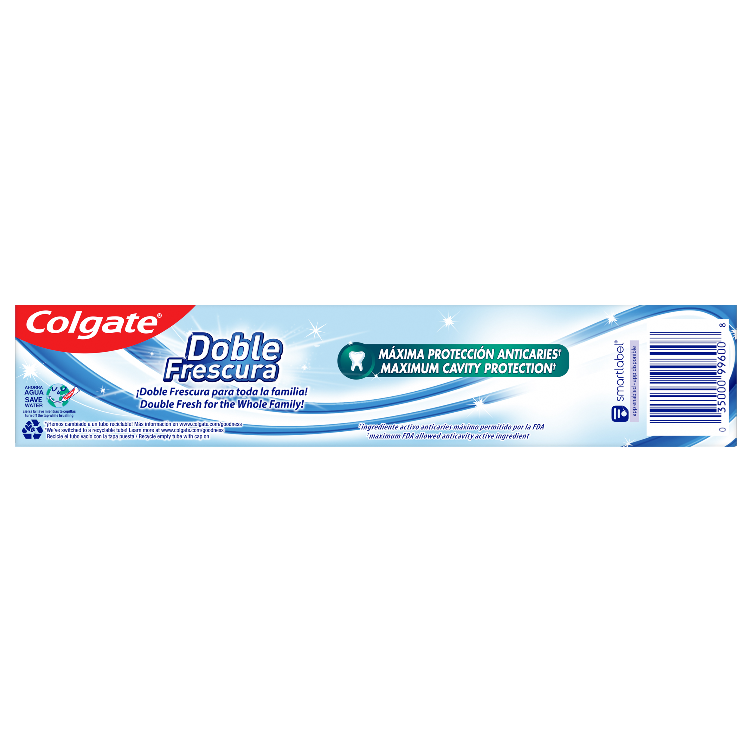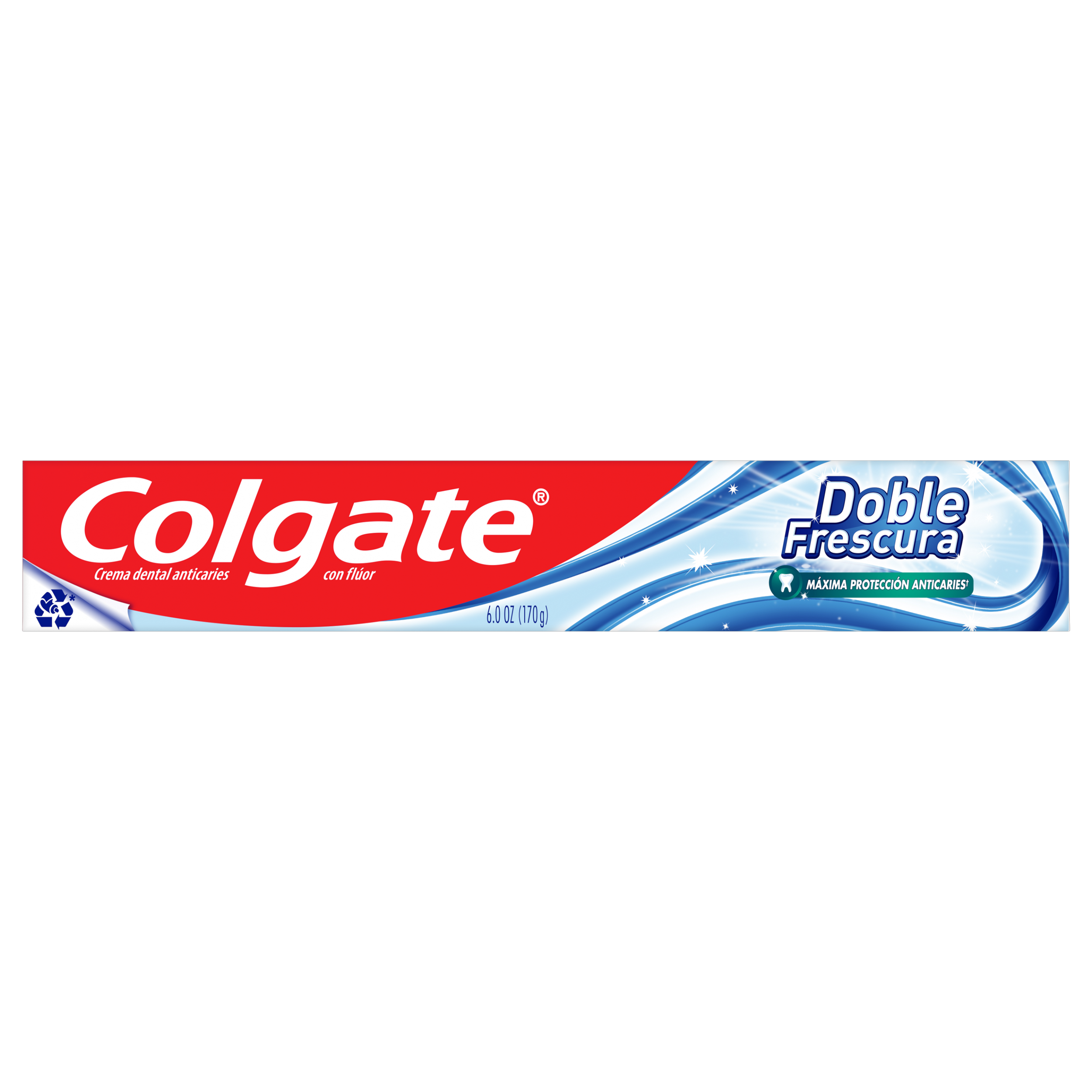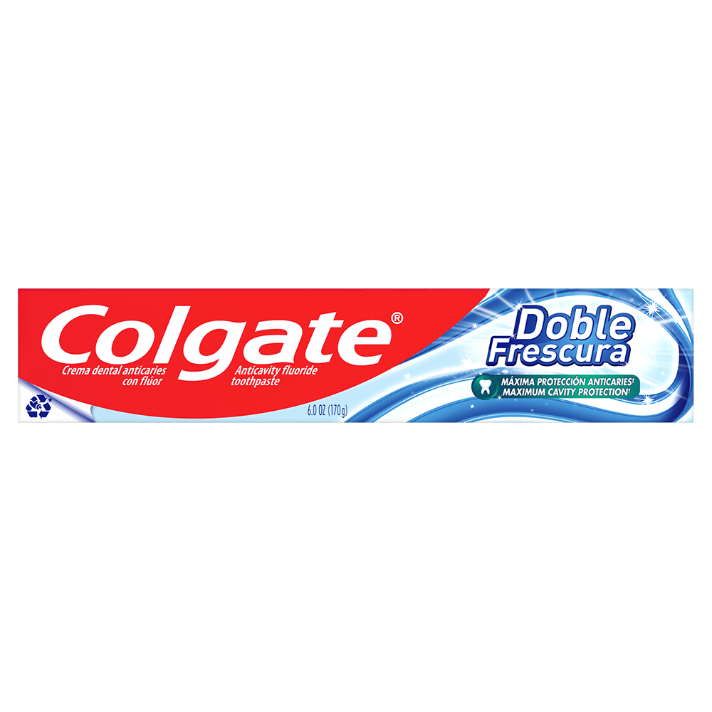 SKU 61018925 Consumer Unit - GTIN 00035000996008 Case - GTIN 10035000996005 Product Category Oral Care Product Sub Category Toothpaste Product Equity (Brand) Colgate Product Sub Brand Colgate Double Freshness TP Product Title Colgate Doble Frescura Crema Dental, Tubo de 6 oz Product Description Colgate Doble Frescura es una crema dental que protege las caries. La crema dental protectora contra las caries refresca el aliento. El sabor refrescante de esta crema dental en gel de menta te deja un aliento fresco para que puedas afrontar tu día con confianza. Crema dental familiar con completa protección para una boca saludable y fresca. Cepillarse adecuadamente los dientes después de cada comida. Tres Veces al día o según la recomendación de su odontólogo. eCommerce Copy- Long Description Colgate Doble Frescura es una crema dental que protege las caries. La crema dental protectora contra las caries refresca el aliento. El sabor refrescante de esta crema dental en gel de menta te deja un aliento fresco para que puedas afrontar tu día con confianza. Crema dental familiar con completa protección para una boca saludable y fresca. Cepillarse adecuadamente los dientes después de cada comida. Tres Veces al día o según la recomendación de su odontólogo. Bullet 1 Uno tubo de crema dental de Colgate Doble Frescura Bullet 2 Máxima protección anticaries* (*ingrediente activo anticaries máximo permitido por la FDA) Bullet 3 Crema dental anticaries de fluor Bullet 4 Aliento fresco Bullet 5 Fortalece y blanquea tus dientes