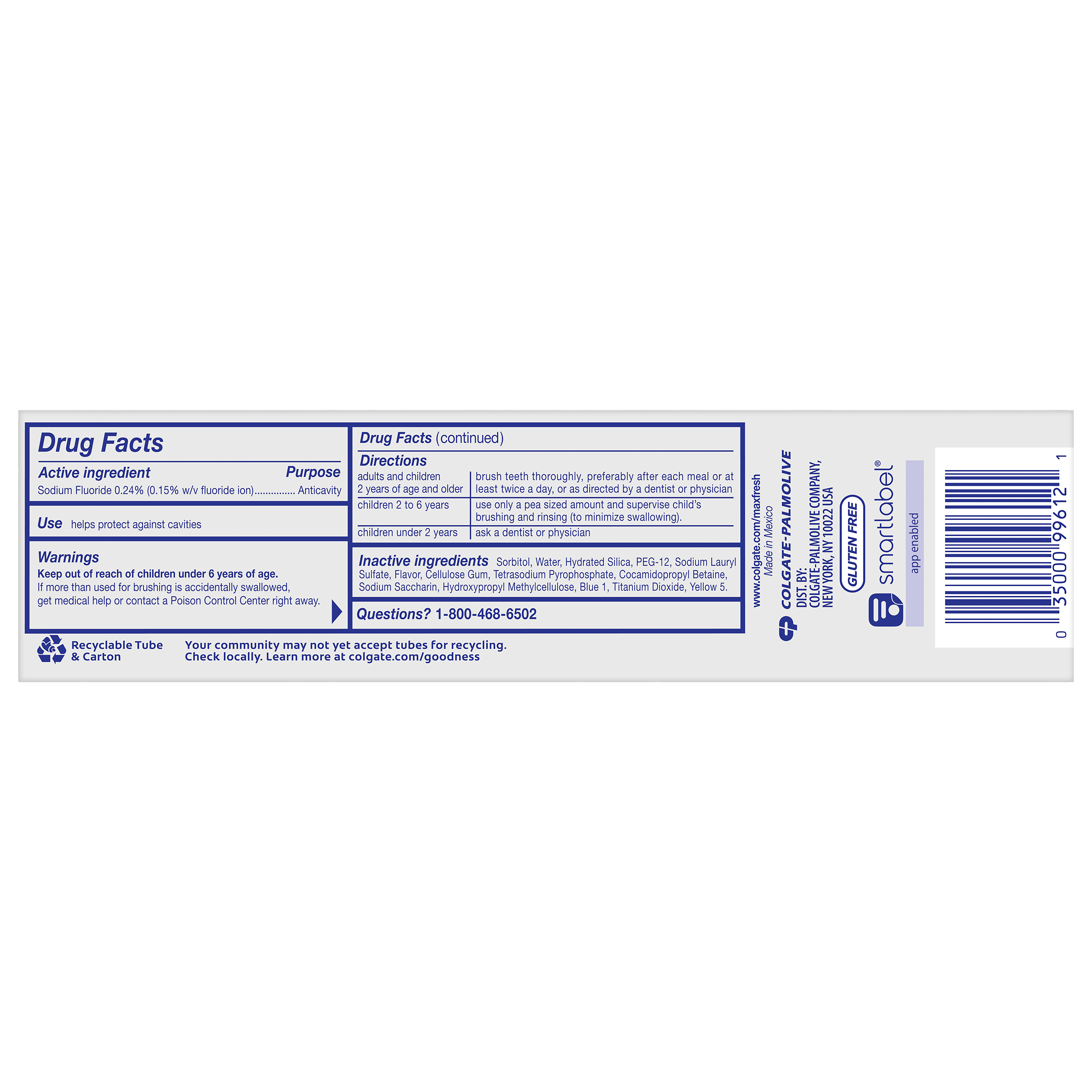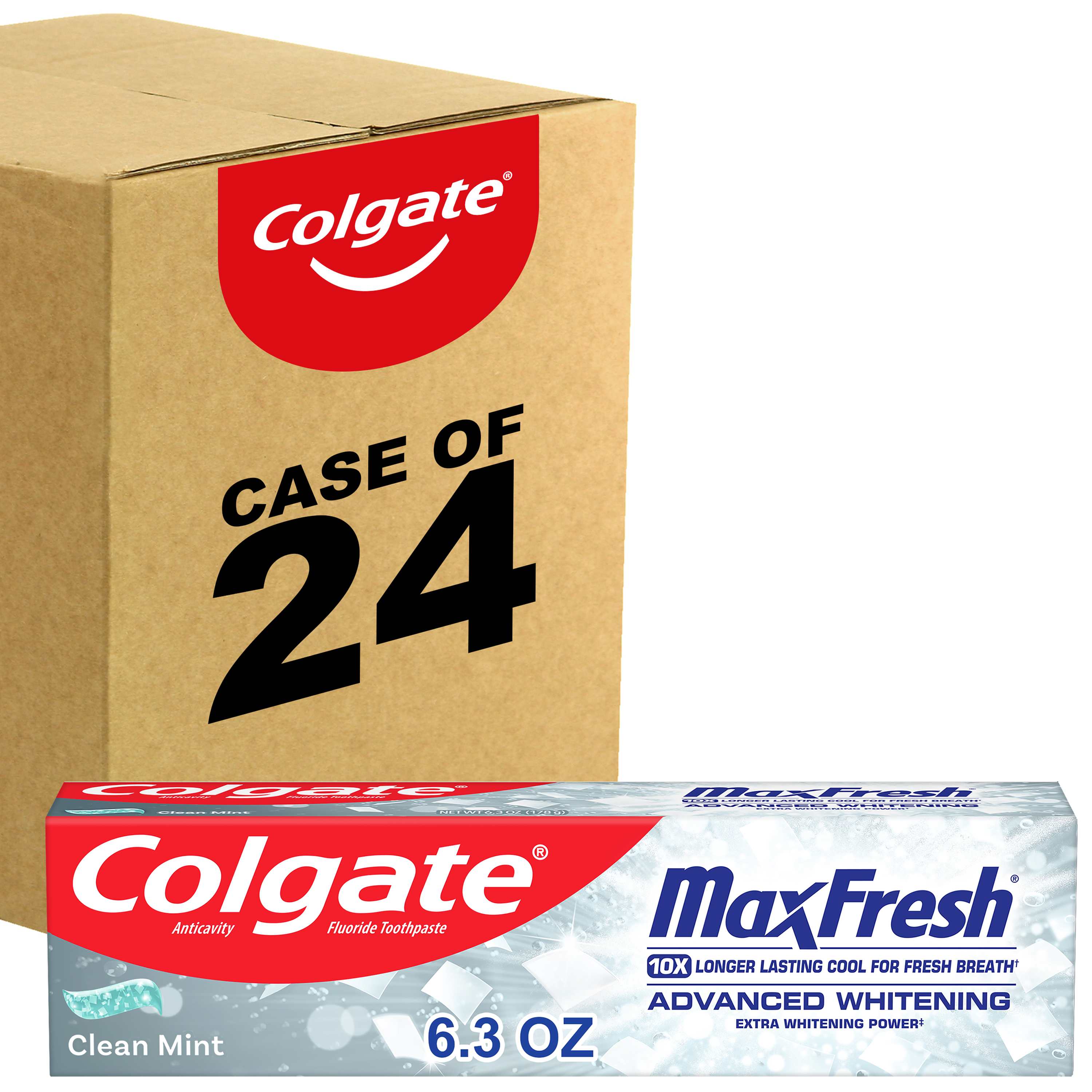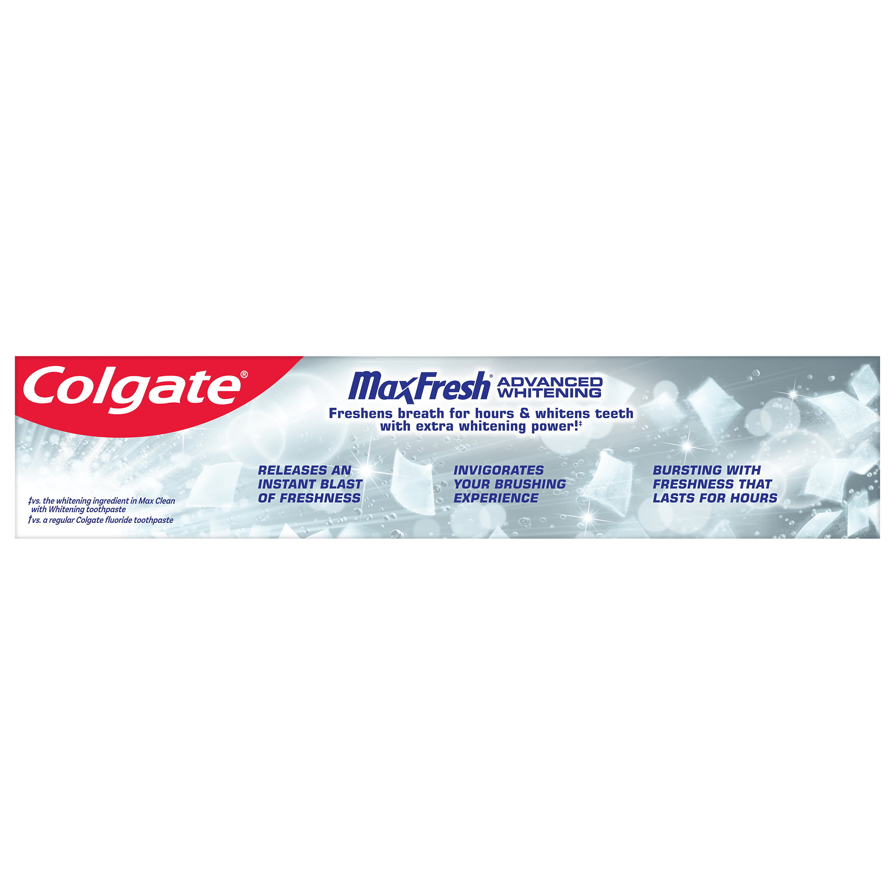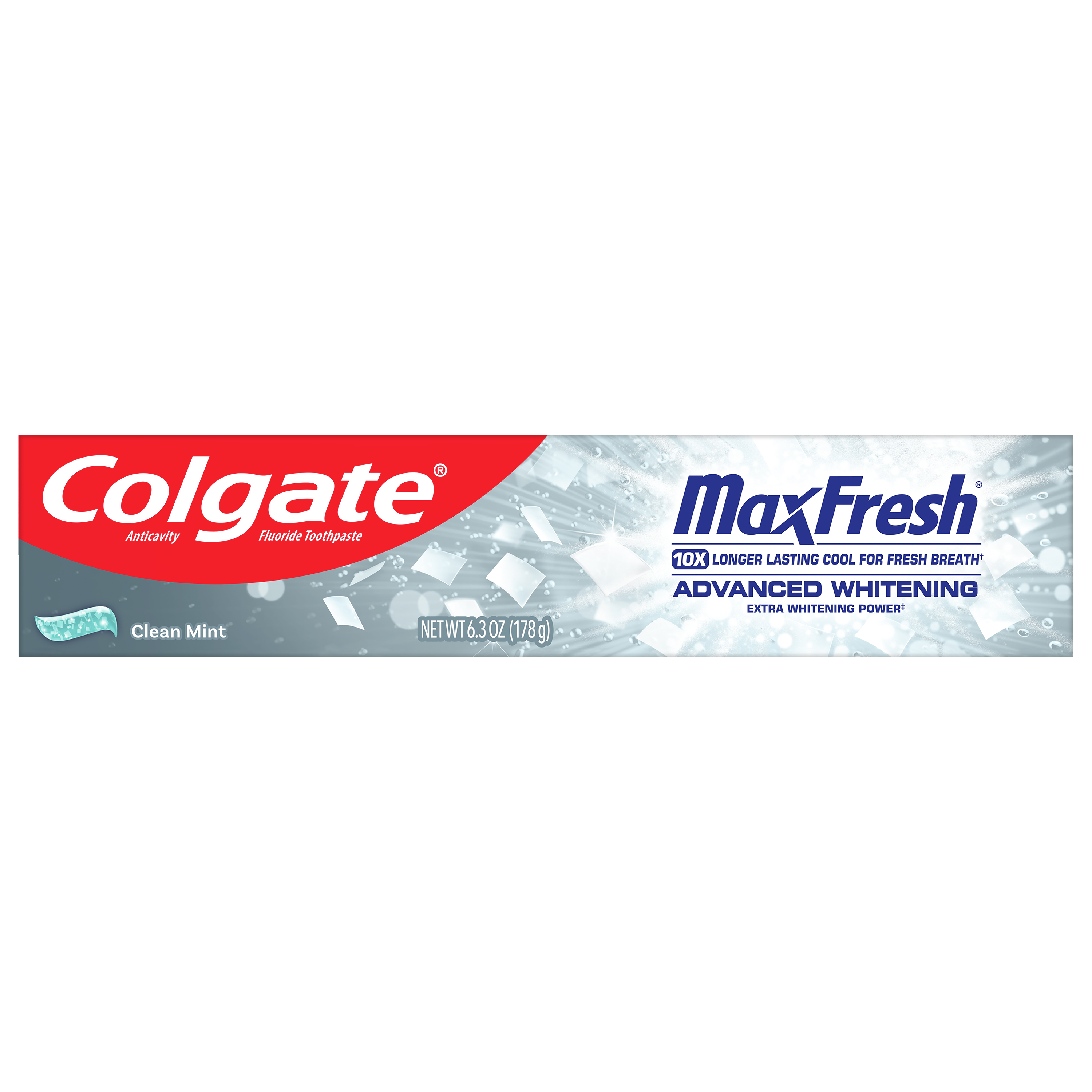 SKU 61019090 Consumer Unit - GTIN 00035000996121 Case - GTIN 10035000996128 Product Category Oral Care Product Sub Category Toothpaste Product Equity (Brand) Colgate Product Sub Brand Colgate Max Fresh TP Product Title Colgate MaxFresh Advanced Whitening Toothpaste, Clean Mint, 6.3 oz Product Description Release an instant blast of freshness and whiten teeth with extra whitening power* with Colgate MaxFresh Advanced Whitening Toothpaste. Loaded with freshness, this invigorating mint fresh breath toothpaste offers 10X longer-lasting cool for fresh breath**. Transform your smile and get long-lasting fresh breath with Colgate MaxFresh Advanced Whitening Toothpaste. Colgate MaxFresh Advanced Whitening Toothpaste comes in a refreshing Clean Mint toothpaste flavor that invigorates the brushing experience. However, Colgate MaxFresh Advanced Whitening Toothpaste is more than just a toothpaste for bad breath, it’s also a fluoride toothpaste and helps prevent cavities. With its refreshing Clean Mint flavor and extra whitening power*, Colgate MaxFresh Advanced Whitening Toothpaste leaves your breath feeling fresh and your smile bright. Plus, the fluoride-based anticavity toothpaste helps fight cavities. Get long-lasting fresh breath with Colgate MaxFresh Toothpaste. *vs. MaxClean with Whitening toothpaste **vs. a regular Colgate fluoride toothpaste eCommerce Copy- Long Description Release an instant blast of freshness and whiten teeth with extra whitening power* with Colgate® Max Fresh Advanced Whitening Toothpaste. Loaded with freshness, this mint toothpaste offers 10X longer-lasting cool for fresh breath**. Transform your smile and get long-lasting fresh breath with Colgate® Max Fresh Advanced Whitening Travel Toothpaste. Colgate® Max Fresh Advanced Whitening Toothpaste comes in a refreshing Clean Mint toothpaste flavor that invigorates the brushing experience. However, Colgate® Max Fresh Advanced Whitening Toothpaste is more than just a travel size toothpaste for bad breath, it’s also a fluoride toothpaste and helps prevent cavities. With its refreshing Clean Mint flavor and extra whitening power*, Colgate® Max Fresh Advanced Whitening Toothpaste leaves your breath feeling fresh and your smile bright. Get long-lasting fresh breath with Colgate® Max Fresh Toothpaste. *vs. MaxClean with Whitening toothpaste **vs. a regular Colgate® fluoride toothpaste Bullet 1 Includes one (1) 6.3 oz tube of Colgate MaxFresh Advanced Whitening Toothpaste Bullet 2 Colgate MaxFresh Advanced Whitening Toothpaste whitens teeth with extra whitening power* and provides 10X longer-lasting cool for fresh breath** Bullet 3 Fluoride toothpaste formula helps fight cavities Bullet 4 This toothpaste comes in a refreshing Clean Mint flavor that leaves your breath feeling fresh for hours Bullet 5 Release an instant blast of freshness with Colgate MaxFresh Advanced Whitening Toothpaste Bullet 6 Teeth whitening toothpaste Bullet 7 Clean mint gel toothpaste Bullet 8 ‡vs. the whitening ingredient in Max Fresh with Whitening Toothpaste Bullet 9 *vs. a leading fluoride toothpaste Amazon RPC B0C1TPGZ3S AMZ URL https://www.amazon.com/dp/B0C1TPGZ3S Walmart RPC 485920111 Walmart URL (Computed) https://www.walmart.com/ip/a/485920111 Albertsons RPC 970479003 Albertsons URL https://www.albertsons.com/shop/product-details.970479003.html CVS RPC 403874