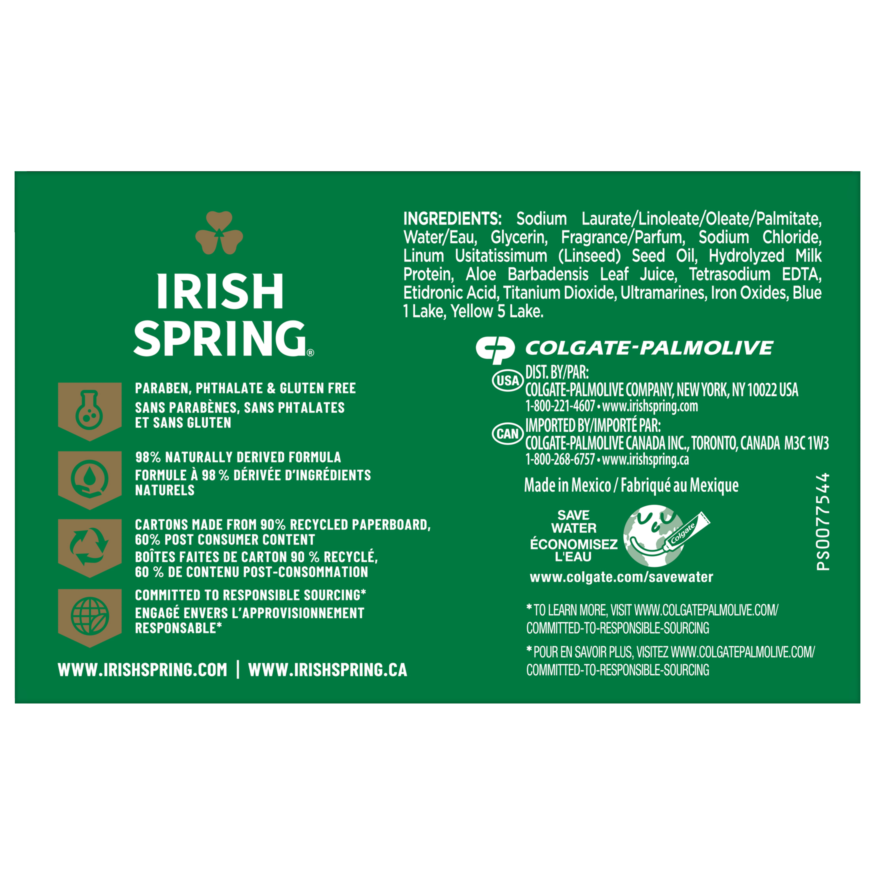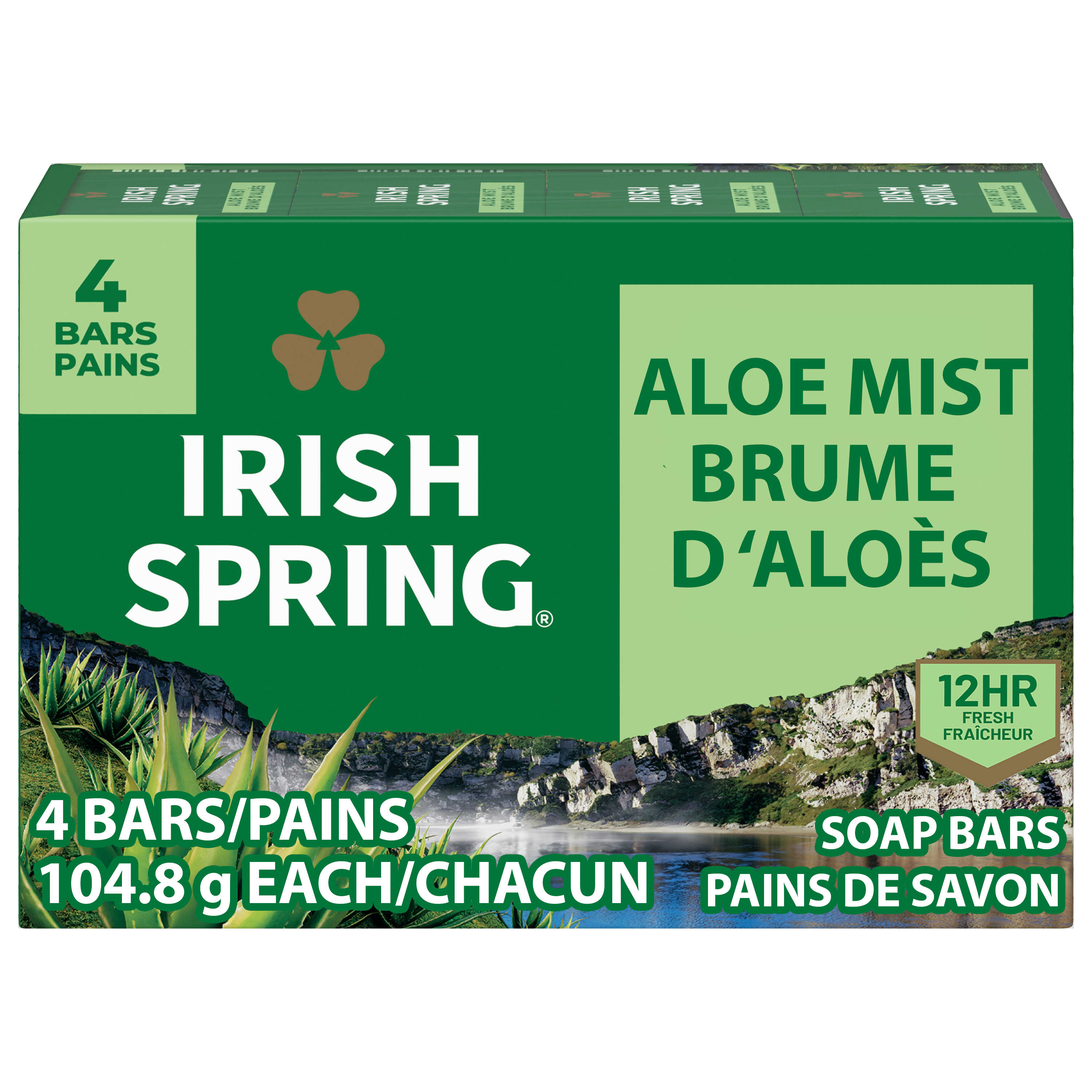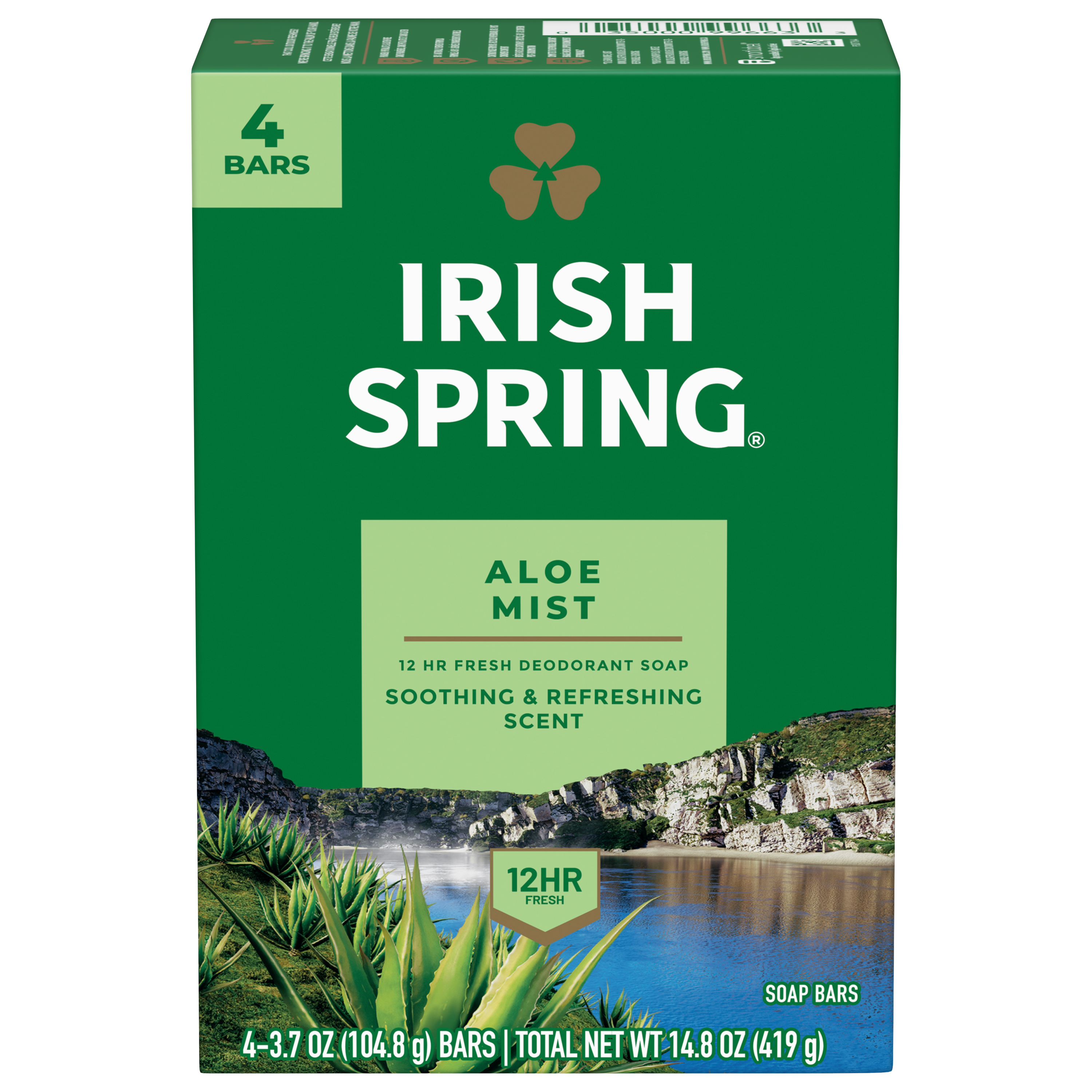 SKU 61019472 Consumer Unit - GTIN 00035000996633 Case - GTIN 10035000996630 Product Category Personal Care Product Sub Category Bar Soap Product Equity (Brand) Irish Spring Product Sub Brand Irish Spring BS Product Title Irish Spring Aloe Mist Deodorant Bar Soap for Men, 12 Hour Fresh Deodorant Soap, 3.7 oz Bar (4 Pack) Product Description Count on Irish Spring Aloe Mist Bar Soap to leave your skin feeling clean. Our deodorant bar soap for men is made with a 98% naturally derived formula that keeps you fresh for 12 hours and is suitable for all skin types. For deeply moisturized skin, Irish Spring Aloe Mist Bar Soap helps attract and lock in moisture. Our soap bar can be used as a hand soap or face wash. This bar soap is suitable for all skin types, including normal, oily, and dry skin, ensuring a gentle yet effective cleanse. It is also paraben, phthalate, and gluten free. Add some adventure to your everyday life with the entire Irish Spring line of body washes and bar soaps for men. eCommerce Copy- Long Description Irish Spring Aloe Mist Deodorant Bar Soap, 4 Pack Smell like you came from a nice-smelling place with Irish Spring Bar Soap. Irish Spring Aloe Mist bar soap provides deep moisturization and is made with a 98% naturally derived formula. Count on Irish Spring Bar Soap to leave your skin feeling clean — our bar soap for men keeps you fresh for 12 hours. Fresh Look, Great Smell Feel clean, smell serene with the new Irish Spring. Our recyclable carton might have a new design, but it’s still the same great bar soap you love. Our packaging refresh is all part of our master plan to bring the amazing places you love to smell straight to your bathroom. Get as fresh as the great outdoors and add some adventure to your everyday with the whole line of body washes and bar soaps for men. We want you to smell as great as you feel, so you can focus on moments that turn into memories. Bar Soap for Body and Hands Irish Spring Bar Soap has a sudsy lather that washes away bacteria, so you can use it as a hand soap bar and keep the fresh smell going all day long. Plus, this soap bar is mild for skin. It’s paraben, phthalate and gluten free and has flaxseed oil. Feel good while washing your hands and body with Irish Spring. Irish Spring Bar Soap Pack Never go without smelling your best. The Irish Spring bar soap pack is conveniently packaged so that you can stock up. Keep some in your bathroom, in the pantry, give some to your friends and keep the good smells going. Bullet 1 What’s Included: Four 3.7 oz soap bars of Irish Spring Aloe Mist Deodorant Bar Soap for Men Bullet 2 Deodorant Soap: 12 hour fresh deodorant soap that leaves you feeling clean, fresh, and confident throughout the day Bullet 3 Versatile Use: Irish Spring bar soap has a sudsy lather and can be used as a hand soap or a face wash Bullet 4 Natural Ingredients: 98% naturally derived formula, gluten free, paraben free, and formulated without phthalates Bullet 5 Sustainably Packaged: Carton made from 90% recycled paperboard, 60% post-consumer content Bullet 6 Soothing and Refreshing Scent: That cool outdoor Freshness? We’re bringing it to the palm of your hand Walmart RPC 889955120 Walmart URL (Computed) https://www.walmart.com/ip/a/889955120