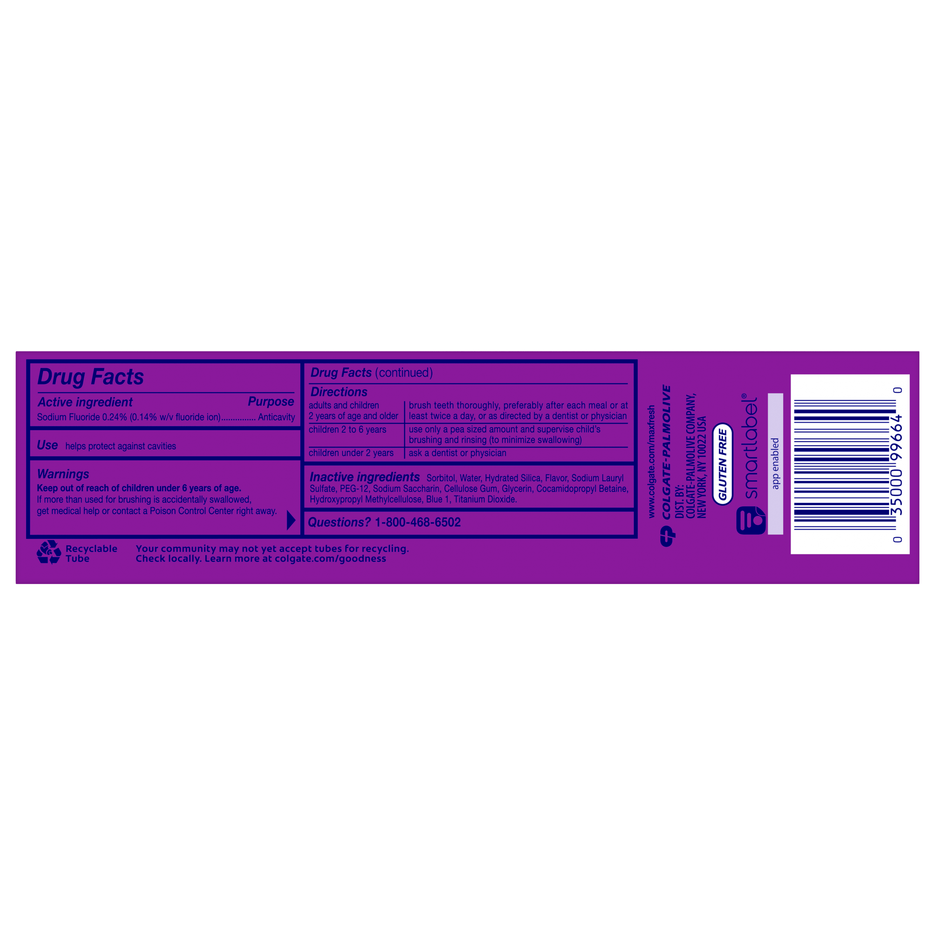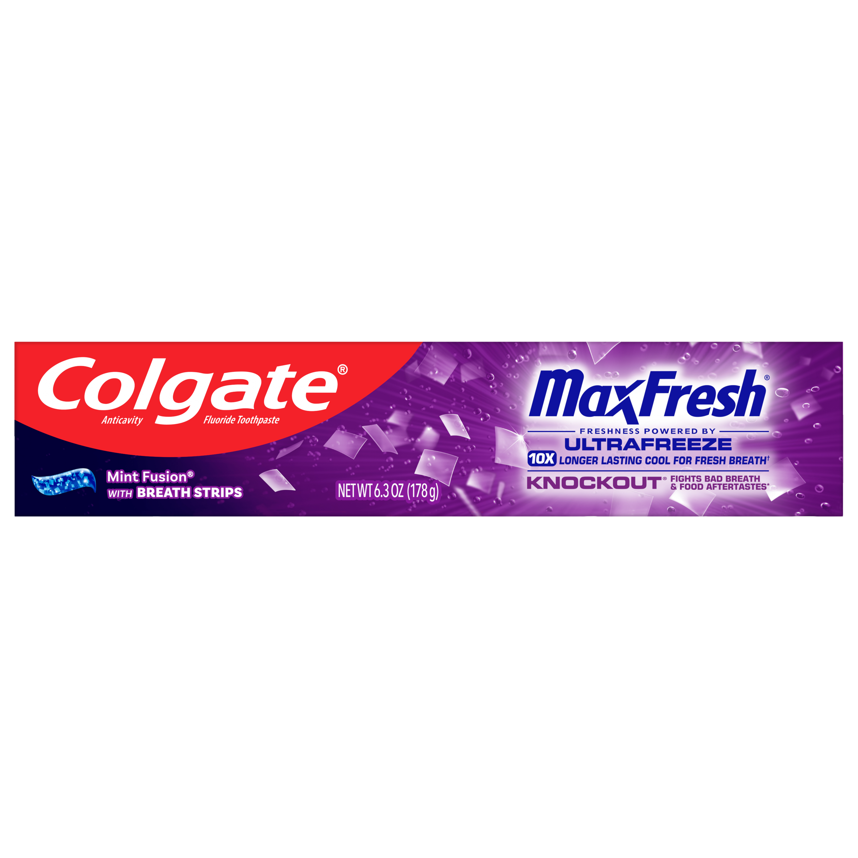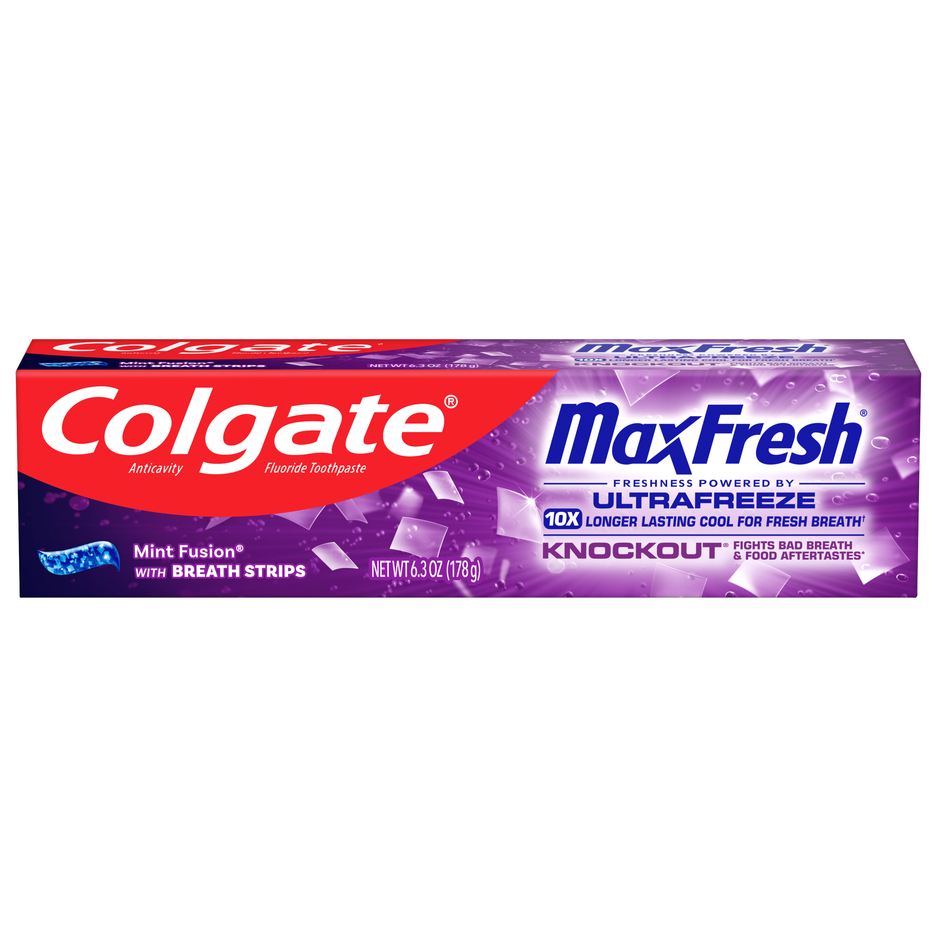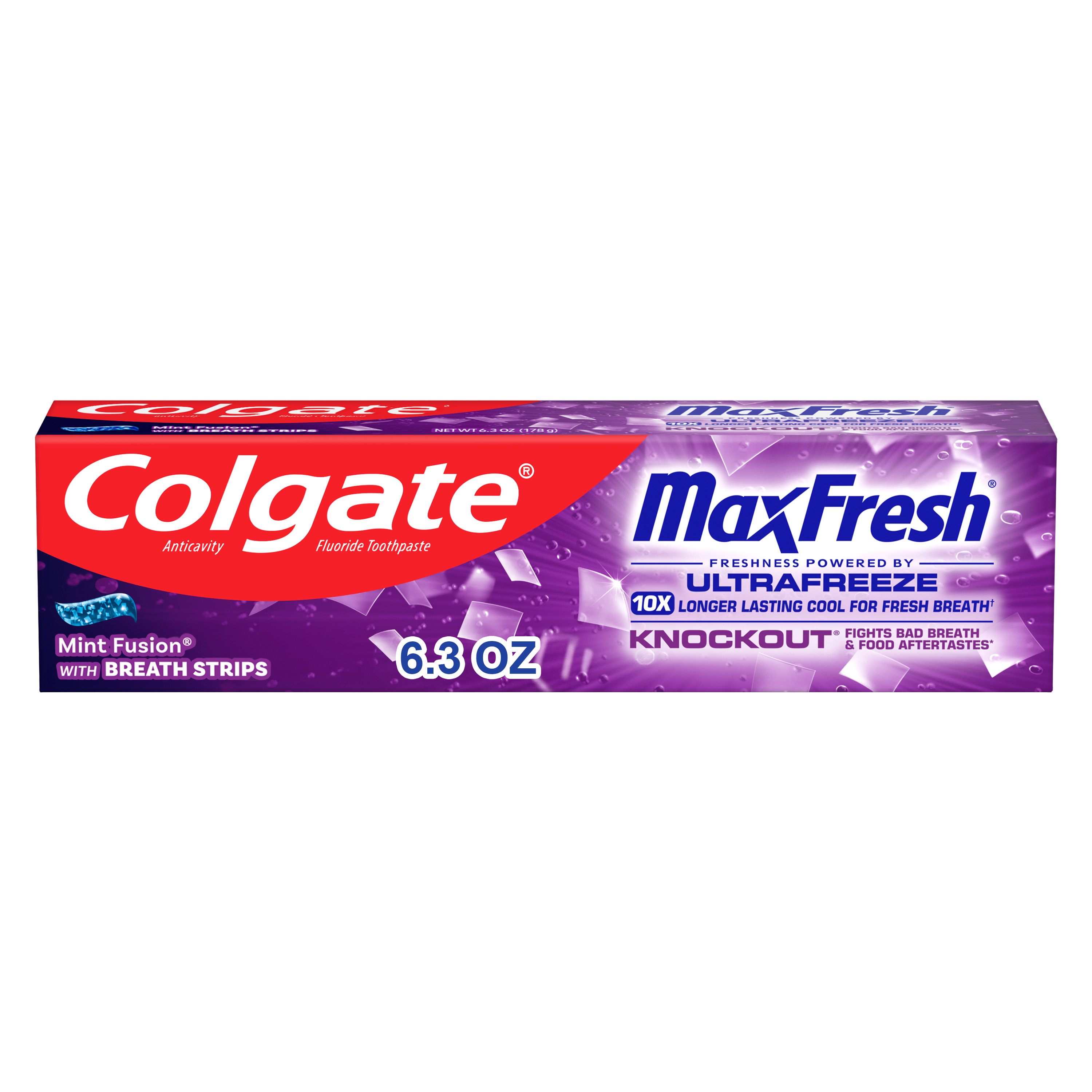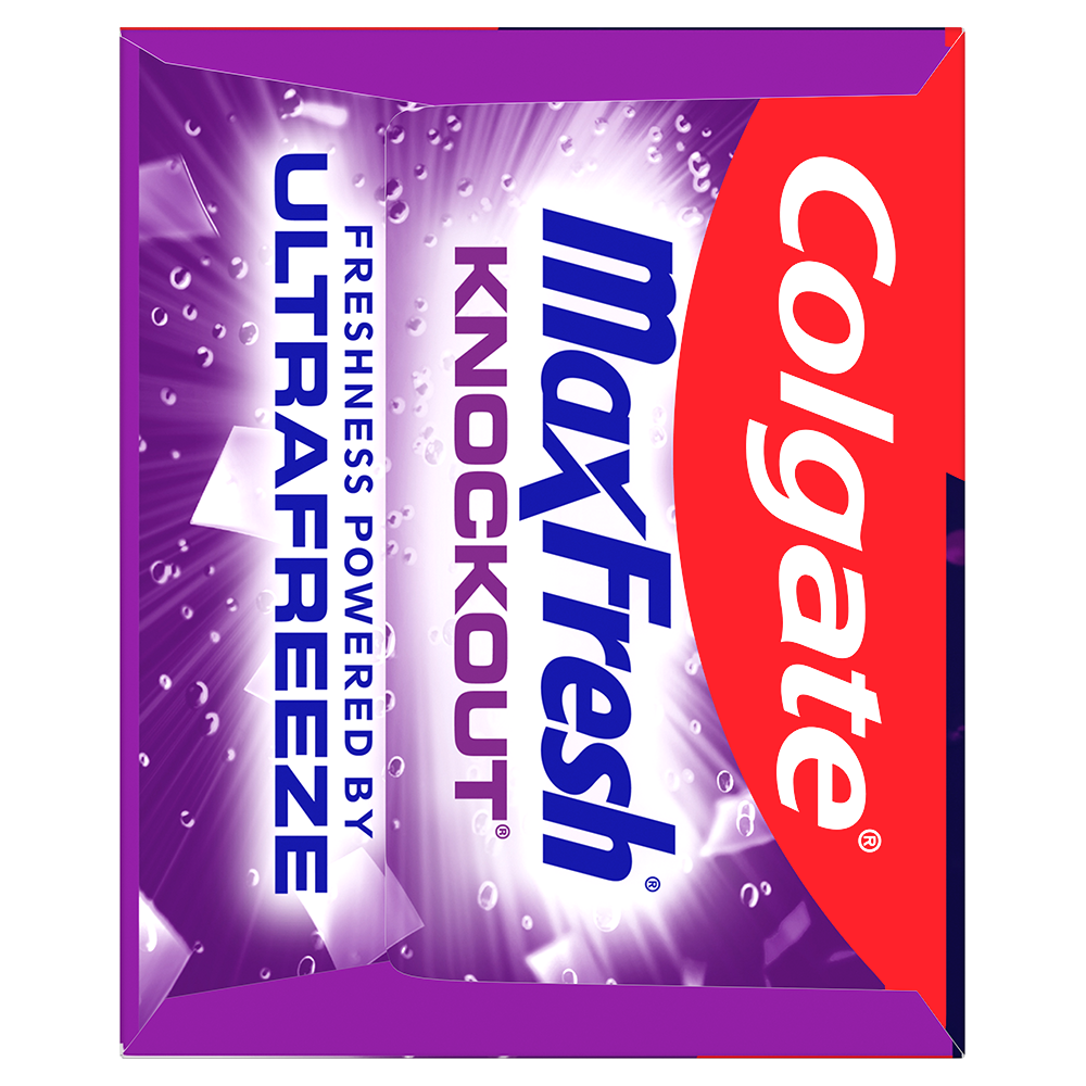 SKU 61019476 Consumer Unit - GTIN 00035000996640 Case - GTIN 10035000996647 Product Category Oral Care Product Sub Category Toothpaste Product Equity (Brand) Colgate Product Sub Brand Colgate Max Fresh TP Product Title Colgate MaxFresh Knockout Mint Toothpaste, 6.3 oz Product Description Release an instant blast of freshness and help destroy nasty odors with Colgate MaxFresh Knockout Mint Toothpaste. Powered by Ultrafreeze, this invigorating fresh breath toothpaste offers 10X longer-lasting cool for fresh breath* and fights lingering food aftertastes**. This mint toothpaste, with the help of Ultrafreeze and hundreds of mini breath strips, is bursting with freshness that lasts for hours. Colgate MaxFresh Knockout Toothpaste comes in a powerful minty toothpaste flavor that invigorates the brushing experience. The unique formula, with odor neutralizing technology, helps destroy even the nastiest odors and keeps your breath fresh for hours.** However, it’s more than just a toothpaste for bad breath, Colgate MaxFresh Knockout Mint Toothpaste is also a fluoride toothpaste and helps prevent cavities. With its refreshing minty flavor and hundreds of mini breath strips, Colgate MaxFresh Knockout Toothpaste leaves your breath feeling fresh for hours. Plus, the fluoride-based formula helps fight cavities. Get long-lasting fresh breath with Colgate MaxFresh Knockout Mint Toothpaste. *vs. a regular Colgate fluoride toothpaste **based on in-vitro garlic odor reduction results and descriptive sensory panel analysis following brushing teeth and tongue eCommerce Copy- Long Description Release an instant blast of freshness and help destroy nasty odors with Colgate® Max Fresh Knockout Mint Toothpaste. Powered by Ultrafreeze, this invigorating fresh breath toothpaste offers 10X longer-lasting cool for fresh breath* and fights lingering food aftertastes**. This minty toothpaste, with the help of Ultrafreeze and hundreds of breath strips, unleashes a powerful rush of freshness for long-lasting fresh breath. Colgate® Max Fresh Knockout Toothpaste comes in a powerful minty toothpaste flavor that invigorates the brushing experience. The unique formula, with odor neutralizing technology, helps destroy even the nastiest odors and keeps your breath fresh for hours.** However, it’s more than just a toothpaste for bad breath, Colgate® Max Fresh Knockout Mint Toothpaste is also a fluoride toothpaste and helps prevent cavities. Get long-lasting fresh breath with Colgate® Max Fresh Knockout Mint Toothpaste. *vs. a regular Colgate® fluoride toothpaste **based on in-vitro garlic odor reduction results and descriptive sensory panel analysis following brushing teeth and tongue Bullet 1 Includes one (1) 6.3 oz tube of Colgate MaxFresh Knockout Mint Toothpaste Bullet 2 Colgate MaxFresh Knockout Toothpaste provides 10X longer-lasting cool for fresh breath* and helps destroy strong odors and food aftertastes** Bullet 3 Fluoride toothpaste formula helps fight cavities Bullet 4 This mint toothpaste, powered by Ultrafreeze, is bursting with freshness that lasts for hours Bullet 5 Release an instant blast of freshness with Colgate MaxFresh Knockout Mint Toothpaste for Bad Breath Active Ingredients Sodium Fluoride 0.24% (0.14% w/v fluoride ion) Walmart RPC 160504567 Walmart URL (Computed) https://www.walmart.com/ip/a/160504567 CVS RPC 186730 Family Dollar RPC 999383