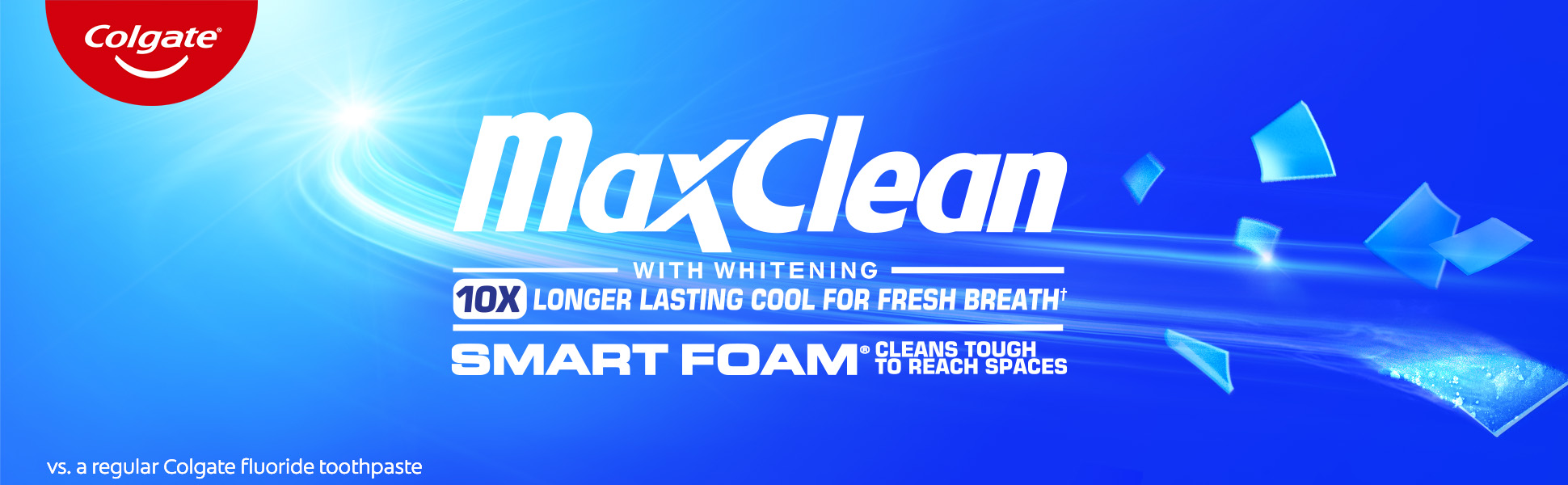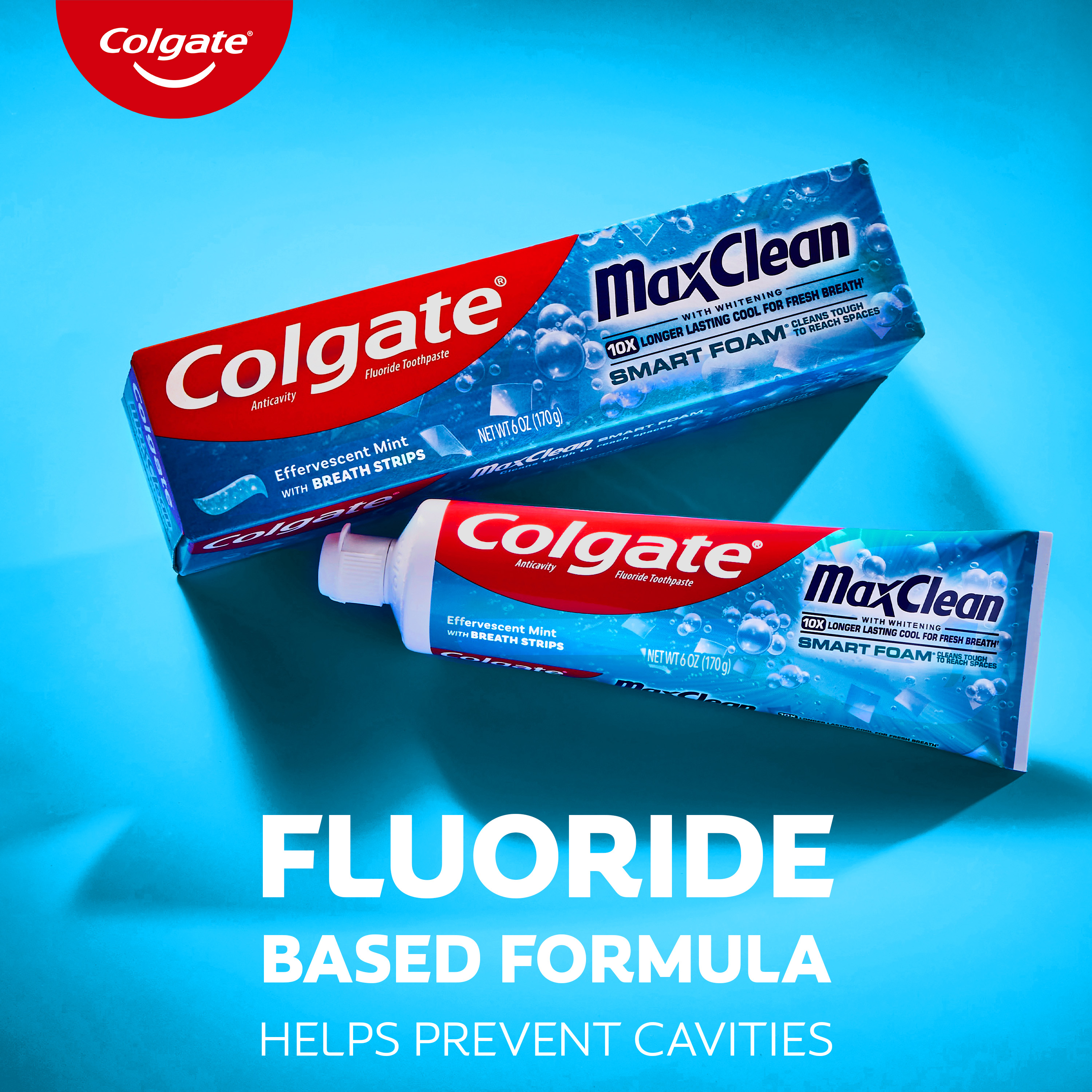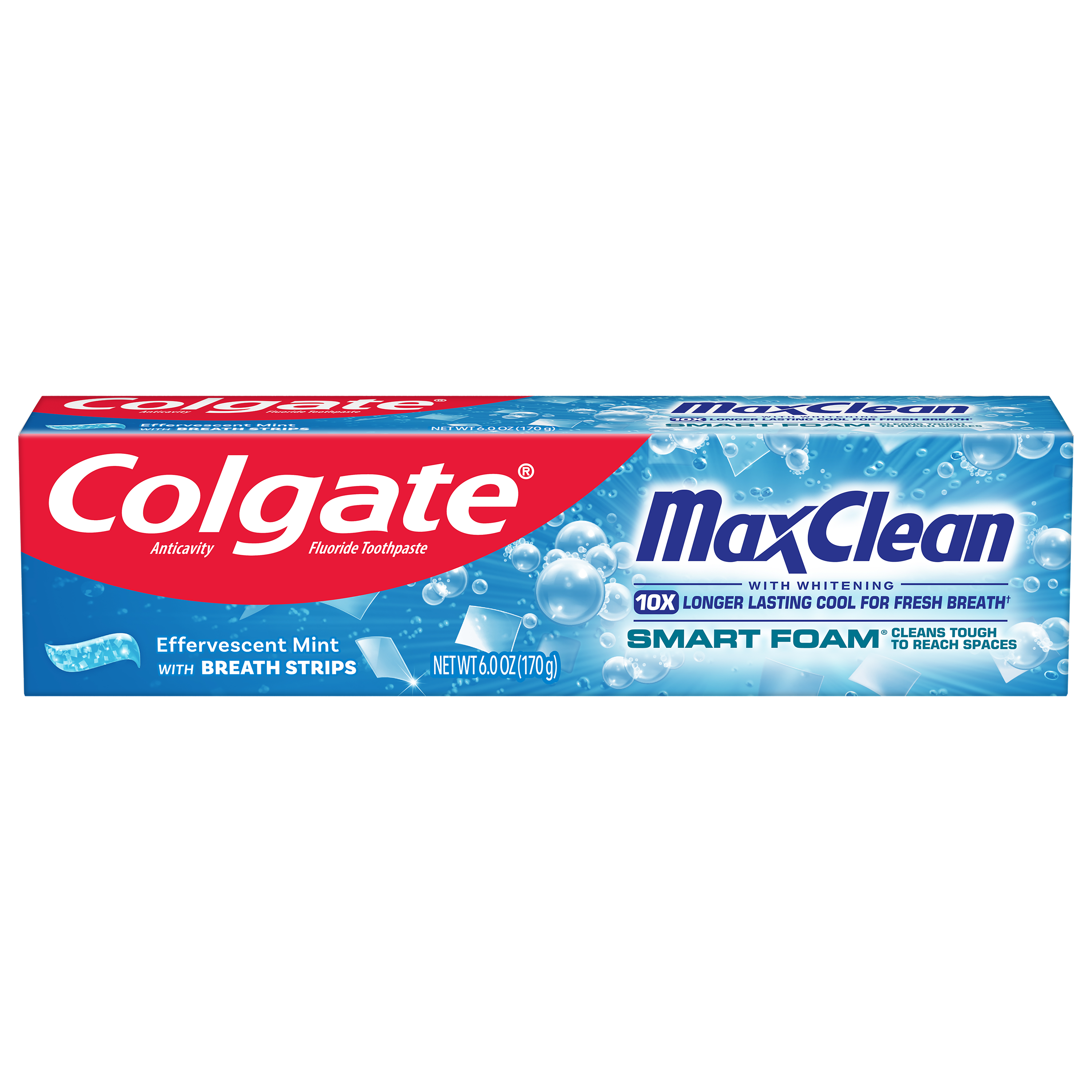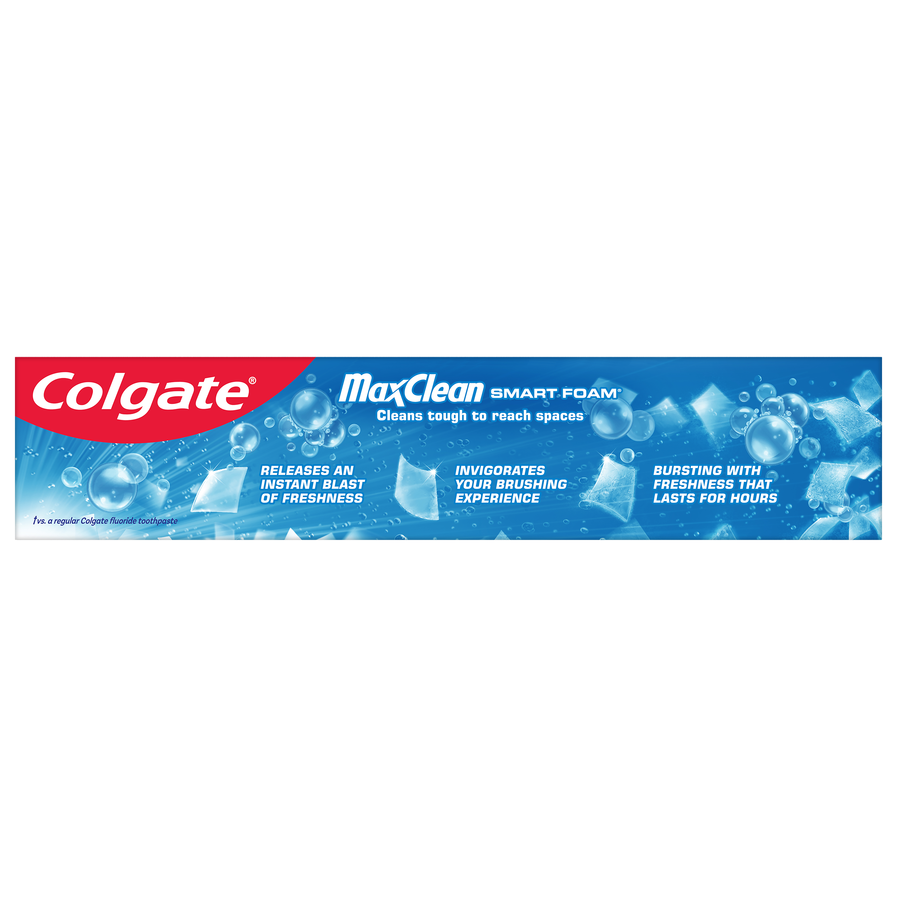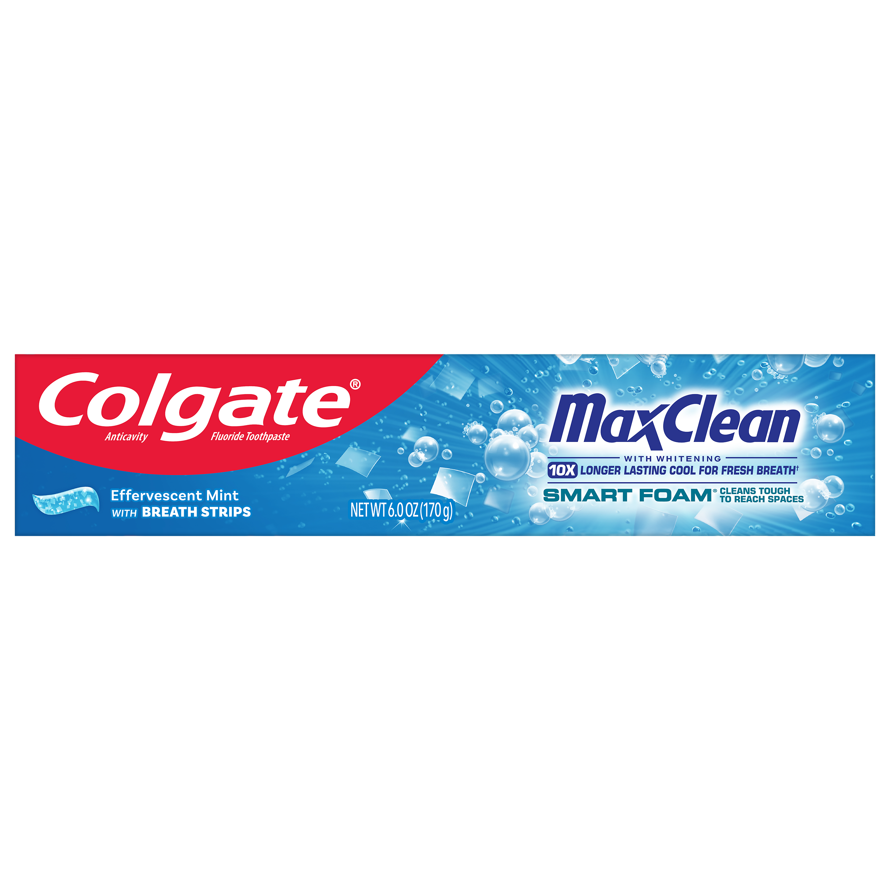 SKU 61019477 Consumer Unit - GTIN 00035000996701 Case - GTIN 10035000996708 Product Category Oral Care Product Sub Category Toothpaste Product Equity (Brand) Colgate Product Sub Brand Colgate Max Fresh TP Product Title Colgate Max Clean Smart Foam Whitening Toothpaste, Effervescent Mint, 6.0 oz Product Description Release an instant blast of freshness and clean tough-to-reach spaces with Colgate Max Clean Smart Foam Whitening Toothpaste. Loaded with minty freshness, this whitening foaming toothpaste helps whiten teeth and offers 10X longer-lasting cool for fresh breath*. Transform your smile and get long-lasting fresh breath with Colgate Max Clean Smart Foam Whitening Toothpaste. Colgate Max Clean Smart Foam Whitening Toothpaste comes in a refreshing Effervescent Mint toothpaste flavor that invigorates the brushing experience. However, Colgate Max Fresh Advanced Whitening Toothpaste is more than just a toothpaste for bad breath, it’s also a fluoride toothpaste and helps prevent cavities. With its refreshing Effervescent Mint flavor and Smart Foam formulation that helps clean tough-to-reach spaces, Colgate Max Clean Smart Foam Whitening Toothpaste leaves your breath feeling fresh and your smile bright. Plus, the fluoride-based anticavity toothpaste helps fight cavities. Get long-lasting fresh breath with Colgate Max Clean Smart Foam Whitening Toothpaste. *vs. a regular Colgate fluoride toothpaste eCommerce Copy- Long Description Release an instant blast of freshness and clean tough-to-reach spaces with Colgate® Max Clean Smart Foam Whitening Toothpaste. Loaded with minty freshness, this whitening foaming toothpaste helps whiten teeth and offers 10X longer-lasting cool for fresh breath*. Colgate® Max Clean Smart Foam Whitening Toothpaste comes in a refreshing Effervescent Mint toothpaste flavor that invigorates the brushing experience. Plus, the fluoride-based anticavity toothpaste helps fight cavities. Get long-lasting fresh breath with Colgate® Max Clean Smart Foam Whitening Toothpaste. *vs. a regular Colgate® fluoride toothpaste Bullet 1 Includes one (1) 6.0 oz tube of Colgate Max Clean Smart Foam Whitening Toothpaste Bullet 2 Colgate Max Clean Smart Foam Whitening Toothpaste whitens teeth and provides 10X longer-lasting cool for fresh breath* Bullet 3 Fluoride toothpaste formula helps fight cavities Bullet 4 This fresh breath toothpaste comes in a refreshing Effervescent Mint flavor that leaves your breath feeling fresh for hours Bullet 5 Release an instant blast of freshness with Colgate Max Clean Smart Foam Whitening Toothpaste Bullet 6 Teeth whitening toothpaste whitens teeth by removing surface stains Bullet 7 Effervescent mint gel toothpaste Bullet 8 Sugar free, gluten free toothpaste Bullet 9 *vs. a leading fluoride toothpaste Walmart RPC 115589999 Walmart URL (Computed) https://www.walmart.com/ip/a/115589999 CVS RPC 838620