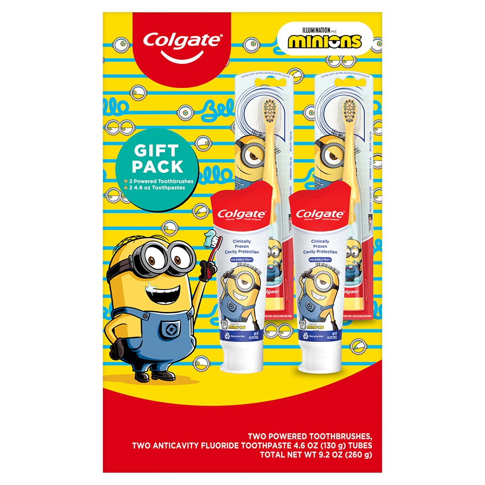 Colgate Kids Toothbrush Set with Toothpaste, Minions Toothbrush Gift Set, 2 Battery Toothbrushes and 2 Toothpastes