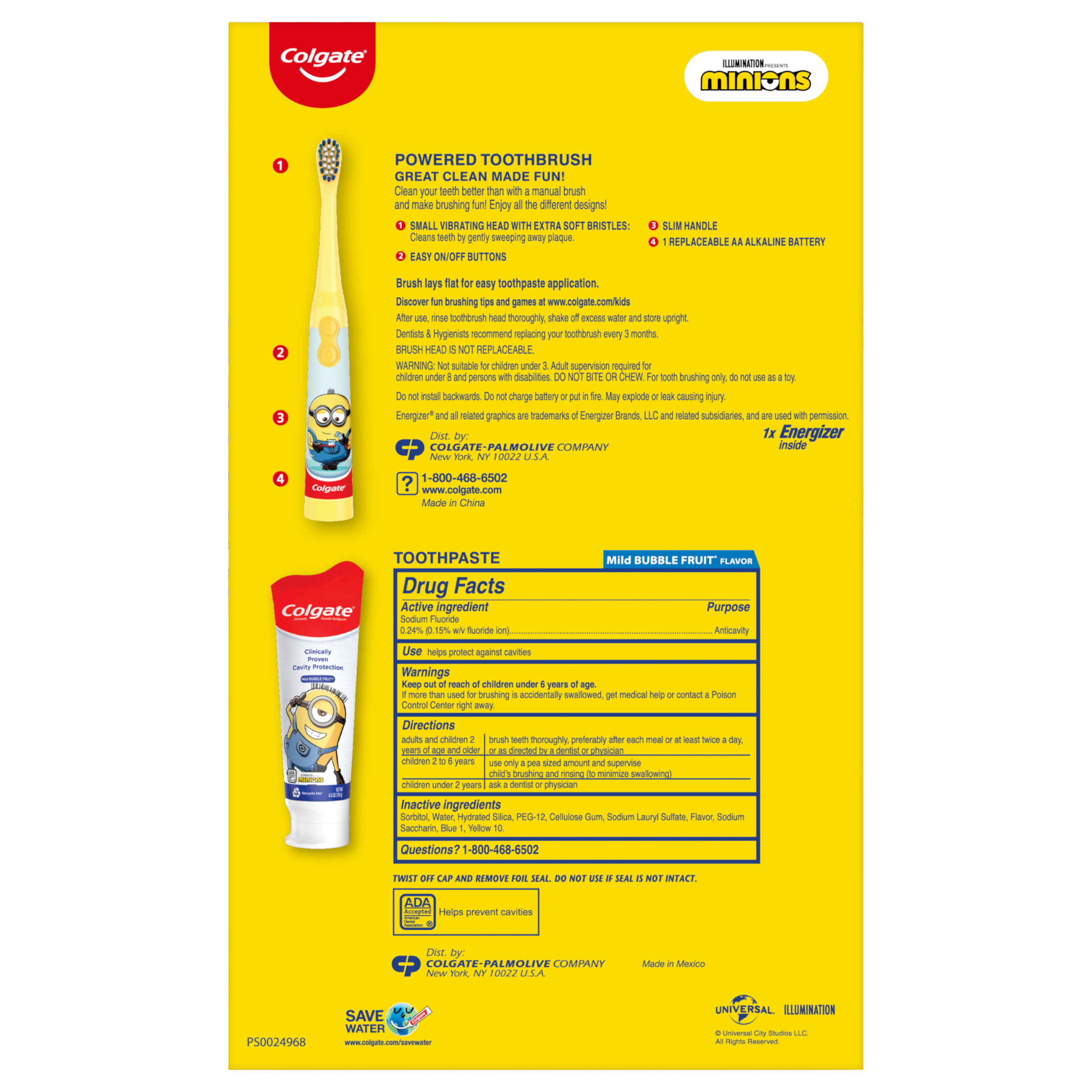 SKU 61019519 Consumer Unit - GTIN 00035000996862 Case - GTIN 10035000996869 Product Category Oral Care Product Sub Category Oral Care SUC Mixed Product Equity (Brand) Colgate Product Sub Brand Oral Care SBR Mixed Product Title Colgate Kids Toothbrush Set with Toothpaste, Minions Toothbrush Gift Set, 2 Battery Toothbrushes and 2 Toothpastes Bullet 1 Give the gift of Colgate Kids and encourage good brushing habits with this special Minions toothpaste and toothbrush set Bullet 2 Kids toothpaste and toothbrush set includes 2 cavity protection toothpastes and 2 kids battery toothbrushes Bullet 3 The included kids toothbrushes have extra soft bristles that sweep away plaque and clean cavity-causing bacteria from all tooth surfaces Bullet 4 Kids battery toothbrushes are battery operated to help kids brush better (1 AA battery included) Bullet 5 Kids cavity protection toothpaste with fluoride has a gentle formula that’s ADA-accepted and clinically proven to protect against cavities Amazon RPC B09GJL66YH AMZ URL https://www.amazon.com/dp/B09GJL66YH