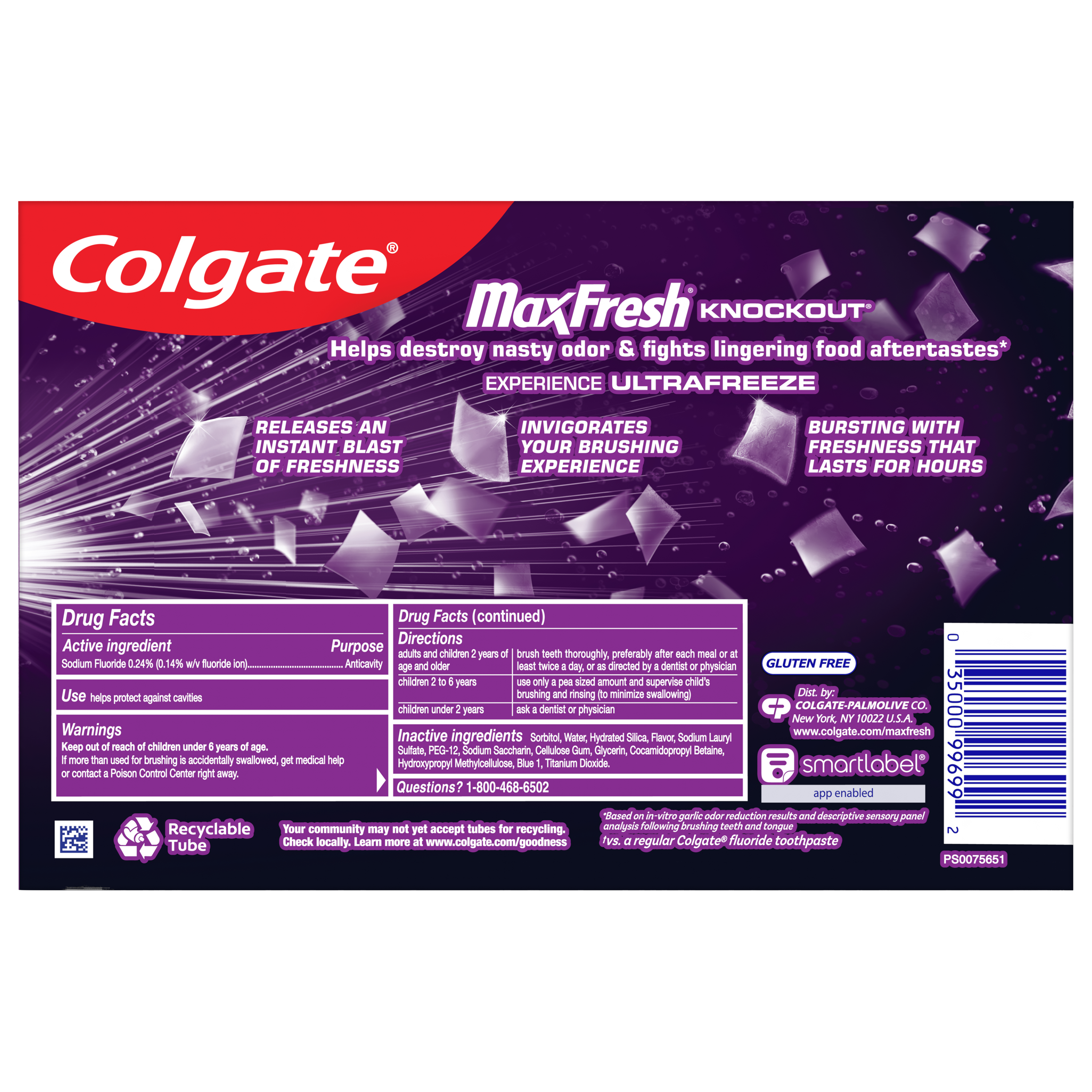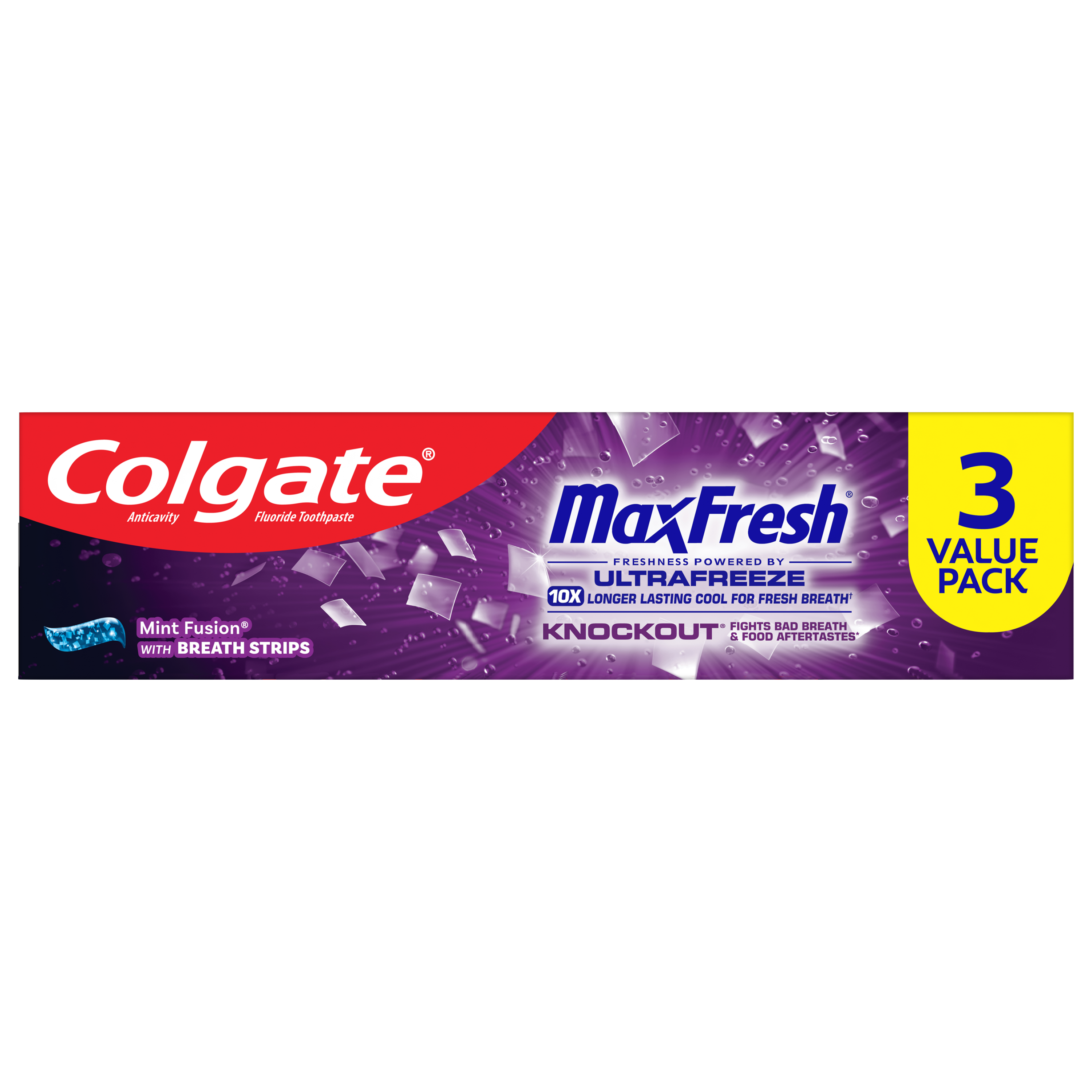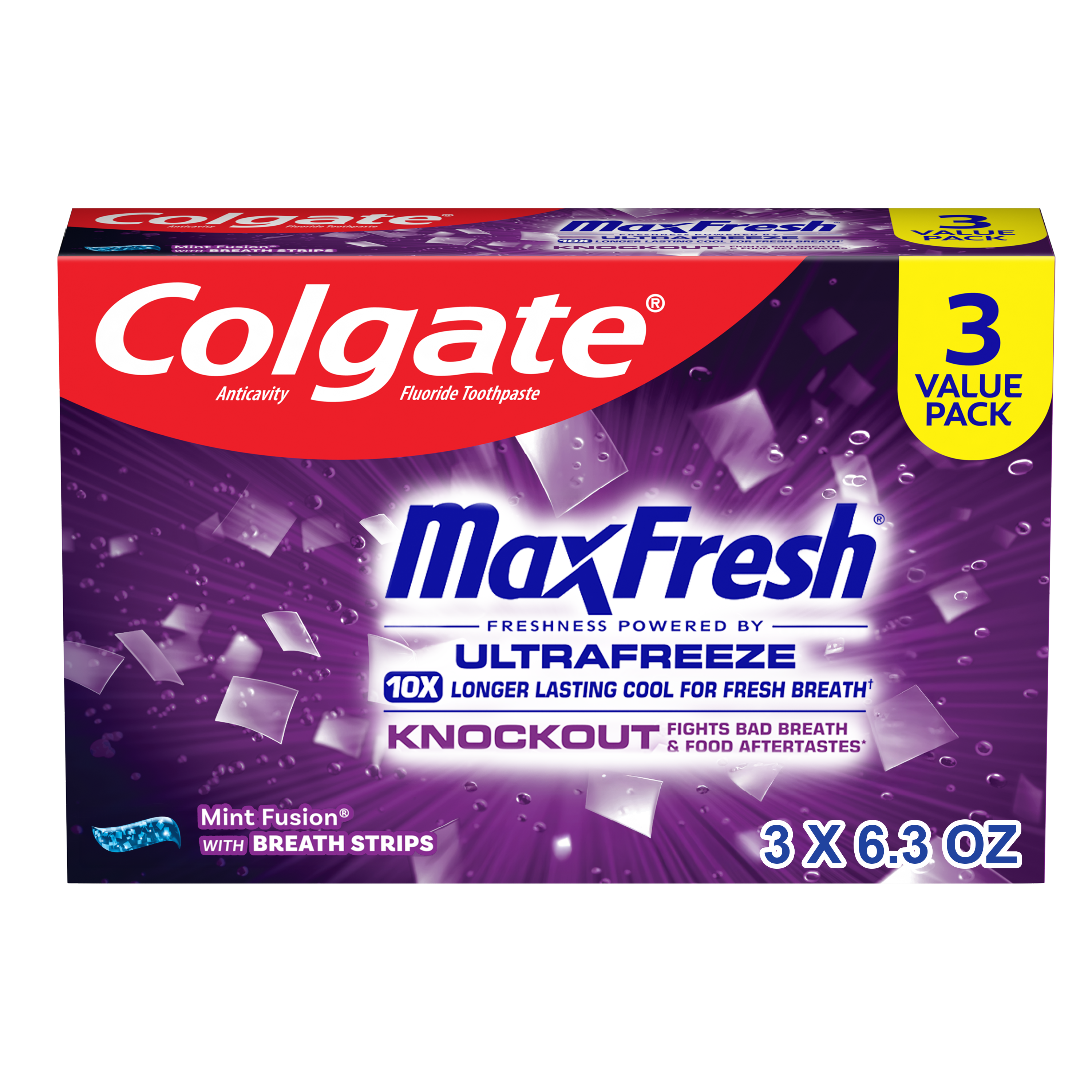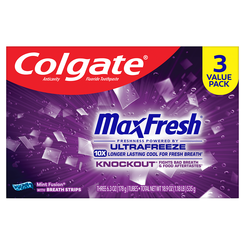 SKU 61019550 Consumer Unit - GTIN 00035000996992 Case - GTIN 10035000996999 Product Category Oral Care Product Sub Category Toothpaste Product Equity (Brand) Colgate Product Sub Brand Colgate Max Fresh TP Product Title Colgate MaxFresh Knockout Mint Toothpaste, 3 Pack, 6.3 oz Product Description Release an instant blast of freshness and help destroy nasty odors with Colgate MaxFresh Knockout Mint Toothpaste. Powered by Ultrafreeze, this invigorating fresh breath toothpaste pack offers 10X longer-lasting cool for fresh breath* and fights lingering food aftertastes**. This mint toothpaste, with the help of Ultrafreeze and hundreds of mini breath strips, is bursting with freshness that lasts for hours. Colgate MaxFresh Knockout Toothpaste comes in a powerful minty toothpaste flavor that invigorates the brushing experience. The unique formula, with odor neutralizing technology, helps destroy even the nastiest odors and keeps your breath fresh for hours.** However, it’s more than just a toothpaste for bad breath, Colgate MaxFresh Knockout Mint Toothpaste is also a fluoride toothpaste and helps prevent cavities. With its refreshing minty flavor and hundreds of mini breath strips, Colgate MaxFresh Knockout Toothpaste leaves your breath feeling fresh for hours. Plus, the fluoride-based formula helps fight cavities. Get long-lasting fresh breath with Colgate MaxFresh Knockout Mint Toothpaste. *vs. a regular Colgate fluoride toothpaste **based on in-vitro garlic odor reduction results and descriptive sensory panel analysis following brushing teeth and tongue eCommerce Copy- Long Description Release an instant blast of freshness and help destroy nasty odors with Colgate® Max Fresh Knockout Mint Toothpaste. Powered by Ultrafreeze, this invigorating fresh breath toothpaste offers 10X longer-lasting cool for fresh breath* and fights lingering food aftertastes**. This minty toothpaste, with the help of Ultrafreeze and hundreds of breath strips, unleashes a powerful rush of freshness for long-lasting fresh breath. Colgate® Max Fresh Knockout Toothpaste comes in a powerful minty toothpaste flavor that invigorates the brushing experience. The unique formula, with odor neutralizing technology, helps destroy even the nastiest odors and keeps your breath fresh for hours.** However, it’s more than just a toothpaste for bad breath, Colgate® Max Fresh Knockout Mint Toothpaste is also a fluoride toothpaste and helps prevent cavities. Get long-lasting fresh breath with Colgate® Max Fresh Knockout Mint Toothpaste. *vs. a regular Colgate® fluoride toothpaste **based on in-vitro garlic odor reduction results and descriptive sensory panel analysis following brushing teeth and tongue Bullet 1 Includes three (3) 6.3 oz tubes of Colgate MaxFresh Knockout Mint Toothpaste Bullet 2 Colgate MaxFresh Knockout Toothpaste provides 10X longer-lasting cool for fresh breath* and helps destroy strong odors and food aftertastes** Bullet 3 Fluoride toothpaste formula helps fight cavities Bullet 4 This mint toothpaste pack, powered by Ultrafreeze, is bursting with freshness that lasts for hours Bullet 5 Release an instant blast of freshness with Colgate MaxFresh Knockout Mint Toothpaste for Bad Breath Active Ingredients Sodium Fluoride 0.24% (0.14% w/v fluoride ion) Walmart RPC 371217523 Walmart URL (Computed) https://www.walmart.com/ip/a/371217523 Target RPC 87085888 Target URL https://www.target.com/p/a/-/A-87085888