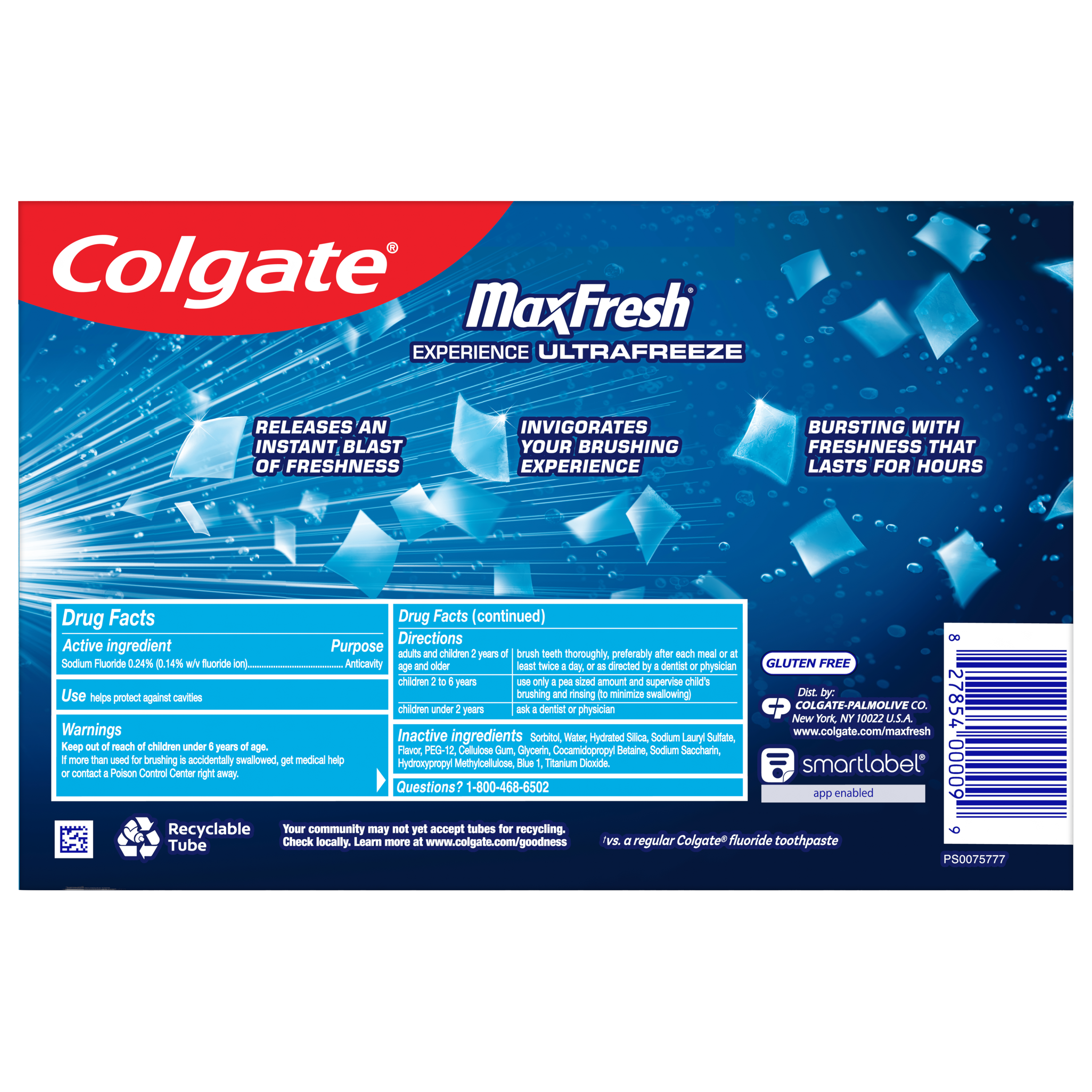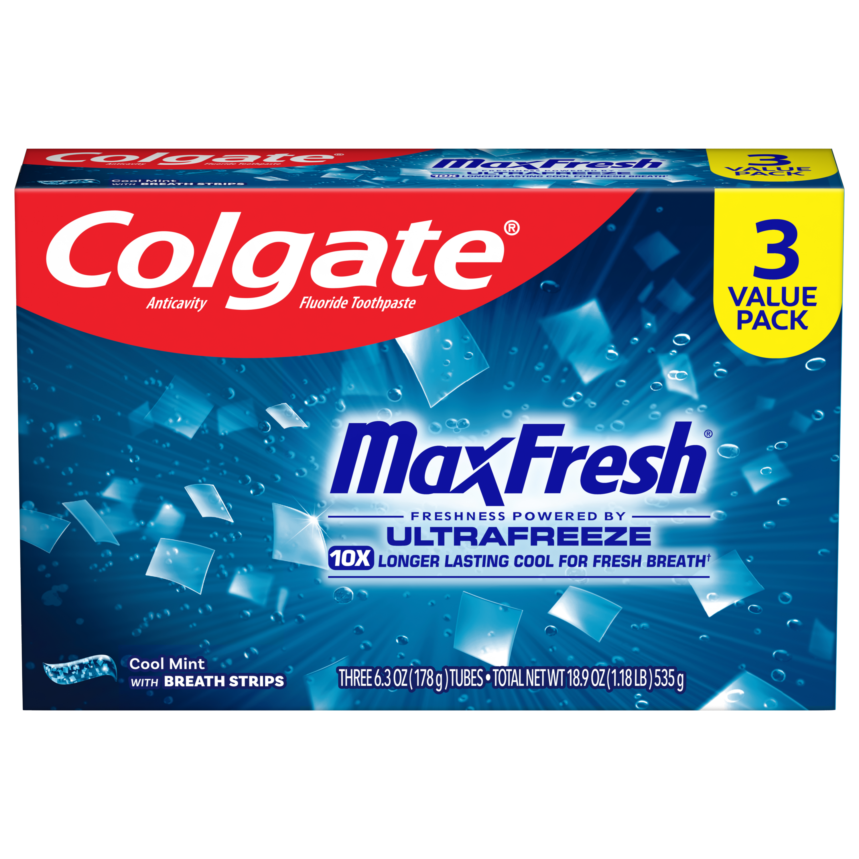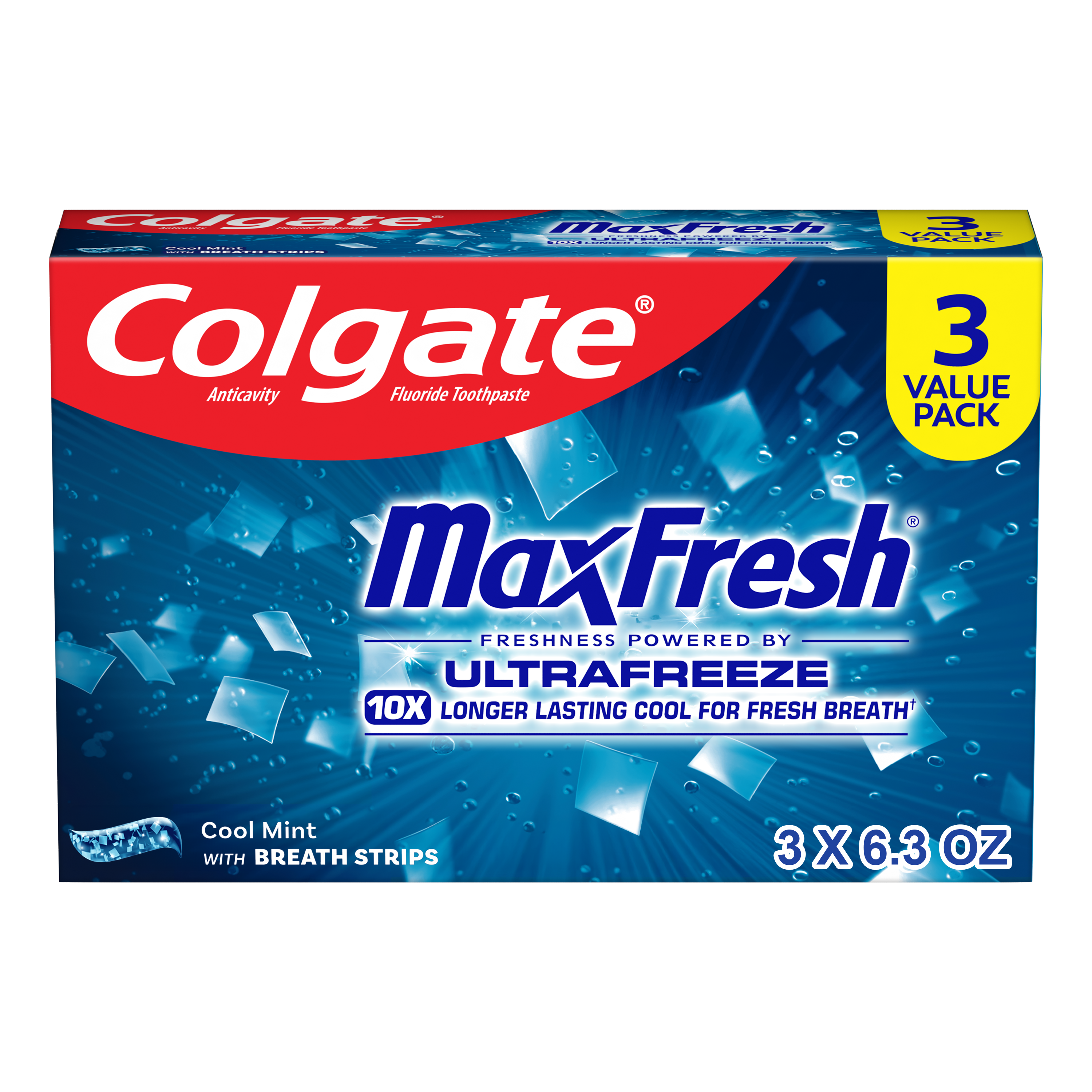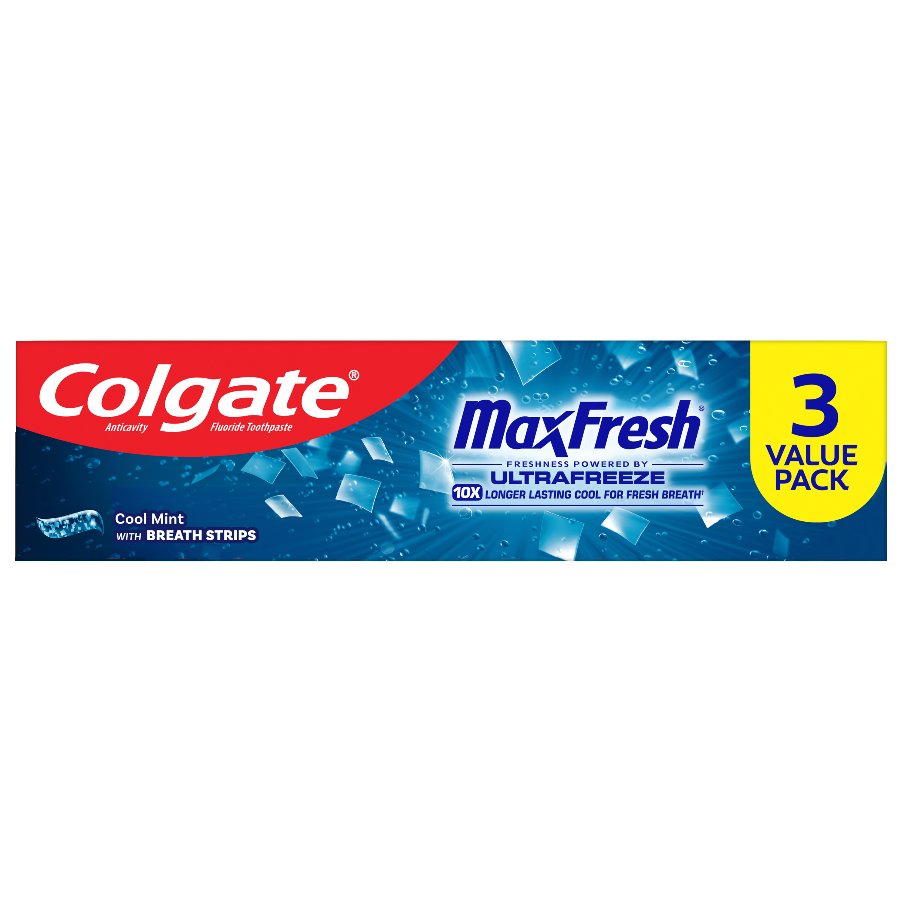 SKU 61019626 Consumer Unit - GTIN 00827854000099 Case - GTIN 10827854000096 Product Category Oral Care Product Sub Category Toothpaste Product Equity (Brand) Colgate Product Sub Brand Colgate Max Fresh TP Product Title Colgate MaxFresh Cool Mint Toothpaste, 3 Pack, 6.3 oz Product Description Release an instant blast of freshness with Colgate MaxFresh Cool Mint Toothpaste. Powered by Ultrafreeze, this 3 pack of invigorating peppermint toothpaste offers 10X longer-lasting cool for fresh breath*. These mint toothpaste tubes, with the help of Ultrafreeze and hundreds of mini breath strips, are bursting with freshness that lasts for hours. Colgate MaxFresh Toothpaste comes in a refreshing Cool Mint flavor that invigorates the brushing experience. However, it’s more than just a toothpaste for bad breath, Colgate MaxFresh Cool Mint Toothpaste is also a fluoride toothpaste and helps prevent cavities. With its refreshing Cool Mint flavor and hundreds of mini breath strips, Colgate MaxFresh Toothpaste leaves your breath feeling fresh for hours. Plus, the fluoride-based formula helps fight cavities. Get long-lasting fresh breath with Colgate MaxFresh Cool Mint Toothpaste. *vs. a regular Colgate fluoride toothpaste eCommerce Copy- Long Description Release an instant blast of freshness with Colgate® Max Fresh Cool Mint Toothpaste. Powered by Ultrafreeze, this invigorating peppermint toothpaste offers 10X longer-lasting cool for fresh breath*. This mint toothpaste, with the help of Ultrafreeze and hundreds of breath strips, releases a powerful rush of freshness for long-lasting fresh breath. Colgate® Max Fresh Toothpaste comes in a refreshing Cool Mint flavor that invigorates the brushing experience. However, it’s more than just a toothpaste for bad breath, Colgate® Max Fresh Cool Mint Toothpaste is also a fluoride toothpaste and helps prevent cavities. With its refreshing Cool Mint flavor and hundreds of breath strips, Colgate® Max Fresh Toothpaste leaves your breath feeling fresh for hours. *vs. a regular Colgate® fluoride toothpaste Bullet 1 Includes three (3) 6.3 oz tubes of Colgate MaxFresh Cool Mint Toothpaste Bullet 2 Powered by Ultrafreeze, Colgate MaxFresh Toothpaste offers 10X longer-lasting cool for fresh breath* Bullet 3 Fluoride toothpaste formula helps fight cavities Bullet 4 This peppermint toothpaste pack, with hundreds of mini breath strips, is bursting with freshness that lasts for hours Bullet 5 Release an instant blast of freshness with Colgate MaxFresh Cool Mint Toothpaste Active Ingredients Sodium Fluoride 0.24% (0.14% w/v fluoride ion) Amazon RPC B09R6RLK4D AMZ URL https://www.amazon.com/dp/B09R6RLK4D Walmart RPC 426317695 Walmart URL (Computed) https://www.walmart.com/ip/a/426317695 Target RPC 87085887 Target URL https://www.target.com/p/a/-/A-87085887 CVS RPC 381534 Family Dollar RPC 998200