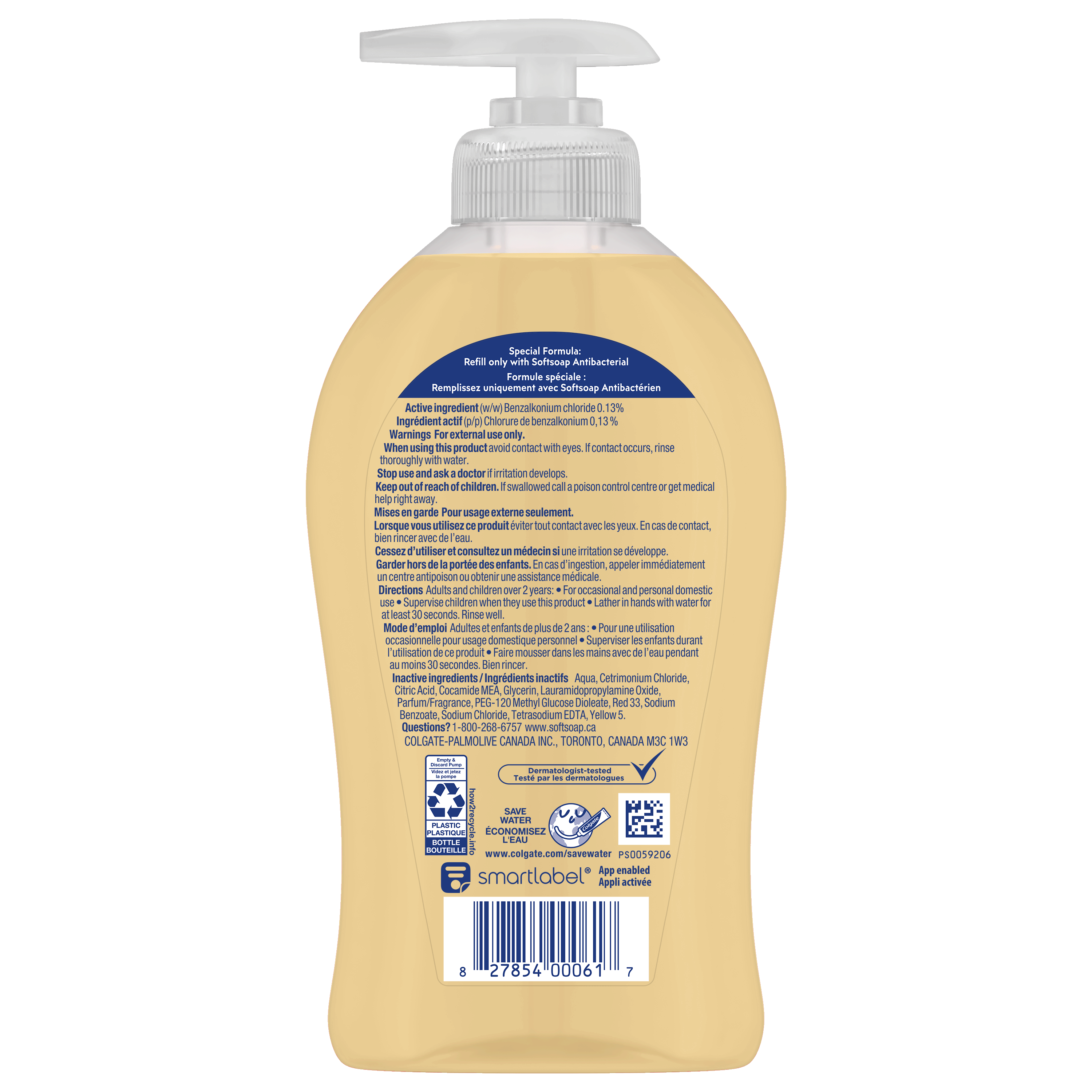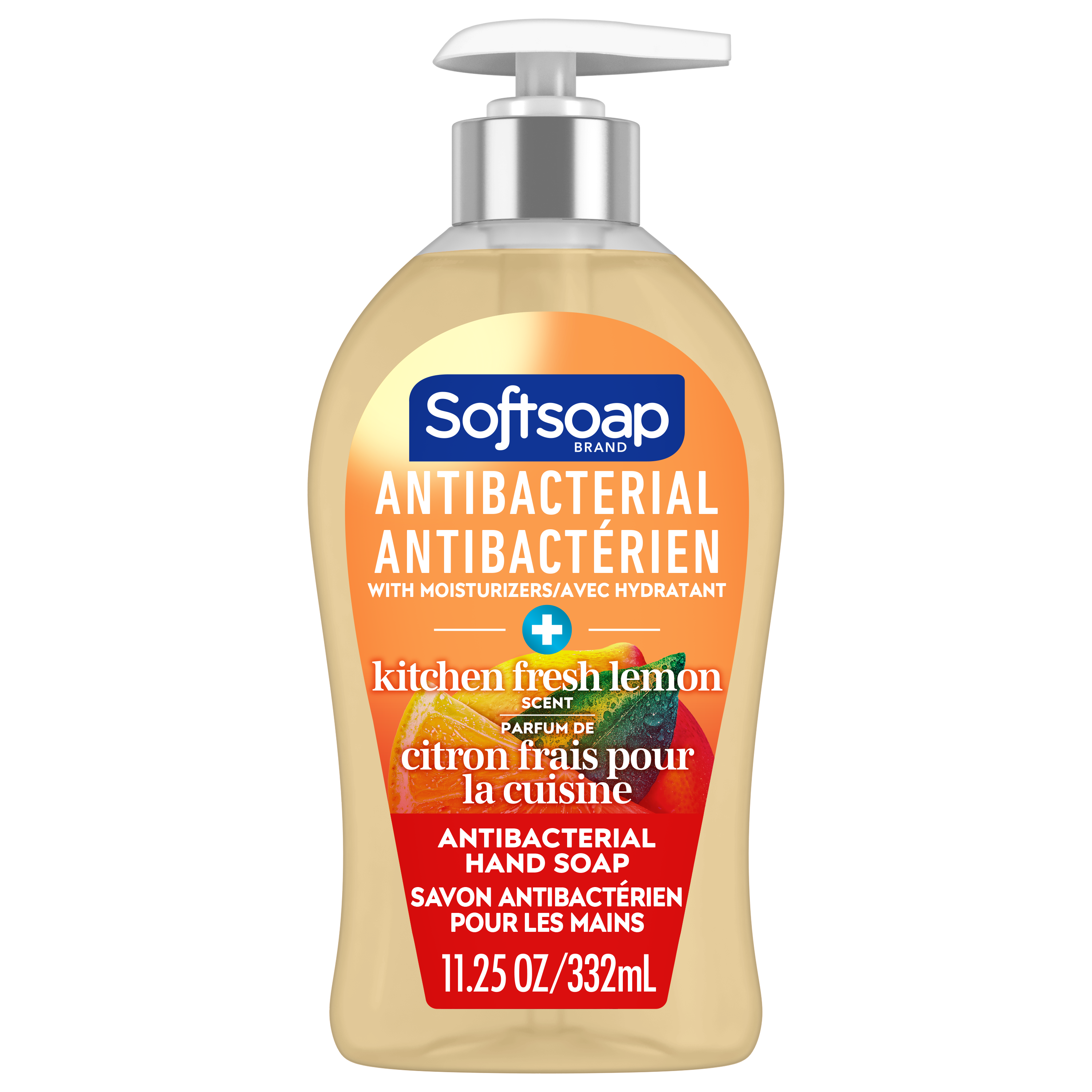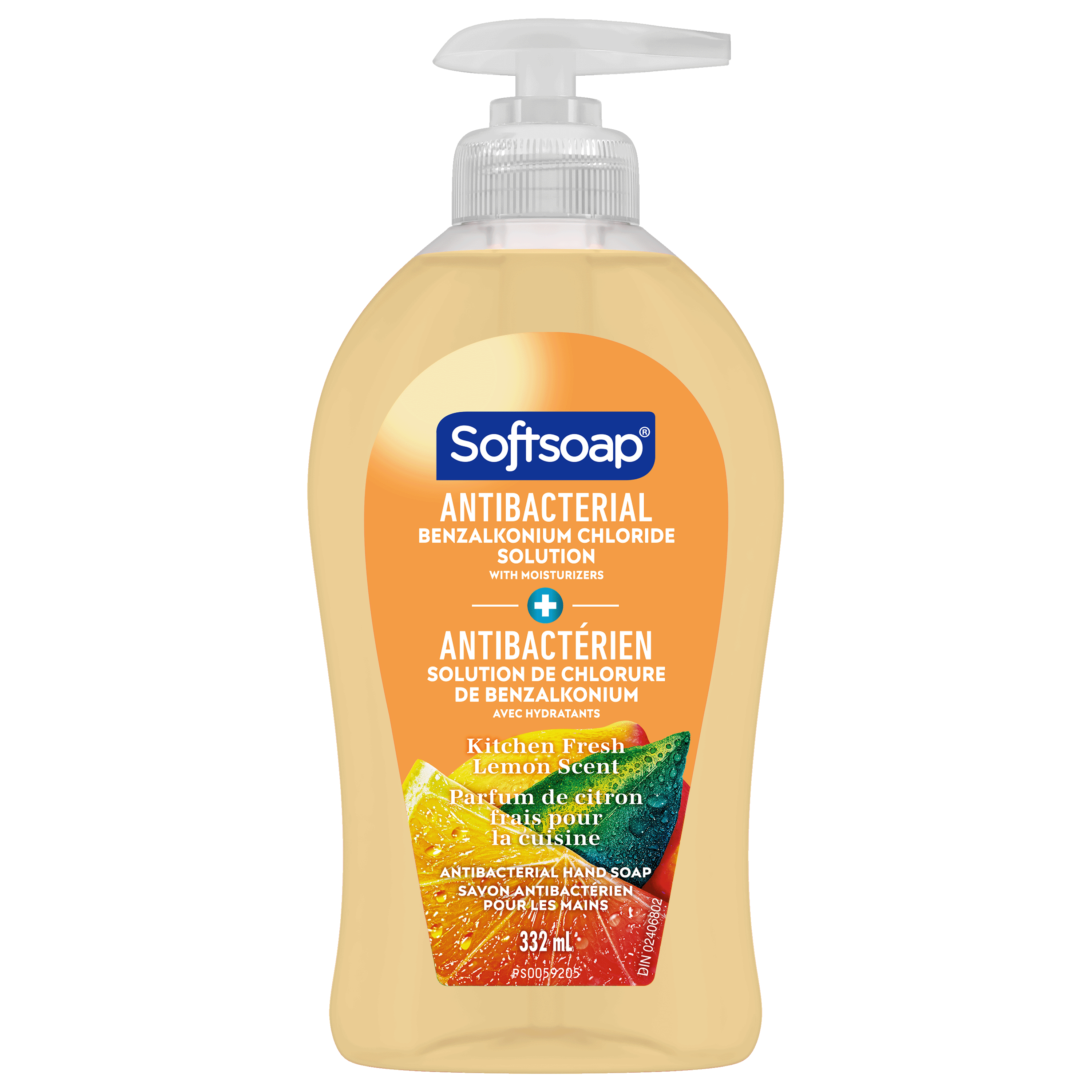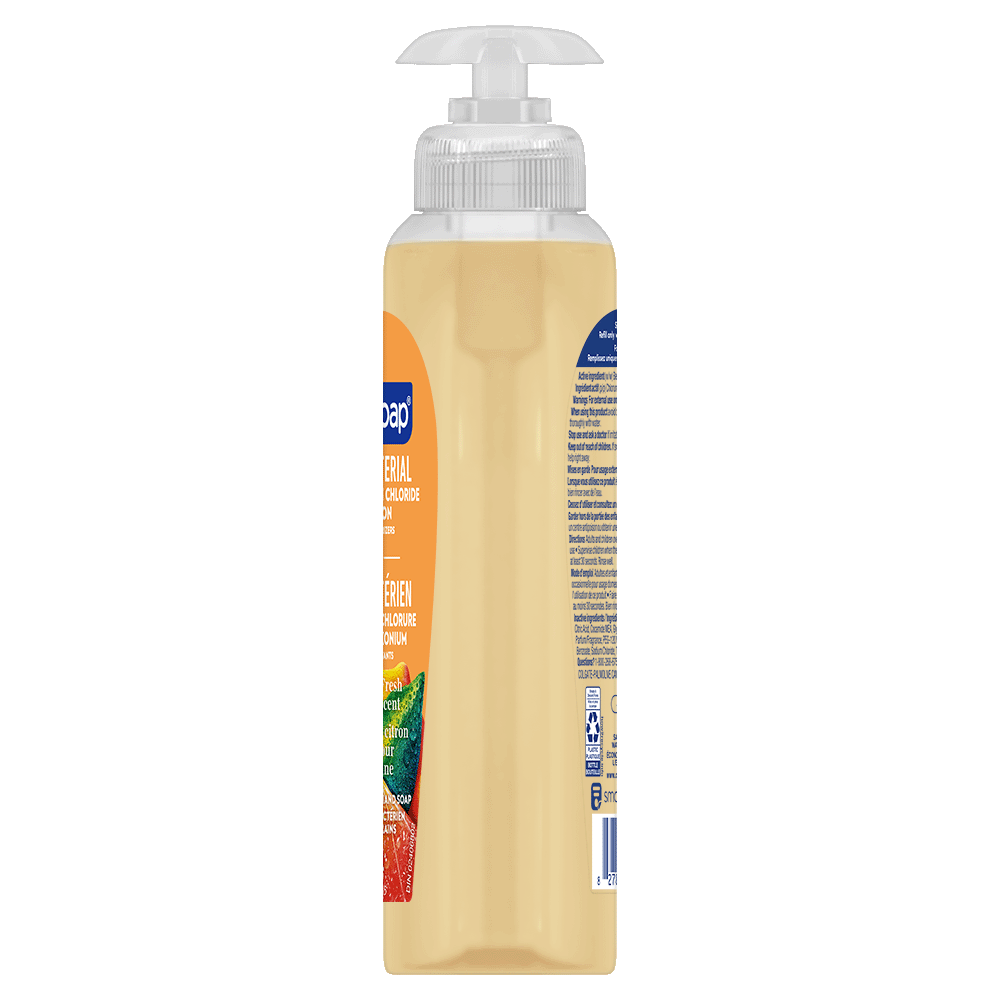 SKU 61020131 Consumer Unit - GTIN 00827854000617 Case - GTIN 10827854000614 Product Category Personal Care Product Sub Category Liquid Hand Wash Product Equity (Brand) Softsoap Product Sub Brand Softsoap LHW Product Title Softsoap Antibacterial Liquid Hand Soap, Kitchen Fresh Hands Lemon Scent Hand Soap, 332 ml Bottle Product Description From the #1 liquid hand soap brand (1), comes Softsoap Antibacterial Kitchen Fresh Hands Liquid Hand Soap which eliminates 99.9% of bacteria (2). With a fresh lemon scent, this antibacterial hand soap effectively cleans hands while infusing small moments with joy. Our liquid hand soap is enriched with moisturizers and helps protect skin’s natural barrier by retaining skin’s natural moisture. This special formula leaves skin feeling soft. This fresh kitchen hand soap is paraben free, formulated without phthalates, and dermatologist tested. Feel the joy of clean with Softsoap hand soap! (1) Based in part on data reported by Nielsen through its Market Track Service for the Liquid Hand Soap Category for the 52 week period ending 1/1/22, for the All Outlet market. Copyright © 2022 Nielsen. (2) in a handwashing test vs. the following common harmful bacteria: S. aureus & E. coli. Bullet 1 One 332 ml Bottle of Softsoap Kitchen Fresh Hands Antibacterial Liquid Hand Soap Bullet 2 Our trusted formula is designed to eliminate 99.9% of bacteria (2), ensuring your hands are clean Bullet 3 With a fresh lemon scent, this antibacterial hand soap effectively cleans hands while infusing small moments with joy Bullet 4 Our orange hand soap is enriched with moisturizers and helps protect skin’s natural barrier by retaining skin’s natural moisture Bullet 5 This bathroom hand soap is paraben free, formulated without phthalates, and dermatologist tested