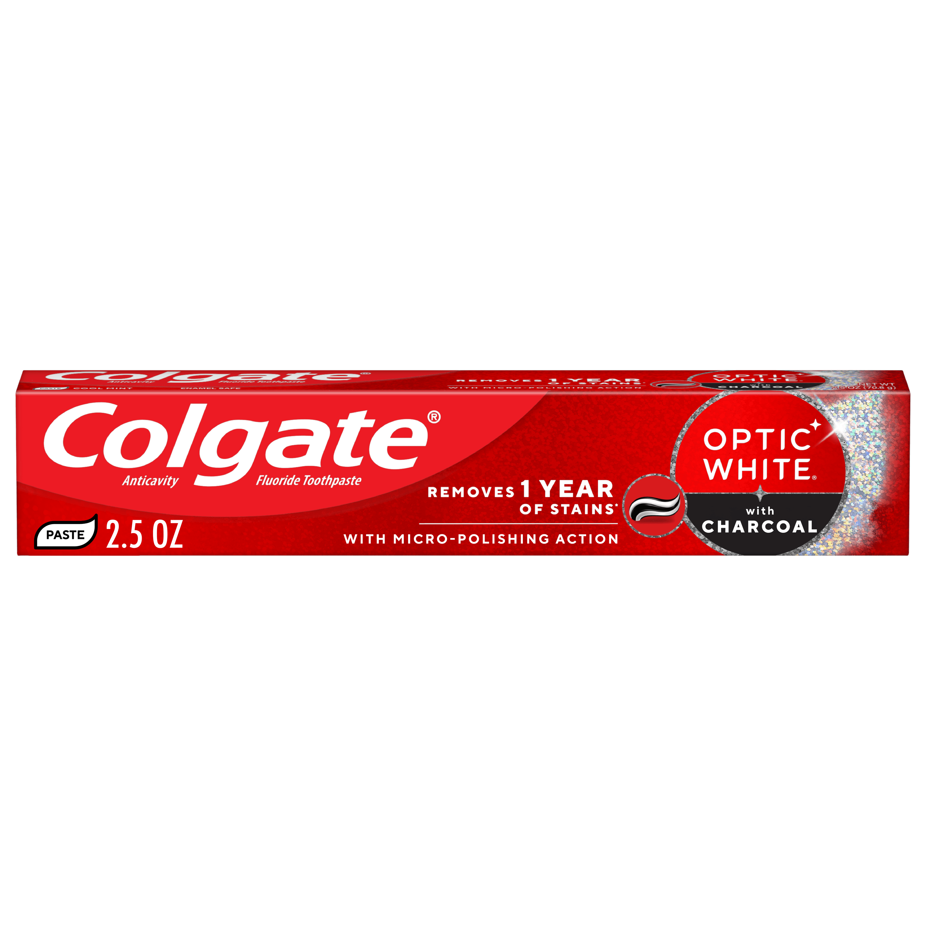 SKU 61021094 Consumer Unit - GTIN 00827854001409 Case - GTIN 10827854001406 Product Category Oral Care Product Sub Category Toothpaste Product Equity (Brand) Colgate Product Sub Brand Colgate Optic White TP Product Title Colgate Optic White with Charcoal Teeth Whitening Toothpaste, Anticavity Toothpaste with Fluoride, Cool Mint Flavor, 3.8 OZ Product Description Colgate Optic White with Charcoal Toothpaste removes 1 year of stains* while freshening breath with its cool mint flavor. With effective micropolishers, this teeth whitening toothpaste safely removes surface stains. Enamel safe for daily use, Optic White with Charcoal delivers a refreshing experience with a sweet peppermint flavor. Optic White with Charcoal removes 5X more surface stains with micro-polishing action** for a brighter smile. Micro-Polishing Action: Safely Removes Surface StainsColgate Optic White with Charcoal uses micropolishers to brush away surface stains and help prevent new ones from forming. This black toothpaste with black and white stripes is designed to remove 1 year of stains*.Enamel Safe ToothpasteOptic White with Charcoal is a patented whitening formula that is enamel safe for everyday use and an effective anticavity toothpaste with fluoride.Cool Mint ToothpasteOur sweet peppermint toothpaste freshens breath with a cool mint flavor that lasts from the first taste to the finish.*when brushing twice daily for 3 weeks**vs. ordinary, non-whitening toothpaste after 2 weeks of continued use eCommerce Copy- Long Description Colgate Optic White with Charcoal Whitening Toothpaste, Cool Mint Paste, 2.5 Oz. Help remove every day surface stains with the Colgate Optic White with Charcoal Toothpaste. This whitening toothpaste with charcoal removes 95% of daily surface stains* for a brighter smile. Get ready to reveal a smile that’s ready to shine with the Colgate Optic White Whitening Toothpaste with Charcoal. Patented Teeth Whitening Formula with Minty Freshness The Colgate Optic White Whitening Toothpaste with Charcoal uses a patented whitening formula to remove 95% of daily surface stains*. Using micro-polishing actions, this whitening stain removal toothpaste removes 5X more surface stains.** Plus, this charcoal gray toothpaste comes in a refreshing Cool Mint paste flavor so you can enjoy minty freshness every time you brush. Enamel Safe Whitening That Works Colgate Optic White with Charcoal Toothpaste is a sugar free and vegan toothpaste that is enamel-safe for daily use. This teeth whitening toothpaste is also an anticavity fluoride toothpaste to help prevent cavities. For whitening that works, choose the Colgate Optic White with Charcoal Whitening Toothpaste. *after 2 weeks of twice daily use **vs. ordinary, non whitening toothpaste after 2 weeks of continued use Bullet 1 One 3.8 oz tube of Colgate Optic White with Charcoal Toothpaste Bullet 2 Removes 1 year of stains* (*when brushing twice daily for three weeks) Bullet 3 Safely removes 5X more surface stains with micro-polishing action* (*vs. ordinary, non-whitening toothpaste after 2 weeks of continued use) Bullet 4 Cool Mint flavor with sweet peppermint and anise for a refreshing taste Bullet 5 Enamel safe for daily use Bullet 6 Optic White with Charcoal is a fluoride toothpaste that provides cavity protection Bullet 7 Optic White with Charcoal is a vegan toothpaste Active Ingredients Sodium Fluoride 0.24% (0.15% w/v fluoride ion) Dollar Tree RPC 357532 Family Dollar RPC 903536