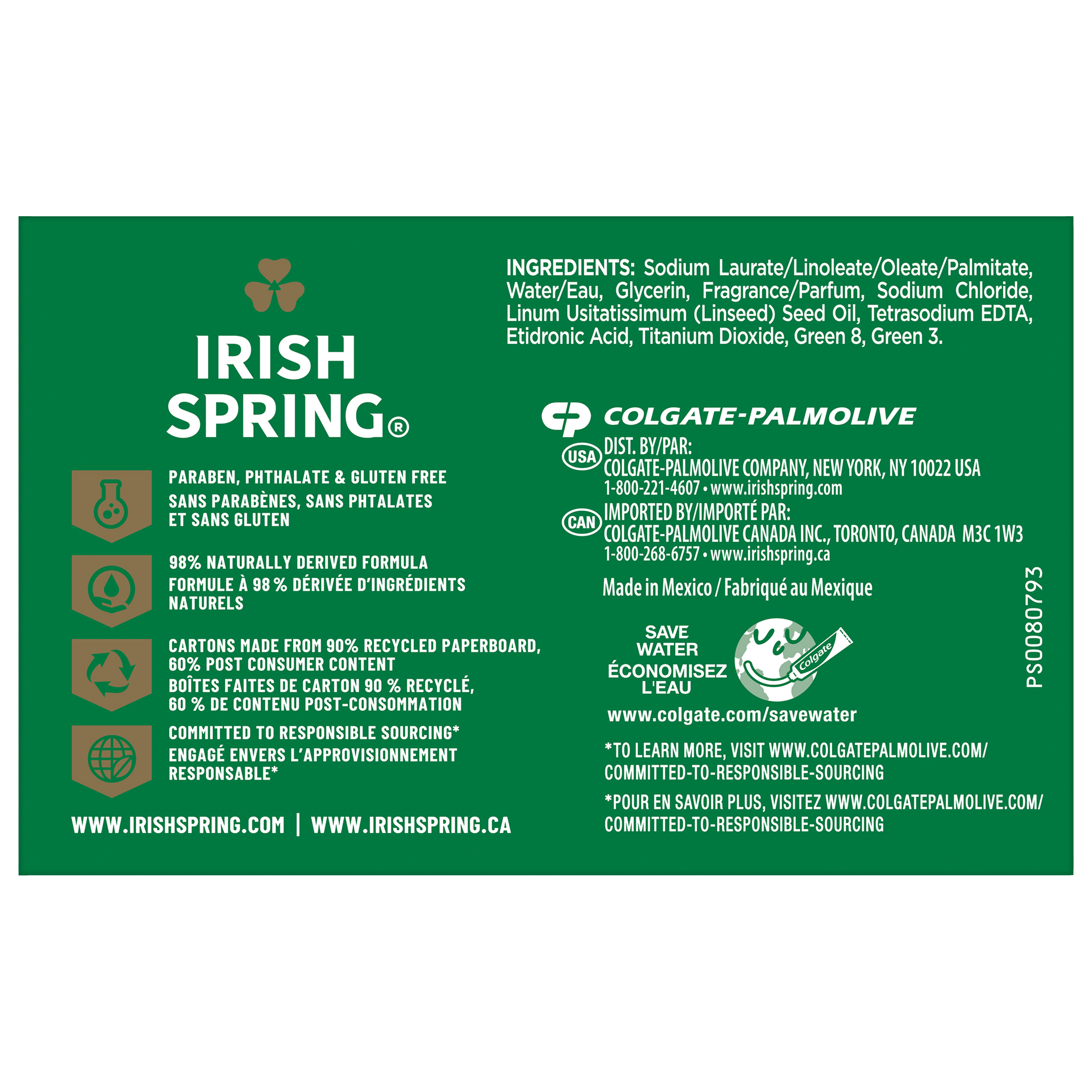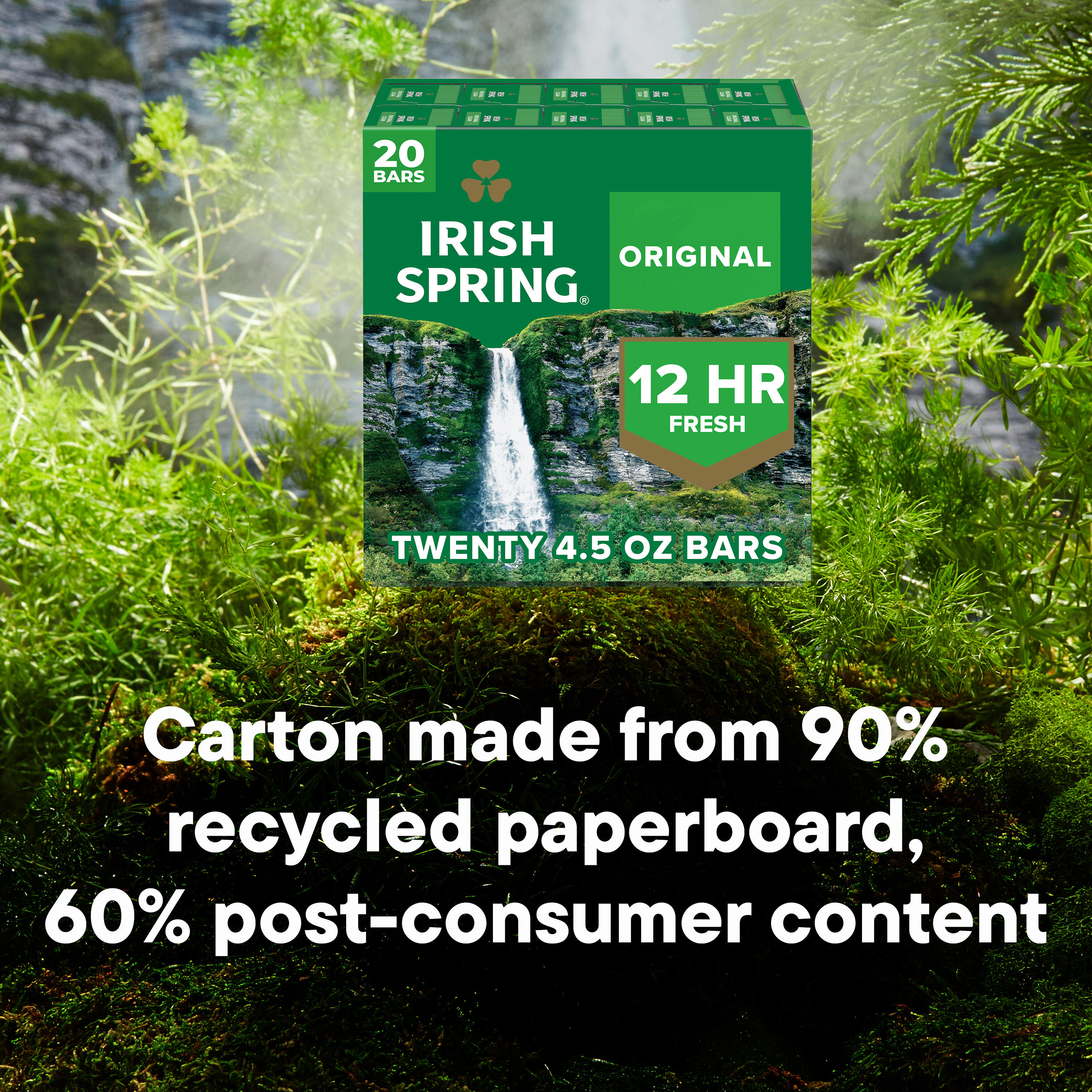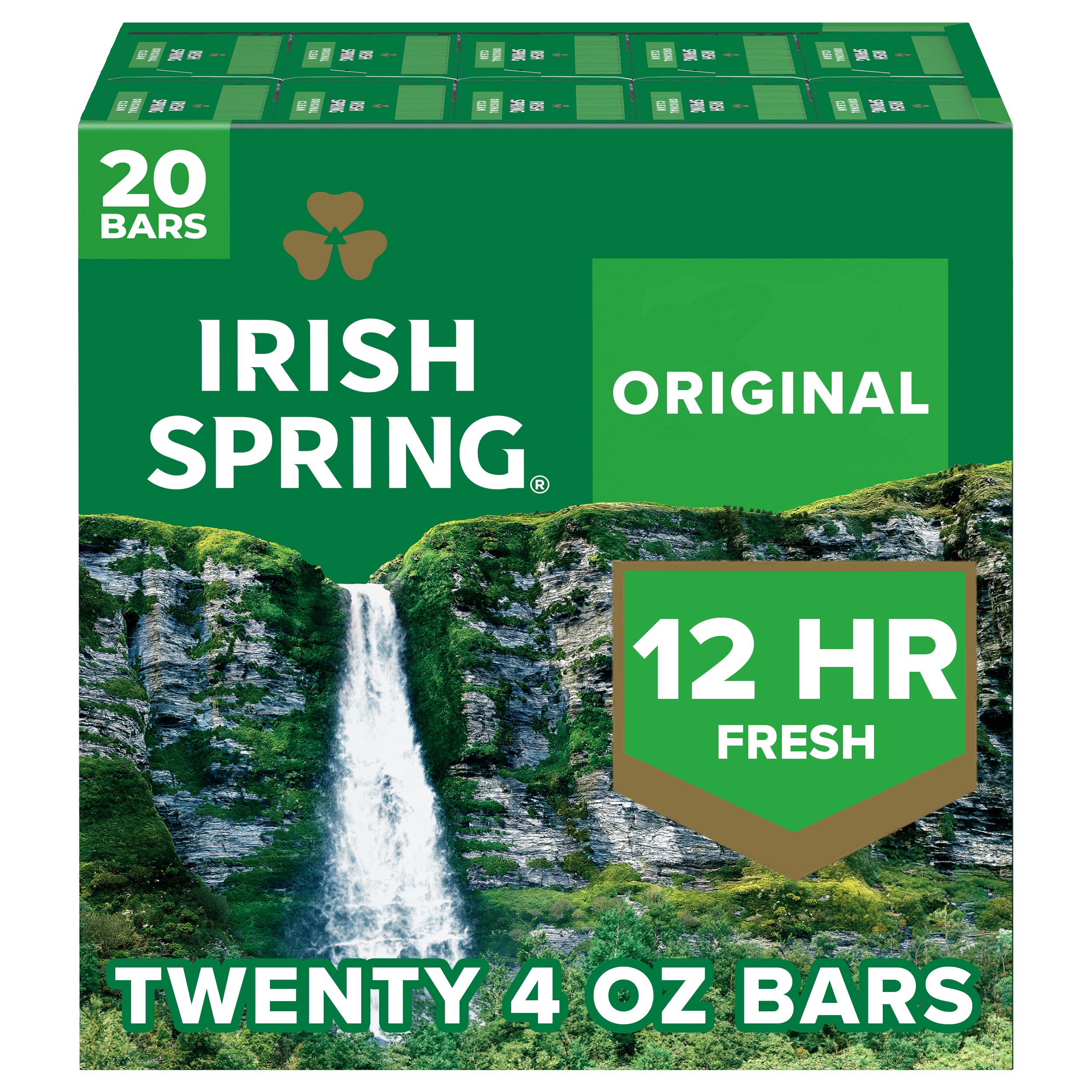 SKU 61021235 Consumer Unit - GTIN 00827854001492 Case - GTIN 20827854001496 Product Category Personal Care Product Sub Category Bar Soap Product Equity (Brand) Irish Spring Product Sub Brand Irish Spring BS Product Title Irish Spring Original Deodorant Bar Soap for Men, With Flaxseed Oil, 12 Hour Fresh Deodorant Soap, 4 oz Bar (20 Pack) Product Description Count on Irish Spring Original Bar Soap to leave your skin feeling clean and fresh. Our deodorant bar soap for men is made with a 98% naturally derived formula that keeps you fresh for 12 hours and is suitable for all skin types. Irish Spring Original Bar Soap can be used as a hand soap or face wash. This bar soap is suitable for all skin types, including normal, oily, and dry skin, ensuring an effective cleanse. It is also paraben, phthalate, and gluten free and has flaxseed oil. Add some adventure to your everyday life with the entire Irish Spring line of body washes and bar soaps for men. eCommerce Copy- Long Description Irish Spring Original Clean Deodorant Bar Soap, 20 Pack Smell like you came from a nice-smelling place with Irish Spring Bar Soap. Count on Irish Spring Original Bar Soap to leave your skin feeling clean — our original bar soap for men is made with a 98% naturally derived formula that keeps you fresh for 12 hours. Fresh Look, Great Smell Feel clean, smell serene with the new Irish Spring. Our recyclable carton might have a new design, but it’s still the same great bar soap you love. Our packaging refresh is all part of our master plan to bring the amazing places you love to smell straight to your bathroom. Get as fresh as the great outdoors and add some adventure to your everyday with the whole line of body washes and bar soaps for men. We want you to smell as great as you feel, so you can focus on moments that turn into memories. Bar Soap for Body and Hands Irish Spring Original Bar Soap has a sudsy lather that washes away bacteria, so you can use it as a hand soap bar and keep the fresh smell going all day long. Plus, this soap bar is mild for skin. It’s paraben, phthalate and gluten free and has flaxseed oil. Feel good while washing your hands and body with Irish Spring. Irish Spring Bar Soap Pack Never go without smelling your best. The Irish Spring bar soap pack is conveniently packaged so that you can stock up. Keep some in your bathroom, in the pantry, give some to your friends and keep the good smells going. Bullet 1 What’s Included: Twenty 4 oz soap bars of Irish Spring Original Deodorant Bar Soap for Men Bullet 2 Deodorant Soap: Our bar soap leaves your skin feeling clean Bullet 3 Versatile Use: Irish Spring bar soap can be used as a hand soap or a face wash Bullet 4 Infused with Flaxseed Oil: This bar soap is crafted with flaxseed oil Bullet 5 Natural Ingredients: 98% naturally derived formula, gluten free, paraben free, and formulated without phthalates Bullet 6 Sustainably Packaged: Carton made from 90% recycled paperboard, 60% post-consumer content Bullet 7 Refreshing Scent: That cool outdoor Freshness? We’re bringing it to the palm of your hand