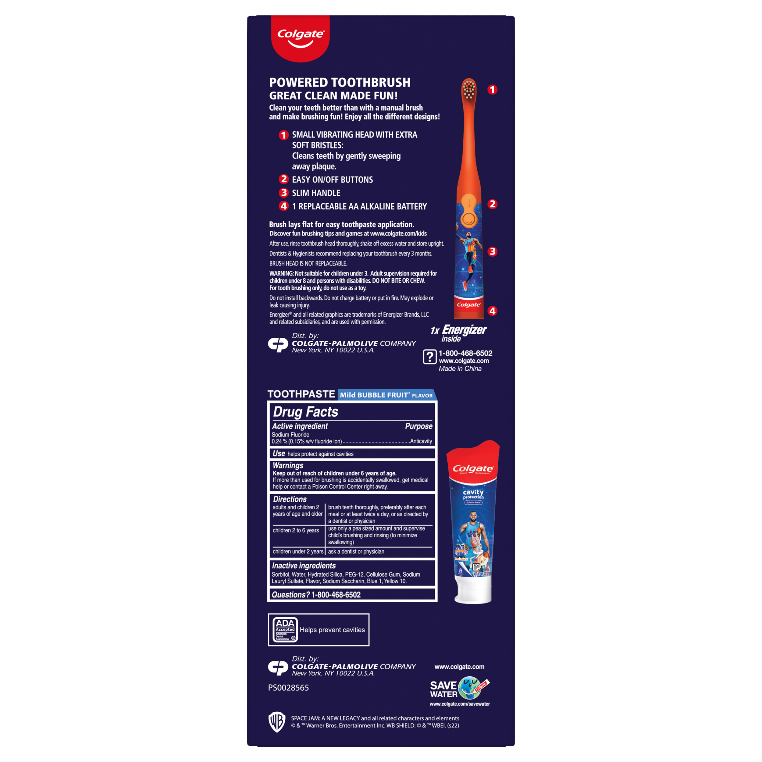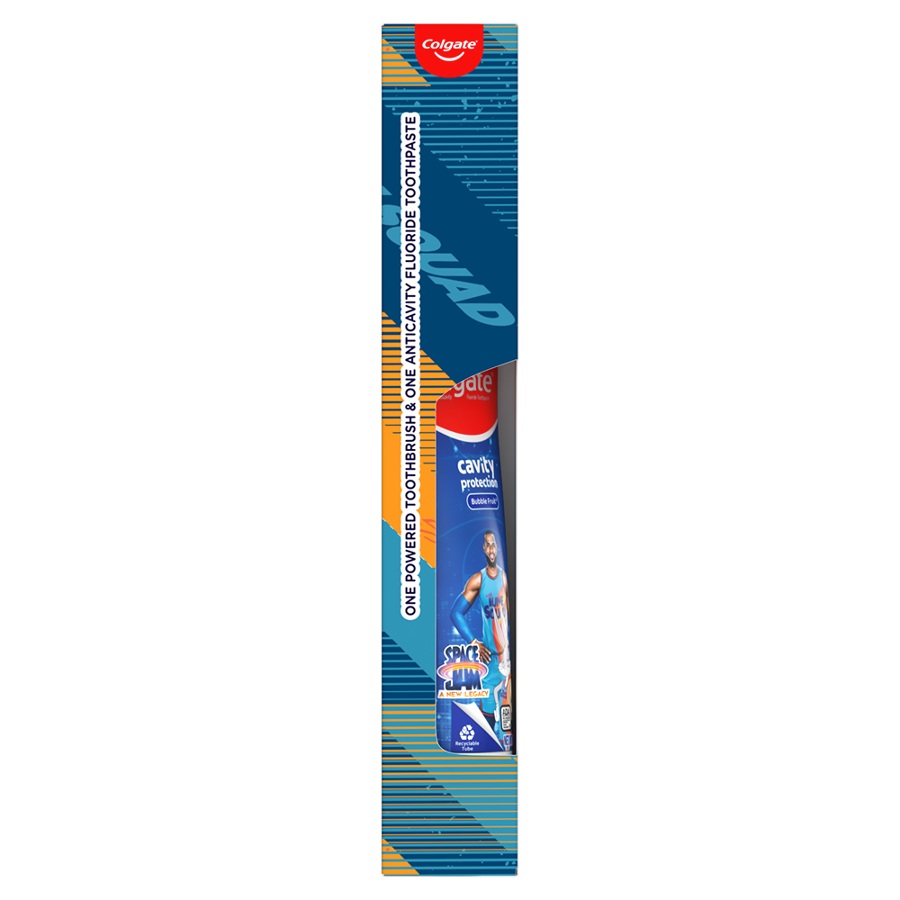 SKU 61021244 Consumer Unit - GTIN 00827854001522 Case - GTIN 10827854001529 Product Category Oral Care Product Sub Category Oral Care SUC Mixed Product Equity (Brand) Colgate Product Sub Brand Oral Care SBR Mixed Product Title Colgate Kids Toothbrush Set with Toothpaste, Space Jam Gift Set - 1 Battery Tootbrush and 1 Toothpaste Active Ingredients Sodium Fluoride 0.24 % (0.15% w/v fluoride ion)