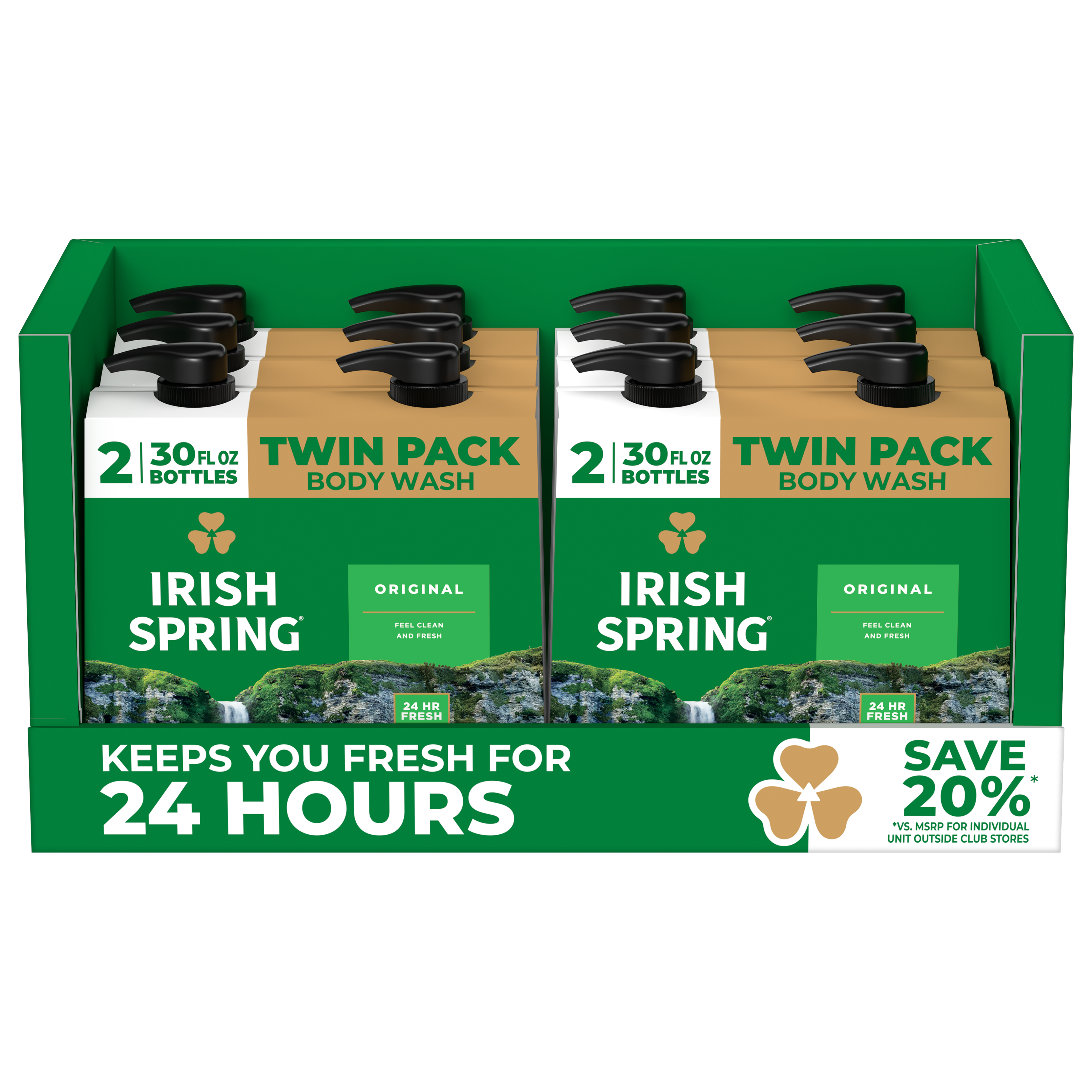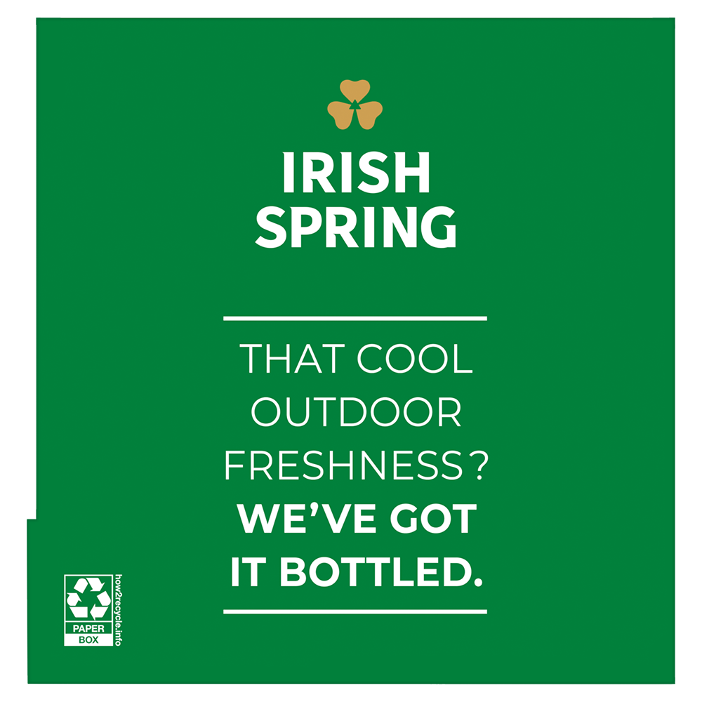 SKU 61021324 Consumer Unit - GTIN 00827854999997 Product Category Personal Care Product Sub Category Body Wash Product Equity (Brand) Irish Spring Product Sub Brand Irish Spring BW Product Title Irish Spring Original Moisturizing Body Wash for Men, 24-Hour Fresh, Face and Body Wash, Men’s Body Wash, Biodegradable Ingredients, Paraben Free, Cool Fresh Scent, 30 fl oz Pump Bottle (2 Pack) Product Description Start your day with the invigorating clean of Irish Spring Original Moisturizing Body and Face Wash for Men, designed to provide 24 hours of long-lasting freshness. Infused with a cool, outdoor-fresh scent, it brings the essence of nature to every wash, so you are ready to take on the day. It’s also paraben free and formulated without phthalates. Our body wash for men is specially crafted to retain your skin’s natural moisture. Designed for use on both the face and body, it simplifies your daily routine while delivering the same refreshing experience you expect from Irish Spring. eCommerce Copy- Long Description Help stop oral health problems* before they start with Colgate Total Active Prevention Plus Whitening Toothpaste. This refreshing peppermint teeth whitening toothpaste helps freshen breath, offers 6x better stain removal**, and uses a high concentration of scrubbing particles and dense cleaning foam to remove stains. Plus, this whitening fluoride toothpaste fights bacteria, the root cause of many oral health issues including gingivitis, plaque, tartar, sensitivity, weak enamel, stains, bad breath, and cavities. *such as cavities and gingivitis **after 6 weeks of use vs. regular fluoride toothpaste Bullet 1 What’s Included: Two 30 fl oz pump bottles of Irish Spring Original Moisturizing Face and Body Wash for Men Bullet 2 Feel Clean and Fresh: Enjoy 24 hours of long-lasting freshness Bullet 3 Retains Skin’s Natural Moisture: Use as a men’s body wash or face wash Bullet 4 Feeling Clean: Formulated without phthalates and parabens leaving you clean Bullet 5 Refreshing Scent: That cool outdoor Freshness? We’ve got it bottled Bullet 6 No Luck Required: Fresh. Green. Irish
