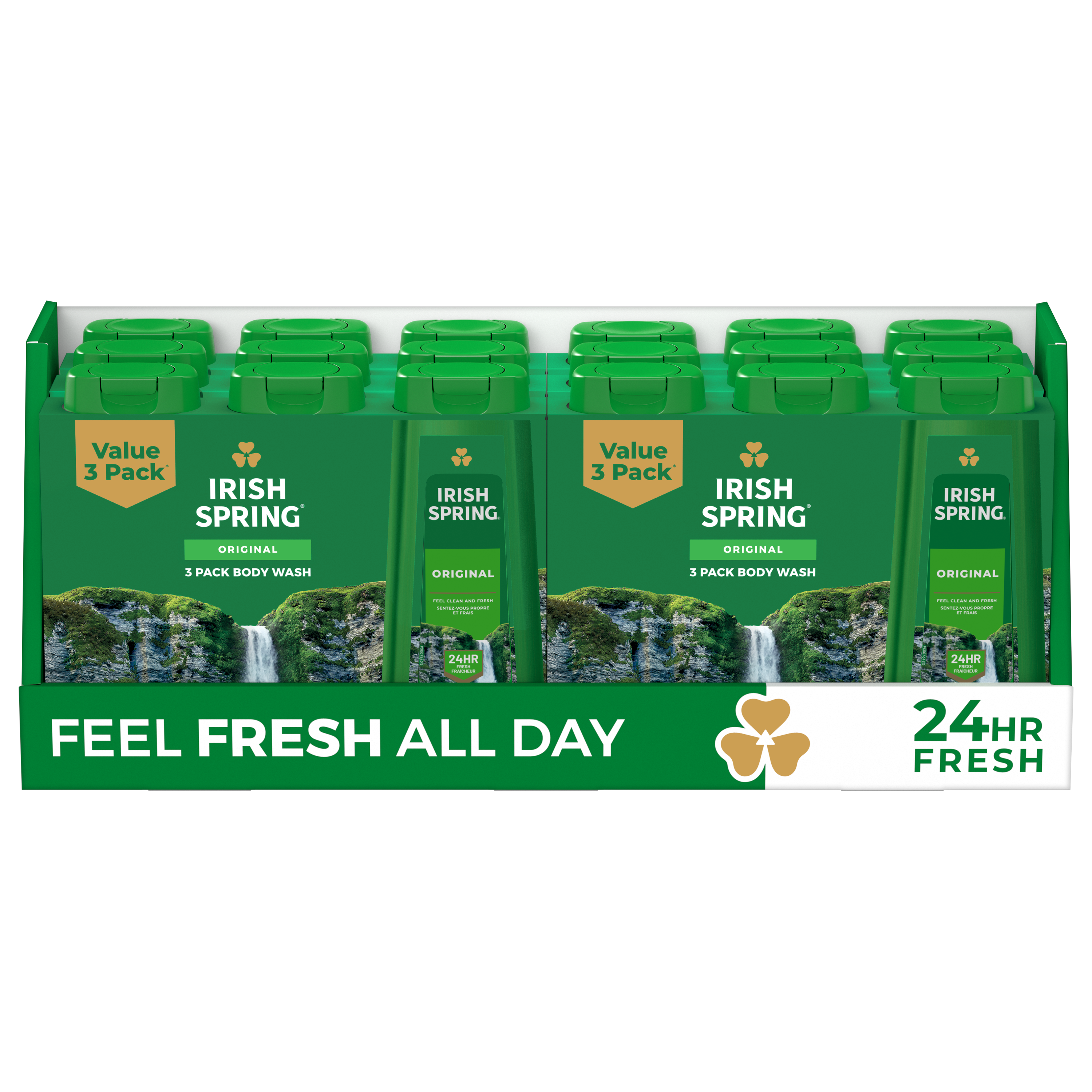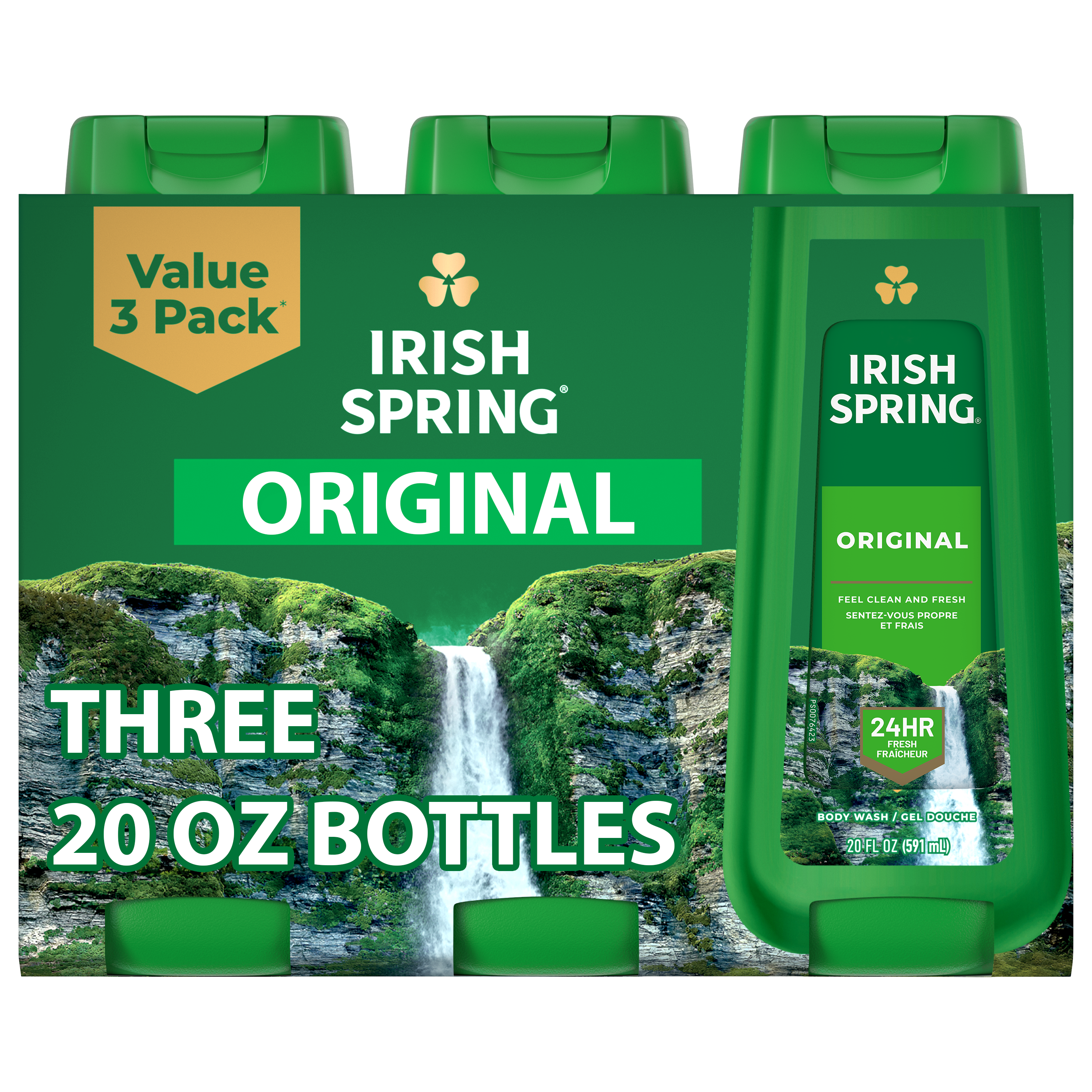 SKU 61021338 Consumer Unit - GTIN 00827854999997 Product Category Personal Care Product Sub Category Body Wash Product Equity (Brand) Irish Spring Product Sub Brand Irish Spring BW Product Title Irish Spring Original Moisturizing Body Wash for Men, 24-Hour Fresh, Face and Body Wash, Men’s Body Wash, Biodegradable Ingredients, Paraben Free, Cool Fresh Scent, 20 fl oz Bottle (3 Pack) Product Description Start your day with the invigorating clean of Irish Spring Original Moisturizing Body and Face Wash for Men, designed to provide 24 hours of long-lasting freshness. Infused with a cool, outdoor-fresh scent, it brings the essence of nature to every wash, so you are ready to take on the day. It’s also paraben free and formulated without phthalates. Our body wash for men is specially crafted to retain your skin’s natural moisture. Designed for use on both the face and body, it simplifies your daily routine while delivering the same refreshing experience you expect from Irish Spring. Plus, Irish Spring has a new cap with leak-proof design ensuring you stay fresh no matter where your journey takes you. Bullet 1 What’s Included: Three 20 fl oz bottles of Irish Spring Original Moisturizing Face and Body Wash for Men Bullet 2 Feel Clean and Fresh: Enjoy 24 hours of long-lasting freshness Bullet 3 Retains Skin’s Natural Moisture: Use as a men’s body wash or face wash Bullet 4 Cap With Leak-Proof Design: Comes with a new cap with leak-proof design so you can stay fresh no matter where your journey takes you Bullet 5 Feeling Clean: Formulated without phthalates and parabens leaving you clean Bullet 6 Refreshing Scent: That cool outdoor Freshness? We’ve got it bottled Bullet 7 No Luck Required: Fresh. Green. Irish