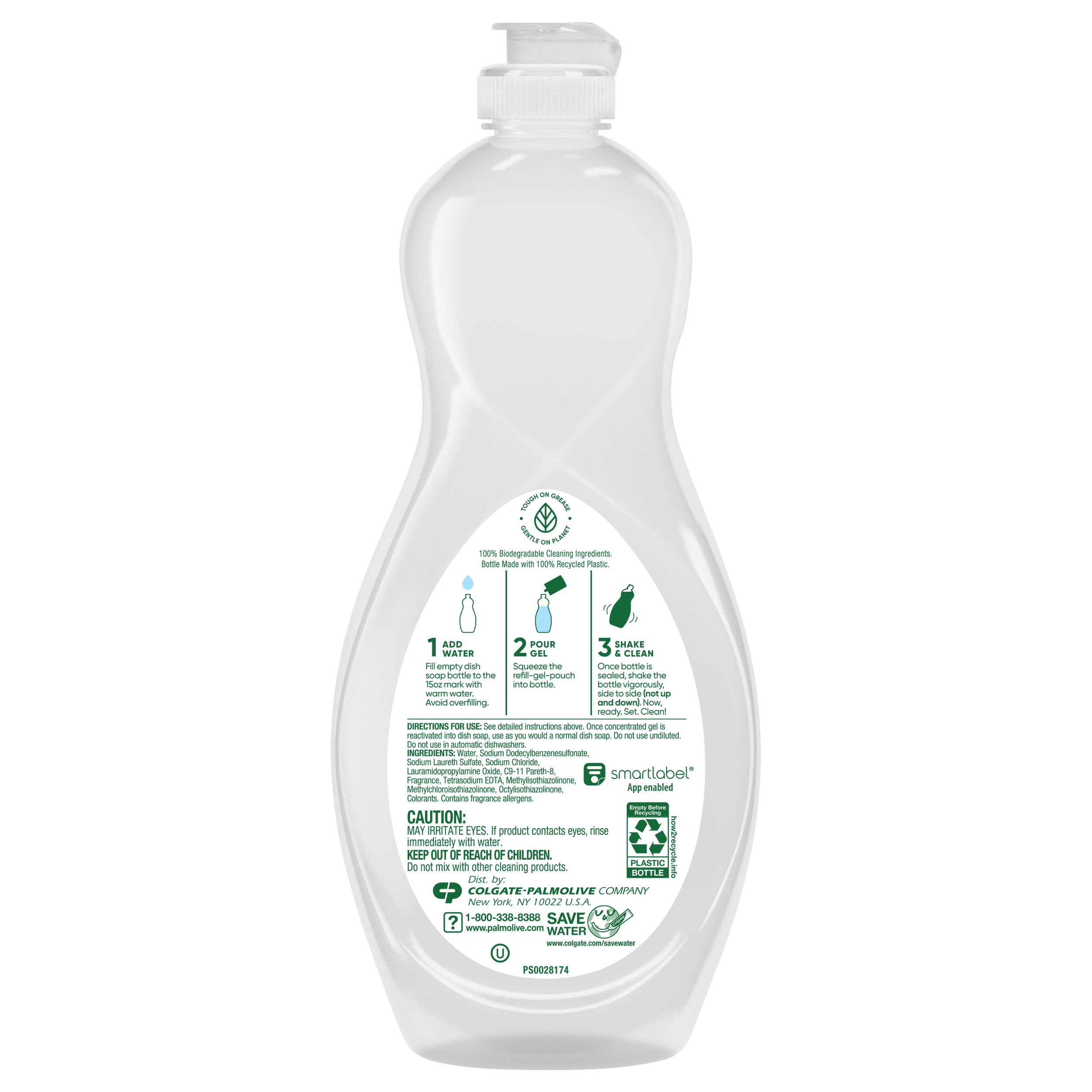SKU 61022074 Consumer Unit - GTIN 00827854002369 Case - GTIN 10827854002366 Product Category Home Care Product Sub Category Dish Hand Product Equity (Brand) Palmolive Product Sub Brand Palmolive Shake+Clean HD Product Title Palmolive Shake & Clean Dish Soap Liquid Refill Pouch with Reusable Bottle, Gel Dish Soap Concentrate, Lemon Citrus Scent Bullet 1 Palmolive Shake & Clean Dish Soap Concentrate Starter Kit Bullet 2 Includes 1 reusable bottle and 1 dish soap refill pouch Bullet 3 Each refill pouch contains 75% less plastic than a brand new 20 oz bottle Bullet 4 Reusable bottle is made from 100% recycled plastic Bullet 5 4x concentrated formula activates instantly when you add water to the 5 oz gel to yield a 20 oz bottle of soap Bullet 6 New dish soap concentrate from Palmolive, backed by 50+ years of trusted cleaning Bullet 7 Cuts grease on dishes Bullet 8 Family friendly formulas Bullet 9 0% parabens and phosphates