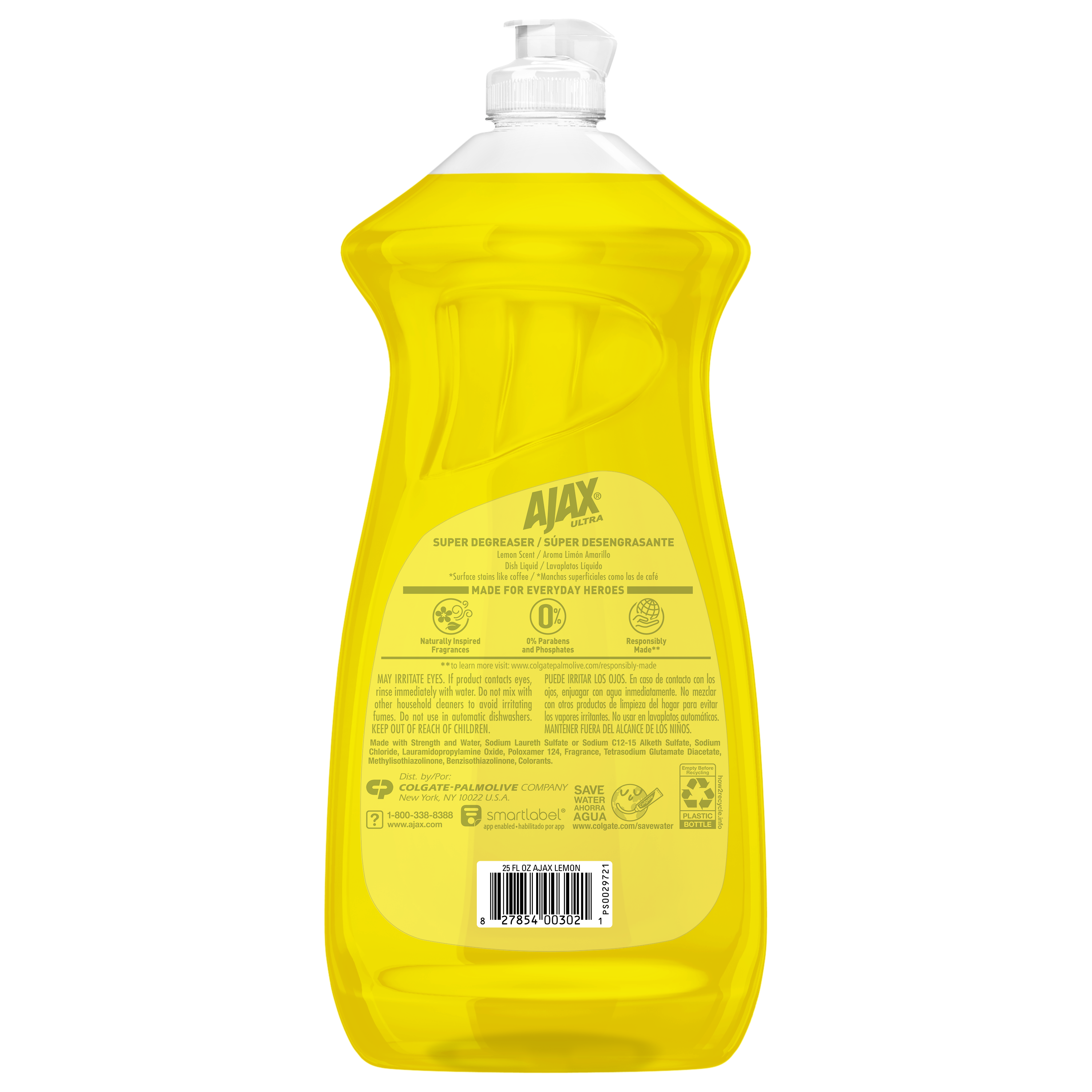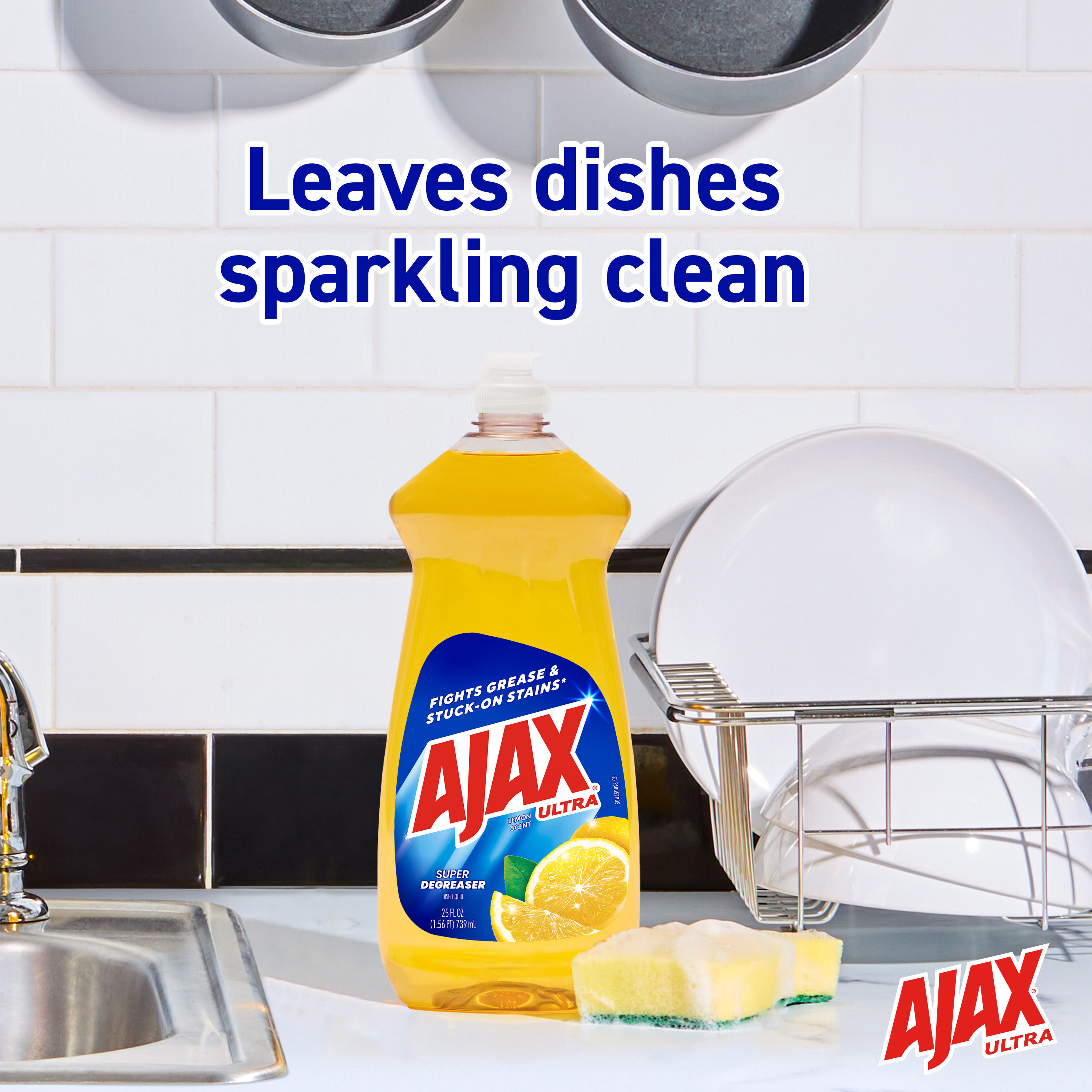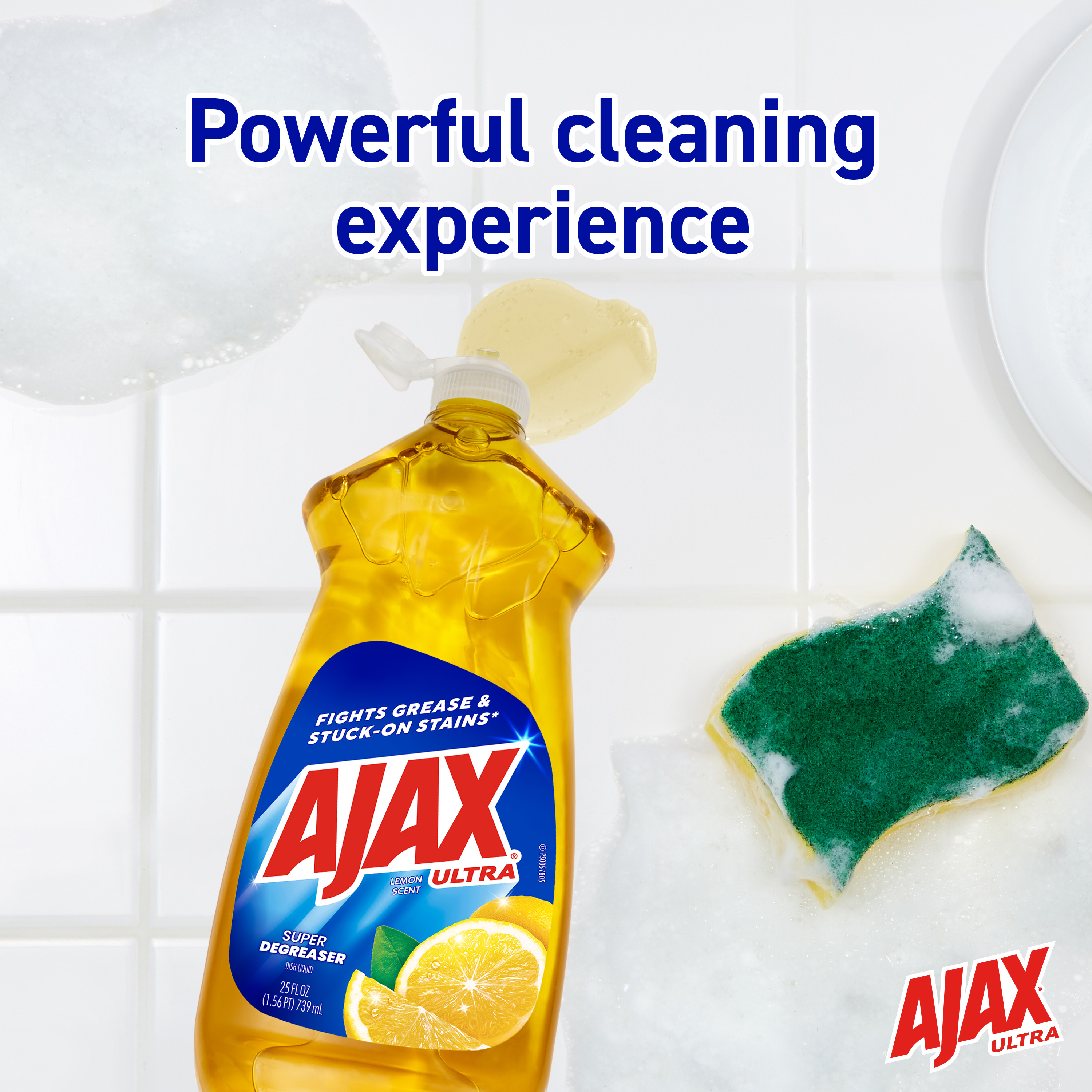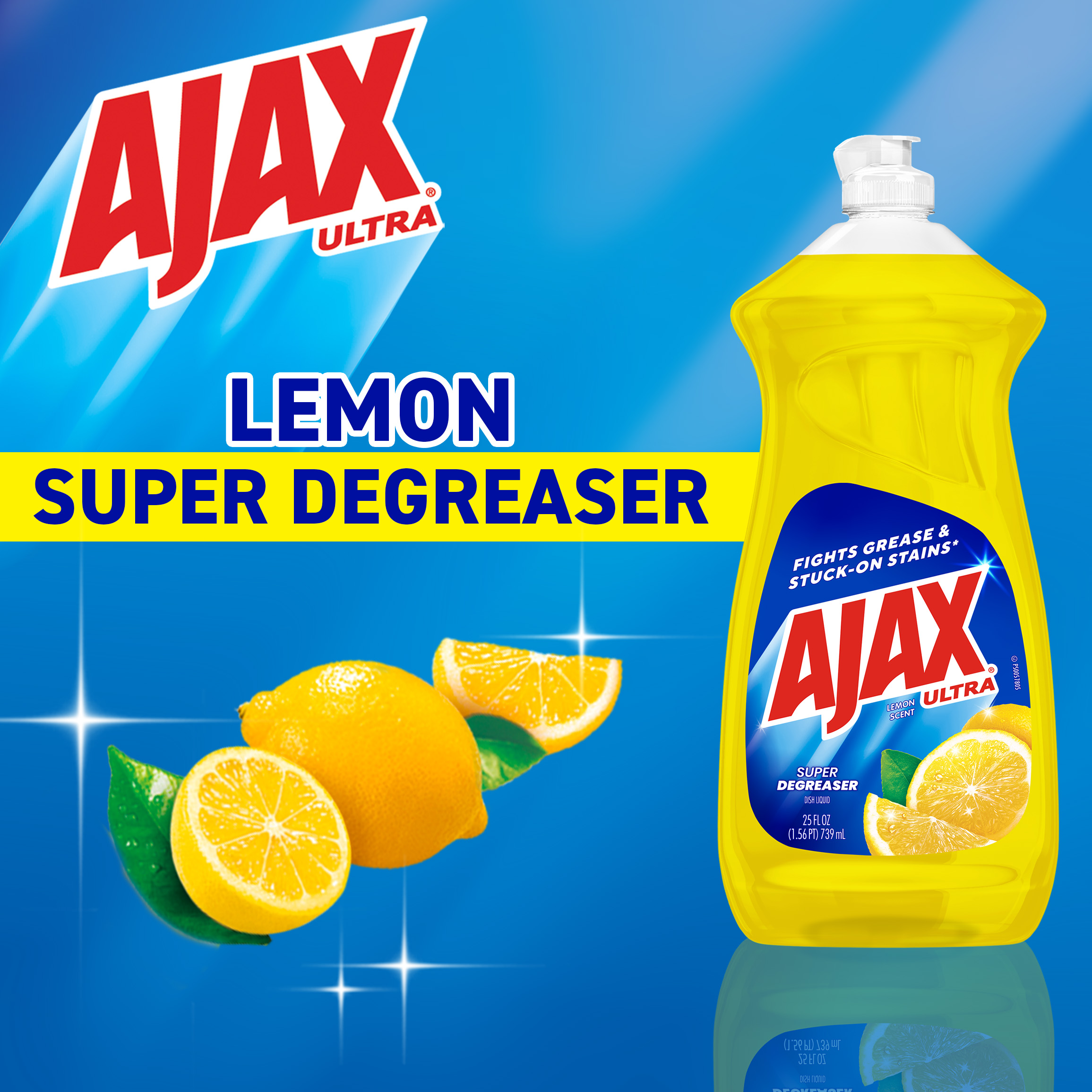 SKU 61022899 Consumer Unit - GTIN 00827854003021 Case - GTIN 10827854003028 Product Category Home Care Product Sub Category Dish Hand Product Equity (Brand) Ajax Product Sub Brand Ajax HD Product Title Ajax Ultra Liquid Dish Soap Lemon Scent, Super Degreaser, 25 oz Bottle Product Description Boost your mood and your dishwashing experience with Ajax Ultra Liquid Dish Soap. We have combined your favorite lemon scent with the efficacy of Ajax to help you fight grease and stuck-on stains on dishes, ensuring a powerful cleaning experience. Our super degreaser formula ensures you conquer grease and stubborn stains on your dishes, delivering a deep-cleaning action that leaves your kitchenware spotless. This dishwashing detergent liquid is made with naturally inspired fragrances, zero parabens and no phosphates. The power of Ajax Ultra goes beyond the sink. This versatile kitchen dish soap allows you to pre-treat laundry, wash tires, and wipe down appliances. Life is tough, but you're tougher! We understand that life isn’t easy. You work hard—heck, REALLY hard. You tackle big and small tough jobs, without looking for applause. That’s why we at Ajax recognize you, the everyday heroes, who step up at the end of a long day and get the dishes done. Because, let’s face it, at the end of the day a clean home is a happy home. Leave the grime to us so you can get back to what really matters! eCommerce Copy- Long Description Easily dissolve stuck-on grease