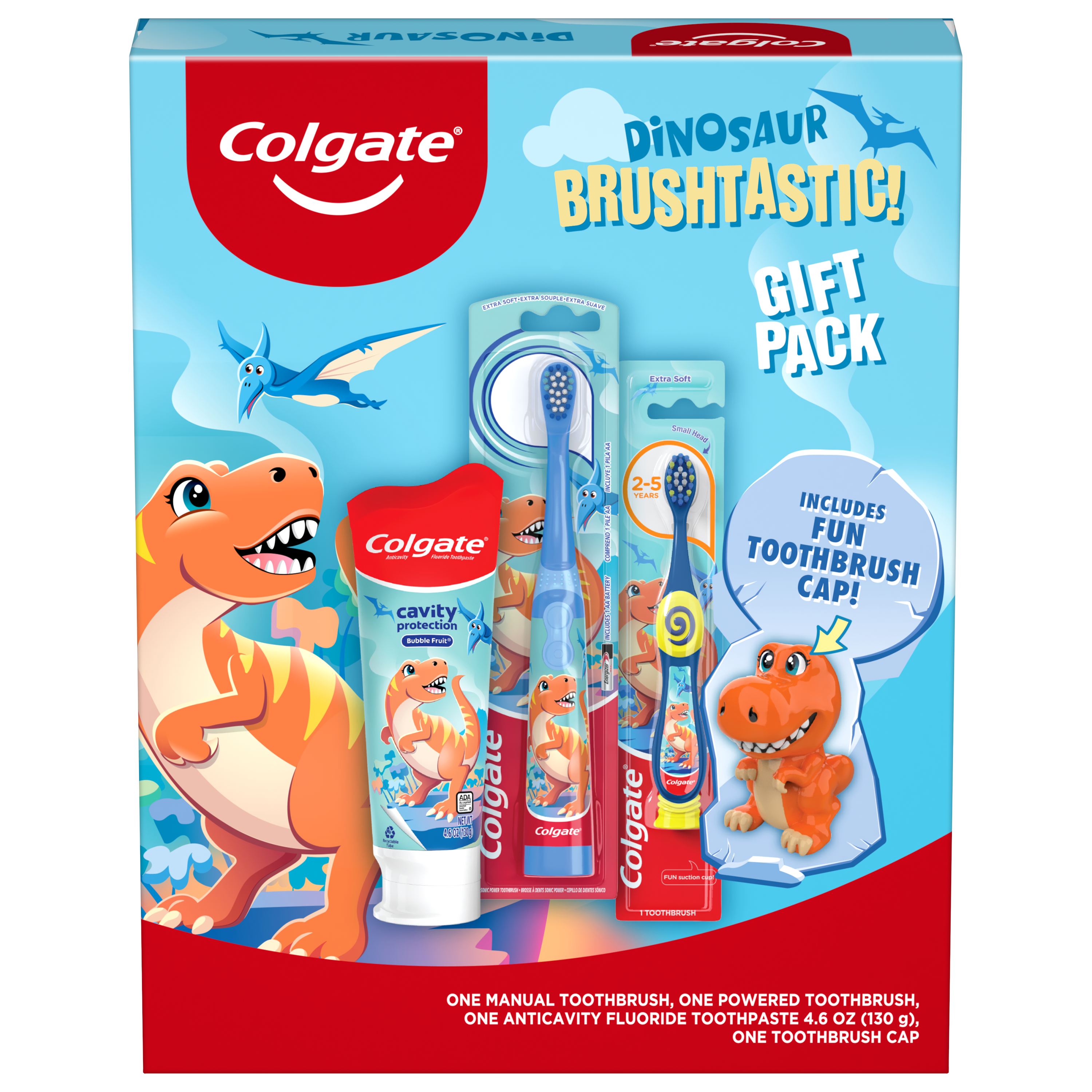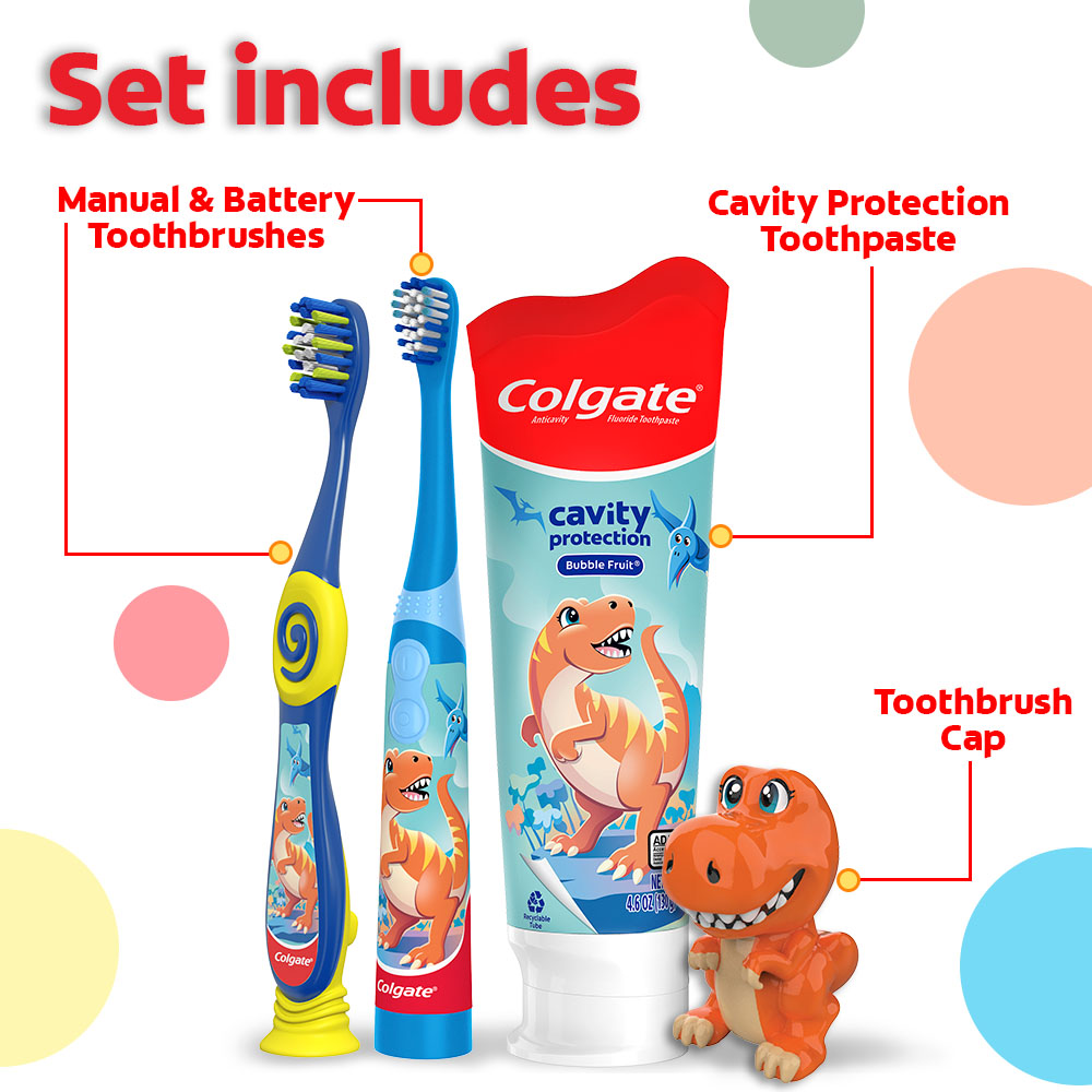 Colgate Kids Toothbrush Set with Toothpaste, Dinosaur Gift Set, 1 manual toothbrush, one powered toothbrush and one Toothpaste
