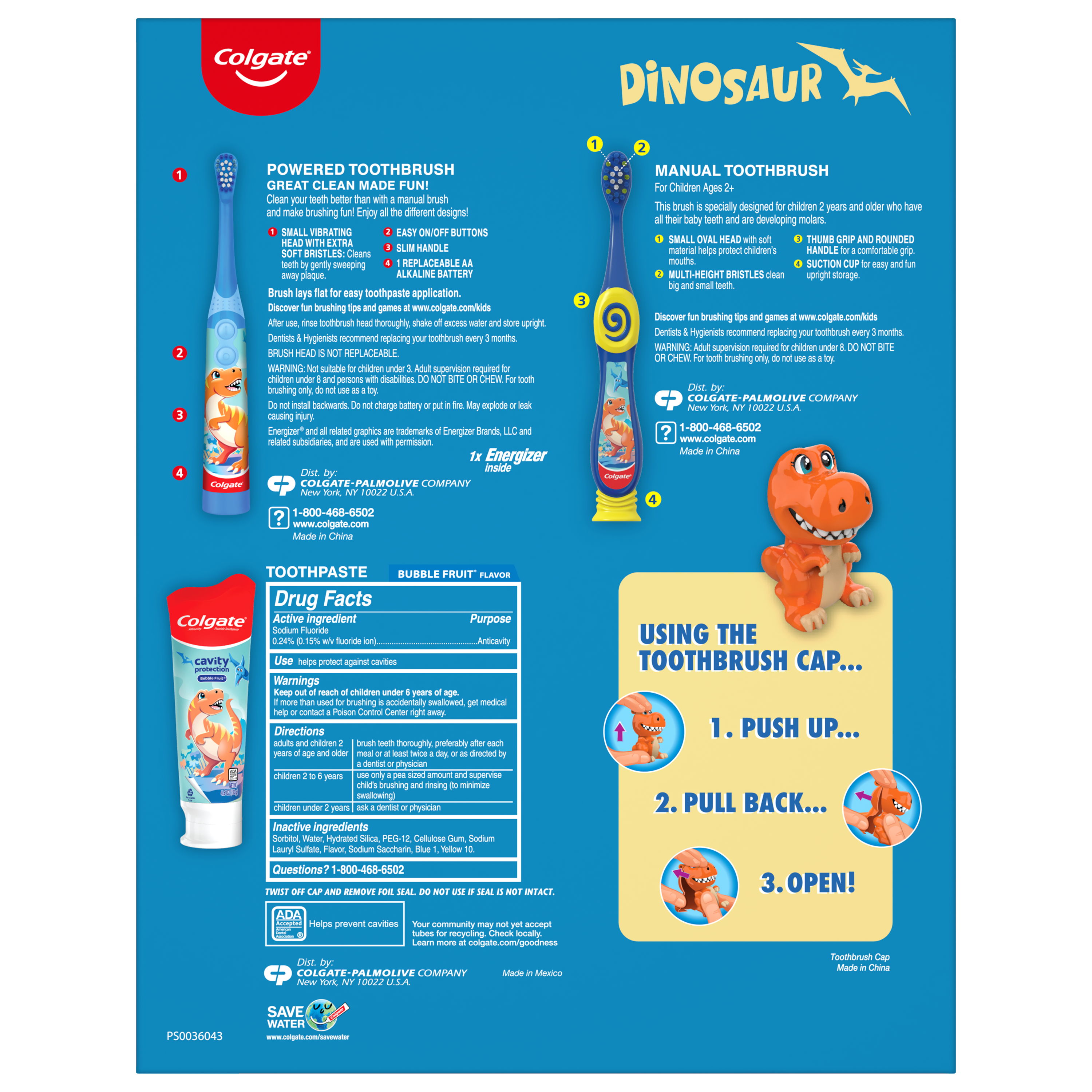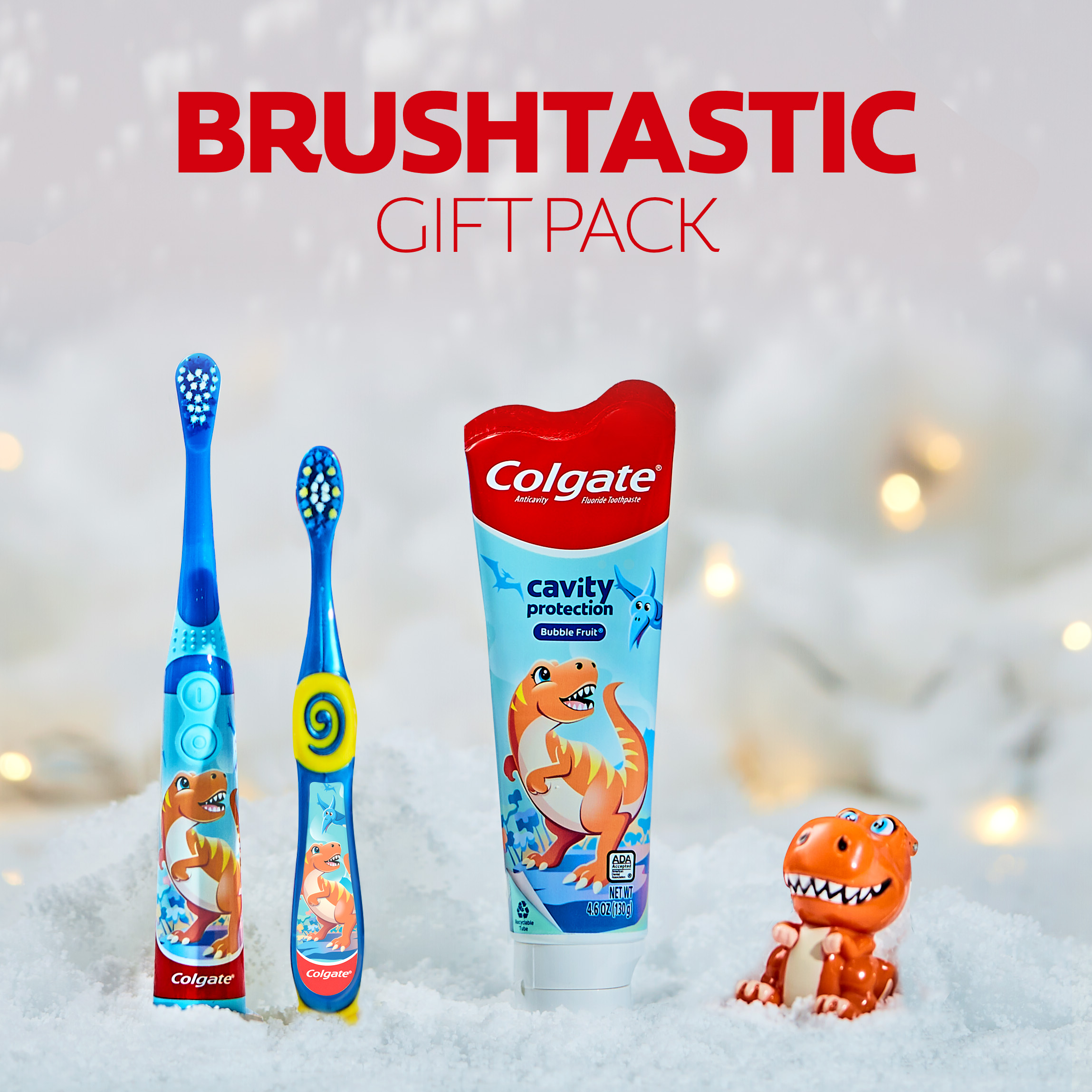 SKU 61024767 Consumer Unit - GTIN 00827854004493 Case - GTIN 10827854004490 Product Category Oral Care Product Sub Category Oral Care SUC Mixed Product Equity (Brand) Colgate Product Sub Brand Oral Care SBR Mixed Product Title Colgate Kids Toothbrush Set with Toothpaste, Unicorn Gift Set, 1 manual toothbrush, one powered tootbrush and one Toothpaste Product Description Colgate Kids Toothbrush Set With Toothpaste, Unicorn Gift Set, 1 Manual Toothbrush, one Powered Toothbrush and one Toothpaste Colgate is making brushing brushtastic this holiday season. The Colgate Kids Toothbrush Set With Toothpaste encourages good brushing habits while pairing kids with some of their favorite characters. Each gift pack comes with a kids battery toothbrush, a kids manual toothbrush and a kids toothpaste with a fun toothbrush cap. Choose your favorite character and get brushing! Kids Brushing Made Fun This Holiday Season Make teeth brushing fun for kids this holiday season. The Colgate kids toothbrush and toothpaste sets includes an ADA-accepted and clinically proven fluoride toothpaste to protect against cavities, reduce plaque buildup and fortify weak spots on enamel with regular brushing. Plus, its mild bubble fruit flavor tastes yummy while it works to freshen breath. Both Colgate Kids Toothbrushes have extra soft bristles that are gentle on delicate gums and growing teeth. The Colgate Kids Battery Toothbrush has a vibrating brush head to help kids brush better, while the manual toothbrush has a rounded handle and comfortable grip for when kids want to take the lead. Healthy Smiles With Colgate Bright Smiles, Bright Futures®: At Colgate, we’re making kids toothbrushes more fun because we know the power of a healthy smile. Our children’s oral health initiative, Bright Smiles, Bright Futures®, has impacted the lives of more than a billion children by providing free oral health education and dental care in over 80 countries. As the world leader in oral care, Colgate is committed to improving children's oral health around the world. eCommerce Copy- Long Description Colgate Kids Toothbrush Set With Toothpaste, Dinosaur Gift Set, 1 Manual Toothbrush, one Powered Toothbrush and one Toothpaste Colgate is making brushing brushtastic this holiday season. The Colgate Kids Toothbrush Set With Toothpaste encourages good brushing habits while pairing kids with some of their favorite characters. Each gift pack comes with a kids battery toothbrush, a kids manual toothbrush and a kids toothpaste with a fun toothbrush cap. Choose your favorite character and get brushing! Kids Brushing Made Fun This Holiday Season Make teeth brushing fun for kids this holiday season. The Colgate kids toothbrush and toothpaste sets includes an ADA-accepted and clinically proven fluoride toothpaste to protect against cavities, reduce plaque buildup and fortify weak spots on enamel with regular brushing. Plus, its mild bubble fruit flavor tastes yummy while it works to freshen breath. Both Colgate Kids Toothbrushes have extra soft bristles that are gentle on delicate gums and growing teeth. The Colgate Kids Battery Toothbrush has a vibrating brush head to help kids brush better, while the manual toothbrush has a rounded handle and comfortable grip for when kids want to take the lead. Healthy Smiles With Colgate Bright Smiles, Bright Futures®: At Colgate, we’re making kids toothbrushes more fun because we know the power of a healthy smile. Our children’s oral health initiative, Bright Smiles, Bright Futures®, has impacted the lives of more than a billion children by providing free oral health education and dental care in over 80 countries. As the world leader in oral care, Colgate is committed to improving children's oral health around the world. Bullet 1 Each gift pack comes with a kids battery toothbrush, a kids manual toothbrush and a kids toothpaste with a fun toothbrush cap. Bullet 2 The included kids toothbrushes have extra soft bristles that sweep away plaque and clean cavity-causing bacteria from tooth surfaces. Bullet 3 The Colgate Kids Battery Toothbrush has a vibrating brush head while the manual toothbrush has a rounded handle and comfortable grip for when kids want to take the lead. Bullet 4 Kids battery toothbrush is battery operated to help kids brush better (1 AA battery included). Bullet 5 The kids cavity protection toothpaste with fluoride has a gentle formula that’s ADA-accepted and clinically proven to protect against cavities. Bullet 6 A mild bubble fruit flavor in the toothpaste tastes yummy while it works to freshen breath. Bullet 7 Give the gift of Colgate Kids and encourage good brushing habits with this special Unicorn toothpaste and toothbrush set.