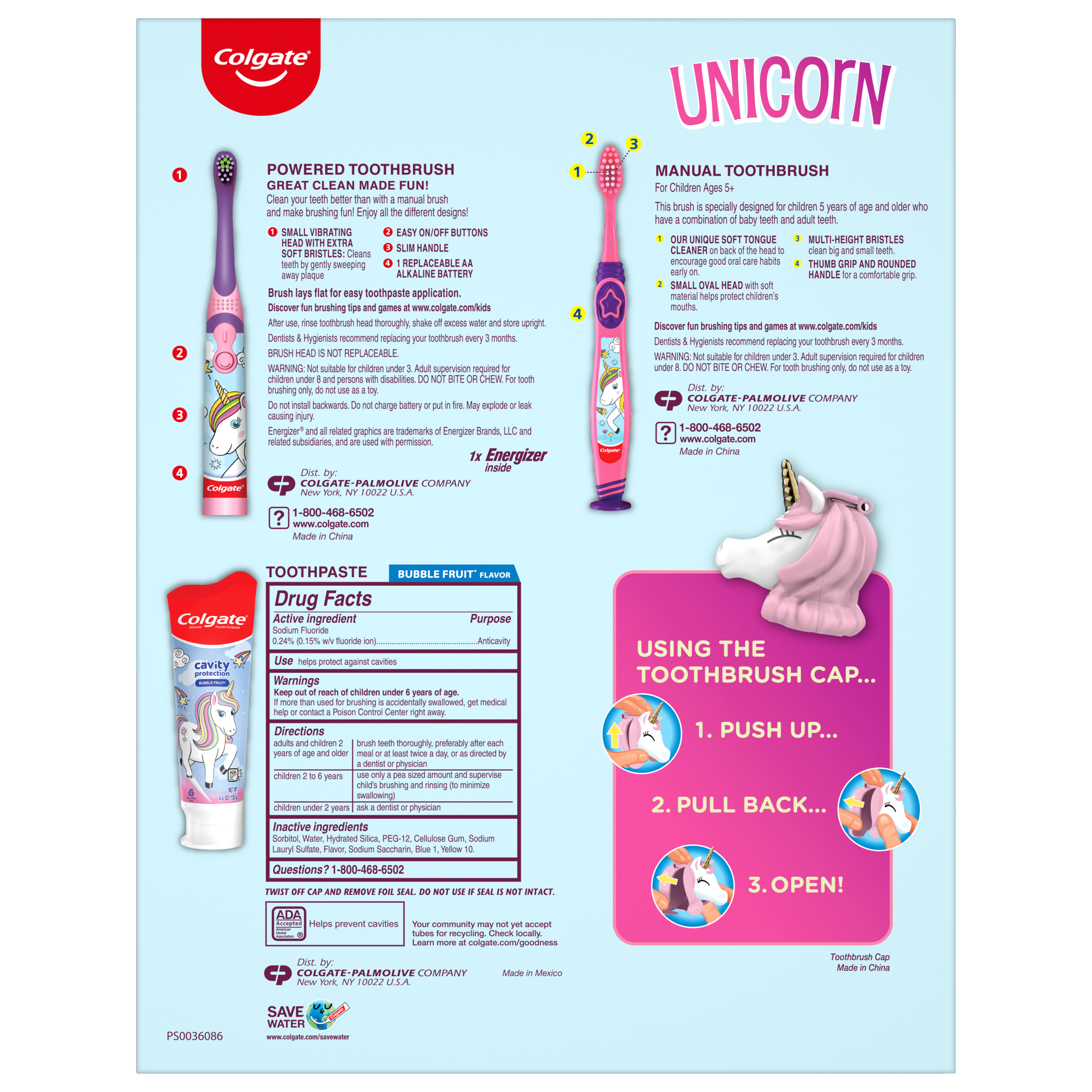 SKU 61024770 Consumer Unit - GTIN 00827854004356 Case - GTIN 10827854004353 Product Category Oral Care Product Sub Category Oral Care SUC Mixed Product Equity (Brand) Colgate Product Sub Brand Oral Care SBR Mixed Product Title Colgate Kids Toothbrush Set with Toothpaste, Unicorn Gift Set, 1 Manual Toothbrush, 1 Battery-Powered Toothbrush and 1 Toothpaste Product Description Colgate is making brushing brushtastic this holiday season. The Colgate Kids Toothbrush Set With Toothpaste encourages good brushing habits while pairing kids with some of their favorite characters. Each gift pack comes with a kids battery toothbrush, a kids manual toothbrush and a kids toothpaste with a fun toothbrush cap. Choose your favorite character and get brushing! Make teeth brushing fun for kids this holiday season. The Colgate kids toothbrush and toothpaste sets includes an ADA-accepted and clinically proven fluoride toothpaste to protect against cavities, reduce plaque buildup and fortify weak spots on enamel with regular brushing. Plus, its mild bubble fruit flavor tastes yummy while it works to freshen breath. Both Colgate Kids Toothbrushes have extra soft bristles that are gentle on delicate gums and growing teeth. The Colgate Kids Battery Toothbrush has a vibrating brush head to help kids brush better, while the manual toothbrush has a rounded handle and comfortable grip for when kids want to take the lead. Bright Smiles, Bright Futures®: At Colgate, we’re making kids toothbrushes more fun because we know the power of a healthy smile. Our children’s oral health initiative, Bright Smiles, Bright Futures®, has impacted the lives of more than a billion children by providing free oral health education and dental care in over 80 countries. As the world leader in oral care, Colgate is committed to improving children's oral health around the world. eCommerce Copy- Long Description Colgate Kids Toothbrush Set With Toothpaste, Unicorn Gift Set, 1 Manual Toothbrush, one Powered Toothbrush and one Toothpaste Colgate is making brushing brushtastic this holiday season. The Colgate Kids Toothbrush Set With Toothpaste encourages good brushing habits while pairing kids with some of their favorite characters. Each gift pack comes with a kids battery toothbrush, a kids manual toothbrush and a kids toothpaste with a fun toothbrush cap. Choose your favorite character and get brushing! Kids Brushing Made Fun This Holiday Season Make teeth brushing fun for kids this holiday season. The Colgate kids toothbrush and toothpaste sets includes an ADA-accepted and clinically proven fluoride toothpaste to protect against cavities, reduce plaque buildup and fortify weak spots on enamel with regular brushing. Plus, its mild bubble fruit flavor tastes yummy while it works to freshen breath. Both Colgate Kids Toothbrushes have extra soft bristles that are gentle on delicate gums and growing teeth. The Colgate Kids Battery Toothbrush has a vibrating brush head to help kids brush better, while the manual toothbrush has a rounded handle and comfortable grip for when kids want to take the lead. Healthy Smiles With Colgate Bright Smiles, Bright Futures®: At Colgate, we’re making kids toothbrushes more fun because we know the power of a healthy smile. Our children’s oral health initiative, Bright Smiles, Bright Futures®, has impacted the lives of more than a billion children by providing free oral health education and dental care in over 80 countries. As the world leader in oral care, Colgate is committed to improving children's oral health around the world. Bullet 1 Each gift pack comes with a kids battery toothbrush, a kids manual toothbrush and a kids toothpaste with a fun toothbrush cap Bullet 2 The included kids toothbrushes have extra soft bristles that sweep away plaque and clean cavity-causing bacteria from tooth surfaces Bullet 3 The Colgate Kids Battery Toothbrush has a vibrating brush head while the manual toothbrush has a rounded handle and comfortable grip for when kids want to take the lead Bullet 4 Kids battery toothbrush is battery operated to help kids brush better (1 AA battery included) Bullet 5 The kids cavity protection toothpaste with fluoride has a gentle formula that’s ADA-accepted and clinically proven to protect against cavities. Bullet 6 A mild bubble fruit flavor in the toothpaste tastes yummy while it works to freshen breath Bullet 7 Give the gift of Colgate Kids and encourage good brushing habits with this special Pokemon toothpaste and toothbrush set