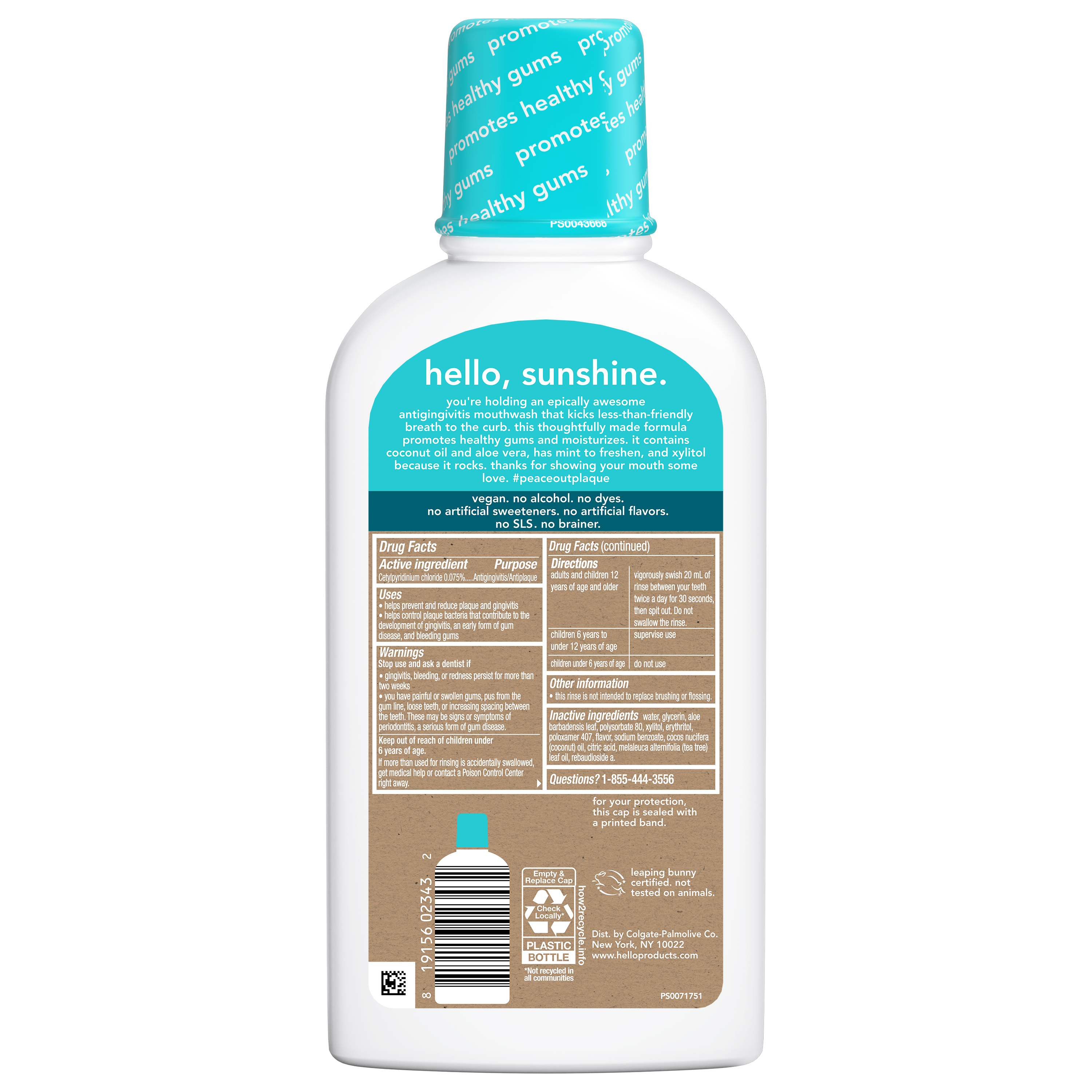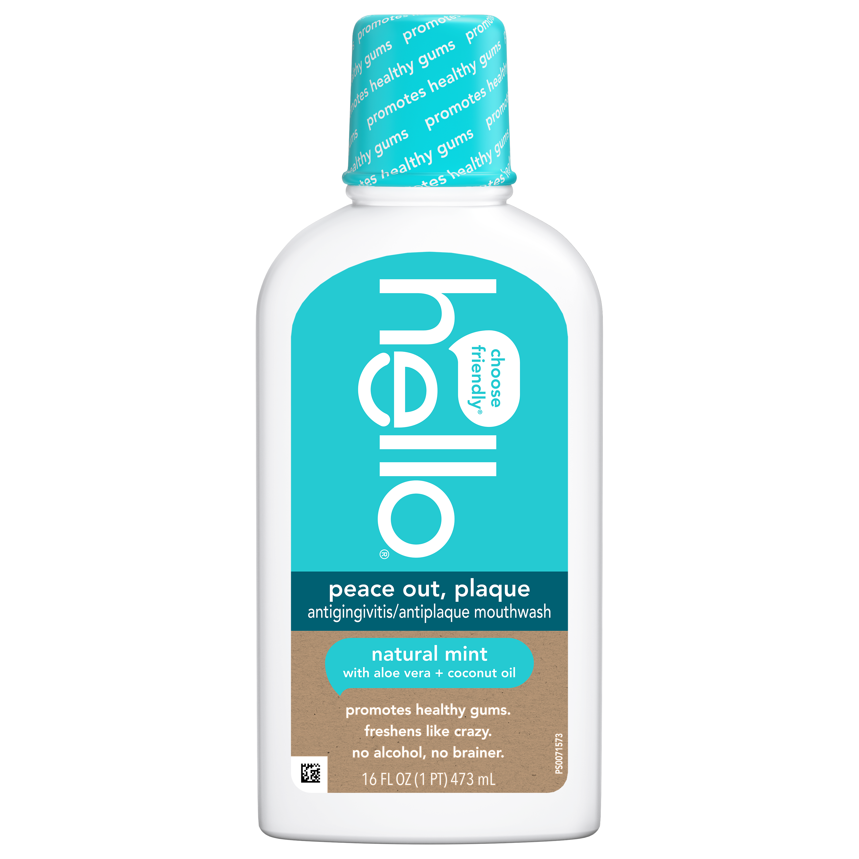 SKU 61027719 Consumer Unit - GTIN 00819156023432 Case - GTIN 20819156023436 Product Category Oral Care Product Sub Category Mouthwash Product Equity (Brand) hello Product Sub Brand Hello Adult MW Product Title hello Peace Out Plaque Fluoride Free and Alcohol Free Mouthwash, Natural Mint, 16 Fl Oz Bottle Product Description Say hello to hello Peace Out Plaque Alcohol Free Mouthwash* an unbelievably fresh and minty fluoride free mouthwash that freshens like crazy. This thoughtfully crafted non-alcoholic and fluoride free mouthwash kicks bad breath straight to the curb and uses a combination of natural mint and a touch of coconut oil and aloe vera. With every swish, this mint mouthwash obliterates bad breath and leaves your mouth feeling minty fresh all day long. hello Peace Out Plaque Fresh Breath Mouthwash is an antiplaque, antigingivitis mouthwash that promotes healthy gums by fighting plaque. It’s the no-brainer choice for anyone looking to choose friendly for their mouth. When it comes to freshening up and fighting back on plaque, choose hello Peace Out Plaque Mint Mouthwash. hello Peace Out Plaque Fluoride Free Mouthwash is vegan and made with no artificial flavors or artificial sweeteners, no dyes, no parabens, no gluten, no SLS, and no fluoride. Plus, this non-alcoholic fresh breath mouthwash is not tested on animals and helps promote healthy gums and moisturizes magnificently. Give plaque the boot, and promote healthy gums with a freshness that lasts using hello Peace Out Plaque Mint Fluoride Free Mouthwash. *this formula does not contain ethyl alcohol eCommerce Copy- Long Description you’re holding an epically awesome antigingivitis mouthwash that kicks less-than-friendly breath to the curb. this thoughtfully made formula promotes healthy gums and moisturizes. it contains coconut oil and aloe vera, has mint to freshen, and xylitol because it rocks. thanks for showing your mouth some love. #peaceoutplaque Bullet 1 What's Included: One (1) 16 fl oz bottle of hello Peace Out Plaque Fluoride Free and Alcohol Free Mouthwash*, Natural Mint oral rinse Bullet 2 Rinse Without the Wince: Experience incredible minty freshness without feeling the burn using this alcohol-free aloe vera mouthwash Bullet 3 Goodbye Plaque: This friendly fluoride free mouthwash works as an antigingivitis and antiplaque mouthwash and promotes healthy gums by fighting plaque Bullet 4 Promotes Healthy Gums: Nurture your gums while fighting off gingivitis and plaque using hello Peace Out Plaque Alcohol Free Mouthwash Bullet 5 Friendly Fluoride Free Formula: This vegan mint mouthwash is made with no artificial flavors, sweeteners, parabens, dyes, gluten, SLS, or fluoride Active Ingredients Cetylpyridinium Chloride 0.075% Walmart RPC 2739058291 Walmart URL (Computed) https://www.walmart.com/ip/a/2739058291 Target RPC 52508648 Target URL https://www.target.com/p/a/-/A-52508648 CVS RPC 108039