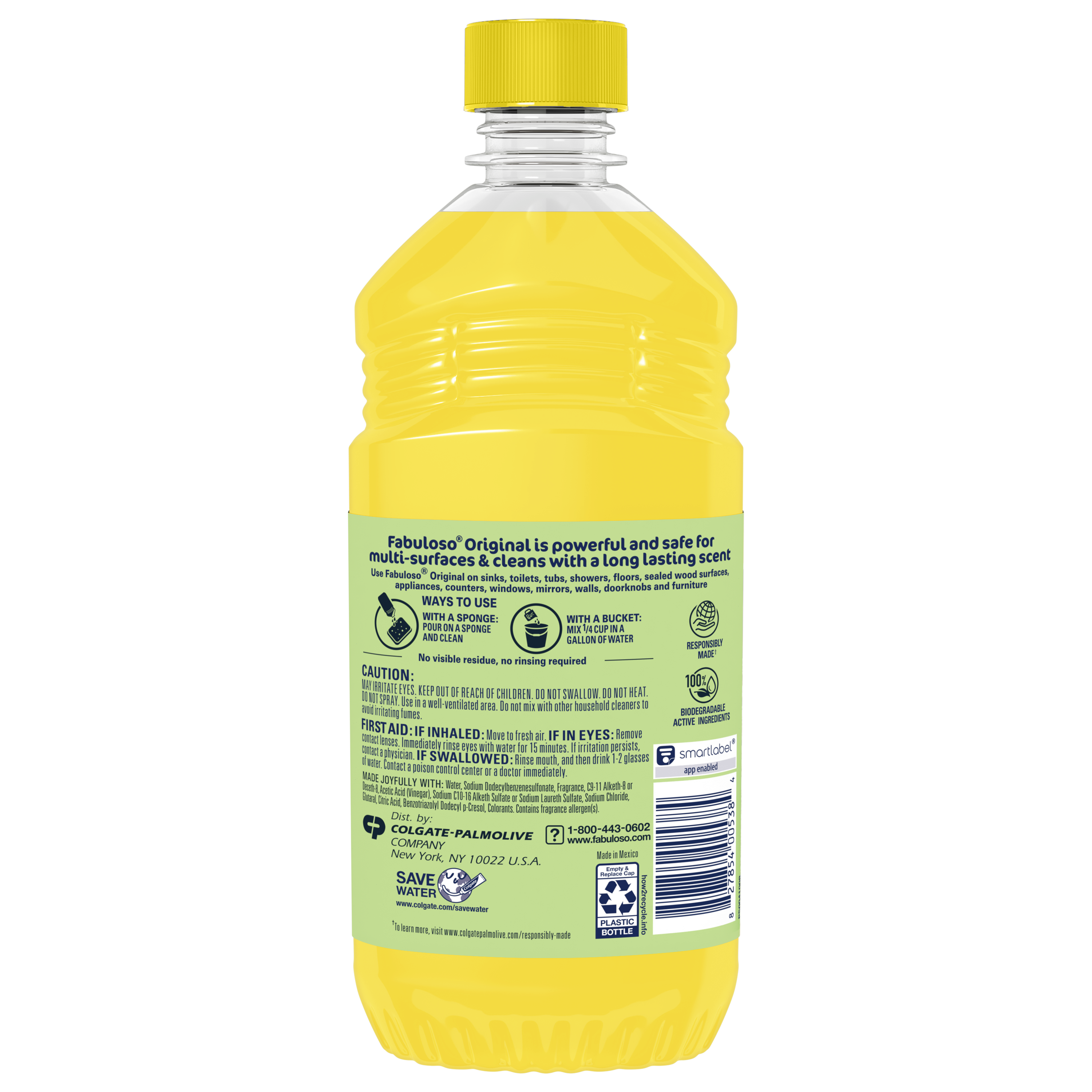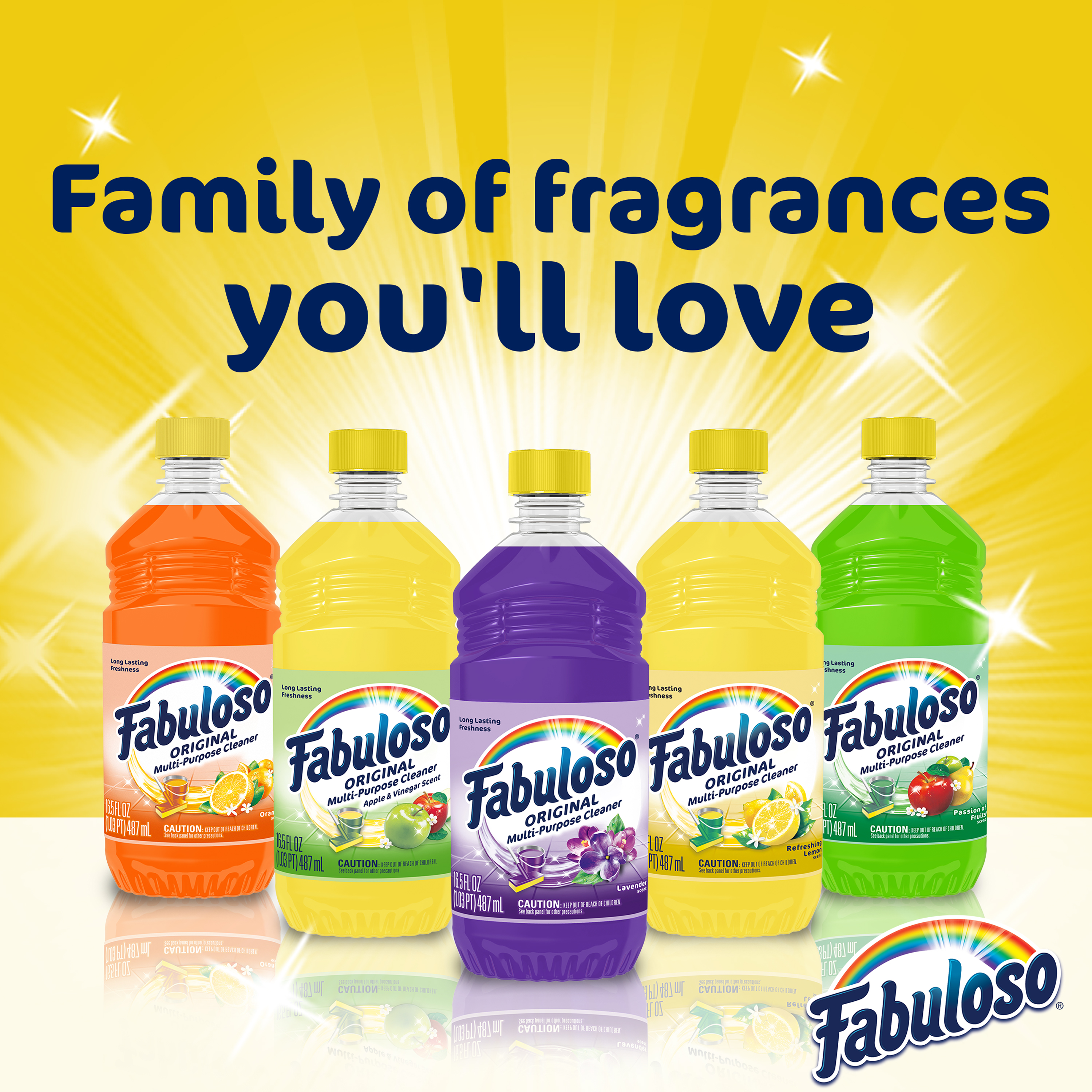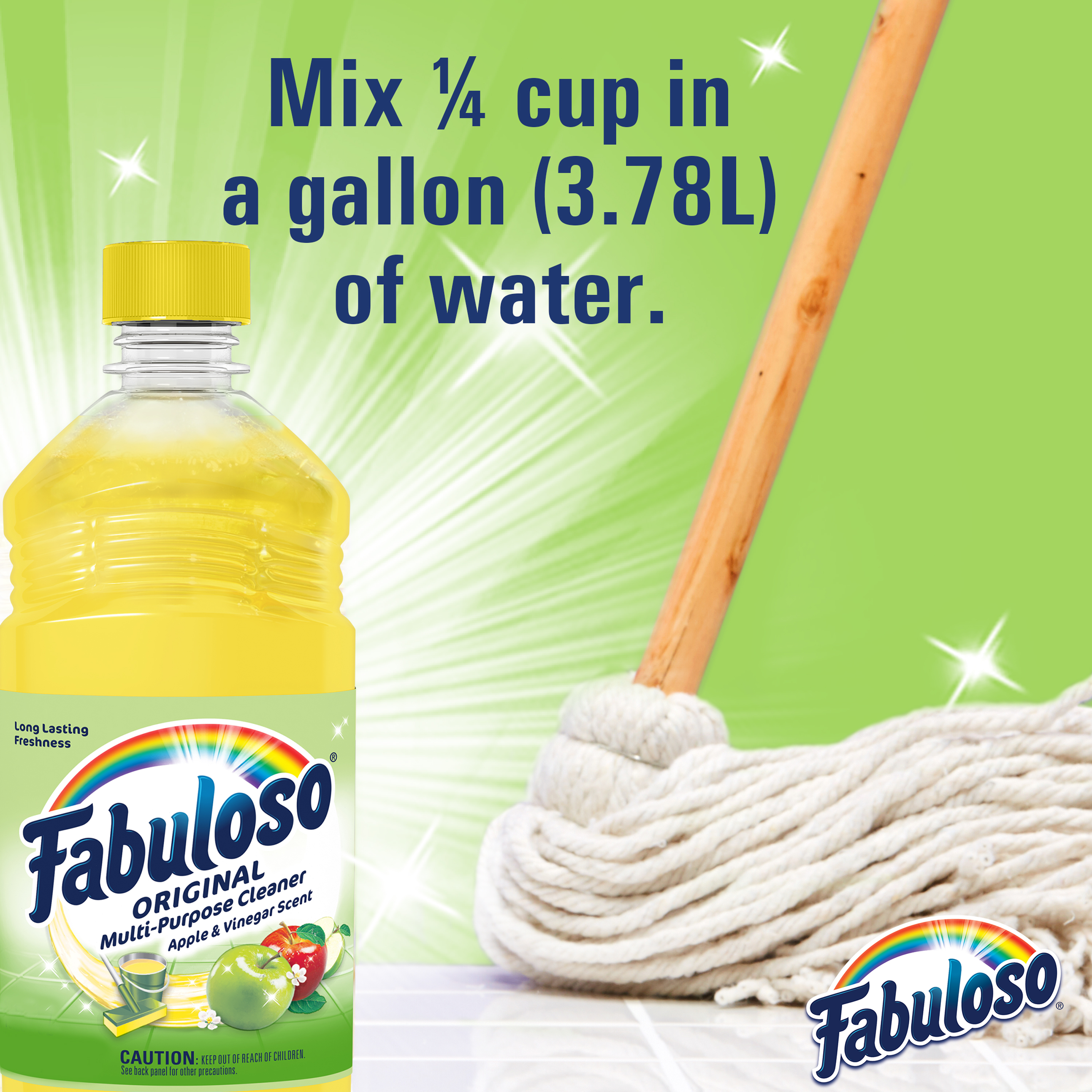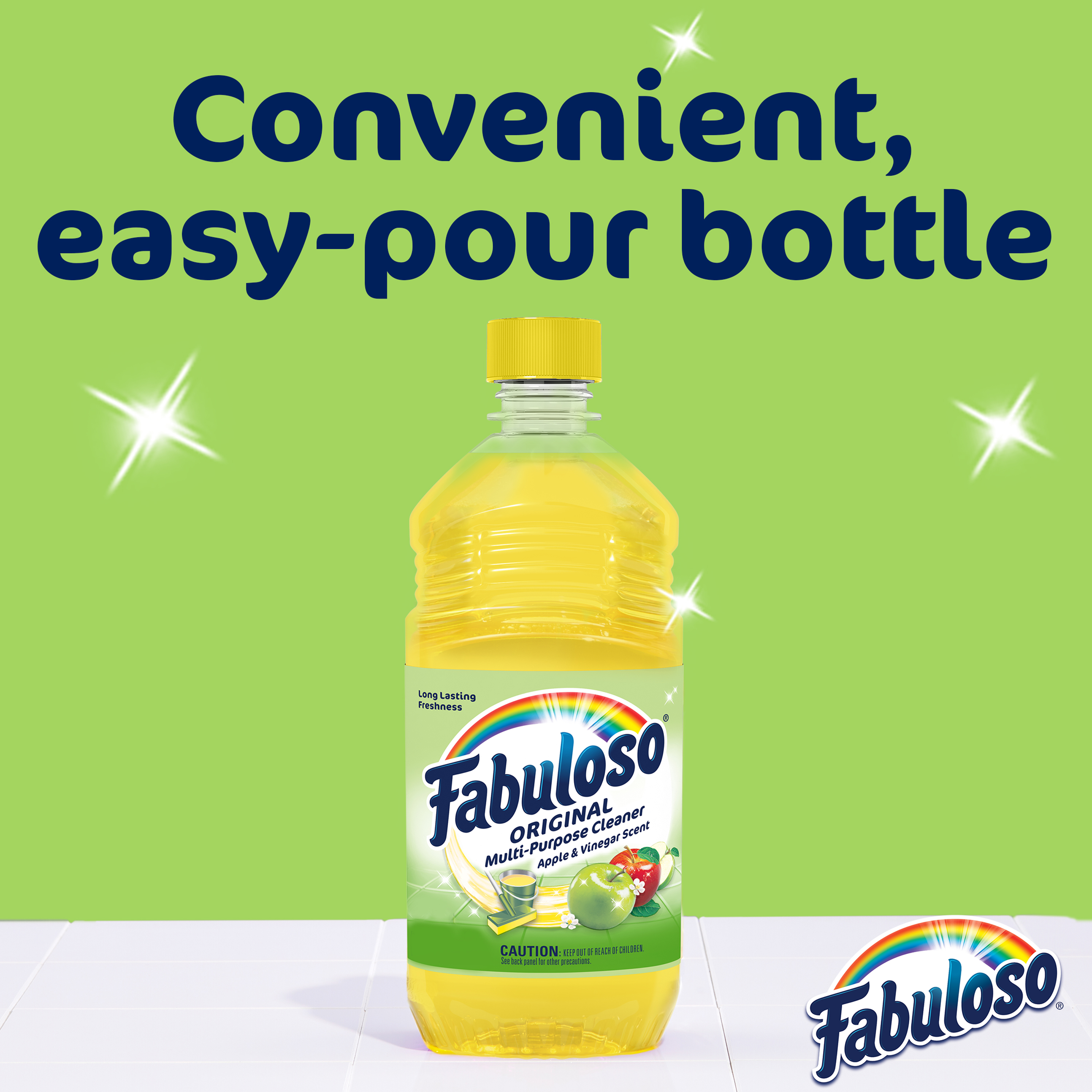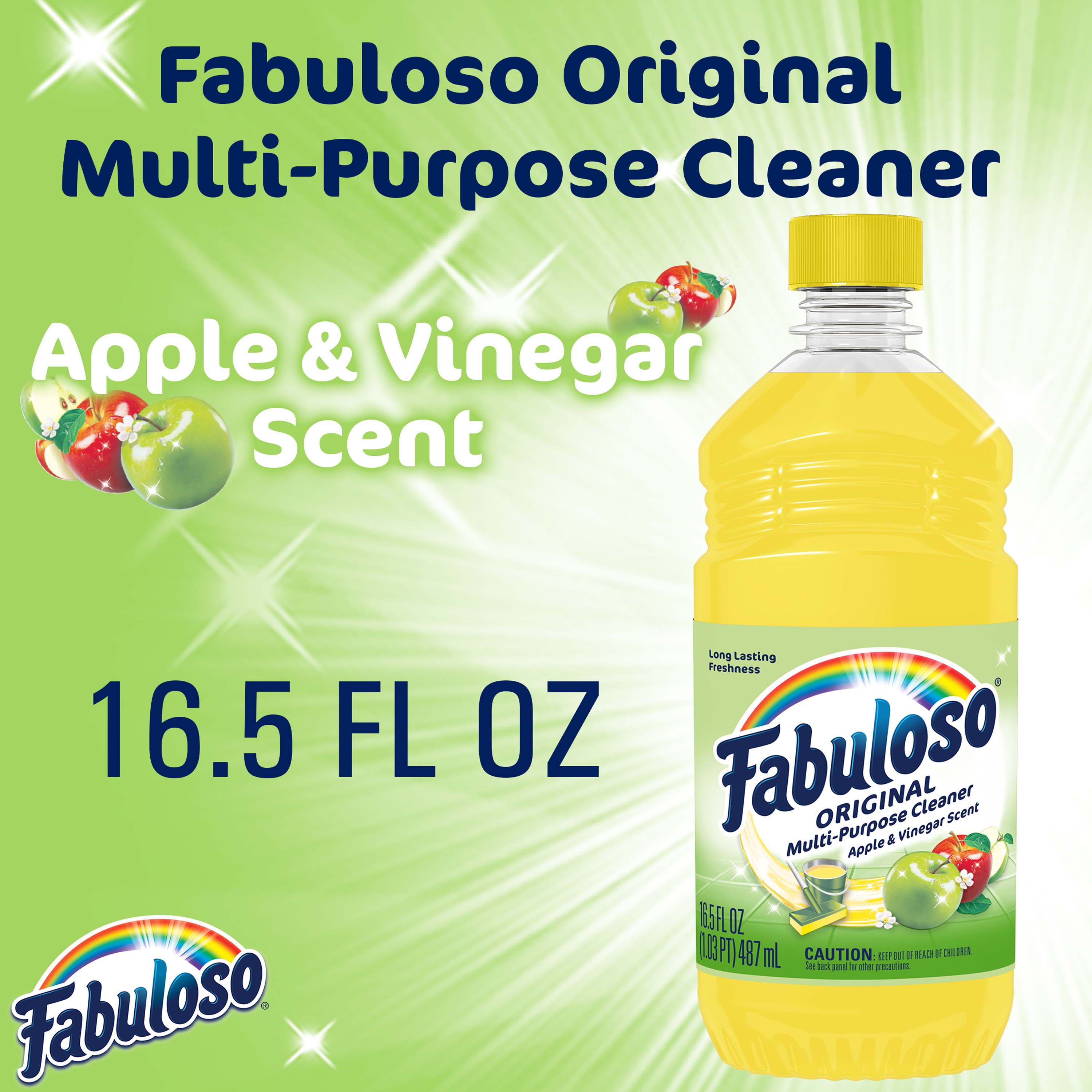 SKU 61028536 Consumer Unit - GTIN 00827854005384 Case - GTIN 10827854005381 Product Category Home Care Product Sub Category Cleaners Liquid / Gel Product Equity (Brand) Fabuloso Product Sub Brand Fabuloso Liq Cln Product Title Fabuloso®, Multi Purpose Cleaner, Apple with Vinegar Scent - 16.9oz Product Description Fabuloso® Multi-Purpose Cleaner - Apple with Vinegar Scent Fabuloso® Multi-Purpose Cleaner in Apple with Vinegar Scent transforms your home with a fresh scent that lasts. Bring the fragrance of Apple with Vinegar Scent indoors, and experience a warm, joyful feeling your friends and family will love. Every colorful pour from the easy-pour bottle delivers a long-lasting, unmistakable freshness and leaves your home bright and clean. Use Fabuloso® Multi-Purpose Cleaner on sinks, toilets, tubs, showers, kitchen and bathroom floors, sealed wood surfaces, appliances, counters, windows, mirrors, walls, doorknobs and furniture, and fill every room in your home with joy. Uplifting fragrances. Clean surfaces. Irresistible joy. Life isn’t always easy, but cleaning it up sure can be. Fabuloso® combines cleaning power with fresh scents that fill your home with joy, to make it a welcoming place no matter how hard your day. From the kitchen to the bathroom and beyond, Fabuloso® Multi-Purpose has a wide variety of long-lasting fragrances that deliver hope for a better tomorrow. Try all of our uplifting scents: Lavender, Refreshing Lemon, Citrus & Fruits with Baking Soda, Bleach Alternative Spring Fresh, Tropical Spring, Ocean Paradise, Orange with Baking Soda, and Passion of Fruits. Shared Moments of Joy All Over the World Our story begins in Venezuela, circa 1980. Cleaning products lacked fragrance and distinction. But families wanted lasting scents that kept their homes fresh and clean for hours. Enter the bold colors and joyful fragrances of Fabuloso®! 16 years later, families across America also got to experience the joy: we became a household staple thanks to our rainbow of colors and playful, distinctive scents. Today, across the world, we’re more than cleaning products. We’re a catalyst for joy. Bullet 1 Fabuloso® is powerful and safe for multi-surfaces. Bullet 2 Meant for use on sinks, toilets, tubs, showers, kitchen and bathroom floors, sealed wood surfaces, appliances, counters, windows, mirrors, walls, doorknobs, and furniture. Bullet 3 There is no rinsing required when using Fabuloso®. Bullet 4 The Active Ingredients in Fabuloso® are 100% Biodegradable. Bullet 5 Fabuloso® is Responsibly Made** (**to learn more visit www.colgatepalmolive.com/responsibly-made.) Bullet 6 Available in: Lavender Scent, Refreshing Lemon Scent, Passion of Fruits Scent, Citrus & Fruits with Baking Soda Scent, Ocean Paradise Scent, Spring Fresh Scent, Tropical Spring Scent, Apple & Vinegar Scent, and Orange Scent with Baking Soda Scent. Bullet 7 Fabuloso® comes in a variety of convenient sizes: 16.9oz, 16.9oz+30%, 22oz, 28oz, 33.8oz, 56oz, 128oz, 169oz, 210oz. Bullet 8 Can be used with a sponge: pour on a sponge and clean. Bullet 9 Clean with a bucket mix ¼ cup in a gallon of water. Dollar Tree RPC 326250