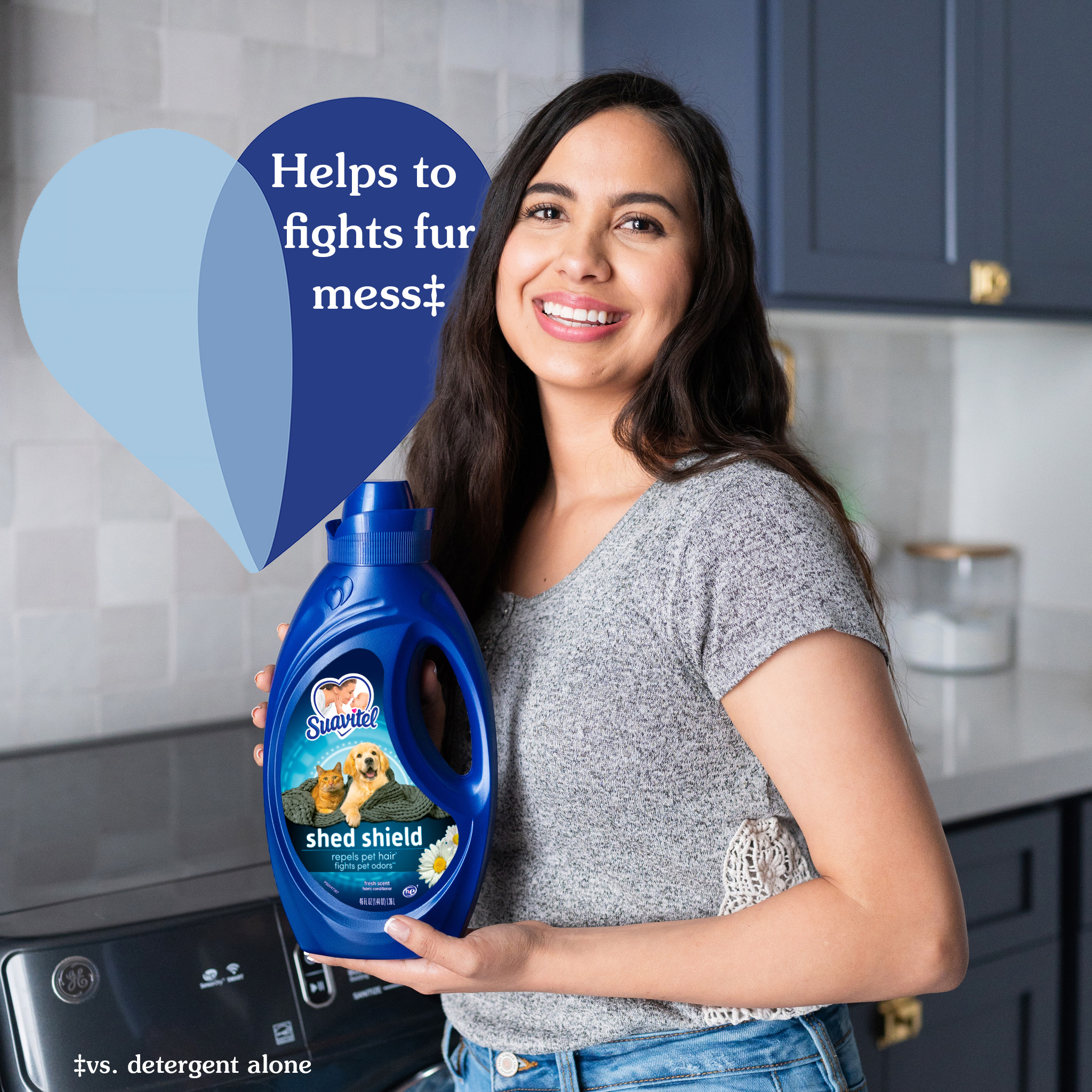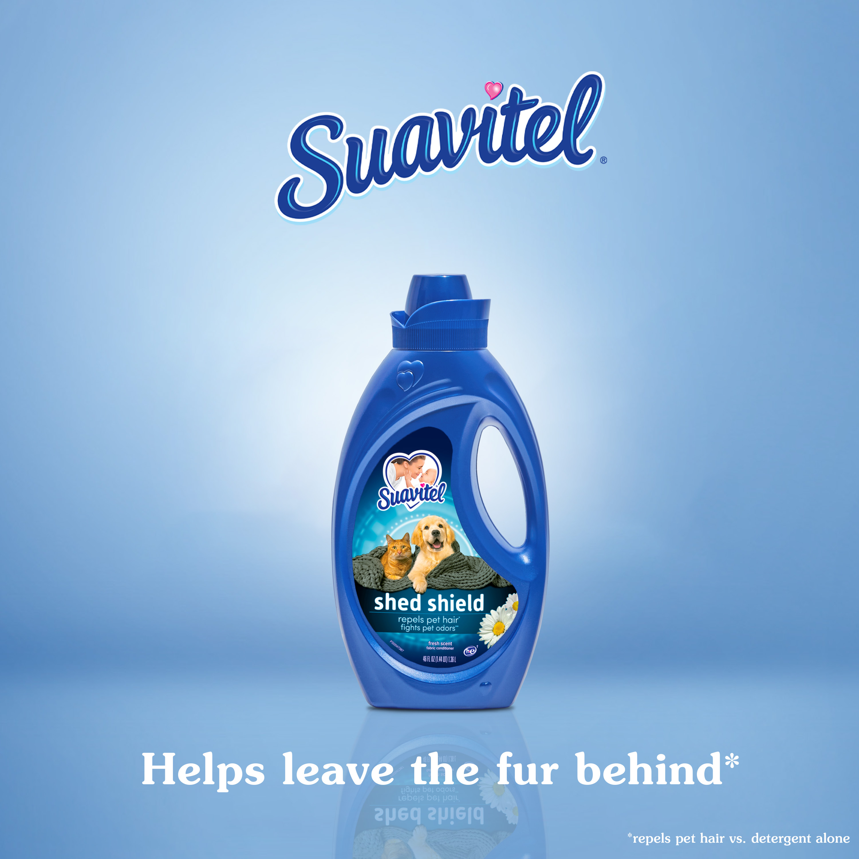 SKU 61028538 Consumer Unit - GTIN 00827854005407 Case - GTIN 10827854005404 Product Category Home Care Product Sub Category FC Liquids Product Equity (Brand) Suavitel Product Sub Brand Suavitel Liq FC Product Title Suavitel Shed Shield Fabric Conditioner, Fresh Scent, 46 oz Product Description Introducing Suavitel Shed Shield, the ideal solution designed specifically for pet parents who want to win the fight against pet hair and odors. Suavitel Shed Shield helps you leave the fur behind by repelling pet hair compared with using detergent alone. Make Suavitel Shed Shield your go-to fabric conditioner to win the fight against pet fur mess. Suavitel Shed Shield effectively repels pet hair versus using detergent alone (1). You can now worry less about fur sticking to your clothes and enjoy the fresh scent with every wash. Our formula fights pet odor vs detergent alone (2). Having been tested on cotton and cotton-polyester fabrics, this fabric conditioner helps your laundry stay fresh. We understand the unique challenges that pet parents face, that's why Suavitel Shed Shield is specifically designed for you. Suavitel addresses your needs and helps your fabrics fight pet fur compared with only using detergent. Shed Shield not only repels pet hair (1) and fights odors (2), but it also leaves your fabrics soft and comfortable to touch. The Fresh Scent provides a harmonious combination of soft floral top notes and juicy fruity mid notes. Suavitel Shed Shield is compatible with all washing machines, including HE compatible (3), making it convenient for every pet parent. You can trust Shed Shield to provide outstanding results without any hassle. Suavitel Shed Shield allows you to focus on the love and companionship of your furry friends, without worrying about the mess they leave behind. Help your clothes stay fresh while repelling pet hair (1) and fighting pet odor (2) with Suavitel Shed Shield. (1 ) vs. detergent alone (2) vs. detergent alone, against wet dog and cat urine odors, tested on cotton and cotton-polyester fabrics (3) Follow the washer manufacturer's use and care guide for proper dispensing of the fabric conditioner eCommerce Copy- Long Description Introducing Suavitel Shed Shield, the ideal solution designed specifically for pet parents who want to win the fight against pet hair and odors. Suavitel Shed Shield helps you leave the fur behind by repelling pet hair compared with using detergent alone. Make Suavitel Shed Shield your go-to fabric conditioner to win the fight against pet fur. Suavitel Shed Shield effectively repels pet hair versus using detergent alone (1). Worry less about fur sticking to your clothes. Our formula fights pet odor (2).Tested on cotton and cotton-polyester fabrics, this fabric conditioner helps your laundry stay fresh. We understand the unique challenges that pet parents face. That's why Suavitel Shed Shield is specifically designed for you. Suavitel addresses your needs and helps your fabrics fight pet fur compared with detergent alone. Experience the irresistible softness that Suavitel is known for. Shed Shield not only repels pet hair (1) and fights odors (2), but it also leaves your fabrics soft and comfortable to touch. Enjoy the ultimate laundry experience with every wash. A harmonious combination of soft floral top notes and juicy fruity mid notes. The creamy base notes of amber, woods and musk add long-lasting freshness. Suavitel Shed Shield is compatible with all washing machines, including HE compatible (3), making it convenient for every pet parent. You can trust Shed Shield to provide outstanding results without any hassle. Suavitel Shed Shield allows you to focus on the love and companionship of your furry friends, without worrying about the mess they leave behind. Help your clothes stay fresh while repelling pet hair (1) and fighting pet odor (2) with Suavitel Shed Shield. (1 ) vs. detergent alone (2) vs. detergent alone, against wet dog and cat urine odors, tested on cotton and cotton-polyester fabrics (3) Follow the washer manufacturer's use and care guide for proper dispensing of the fabric conditioner Bullet 1 One 46 oz bottle of Suavitel Shed Shield Fabric Conditioner, Fresh Scent Bullet 2 Fight unpleasant pet odors (2) with Suavitel Shed Shield, tested against wet dog and cat urine odors on cotton and cotton-polyester fabrics Bullet 3 Designed specifically for pet parents, Suavitel Shed Shield addresses their unique needs and helps avoid pet fur on fabrics Bullet 4 Experience the irresistible softness that Suavitel is known for, in addition to its hair-repelling (1) and odor-fighting (2) capabilities Bullet 5 Suavitel Shed Shield is compatible with all washing machines, including HE compatible (3), ensuring convenience for every pet parent Bullet 6 Focus on the love and companionship of your furry friends, while Suavitel Shed Shield takes care of helping your clothes fight pet fur Bullet 7 Stand out from other fabric conditioners with Suavitel Shed Shield to repel pet hair (1) and fight pet odors (2) Amazon RPC B0CBL9B839 AMZ URL https://www.amazon.com/dp/B0CBL9B839 Walmart RPC 3049468264 Walmart URL (Computed) https://www.walmart.com/ip/a/3049468264 Albertsons RPC 31200593 Albertsons URL https://www.albertsons.com/shop/product-details.31200593.html Dollar Tree RPC 38126401