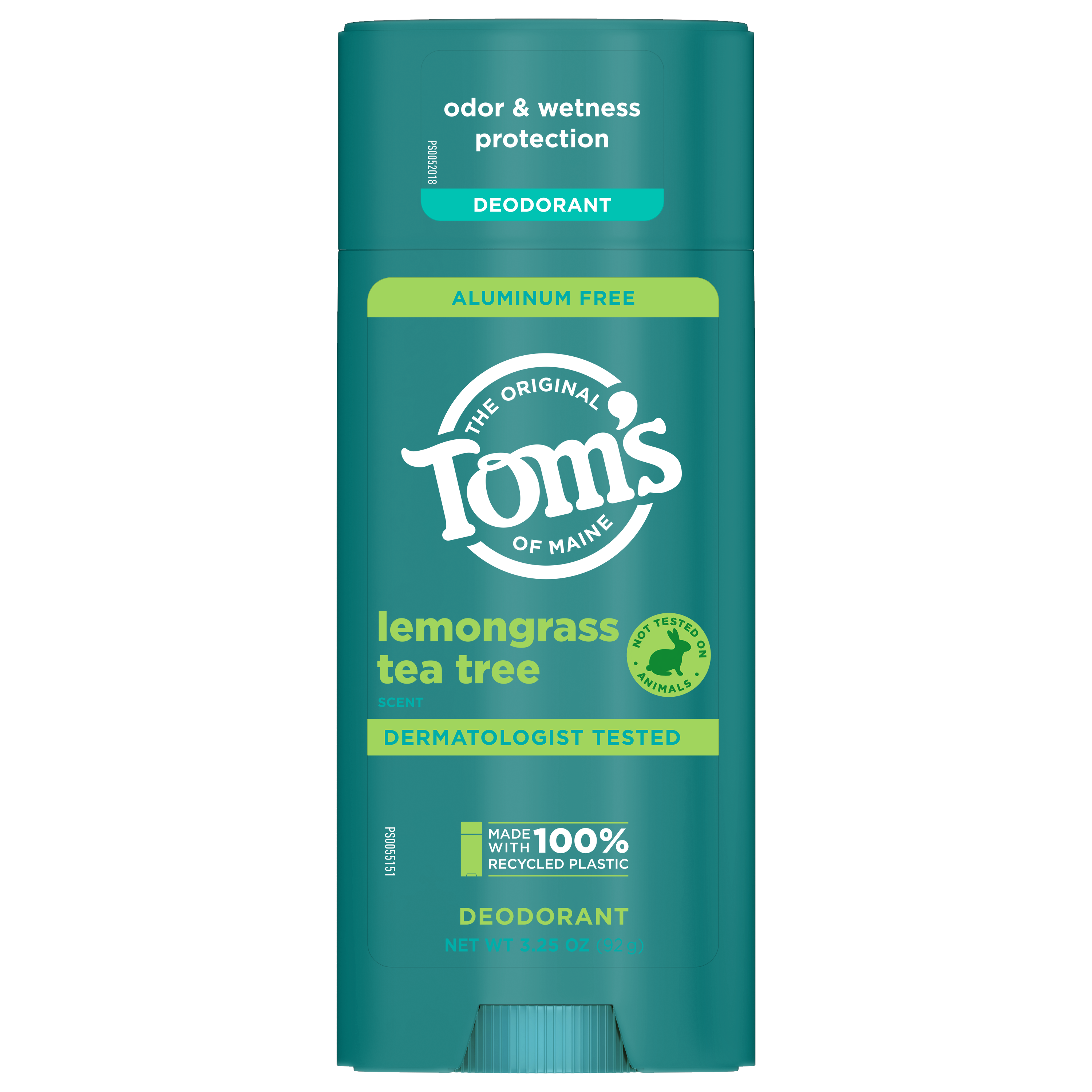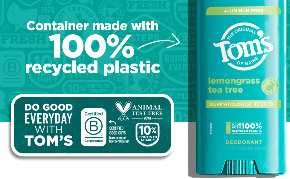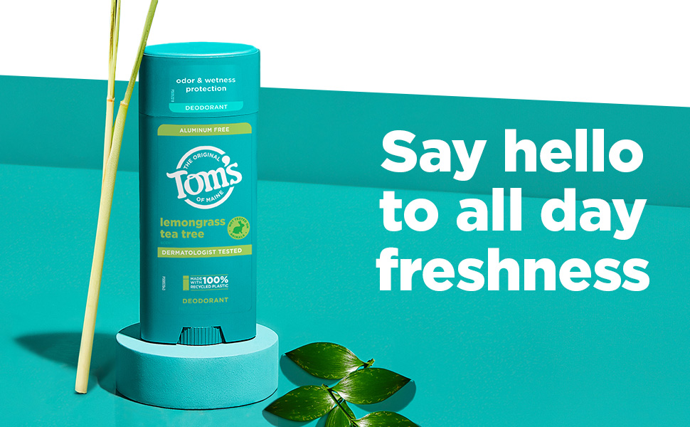 SKU 61028972 Consumer Unit - GTIN 00827854005933 Case - GTIN 10827854005930 Product Category Personal Care Product Sub Category AP > Deo Product Equity (Brand) Tom's of Maine Product Sub Brand Tom's AP/Deo Product Title Tom’s of Maine Lemongrass Tea Tree Natural Deodorant, Aluminum Free, Clear Application, Odor & Wetness Protection, Naturally Derived Ingredients, 3.25 oz Product Description Embrace the refreshing, aromatic scent of Lemongrass Tea Tree with Tom’s of Maine Natural Deodorant. Our stick deodorant is a breakthrough in odor and wetness protection, powered by naturally derived, moisture-locking ingredients that keep you feeling confident all day long. Designed for a smooth glide, our deodorant goes on clear and stays clear, ensuring a seamless application every time. Made with natural fragrance, it delivers a Lemongrass Tea Tree scent with bright citrus lemon notes and earthy, woody undertones, creating an uplifting and refreshing experience. Our formula is aluminum free, dermatologist tested, and free from artificial fragrances, dyes, preservatives, and baking soda. Plus, it’s cruelty-free, never tested on animals. We’re committed to sustainability, which is why our containers are made with 100% recycled plastic. As a member of The Recycling Partnership (TRP) polypropylene (PP) coalition, Tom's of Maine actively supports additional PP recycling initiatives across the United States. Transitioning to a natural deodorant? Give your body time to adjust—aluminum from antiperspirants can linger in your pores for about two weeks. After that, you’ll experience the full benefits of our natural, effective formula. Tom's of Maine: A natural approach to personal care that doesn't compromise on performance. Choose your favorite scent and enjoy all-day freshness. eCommerce Copy- Long Description Tom’s of Maine natural deodorant is designed with inclusivity in mind, offering options for men, women, and really, it's for everyone, because feeling fresh and confident knows no gender boundaries. Our underarm deodorant stick provides effective odor and wetness protection, keeping you comfortable throughout the day. This natural deodorant features the captivating fragrance of Lemongrass Tea Tree, providing a delightful scent for all. With the power of naturally sourced and derived, moisture-locking ingredients, we keep you feeling refreshed. Rest easy knowing that Tom’s of Maine’s next generation deodorant is dermatologist tested, made with aloe vera, and free from artificial fragrances, dyes, preservatives and baking soda. Plus, we’re doing our part with our new container made with 100% recycled plastic in a new bigger size v. our prior deodorants. A natural approach to personal care without compromising on performance? Yes, please! At Tom’s of Maine, we’re a certified B Corporation committed to creating vegan deodorants with natural fragrances and naturally sourced and derived ingredients that are safe and effective, while giving back 10% of annual profits to charity. Smell good, feel good. Bullet 1 WHAT'S INCLUDED: One (1) 3.25 oz Tom's of Maine Lemongrass Tea Tree natural underarm deodorant for women and men Bullet 2 ODOR AND WETNESS PROTECTION: Our breakthrough aluminum-free underarm deodorant offers odor and wetness protection, with naturally sourced and derived ingredients. With over 10 scents, it's truly for everyone Bullet 3 GOES ON CLEAR, STAYS CLEAR: Enjoy a deodorant that goes on clear and stays clear, keeping you feeling confident throughout your day Bullet 4 DESIGNED FOR SMOOTH GLIDE: Experience a smooth, easy application with our deodorant, formulated to glide effortlessly across your skin Bullet 5 NATURAL FRAGRANCE: Infused with the bright and refreshing scent of Lemongrass Tea Tree, our deodorant features natural fragrance with citrus lemon notes and earthy, woody undertones, keeping you feeling revitalized and refreshed Bullet 6 DERMATOLOGIST TESTED: Our deodorant is dermatologist tested and free from artificial fragrances, dyes, preservatives, and baking soda Bullet 7 CONTAINER MADE WITH 100% RECYCLED PLASTIC: As a member of The Recycling Partnership (TRP) polypropylene (PP) coalition, Tom's of Maine supports increased PP recycling across the United States Amazon RPC B0CB1RTN6M AMZ URL https://www.amazon.com/dp/B0CB1RTN6M