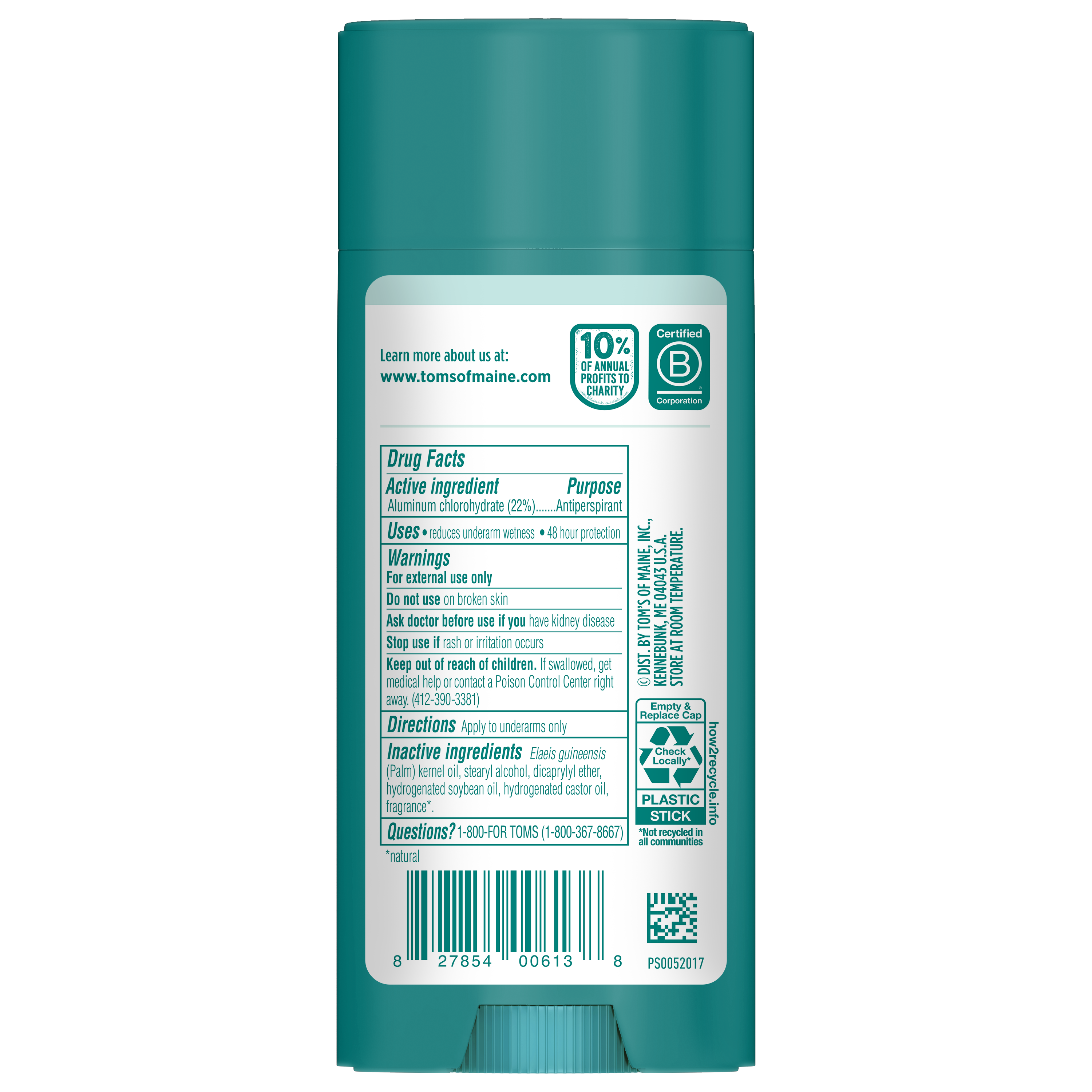 SKU 61028976 Consumer Unit - GTIN 00827854006138 Case - GTIN 10827854006135 Product Category Personal Care Product Sub Category AP > Deo Product Equity (Brand) Tom's of Maine Product Sub Brand Tom's Antiperspirant AP/Deo Product Title Tom’s of Maine Cucumber Aloe Antiperspirant, For Women and Men, 3.25 oz Product Description Tom’s of Maine antiperspirant is designed with inclusivity in mind, offering options for men, women, and really, it's for everyone, because feeling fresh and confident knows no gender boundaries. Get protection you can count on with Tom’s of Maine Cucumber Aloe antiperspirant, which offers 48 hour sweat and odor protection to keep you feeling fresh and confident. Our antiperspirant for men and women ensures all-day freshness, especially for those who aren't afraid to break a sweat! Whenever you need extra effective protection, you can rest easy knowing that our antiperspirant will do the job while being dermatologist tested and free from artificial fragrances, parabens and baking soda. What’s more, we’re not tested on animals and we’re proud to offer our product in a new, bigger size v our prior antiperspirants. The container is also made with 100% recycled plastic. At Tom’s of Maine, we’re a certified B Corporation committed to creating effective products, while giving back 10% of annual profits to charity. Smell good, feel good. eCommerce Copy- Long Description Tom’s of Maine antiperspirant is designed with inclusivity in mind, offering options for men, women, and really, it's for everyone, because feeling fresh and confident knows no gender boundaries. Get protection you can count on with Tom’s of Maine Cucumber Aloe antiperspirant, which offers 48 hour sweat and odor protection to keep you feeling fresh and confident. Our antiperspirant for men and women ensures all-day freshness, especially for those who aren't afraid to break a sweat! Whenever you need extra effective protection, you can rest easy knowing that our antiperspirant will do the job while being dermatologist tested and free from artificial fragrances, parabens and baking soda. What’s more, we’re not tested on animals and we’re proud to offer our product in a new, bigger container v. our prior antiperspirants and is made with 100% recycled plastic. At Tom’s of Maine, we’re a certified B Corporation committed to creating effective products, while giving back 10% of annual profits to charity. Smell good, feel good. Bullet 1 One 3.25 oz Tom’s of Maine Cucumber Aloe Antiperspirant, with Recycled Aluminum for men and women, it's for everyone Bullet 2 Underarm antiperspirant for everyone offers extra effective 48 hour sweat and odor protection keeping you feeling fresh and confident all day long Bullet 3 Cucumber aloe scent gives you all-day freshness Bullet 4 Dermatologist tested and has no artificial fragrances, parabens or baking soda Bullet 5 This antiperspirant is not tested on animals Amazon RPC B0CL7YS8PH AMZ URL https://www.amazon.com/dp/B0CL7YS8PH