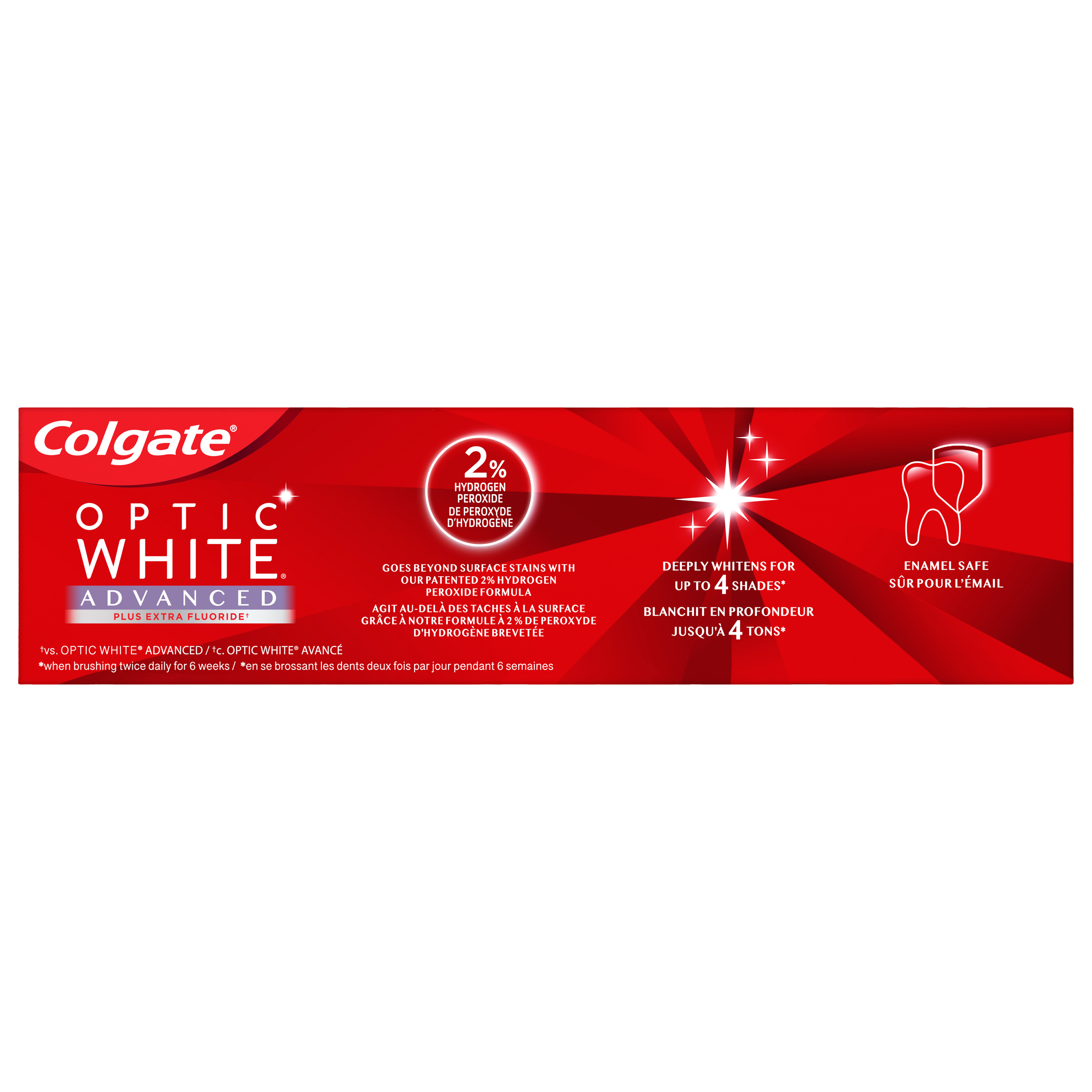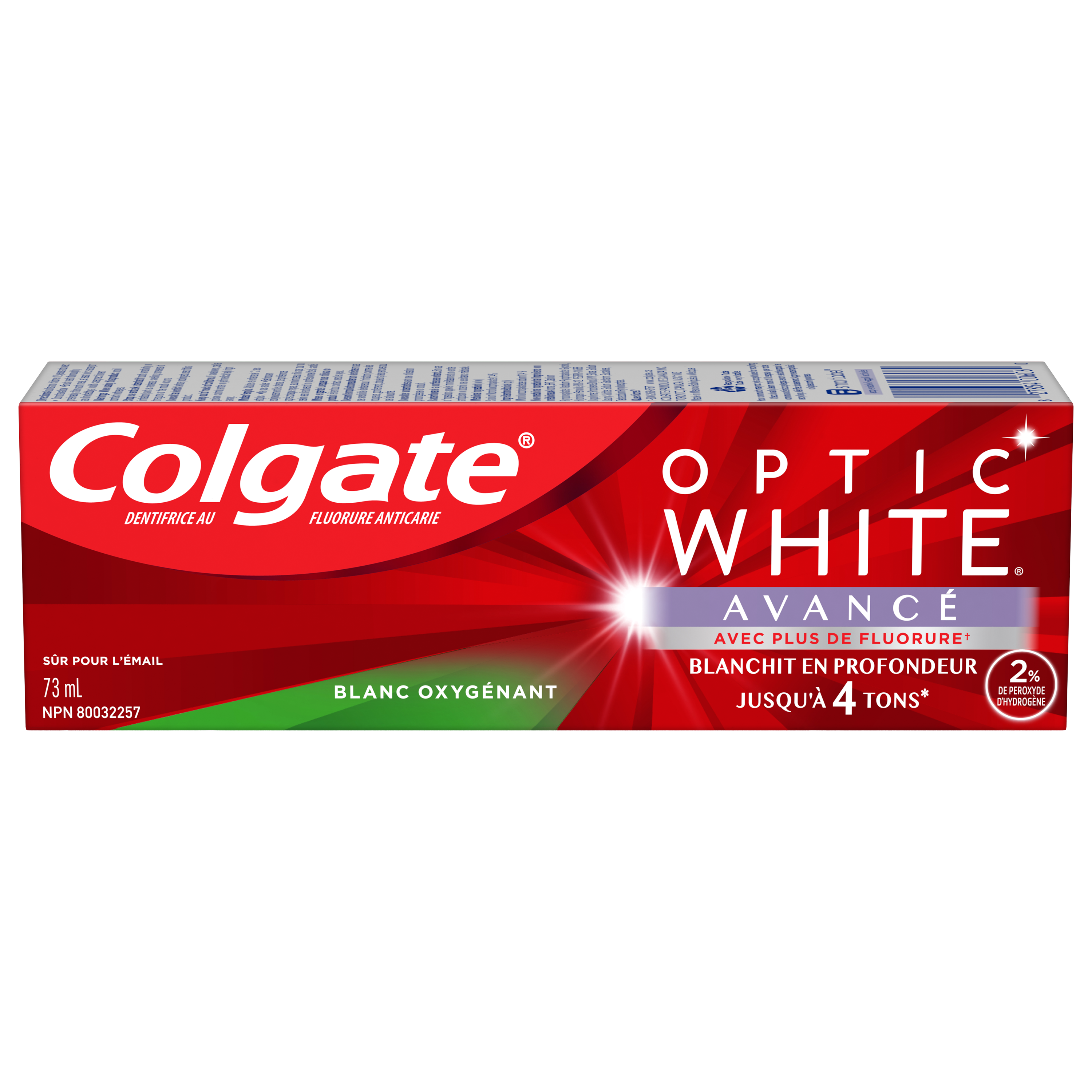 SKU 61029103 Consumer Unit - GTIN 00827854006060 Case - GTIN 10827854006067 Product Category Oral Care Product Sub Category Toothpaste Product Equity (Brand) Colgate Product Sub Brand Colgate Optic White TP Product Title Colgate Optic White Advanced Hydrogen Peroxide Toothpaste, Oxygenating White, 73 mL Product Description Remove 5 years of stains* using the Colgate Optic White Advanced Hydrogen Peroxide Teeth Whitening Toothpaste. Use this hydrogen peroxide toothpaste with a 2% hydrogen peroxide-based formula to whiten beyond surface stains. Made with a refreshing Oxygenating White flavor, Colgate Optic White Advanced Whitening Toothpaste effectively removes tea, coffee, and wine stains** so you can achieve a bright smile. Colgate Optic White Advanced Hydrogen Peroxide Toothpaste is a patented whitening toothpaste with 2% hydrogen peroxide that removes surface stains and is enamel-safe. This teeth whitening toothpaste for adults is also an anticavity fluoride toothpaste to help prevent cavities. For whitening that works, choose the Colgate Optic White Advanced Hydrogen Peroxide Toothpaste. Go beyond surface stains with this Colgate Optic White Advanced Toothpaste. Colgate Optic White Hydrogen Peroxide Toothpaste is a gluten free mint toothpaste with a patented 2% hydrogen peroxide formula that is enamel-safe. Unlock a radiant smile with the Colgate Optic White Advanced Oxygenating White Hydrogen Peroxide Toothpaste. *when brushing twice daily for 2 weeks **as shown in a laboratory study Bullet 1 Includes one (1) 73 mL tube of Colgate Optic White Advanced Oxygenating White Hydrogen Peroxide Toothpaste, Teeth Whitening Toothpaste Bullet 2 Remove 5 years of stains* with the Colgate Optic White Advanced Teeth Whitening Toothpaste (*when brushing twice daily for 2 weeks) Bullet 3 This 2% hydrogen peroxide toothpaste uses a patented whitening formula and comes in an Oxygenating White mint toothpaste flavor Bullet 4 Enamel-safe and effectively removes tea, coffee and wine stains** with the 2% hydrogen peroxide formula (**as shown in a laboratory study) Bullet 5 Colgate Optic White Advanced Hydrogen Peroxide Toothpaste is an anticavity toothpaste made with fluoride to help fight cavities Bullet 6 This whitening stain removal toothpaste is gluten free and enamel-safe for daily use Bullet 8 For whitening that works, choose the Colgate Optic White Advanced Icy Fresh Hydrogen Peroxide Toothpaste