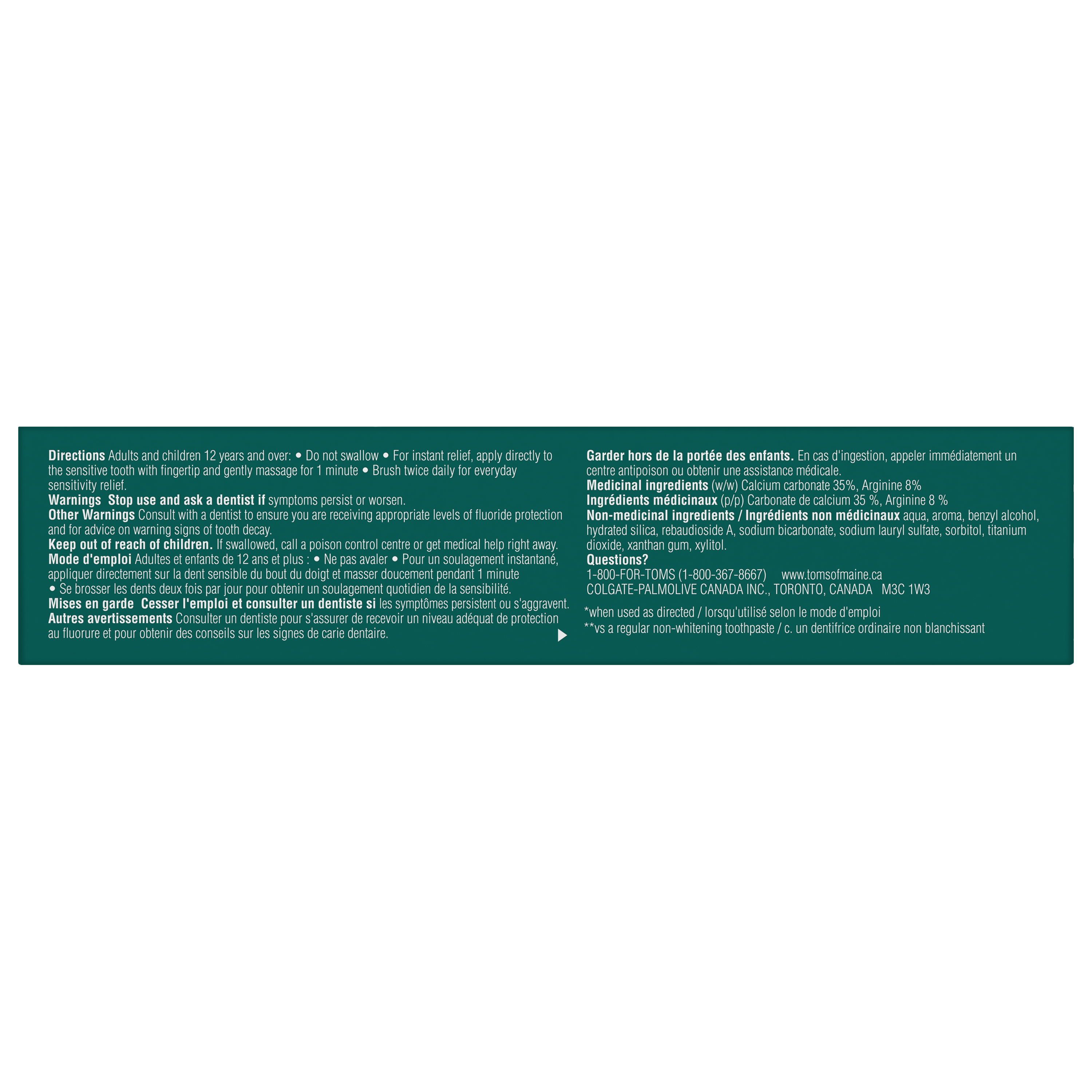 SKU 61029191 Consumer Unit - GTIN 00827854006596 Case - GTIN 10827854006593 Product Category Oral Care Product Sub Category Toothpaste Product Equity (Brand) Tom's Product Sub Brand Tom's PureActiv Solutions TP Product Title Tom's of Maine Sensitive and Whitening Toothpaste, Fluoride Free, Calming Mint, 76 mL Product Description For a sensitive toothpaste that helps whiten teeth*, choose the Tom’s of Maine Sensitive and Whitening Toothpaste. This natural fluoride free toothpaste offers clinically shown instant sensitivity relief when used as directed. Tom’s of Maine Whitening and Sensitive Toothpaste uses a whitening toothpaste formula that is safe on enamel. Tom’s of Maine Sensitive and Whitening Toothpaste helps whiten sensitive teeth by removing surface stains. This sensitive toothpaste also offers Advanced Whitening Action** to help whiten teeth. Tom's of Maine uses naturally derived and naturally sourced ingredients to create oral care products that work. The fluoride free toothpaste comes in a refreshing Calming Mint flavour so you can enjoy minty freshness every time you brush. Plus, it’s gluten free and free from artificial flavours, sweeteners, and dyes, and has not been tested on animals. Now that’s something you can feel good about. *vs a regular non-whitening toothpaste **by removing surface stains eCommerce Copy- Long Description For a sensitive toothpaste that helps whiten teeth*, choose the Tom’s of Maine Sensitive and Whitening Toothpaste. This natural fluoride free toothpaste offers clinically shown instant sensitivity relief when used as directed. Tom’s of Maine Whitening and Sensitive Toothpaste uses a whitening toothpaste formula that is safe on enamel. Tom’s of Maine Sensitive and Whitening Toothpaste helps whiten sensitive teeth by removing surface stains. This sensitive toothpaste also offers Advanced Whitening Action** to help whiten teeth. Tom's of Maine uses naturally derived and naturally sourced ingredients to create oral care products that work. The fluoride free toothpaste comes in a refreshing Calming Mint flavour so you can enjoy minty freshness every time you brush. Plus, it’s gluten free and free from artificial flavours, sweeteners, and dyes, and has not been tested on animals. Now that’s something you can feel good about. *vs a regular non-whitening toothpaste **by removing surface stains Bullet 1 Includes one (1) 76 mL tube of Tom's of Maine Sensitive and Whitening Toothpaste, Fluoride Free Toothpaste Bullet 2 Offers clinically shown instant sensitivity relief when used as directed Bullet 3 Natural whitening toothpaste for sensitive teeth helps whiten sensitive teeth** and is enamel safe Bullet 4 For rapid relief, apply the product directly to the sensitive tooth with fingertip and gently massage for 60 seconds Bullet 5 The refreshing Calming Mint toothpaste flavour helps freshen your breath every time you brush Bullet 6 Gluten free and vegan toothpaste that is free from artificial flavours, sweeteners and dyes and has not been tested on animals Bullet 7 Experience relief from sensitive teeth and a brighter smile with the Tom's of Maine Fluoride Free Sensitive and Whitening Toothpaste