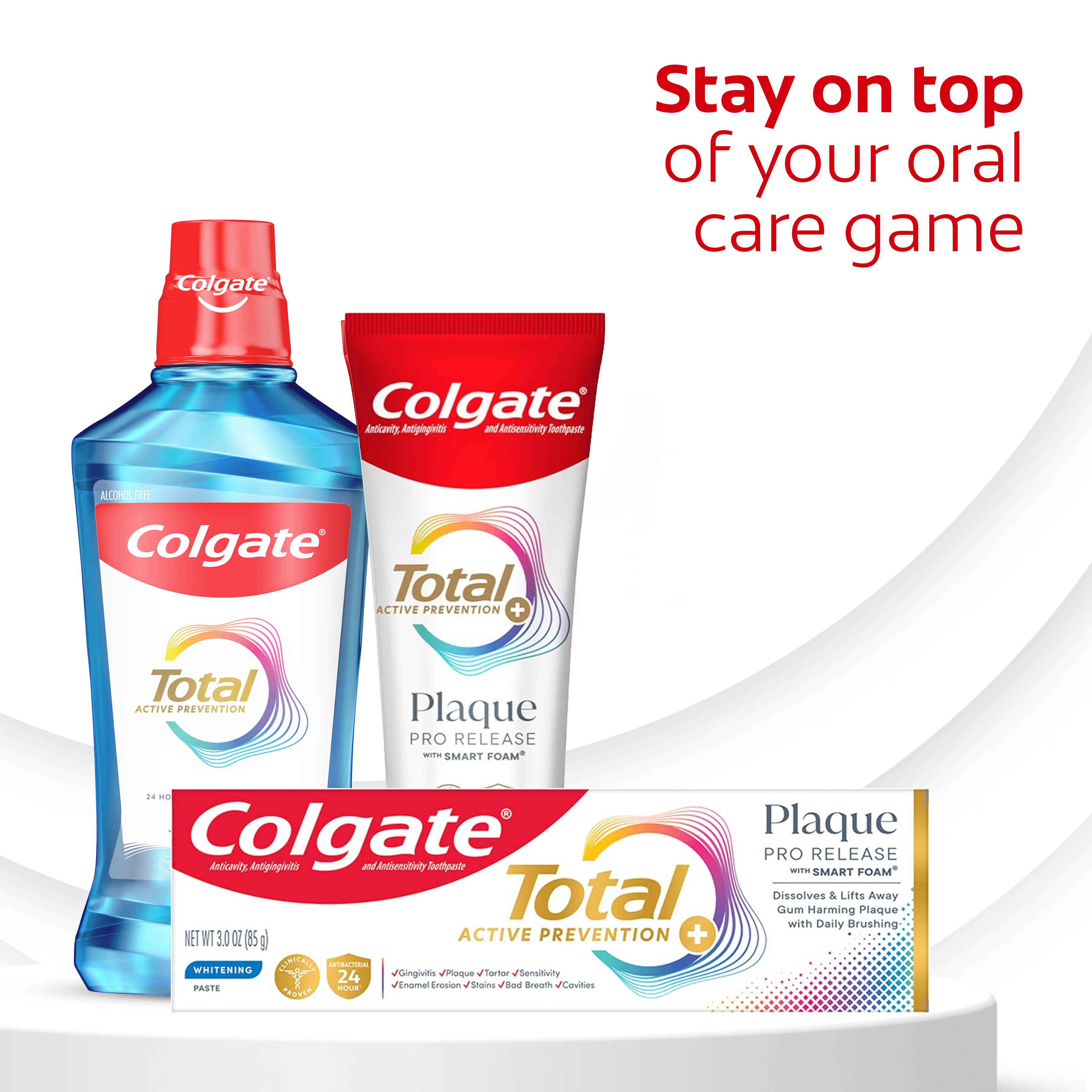 SKU 61030638 Consumer Unit - GTIN 00827854007036 Case - GTIN 10827854007033 Product Category Oral Care Product Sub Category Toothpaste Product Equity (Brand) Colgate Product Sub Brand Colgate Total Plaque Pro-Release TP Product Title Colgate Total Plaque Pro Release Whitening Toothpaste, 2 Pack, 3.0 oz Product Description Dissolve and lift away plaque for 2X less gum-harming plaque* with the Colgate Total Plaque Pro Release Whitening Toothpaste Pack. This minty plaque bacteria prevention toothpaste pack fights bad breath, offers long-lasting 24-hour antibacterial protection** and is clinically proven to significantly reduce plaque bacteria associated with gingivitis between dentist visits. Using Smart Foam Technology, Colgate Total Plaque Pro Release Toothpaste works along the gumline to penetrate hard-to-reach places and fight plaque bacteria in order to improve long-term gum health and strengthen the foundation of a healthy smile. Plus, this whitening toothpaste for gums also fights tartar buildup, making this gum toothpaste pack an invaluable tool for improving your oral health. Colgate Total Plaque Pro Release Whitening Toothpaste is more than just a plaque bacteria prevention toothpaste—it also helps fight bad breath, cavities, removes surface stains, and protects your teeth from sensitivity. Help improve your long-term oral health and strengthen the foundation of a healthy smile with Colgate Total Plaque Pro Release Whitening Toothpaste. *vs. regular fluoride toothpaste, with twice daily brushing for 6 months **after two weeks of twice daily use eCommerce Copy- Long Description SmartFoam Technology Helps Fight Plaque Did you know that plaque bacteria is a root cause of oral health problems? That’s why it’s important to reduce and prevent plaque bacteria with daily brushing. This long-lasting Colgate Total toothpaste offers 24 hours of antibacterial protection*. This unique breakthrough formula penetrates hard to reach places to fight plaque bacteria along the gum line. Colgate Total Plaque Pro Release toothpaste is clinically proven to significantly reduce harmful plaque bacteria associated with gingivitis between dentist visits.** Improve your long-term gum health and strengthen the foundation of a healthy smile with Colgate Total Plaque Pro-Release antigingivitis toothpaste. Whitening Toothpaste That’s Gluten Free and Sugar Free Colgate Total Plaque Pro-Release Whitening Toothpaste is a gluten free toothpaste and sugar free toothpaste. For good oral hygiene, brush your teeth twice a day for two minutes. You can smile confidently when you use Colgate Total toothpaste. *after two weeks of twice-daily use Healthy Smiles At Colgate, we make toothpaste that promotes healthy smiles. Not only because having a healthy smile is important to your overall health, but because when you have a healthy smile, you actually smile more – and that’s a powerful thing. Smiles are the simplest form of optimism, something we need now more than ever. That’s why we’re committed to raising oral healthcare standards everywhere. Bullet 1 Includes two (2) 3.0 oz tubes of Colgate Total Plaque Pro Release Whitening Toothpaste, Mint Bullet 2 Colgate Total Plaque Pro Release Toothpaste uses Smart Foam to penetrate hard-to-reach places to fight plaque bacteria along the gumline Bullet 3 This minty whitening toothpaste pack dissolves and lifts away plaque for 2X less gum-harming plaque* Bullet 4 Offers 24 hours of antibacterial protection** and clinically proven to significantly reduce bacteria associated with gingivitis between dentist visits Bullet 5 This gum care toothpaste fights plaque bacteria along the gumline to improve your long-term gum health Bullet 8 Helps fight tartar build-up and is clinically proven to significantly reduce plaque bacteria associated with gingivitis Bullet 9 Toothpaste that fights plaque bacteria along the gum line, improving long-term gum health and strengthening the foundation of a healthy smile Amazon RPC B0B9FB6ZTY AMZ URL https://www.amazon.com/dp/B0B9FB6ZTY Walmart RPC 1596837810 Walmart URL (Computed) https://www.walmart.com/ip/a/1596837810 Albertsons RPC 970489522 Albertsons URL https://www.albertsons.com/shop/product-details.970489522.html