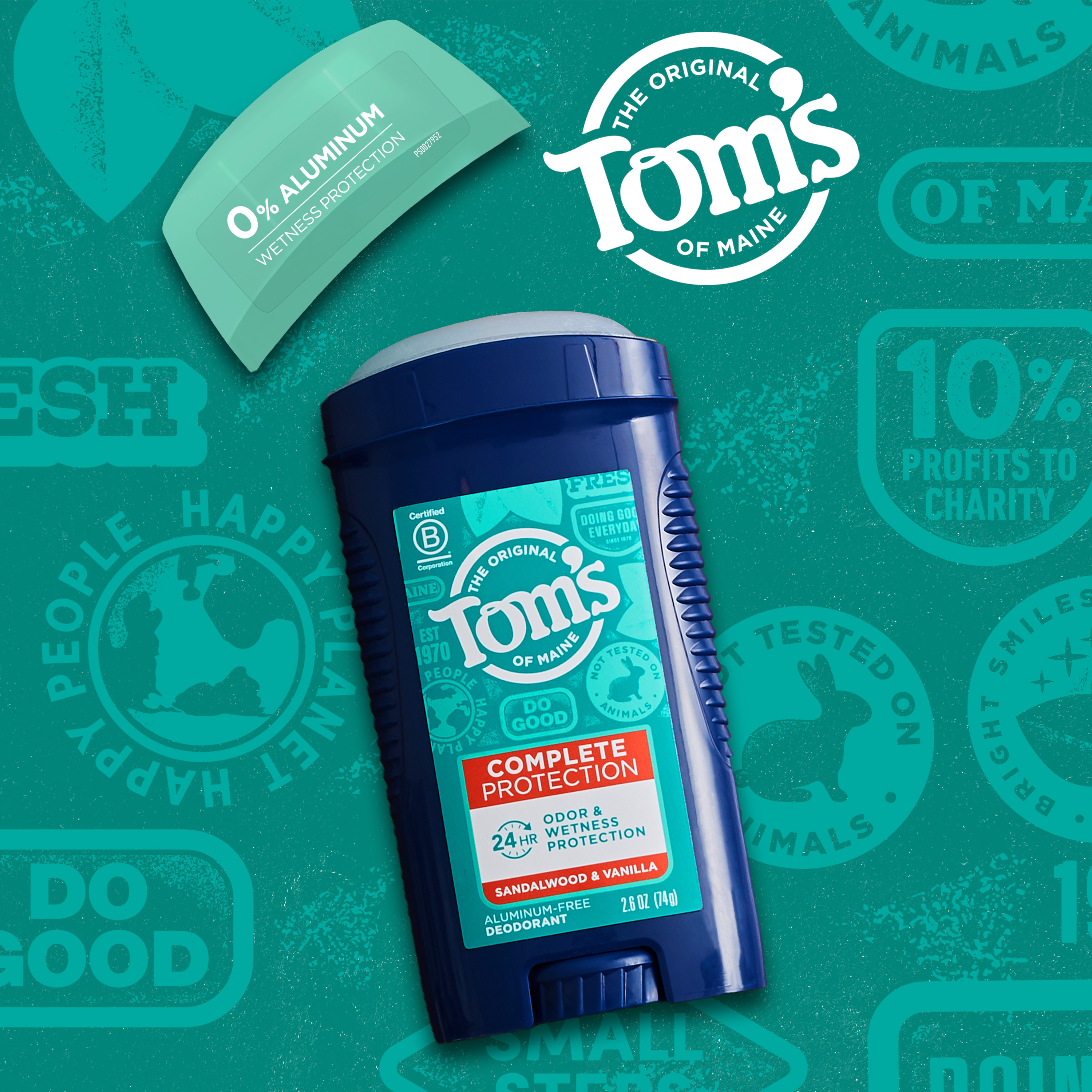 SKU 61030711 Consumer Unit - GTIN 00827854007081 Case - GTIN 10827854007088 Product Category Personal Care Product Sub Category AP > Deo Product Equity (Brand) Tom's of Maine Product Sub Brand Tom's Complete Protection AP/Deo Product Title Tom’s of Maine Complete Protection, Sandalwood & Vanilla, 2.6 Oz Product Description Ready to feel dry all day with a natural deodorant? Tom's of Maine Complete Protection Natural Deodorant is designed to provide the complete odor and wetness protection you need, keeping you fresh and feeling dry all day. You don't have to choose between picking a natural deodorant and having wetness protection. You can get 24-hour wetness protection in an irresistible, natural Sandalwood & Vanilla scent. Welcome to your new everyday odor and wetness protection secret weapon. Tom's of Maine Complete Protection deodorant is thoughtfully blended and packaged in the USA, and it's the first natural deodorant with wetness protection from Tom’s of Maine. At Tom's of Maine, we want to empower families to live more naturally. With more than 50 years experience combining scientific know-how, naturally derived ingredients, and a bit of ingenuity, we make products that are good for you and the planet. As a Certified B Corp, we hold ourselves to the highest social and environmental standards. Plus, we're committed to supporting local communities for meaningful change, donating 10% of our profits to charities supporting health, education and the environment. We call this "doing good, for real," and it impacts everything we do. eCommerce Copy- Long Description Ready to feel dry all day with a natural deodorant? Tom's of Maine Complete Protection Natural Deodorant is designed to provide the complete odor and wetness protection you need, keeping you fresh and feeling dry all day. You don't have to choose between picking a natural deodorant and having wetness protection. You can get 24-hour wetness protection in an irresistible, natural Sandalwood & Vanilla scent. Welcome to your new everyday odor and wetness protection secret weapon. Tom's of Maine Complete Protection deodorant is thoughtfully blended and packaged in the USA, and it's the first natural deodorant with wetness protection from Tom’s of Maine. At Tom's of Maine, we want to empower families to live more naturally. With more than 50 years experience combining scientific know-how, naturally derived ingredients, and a bit of ingenuity, we make products that are good for you and the planet. As a Certified B Corp, we hold ourselves to the highest social and environmental standards. Plus, we're committed to supporting local communities for meaningful change, donating 10% of our profits to charities supporting health, education and the environment. We call this "doing good, for real," and it impacts everything we do. Bullet 1 24-HOUR CONFIDENCE: Feel fresh all day long with 24 hours of odor and wetness protection Bullet 2 ALUMINUM FREE: Start your day with a swipe of 0% aluminum deodorant Bullet 3 A NEW KIND OF FRESH: This is the first natural deodorant with wetness protection from Tom’s of Maine Bullet 4 TAKE CARE OF YOURSELF NATURALLY: This vegan deodorant contains no artificial fragrances or preservatives and is not tested on animals Amazon RPC B0BB15NNTH AMZ URL https://www.amazon.com/dp/B0BB15NNTH Target RPC 87071658 Target URL https://www.target.com/p/a/-/A-87071658