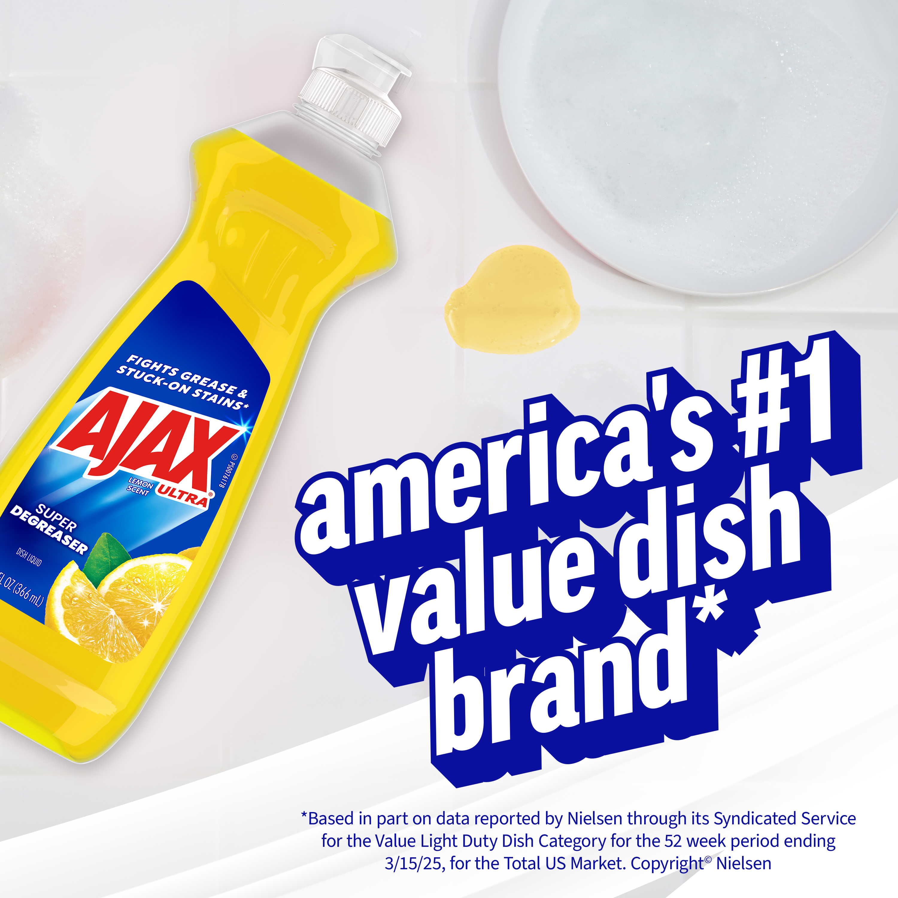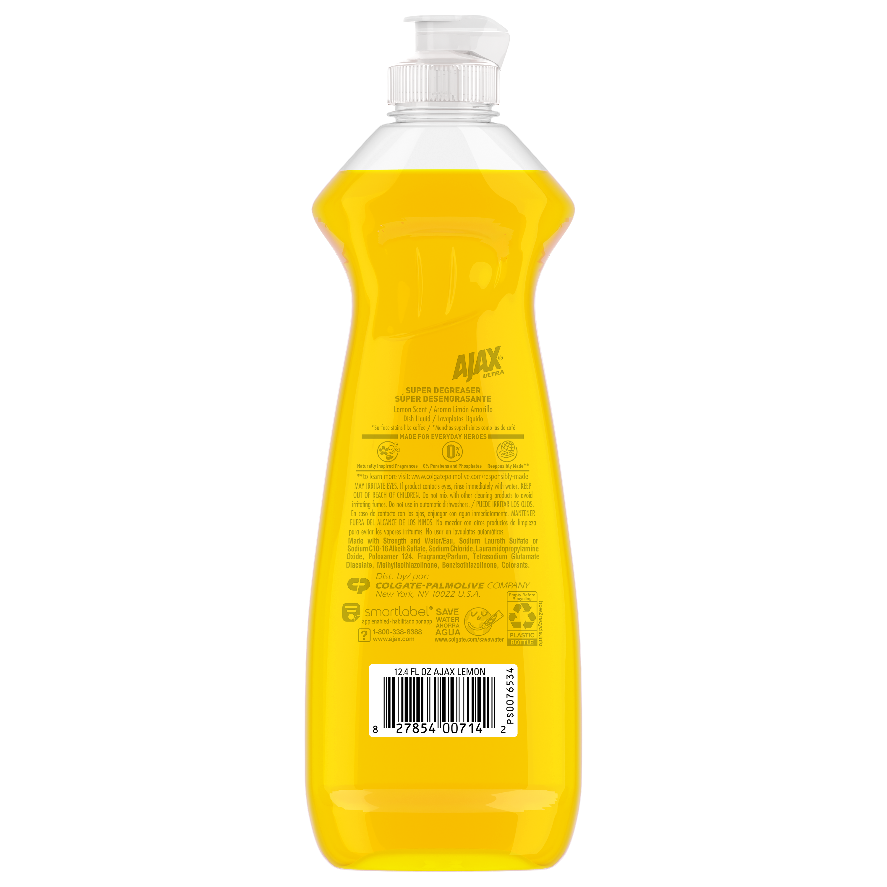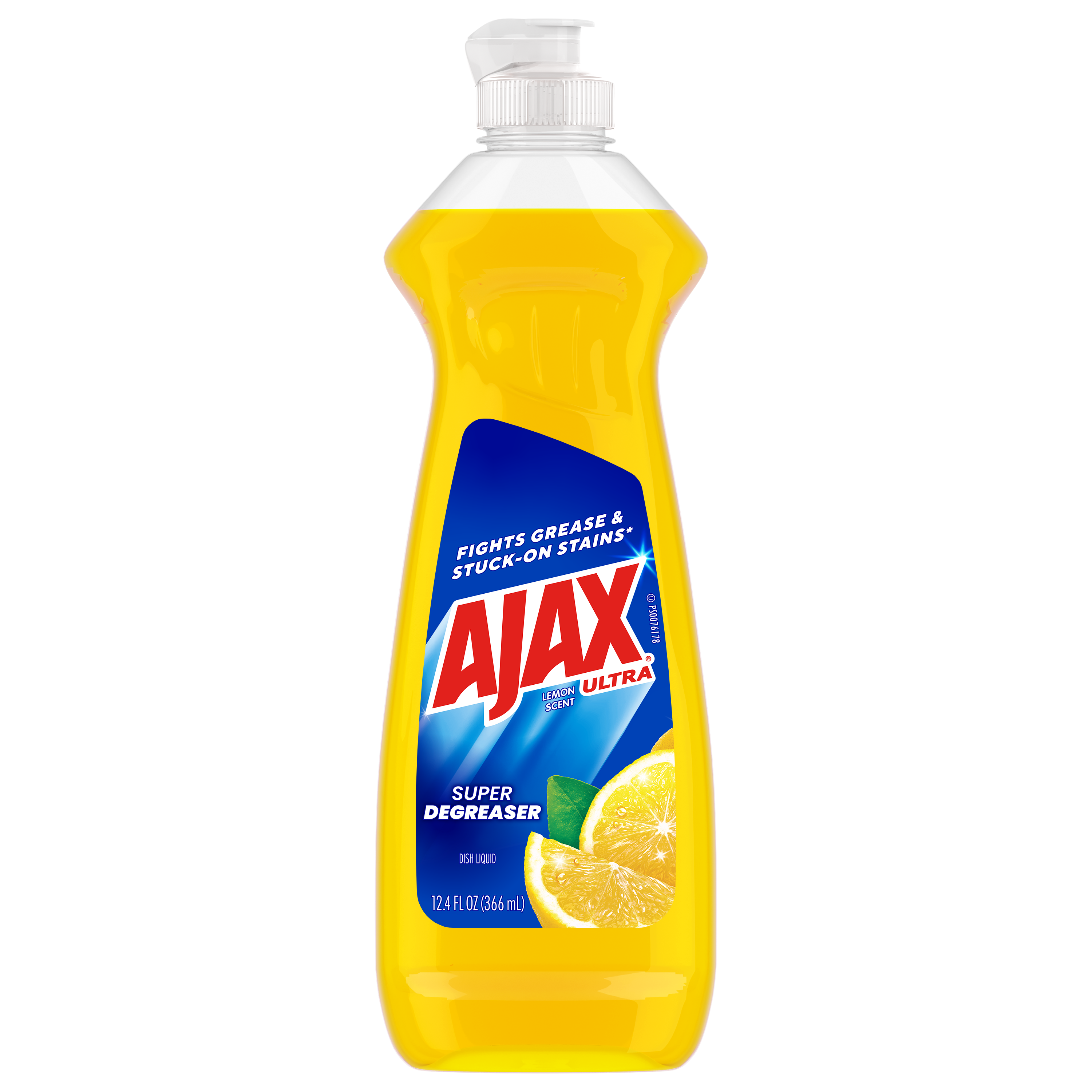 SKU 61030764 Consumer Unit - GTIN 00827854007142 Case - GTIN 10827854007149 Product Category Home Care Product Sub Category Dish Hand Product Equity (Brand) Ajax Product Sub Brand Ajax HD Product Title Ajax Ultra Liquid Dish Soap Lemon Scent, Super Degreaser, 12.4 oz Bottle Product Description Boost your mood and your dishwashing experience with Ajax Ultra Liquid Dish Soap. We have combined your favorite lemon scent with the efficacy of Ajax to help you fight grease and stuck-on stains on dishes, ensuring a powerful cleaning experience. Our super degreaser formula ensures you conquer grease and stubborn stains on your dishes, delivering a deep-cleaning action that leaves your kitchenware spotless. This dishwashing detergent liquid is made with naturally inspired fragrances, zero parabens and no phosphates. The power of Ajax Ultra goes beyond the sink. This versatile kitchen dish soap allows you to pre-treat laundry, wash tires, and wipe down appliances. Life is tough, but you're tougher! We understand that life isn’t easy. You work hard—heck, REALLY hard. You tackle big and small tough jobs, without looking for applause. That’s why we at Ajax recognize you, the everyday heroes, who step up at the end of a long day and get the dishes done. Because, let’s face it, at the end of the day a clean home is a happy home. Leave the grime to us so you can get back to what really matters! eCommerce Copy- Long Description Easily dissolve stuck-on grease Boost your mood and your dishwashing experience: Delight in the fresh, clean aroma of lemon and leave your dishes sparkling clean with Ajax Ultra Super Degreaser Liquid Dish Soap with Lemon Scent. This product easily dissolves stuck-on grease. Enjoy the clean scent of lemon with this dish liquid made from 100% real citrus extract. This product is phosphate-free. Made with naturally inspired fragrances, 0% parabens and phosphates, and 100% biodegradable active ingredients, this dish soap is designed for everyday heroes like you. Plus, try this product to tackle tough jobs beyond dishwashing! Learn more at ajax.com. Life is tough, but you're tougher! We understand that life isn’t easy. You work hard—heck, REALLY hard. You tackle big and small tough jobs, without looking for applause. That’s why we at Ajax recognize you, the everyday heroes, who step up at the end of a long day and get the dishes done. Because, let’s face it, at the end of the day a clean home is a happy home. By standing tall in the face of messes, you are an everyday hero. Leave the grime to us so you can get back to what really matters! Bullet 1 One 12.4 oz Bottle of Ajax Ultra Liquid Dish Soap Lemon Scent, Super Degreaser Bullet 2 This liquid dish soap brings a boost of mood and freshness to your kitchen with its refreshing lemon scent, creating a delightful and powerful cleaning experience Bullet 3 This yellow dish soap not only leaves your dishes sparkling clean but easily dissolves stuck on grease and stubborn stains Bullet 4 This dishwashing detergent liquid is made with naturally inspired fragrances, zero parabens and no phosphates Bullet 5 The power of Ajax kitchen dish soap goes beyond the sink. This versatile dish soap liquid allows you to pre-treat laundry, wash tires, and wipe down appliances Bullet 6 Life is tough, but Ajax applauds your resilience. Let the lemon scent transform chores into moments of joy Bullet 7 Ajax salutes hardworking individuals, recognizing the unsung heroes who conquer tough jobs, making homes happy Walmart RPC 1040091119 Walmart URL (Computed) https://www.walmart.com/ip/a/1040091119 Albertsons RPC 970516403 Albertsons URL https://www.albertsons.com/shop/product-details.970516403.html Dollar Tree RPC 239900 Family Dollar RPC 1498126