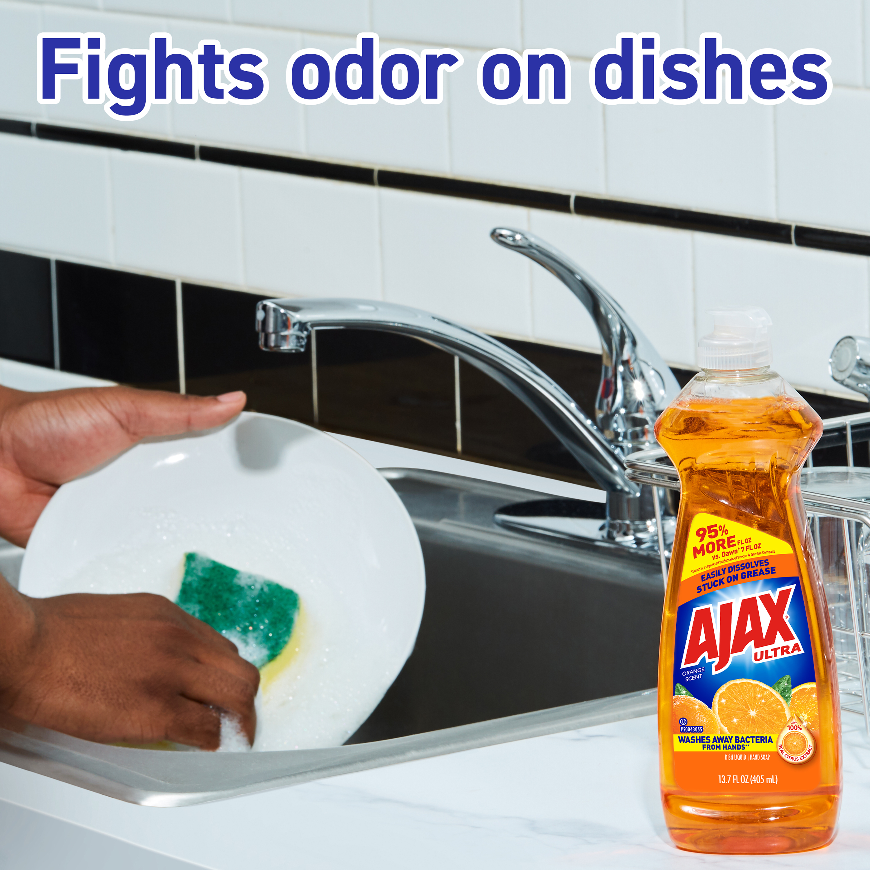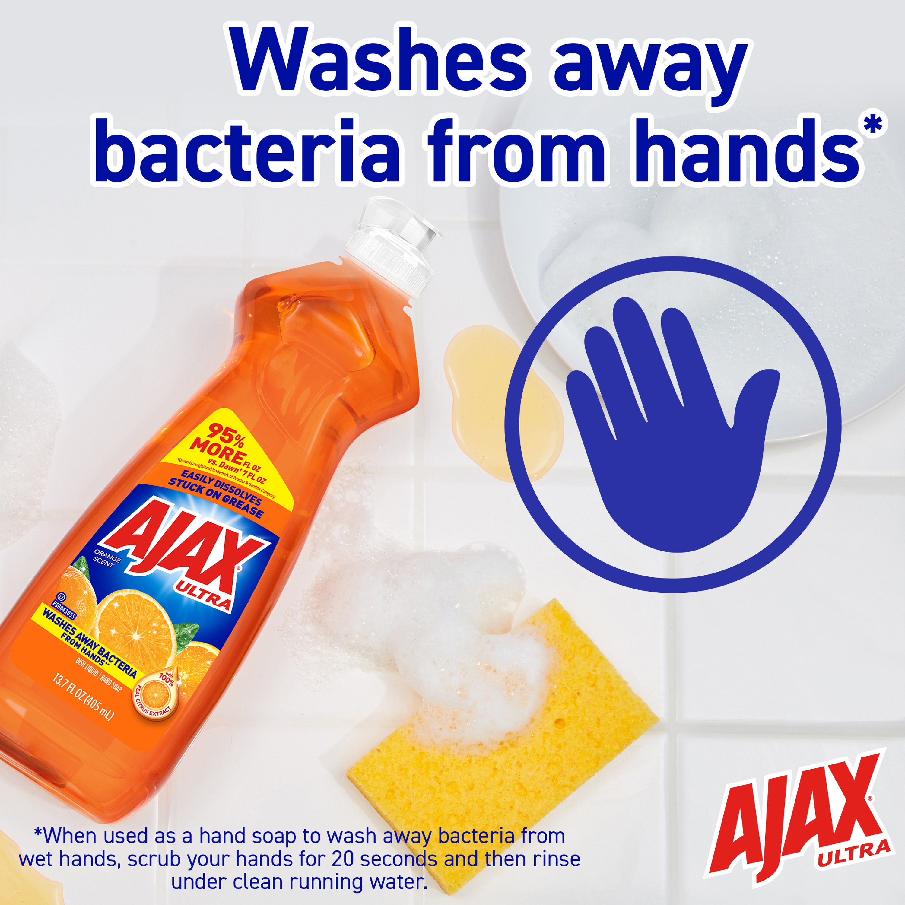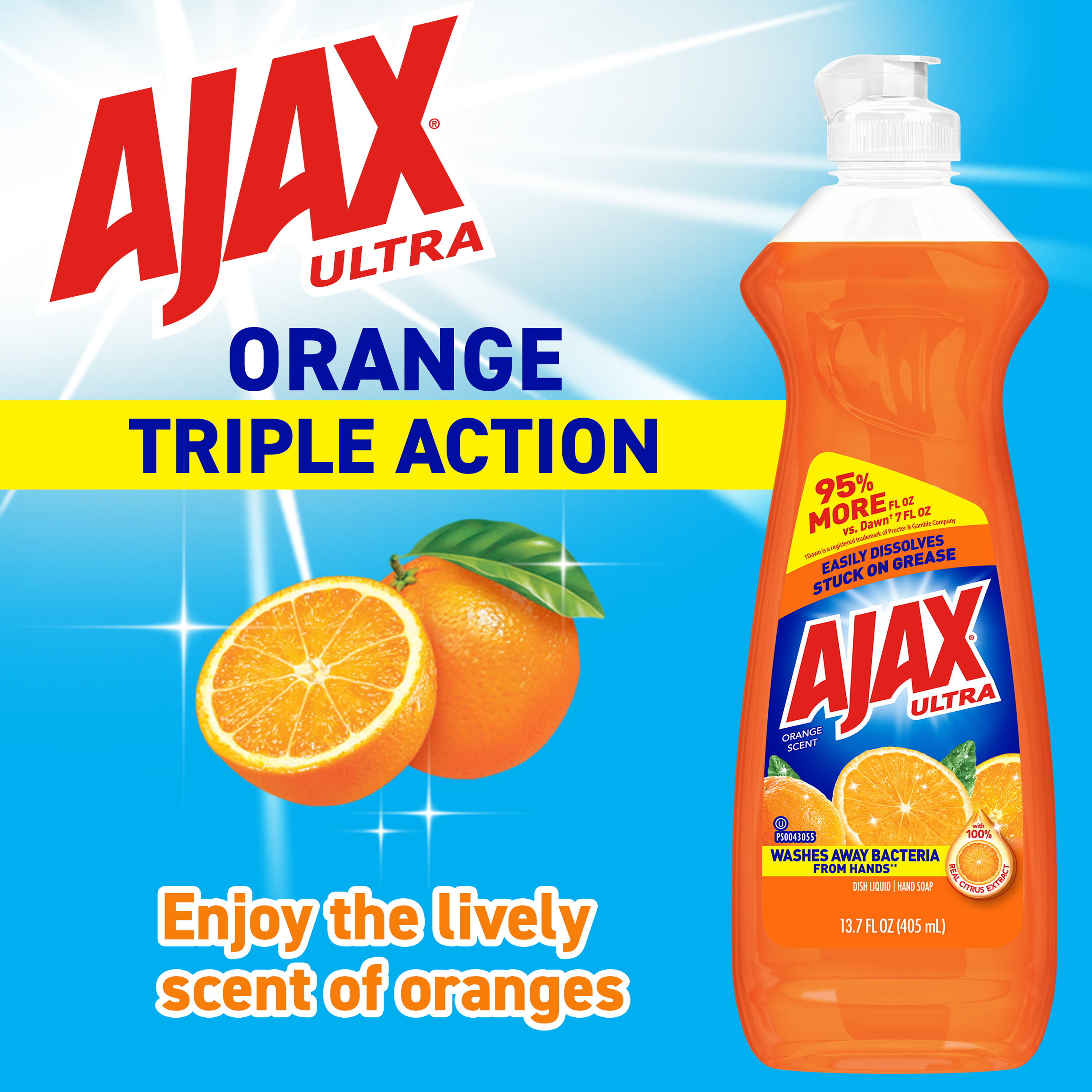 Boost your mood and your dishwashing experience: Ajax Ultra Triple Action Liquid Dish Soap with Orange Scent provides a pleasant cleaning experience with the lively scent of oranges, while leaving your dishes sparkling clean. Plus, this dish soap washes away bacteria from hands* and easily dissolves stuck-on grease. Enjoy the lively scent of oranges with this dish liquid made with 100% real citrus extract. This product is phosphate-free. Made with naturally inspired fragrances, 0% parabens and phosphates, and 100% biodegradable active ingredients, this dish soap is designed for everyday heroes like you.