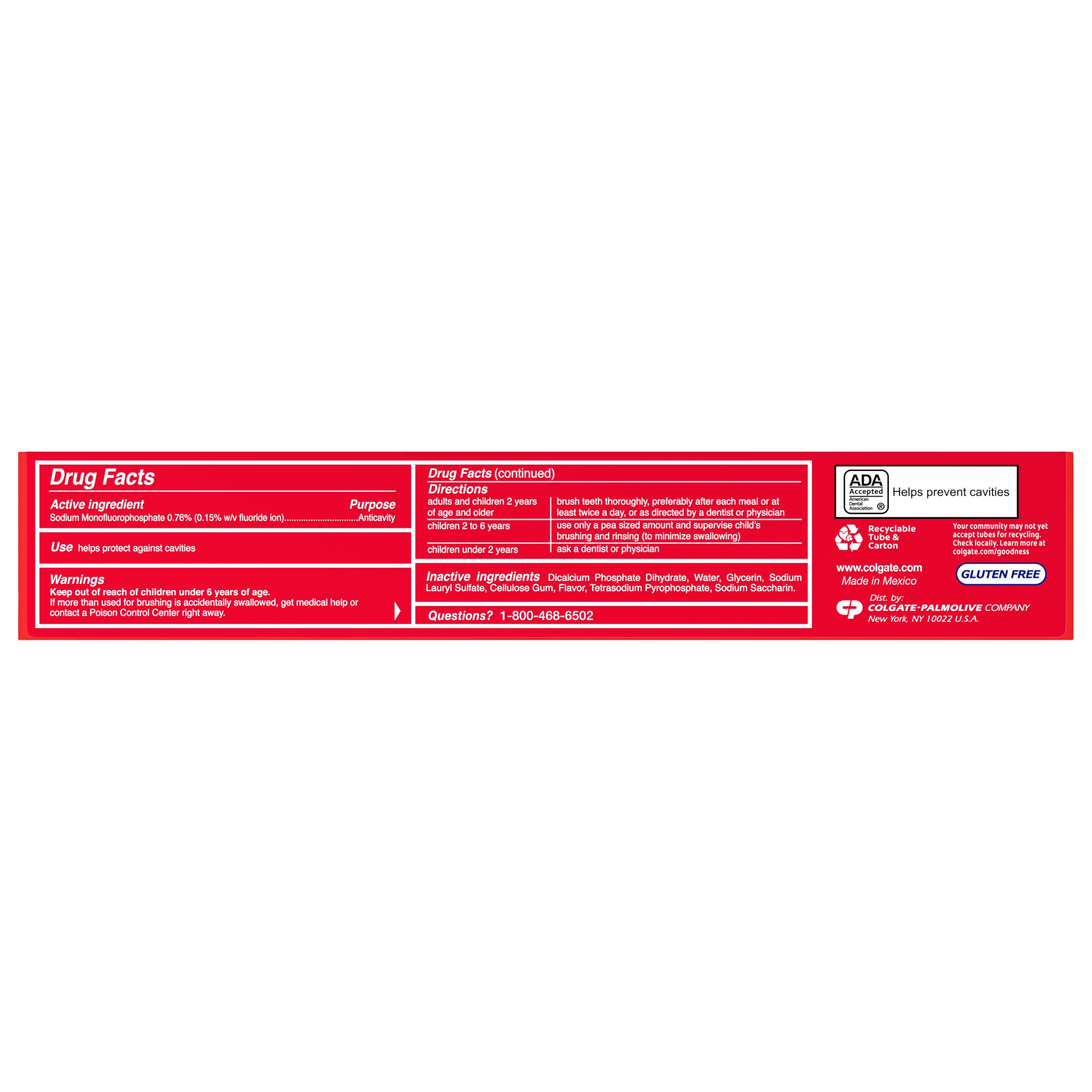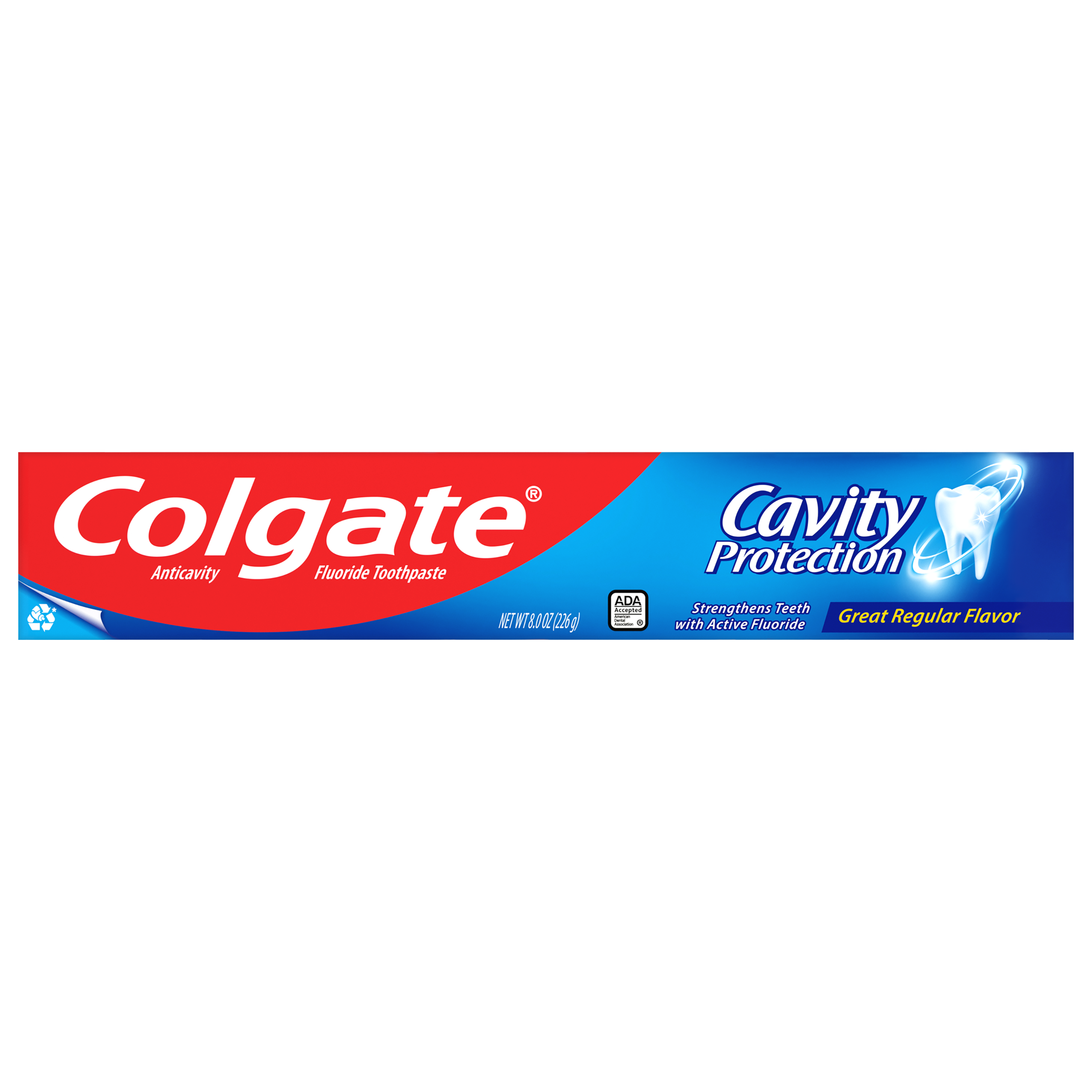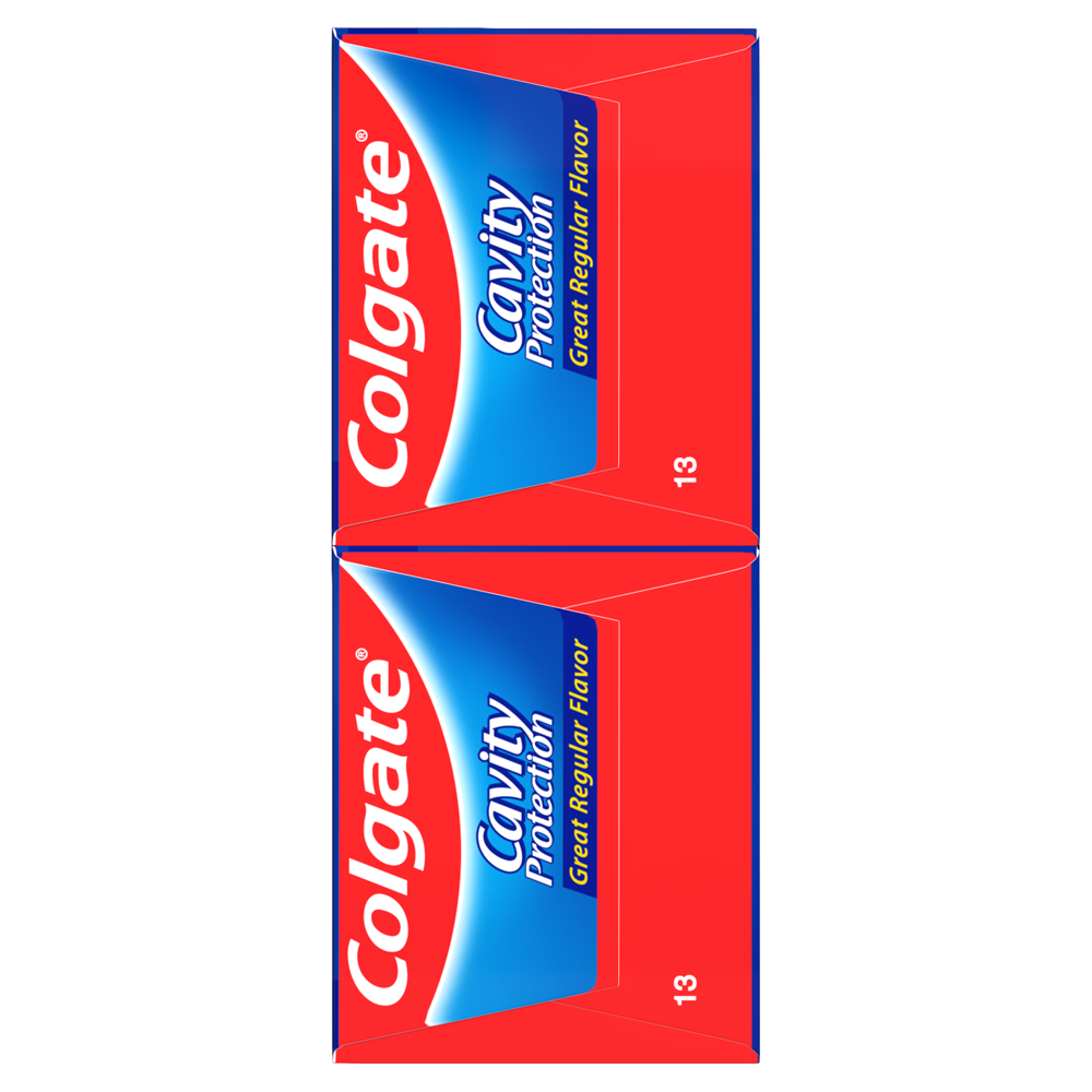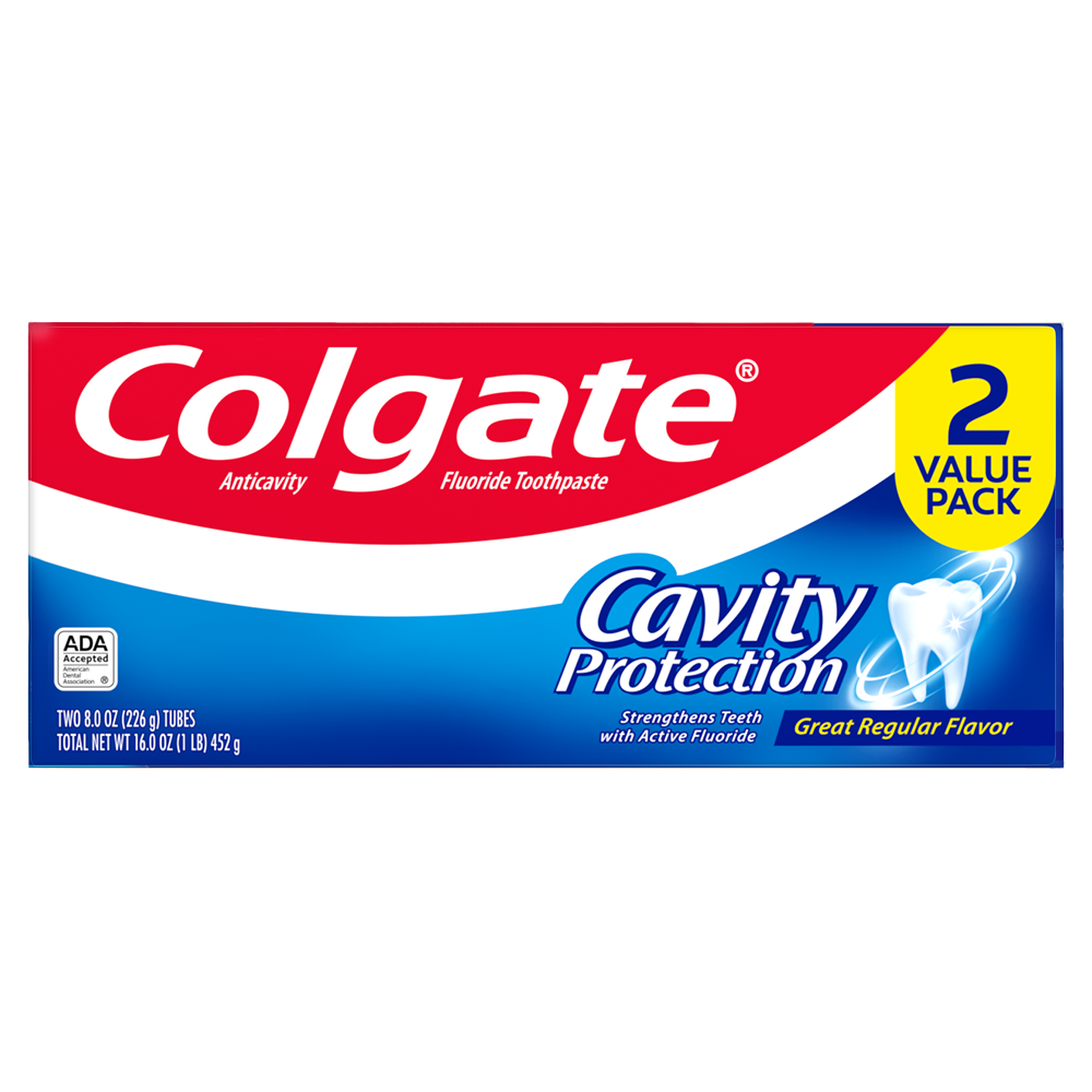 SKU 61033205 Consumer Unit - GTIN 00827854008514 Case - GTIN 10827854008511 Product Category Oral Care Product Sub Category Toothpaste Product Equity (Brand) Colgate Product Sub Brand Colgate Maximum Cavity Protection TP Product Title Colgate Cavity Protection Toothpaste with Fluoride, Great Regular Flavor - 8.0 Ounce, 2 Pack Product Description Colgate Cavity Protection Toothpaste with Fluoride, Great Regular Flavor - 8.0 Ounce Colgate Cavity Protection Toothpaste with Fluoride, Great Regular Flavor helps strengthen teeth enamel every time you brush your teeth. Formulated with fluoride, this anticavity fluoride toothpaste is clinically proven to clean deep, strengthen teeth, fight cavities and leave your mouth feeling fresh and clean. Maintain a long-lasting smile with this fluoride toothpaste and give the Colgate Cavity Protection Fluoride Toothpaste a go for your daily dental care needs. Cavity Protection Let’s brush up on what fluoride is. By now, you’ve heard about the importance of it and how it helps strengthen teeth enamel and fight cavities. That's why we recommend trying Colgate Cavity Protection Toothpaste With Fluoride for your daily oral hygiene routine. Providing trusted cavity protection, this anticavity fluoride toothpaste preserves tooth health and keeps your mouth feeling refreshed and clean. In fact, this Colgate toothpaste is ADA (American Dental Association) accepted. It has been trusted by dentists and parents globally for over 45 years. Healthy Smiles With Colgate At Colgate, we make toothpaste that promotes healthy smiles. Not only because having a healthy smile is important to your overall health, but because when you have a healthy smile, you actually smile more – and that’s a powerful thing. Smiles are the simplest form of optimism, something we need now more than ever. That’s why we’re committed to raising oral healthcare standards everywhere. eCommerce Copy- Long Description Give your smile the best protection* with Colgate Maximum Cavity Protection Toothpaste. The new and best ever* formula in this cavity protection toothpaste contains a dual anticavity system with a unique combination of fluoride and natural arginine that gives you 4X stronger enamel**. This effectively protects you from caries and gives you advanced cavity protection. The toothpaste also has superior*** anticavity technology that neutralises caries-causing bacteria before they have a chance to weaken your enamel. And with a great mint flavour that freshens your breath, there’s even more reason to defend your smile with this cavity protection toothpaste. *For cavity protection vs. previous formulation. **At 2 weeks mineral change vs regular fluoride toothpaste ***Vs regular fluoride toothpaste . Bullet 1 Fluoride toothpaste fights cavities Bullet 2 Cleans teeth thoroughly Bullet 3 Strengthens teeth enamel with active fluoride Bullet 4 Great mint taste Bullet 5 Anticavity fluoride toothpaste Bullet 6 Gluten free Active Ingredients Sodium Monofluorophosphate 0.76 % (0.15% w/v fluoride ion)