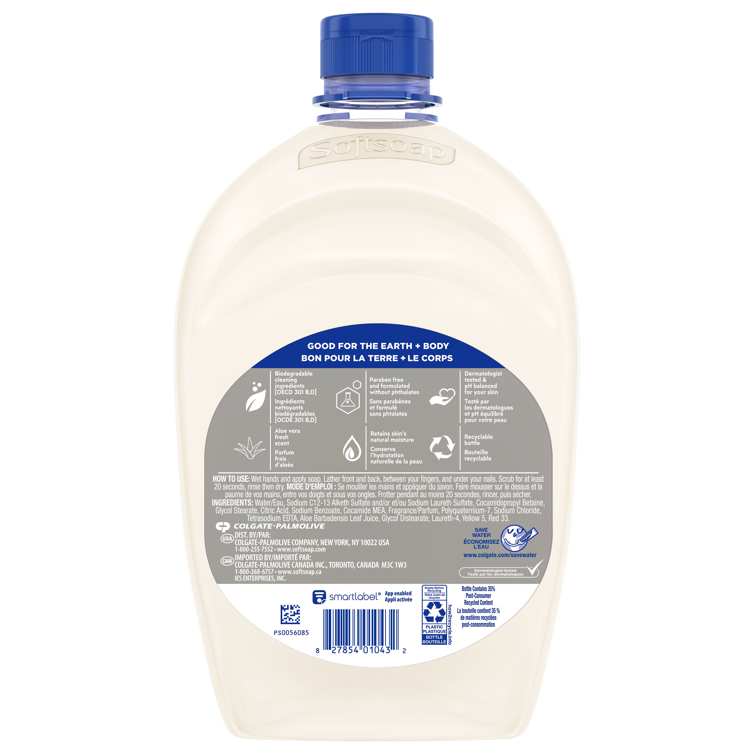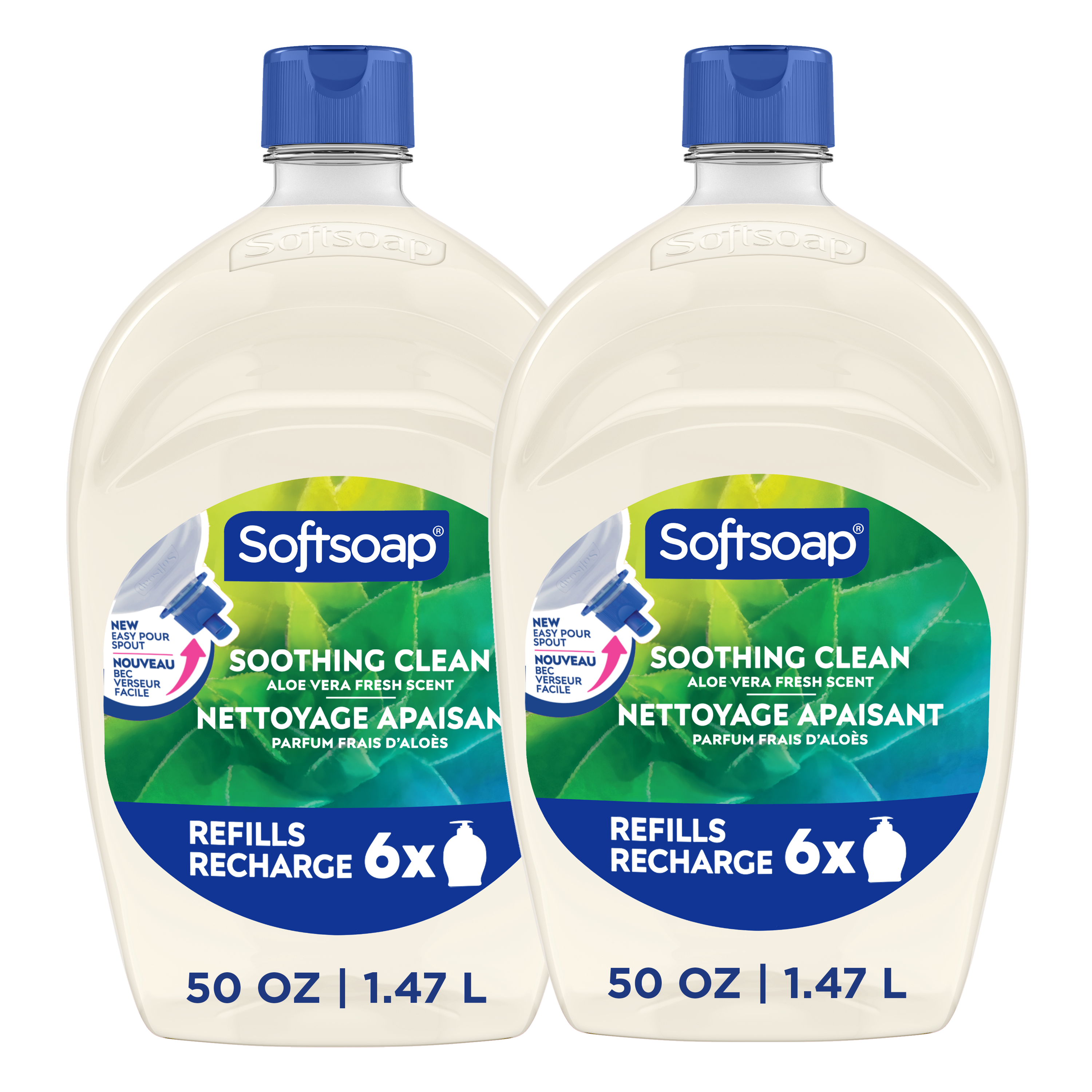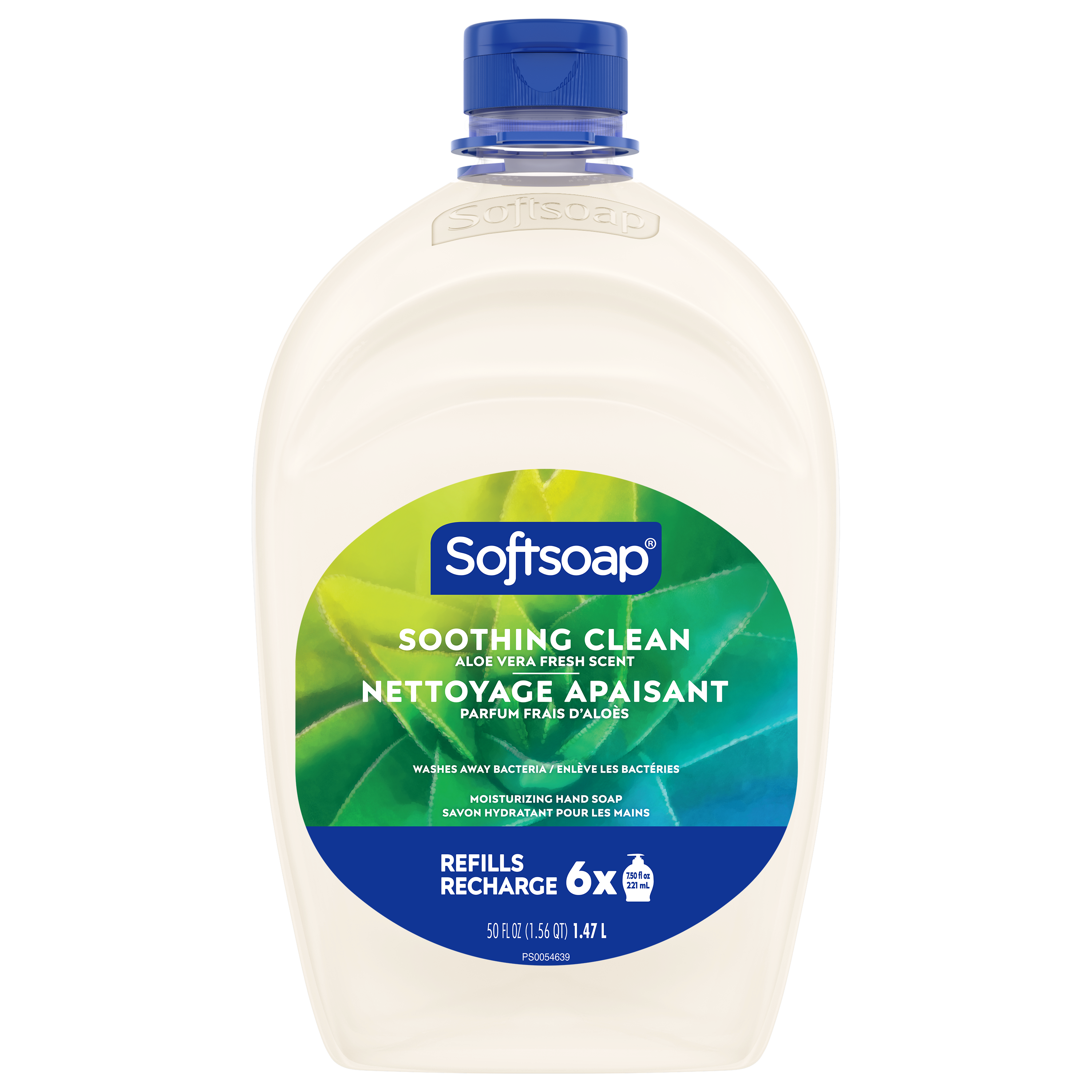 SKU 61034225 Consumer Unit - GTIN 00827854010432 Product Category Personal Care Product Sub Category Liquid Hand Wash Product Equity (Brand) Softsoap Product Sub Brand Softsoap LHW Product Title Softsoap Soothing Clean Liquid Hand Soap, Kitchen and Bathroom Hand Soap, Aloe Vera Fresh Scent, 50 fl oz Refill (2 Pack) Product Description Keep your favorite Softsoap Soothing Clean Liquid Hand Soap stocked and ready for use. As the #1 liquid hand soap brand (1), Softsoap delivers an uplifting experience with each use. Give your hands a clean and fresh experience with our convenient refill size — perfect for refilling your soap dispensers. Each refill bottle holds enough liquid to refill a standard 7.5 oz liquid hand soap pump bottle over 6x. Our Soothing Clean Aloe Vera Fresh Scent hand soap not only provides a refreshing scent, but it also washes away bacteria, leaving your hands feeling clean. It effectively removes dirt, grease, grime, oil, and food. Our hand soap is dermatologist tested and helps retain your skin's natural moisture leaving your skin feeling soft and smooth. It is also paraben-free and made without phthalates. Softsoap liquid hand soap is perfect for refilling your bathroom soap bottles or to use as a kitchen hand soap bottle. Embrace the Soothing Aloe Vera scent by keeping a liquid hand soap refill bottle on hand so you can infuse every small moment with joy. (1) Based in part on data reported by Nielsen through its Market Track Service for the Liquid Hand Soap Category for the 52 week period ending 02/14/25, for the All Outlet market. Copyright © 2025 Nielsen. Bullet 1 Two 50 fl oz refill bottles of Softsoap Soothing Clean Liquid Hand Soap Bullet 2 Softsoap is the #1 liquid hand soap brand (1) Bullet 3 Each refill bottle holds enough liquid to refill a standard 7.5 oz liquid hand soap pump bottle over 6x Bullet 4 Our hand soap refill is mess free making it versatile to use in the bathroom or as a kitchen hand soap Bullet 5 Proudly formulated without parabens or phthalates, this dermatologist-tested hand soap will keep your hands clean and fresh Bullet 6 This hand soap washes away bacteria so you can confidently clean your hands, aligning with health care recommendations to wash hands with soap and clean running water for 20 seconds