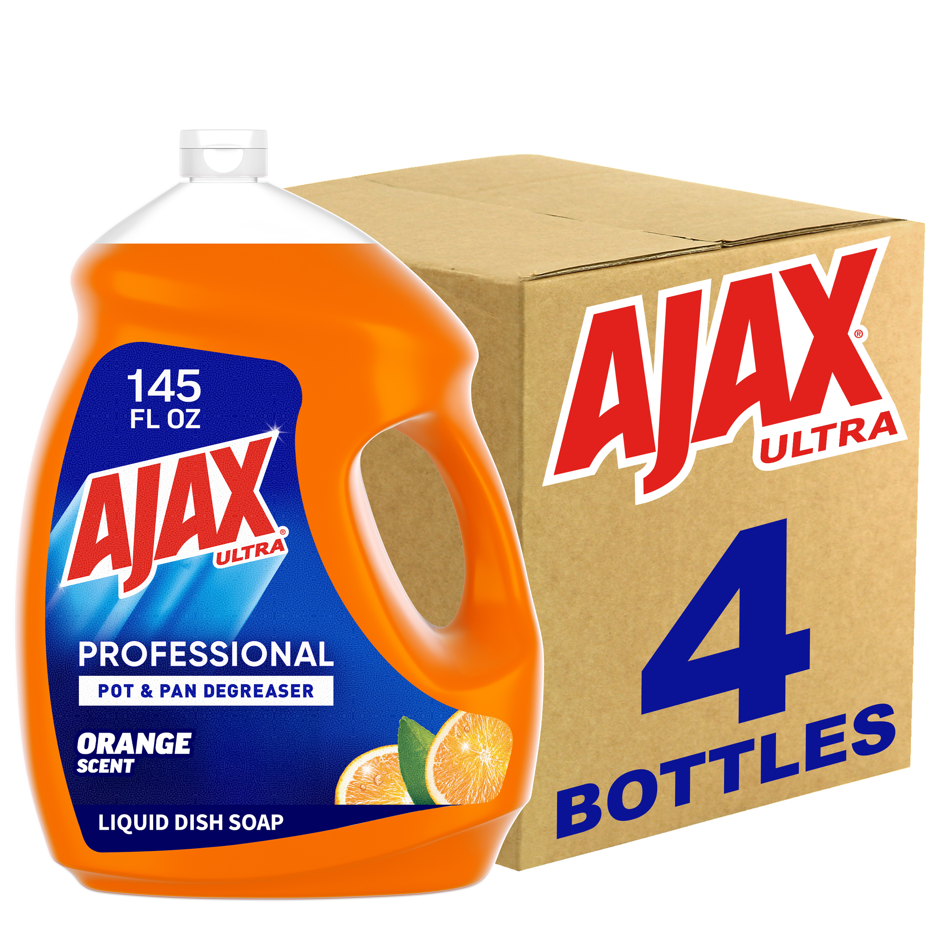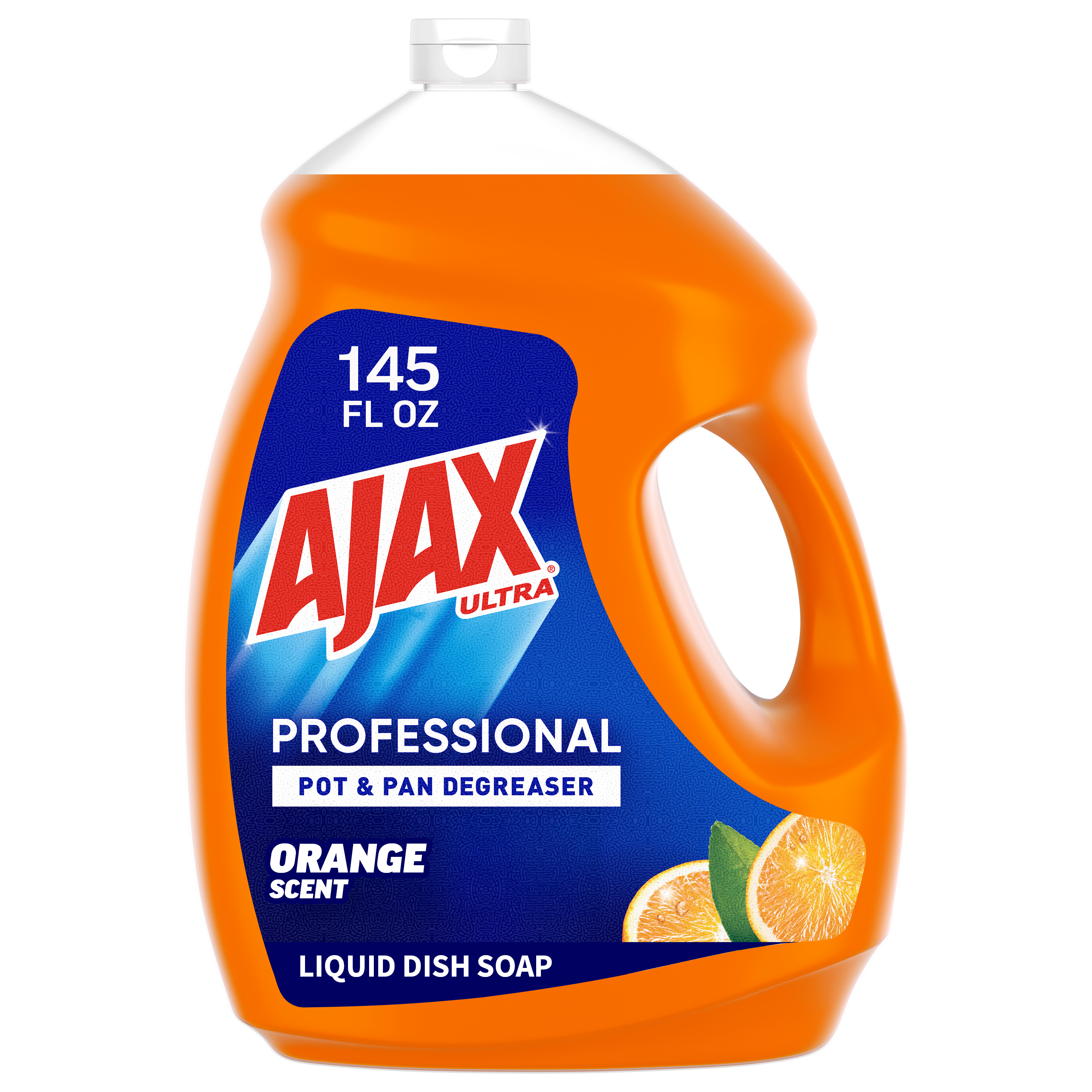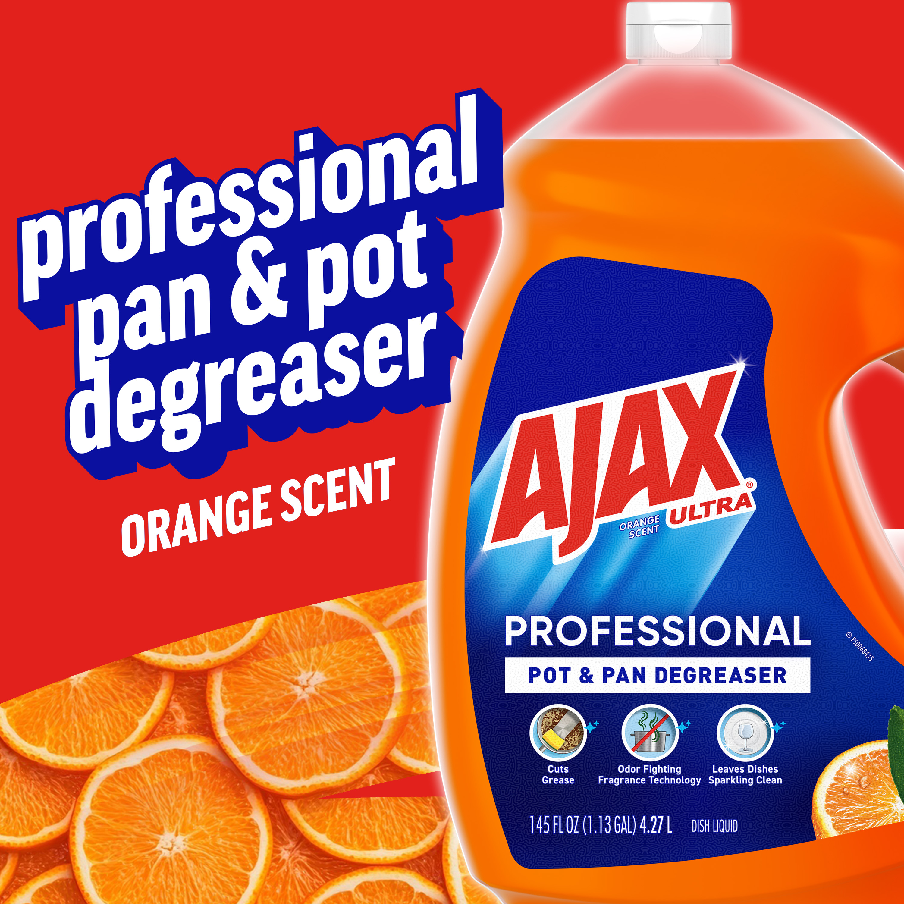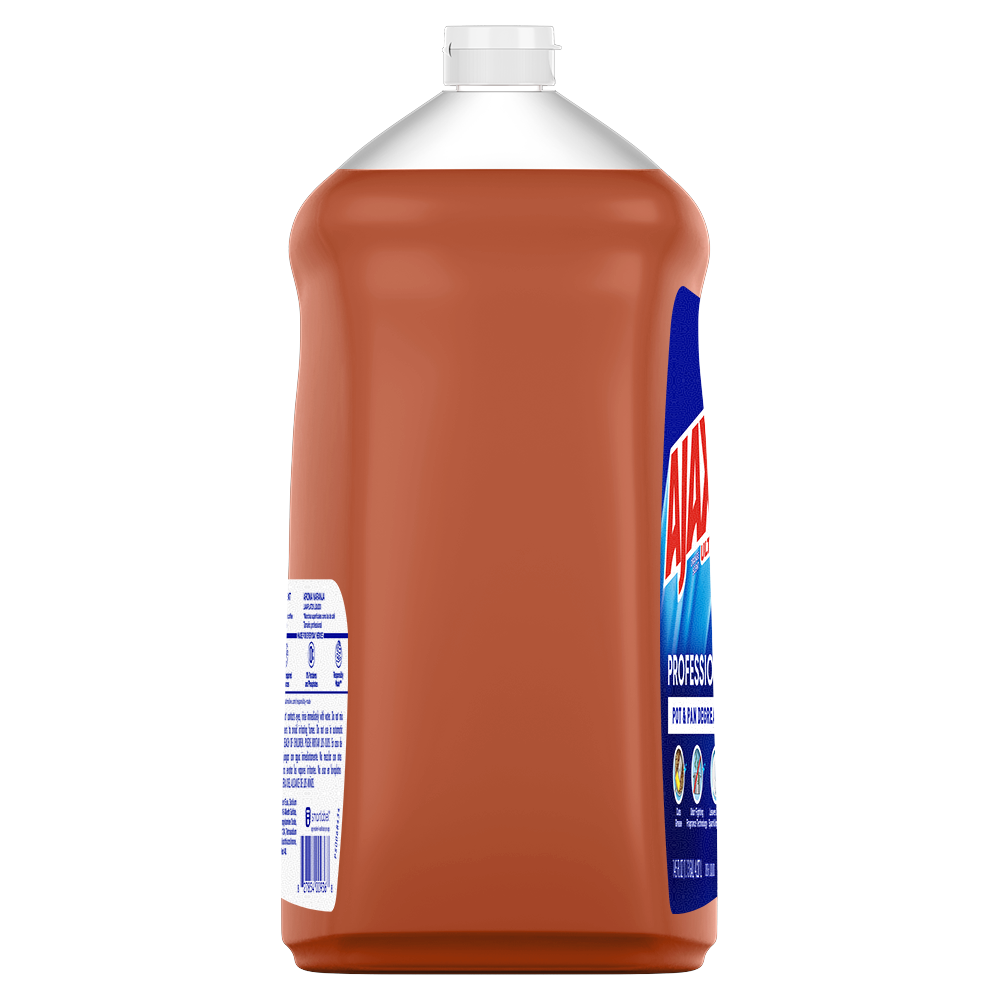 SKU 61034313 Consumer Unit - GTIN 00827854009368 Case - GTIN 10827854009365 Product Category Home Care Product Sub Category Dish Hand Product Equity (Brand) Ajax Product Sub Brand Ajax HD Product Title Ajax Ultra Professional Pot & Pan Degreaser Dish Liquid, Orange Scent - 145 Fluid Ounce eCommerce Copy- Long Description Bring the power of Ajax to your commercial kitchen Ajax Ultra Professional Pot & Pan Degreaser Dish Liquid works in three ways to clean dirty dishes: Cuts grease on dishes Odor-fighting fragrance technology Washes bacteria from hands* This professional size dish liquid easily dissolves stuck-on grease and leaves dishes sparkling clean. Plus, it provides a pleasant cleaning experience with the lively scent of oranges. Made with naturally inspired fragrances, 0% parabens and phosphates, and 100% biodegradable active ingredients †, this dish soap is designed for the everyday heroes in commercial kitchens. *When using as a hand soap to wash away bacteria from wet hands, scrub hands for 20 seconds and then rinse under clean running water. †OECD 301 B,C,D / OCDE 301 B,C,D Life is tough, but you're tougher! We understand that life isn’t easy. You work hard—heck, REALLY hard. You tackle big and small tough jobs, without looking for applause. That’s why we at Ajax recognize you, the everyday heroes, who step up at the end of a long day and get the dishes done. Because, let’s face it, at the end of the day a clean kitchen is a happy kitchen. By standing tall in the face of messes, you are an everyday hero. Leave the grime to us so you can get back to what really matters!