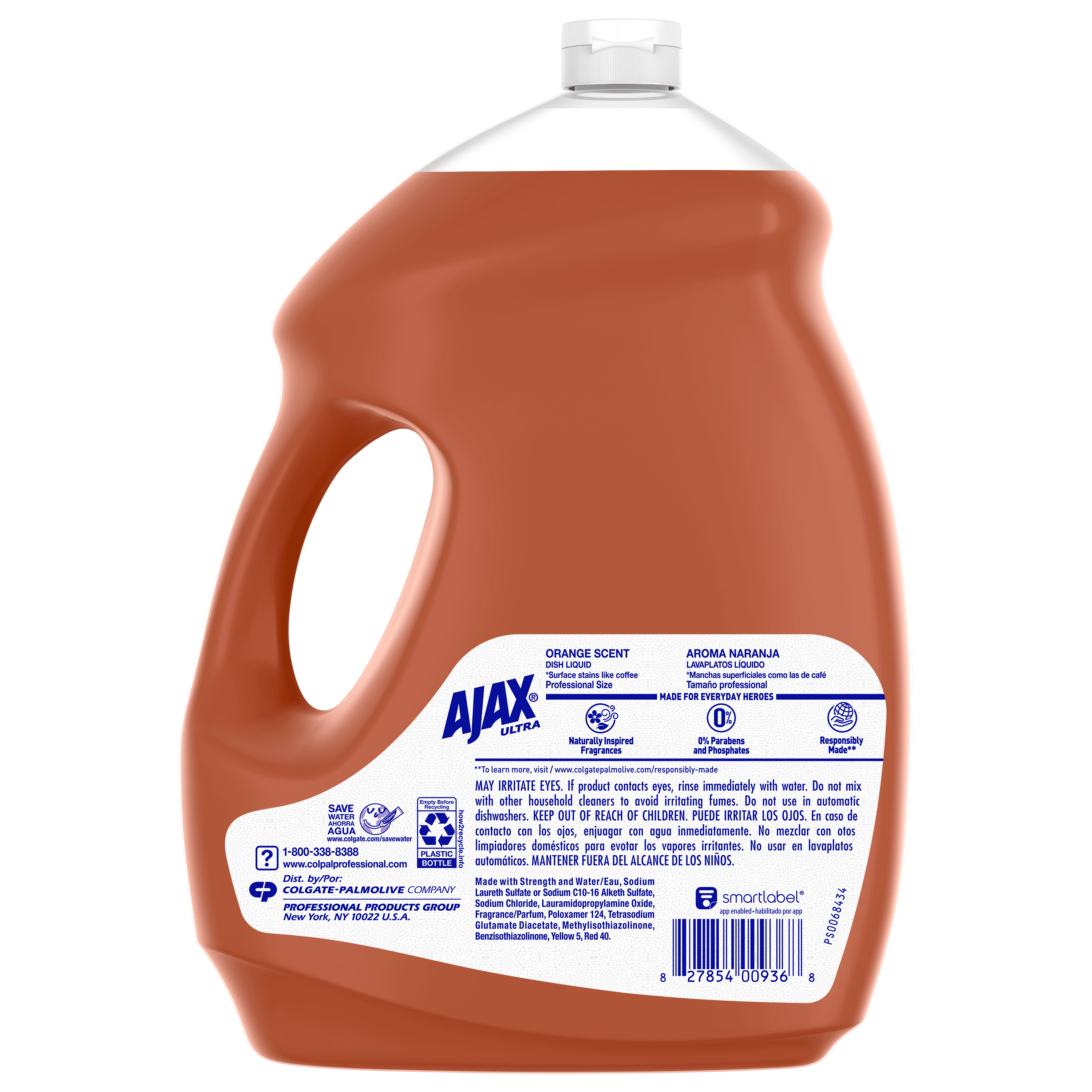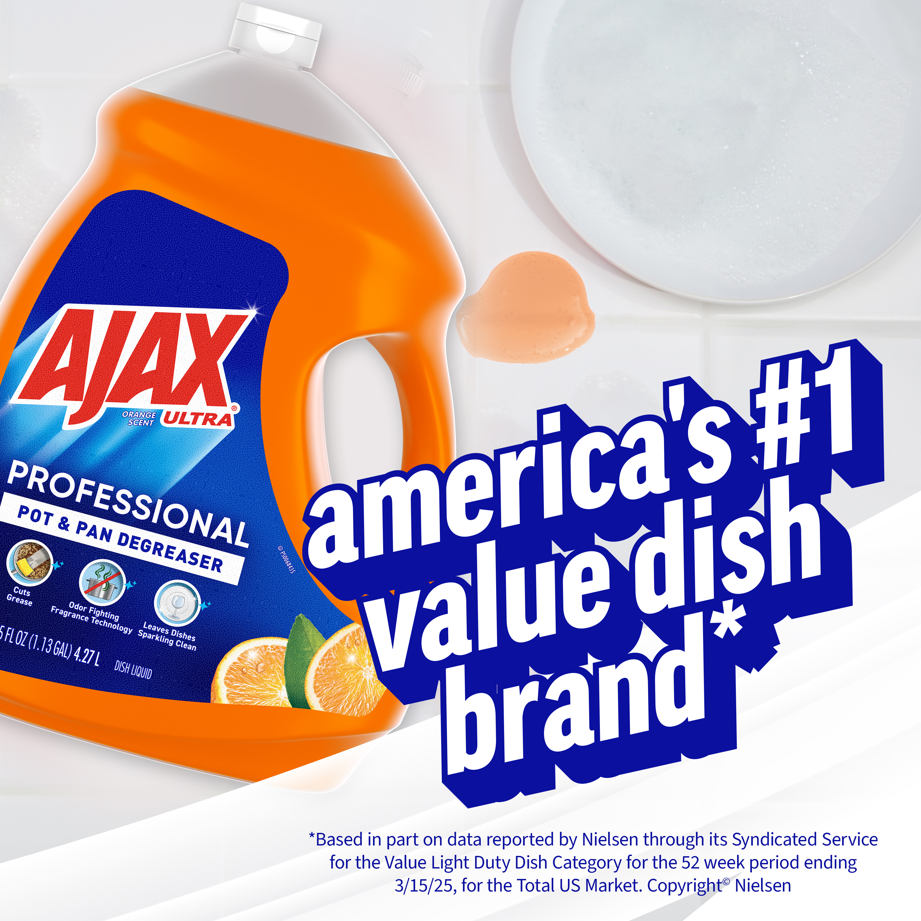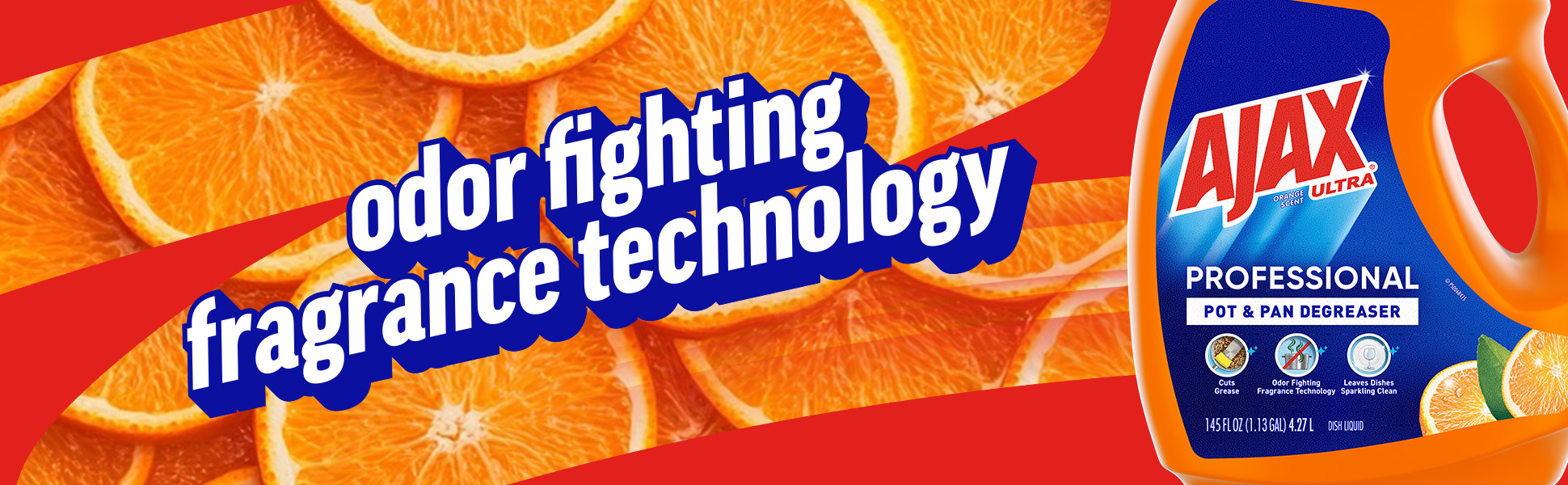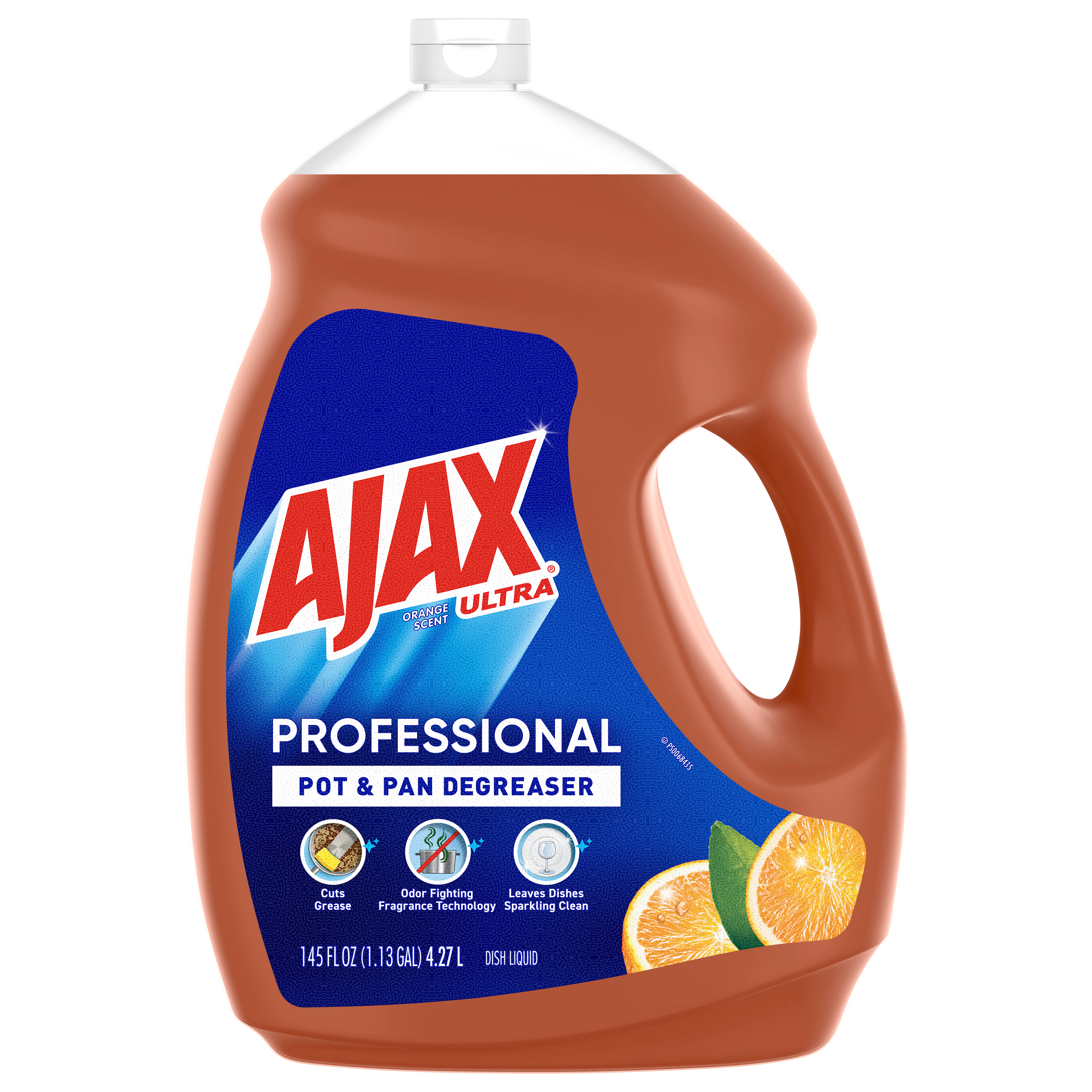 SKU 61034313 Consumer Unit - GTIN 00827854009368 Case - GTIN 10827854009365 Product Category Home Care Product Sub Category Dish Hand Product Equity (Brand) Ajax Product Sub Brand Ajax HD Product Title Ajax Ultra Professional Pot & Pan Degreaser Dish Liquid, Orange Scent - 145 Fluid Ounce eCommerce Copy- Long Description Bring the power of Ajax to your commercial kitchen Ajax Ultra Professional Pot & Pan Degreaser Dish Liquid works in three ways to clean dirty dishes: Cuts grease on dishes Odor-fighting fragrance technology Washes bacteria from hands* This professional size dish liquid easily dissolves stuck-on grease and leaves dishes sparkling clean. Plus, it provides a pleasant cleaning experience with the lively scent of oranges. Made with naturally inspired fragrances, 0% parabens and phosphates, and 100% biodegradable active ingredients †, this dish soap is designed for the everyday heroes in commercial kitchens. *When using as a hand soap to wash away bacteria from wet hands, scrub hands for 20 seconds and then rinse under clean running water. †OECD 301 B,C,D / OCDE 301 B,C,D Life is tough, but you're tougher! We understand that life isn’t easy. You work hard—heck, REALLY hard. You tackle big and small tough jobs, without looking for applause. That’s why we at Ajax recognize you, the everyday heroes, who step up at the end of a long day and get the dishes done. Because, let’s face it, at the end of the day a clean kitchen is a happy kitchen. By standing tall in the face of messes, you are an everyday hero. Leave the grime to us so you can get back to what really matters!