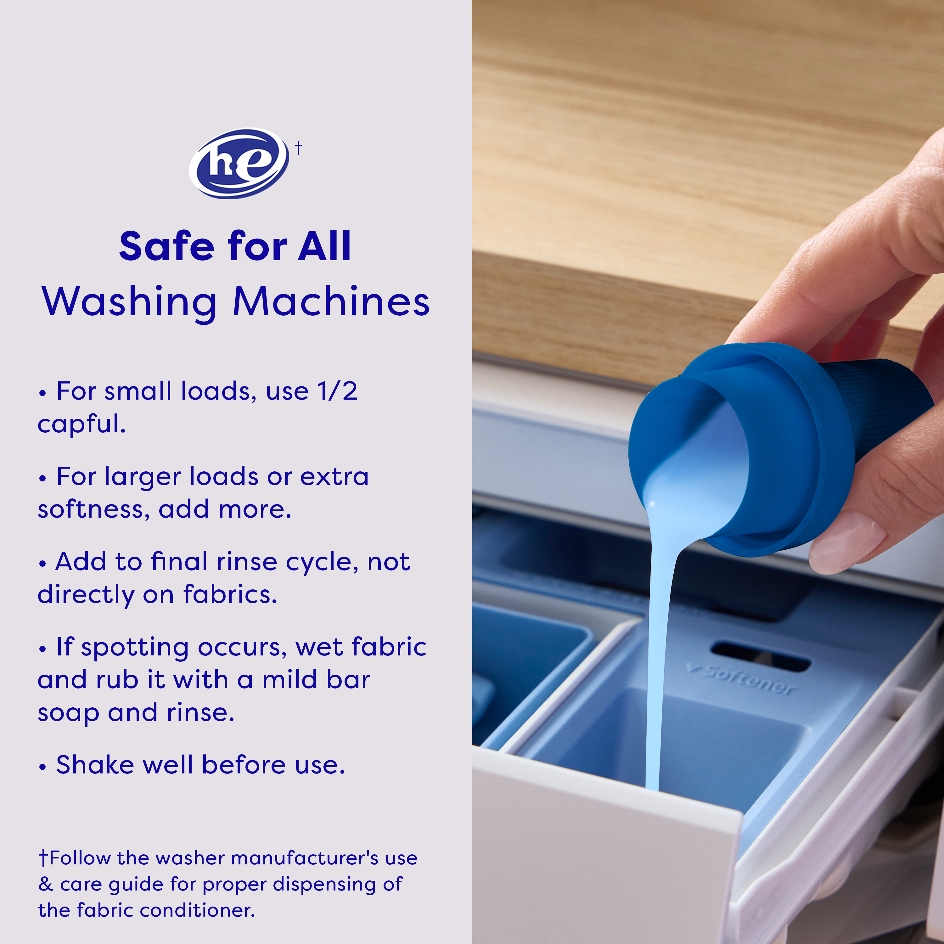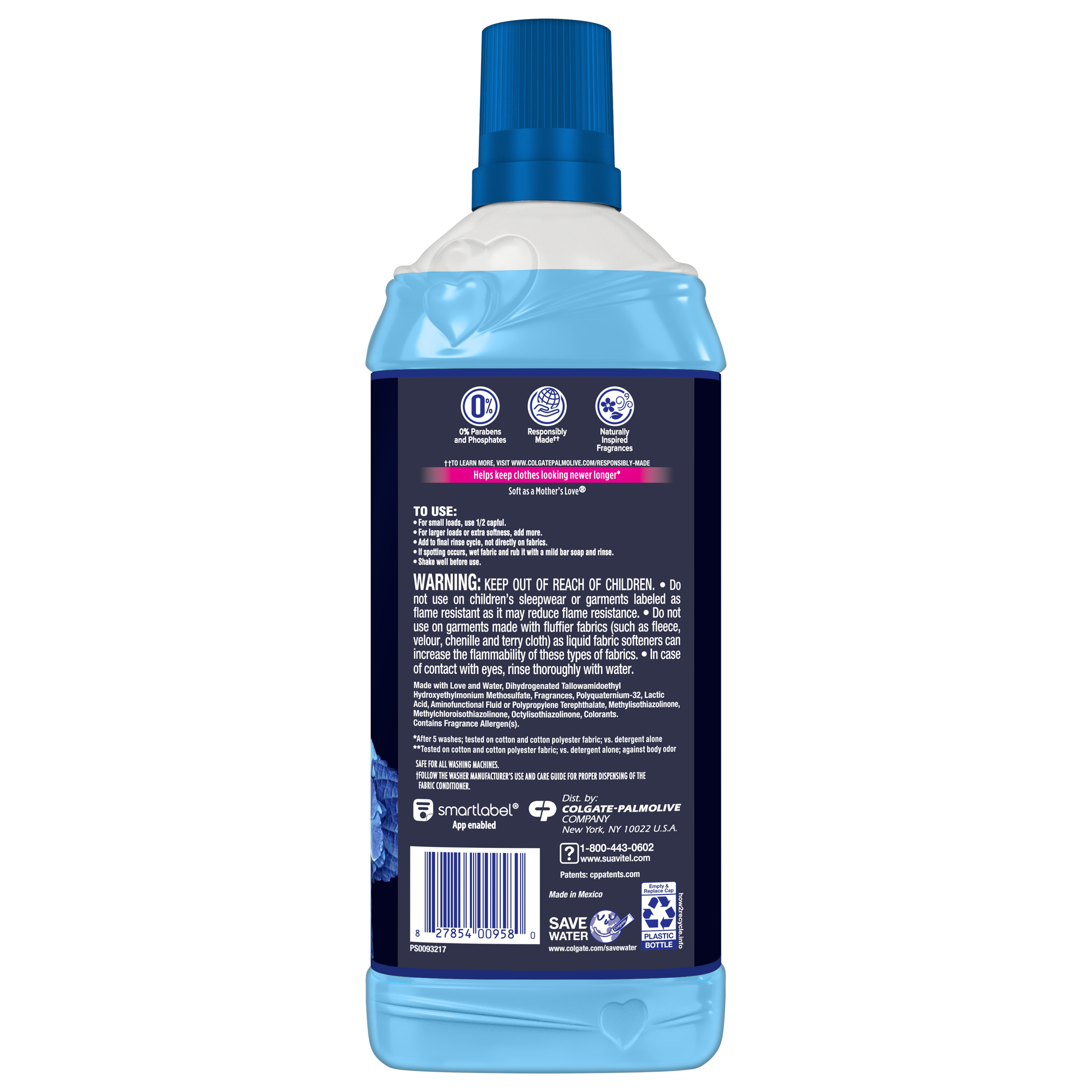 SKU 61034503 Consumer Unit - GTIN 00827854009580 Case - GTIN 10827854009587 Product Category Home Care Product Sub Category FC Liquids Product Equity (Brand) Suavitel Product Sub Brand Suavitel Cmplt Liq FC Product Title Suavitel Complete Liquid Fabric Softener, Fabric Conditioner, HE Compatible, 25 Small Loads, Field Flowers Scent, 25 fl oz Bottle Product Description Suavitel Complete Liquid Fabric Softener is the ideal solution for caring for your family’s clothes with ease. With fabric protection technology, this liquid fabric softener helps keep clothes looking newer longer* by providing color protection* and fewer wrinkles*. Enjoy irresistible softening and freshness in every load. Experience the crisp, clean scent of a blossoming garden with every wash, providing a special fresh scent of the outdoors. Our fabric conditioner fights odors** so your clothes stay fresh and pleasant-smelling. This complete fabric care formula helps with easier stain removal* so you can tackle tough messes on your family’s laundry. Suavitel Complete is soft as a mother’s love and is compatible with all types of washing machines, including HE models***. Contains 0% parabens and phosphates and includes naturally inspired fragrances. To use, fill the cap with the appropriate amount depending on your wash load. Add to the final rinse cycle, not directly on fabrics. If spotting occurs, wet fabric and rub it with a mild bar soap and rinse. Shake well before use. Upgrade your laundry routine with long-lasting freshness and trusted care. *After 5 washes; tested on cotton and cotton polyester fabric; vs. detergent alone **Tested on cotton and cotton polyester fabric; vs. detergent alone; against body odor ***Follow the washer manufacturer's use and care guide for proper dispensing of the fabric conditioner eCommerce Copy- Long Description Suavitel Complete is the ideal solution to caring for your clothes and your family's clothes with ease. Liquid fabric softener provides fabric protection benefits that help keep clothes looking newer longer (2). Suavitel Complete Field Flowers now offers a new formula providing you with the softening and freshness that you and your family love. Say goodbye to bad odors with Suavitel Complete Field Flowers. Our technology fights odors and helps with all day odor protection (1). Enjoy the confidence of fresh and pleasant-smelling clothes, and fewer wrinkles. Suavitel Complete with Stain-Shield technology ensures color protection, making your clothes look newer for longer (2). Suavitel Complete provides softness to fabric fibers, aligning them and preventing extensive wrinkle formation. Indulge in the irresistible softness and freshness that Suavitel Complete provides. Suavitel Complete Field Flowers helps prevent stains from sticking, tackling even the toughest stains with its Stain-Shield Technology; thereby helping your clothes look their best. Suavitel is compatible with all types of washing machines, including HE Washing Machines. You can trust Suavitel to deliver exceptional results without damaging your laundry appliances. Upgrade your laundry routine with Suavitel Complete Field Flowers. Enjoy the long-lasting freshness and all-day odor protection with a formula that helps your clothes look newer, longer (2). Suavitel Complete Field Flowers is here to provide the ultimate care and freshness you deserve. (1) Tested on cotton and cotton polyester fabric; vs. detergent alone; against body odor (2) After 5 washes; tested on cotton and cotton-polyester fabric; vs. detergent alone (3) Follow the washer manufacturer's use and care guide for proper dispensing of the fabric conditioner Bullet 1 One 25 fl oz bottle of Suavitel Complete Fabric Conditioner, Field Flowers Scent Bullet 2 Provides enough for 25 small loads making it ideal for regular household laundry needs and convenient for frequent washing Bullet 3 With fabric protection technology that helps keep clothes looking newer longer so your garments retain their color vibrancy and overall appearance after repeated washes Bullet 4 Provides color protection* and fewer wrinkles* for a polished and cared-for look every time Bullet 5 This complete fabric care formula helps with easier stain removal* so you can tackle tough messes on your family’s laundry Bullet 6 Our fabric conditioner fights odors** so your clothes stay fresh and pleasant-smelling Bullet 7 Contains 0% parabens and phosphates and includes naturally inspired fragrances and provides irresistible softening and freshness Bullet 8 Compatible with all types of washing machines including HE models*** for easy integration into your laundry routine Walmart RPC 1398092439 Walmart URL (Computed) https://www.walmart.com/ip/a/1398092439