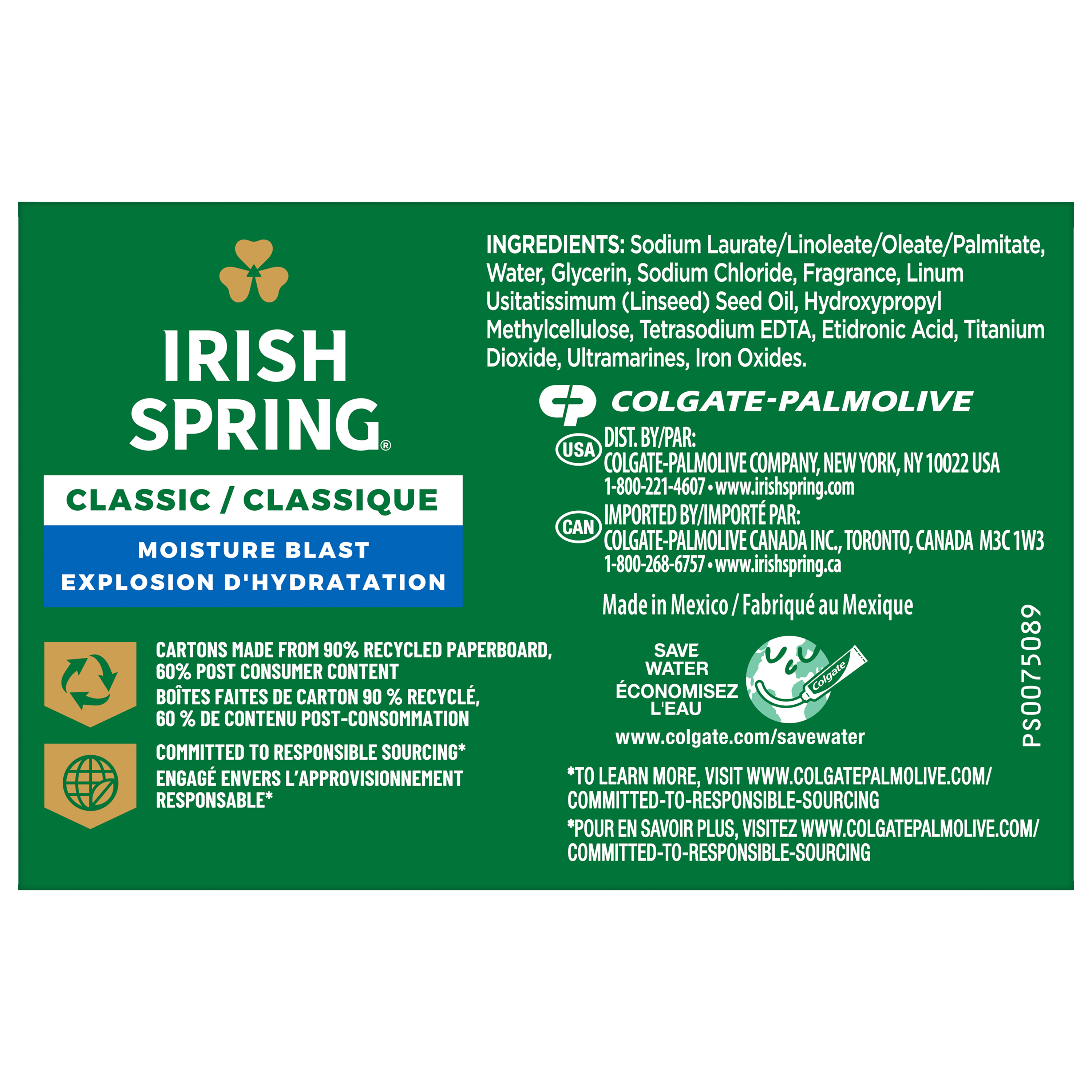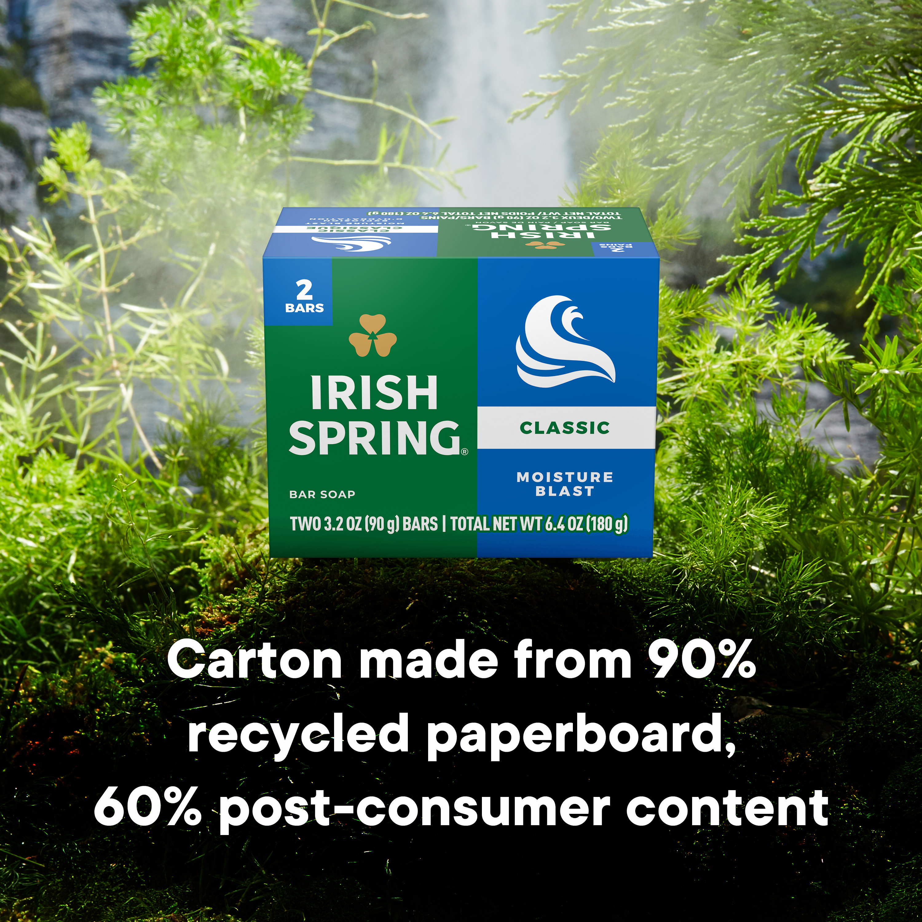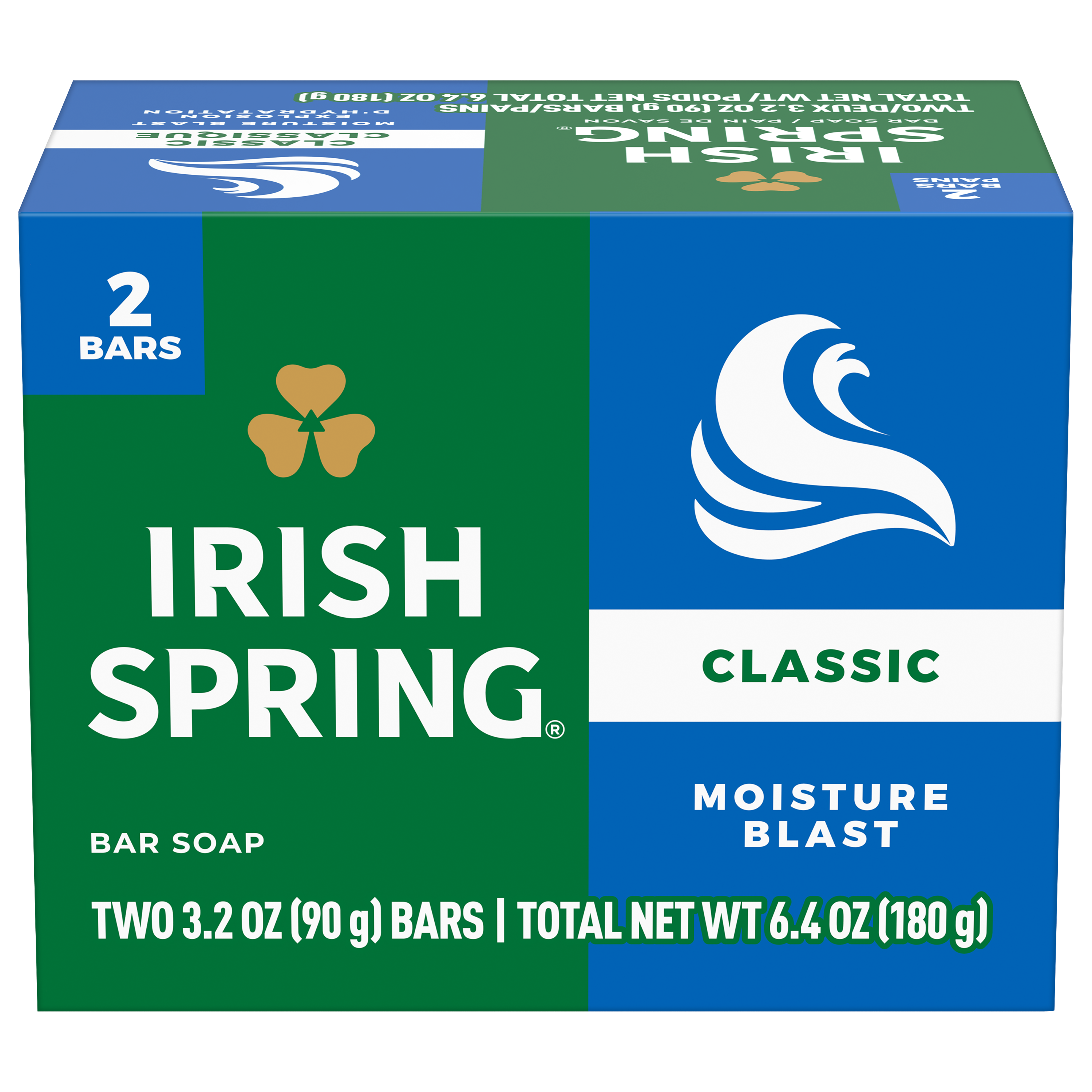 SKU 61036498 Consumer Unit - GTIN 00035000141538 Case - GTIN 10827854010774 Product Category Personal Care Product Sub Category Bar Soap Product Equity (Brand) Irish Spring Product Sub Brand Irish Spring BS Product Title Irish Spring Moisture Blast Deodorant Bar Soap for Men, 12 Hour Fresh Deodorant Soap, 3.2 oz Bar (2 Pack) Product Description Irish Spring Moisture Blast Bar Soap deodorant bar soap for men is made with a 98% naturally derived formula that keeps you fresh for 12 hours and is suitable for all skin types. Irish Spring Moisture Blast Bar Soap can be used as a hand soap or face wash. It is also paraben, phthalate, and gluten free. The carton is made from 90% recycled paperboard, 60% post-consumer content. Add some adventure to your everyday life with the entire Irish Spring line of body washes and bar soaps for men. eCommerce Copy- Long Description Irish Spring Classic Moisture Blast Deodorant Bar Soap, Smell fresh all day with Irish Spring Bar Soap. Irish Spring Classic Moisture Blast bar soap provides deep moisturization and is made with a 98% naturally derived formula. Count on Irish Spring Bar Soap to leave your skin feeling clean — our bar soap for men keeps you fresh for 12 hours. Fresh Look, Great Smell Bar Soap for Body and Hands Irish Spring Bar Soap has a sudsy lather that washes away bacteria, so you can use it as a hand soap bar and keep the fresh smell going all day long. Plus, this soap bar is mild for skin. It’s paraben, phthalate and gluten free. Feel good while washing your hands and body with Irish Spring. Irish Spring Bar Soap Pack Never go without smelling your best. The Irish Spring bar soap pack is conveniently packaged so that you can stock up. Keep some in your bathroom, in the pantry, give some to your friends and keep the good smells going. Bullet 1 What’s Included: Two 3.2 oz soap bars of Irish Spring Moisture Blast Deodorant Bar Soap for Men Bullet 2 Deodorant Soap: 12 hour fresh deodorant soap that leaves you feeling clean Bullet 3 Versatile Use: Irish Spring bar soap has a sudsy lather and can be used as a hand soap or a face wash Bullet 4 Natural Ingredients: 98% naturally derived formula, gluten free, paraben free, and formulated without phthalates Bullet 5 Sustainably Packaged: Carton made from 90% recycled paperboard, 60% post-consumer content Bullet 6 Refreshing Scent: That cool outdoor Freshness? We’re bringing it to the palm of your hand Dollar Tree RPC 984564 Family Dollar RPC 2095676