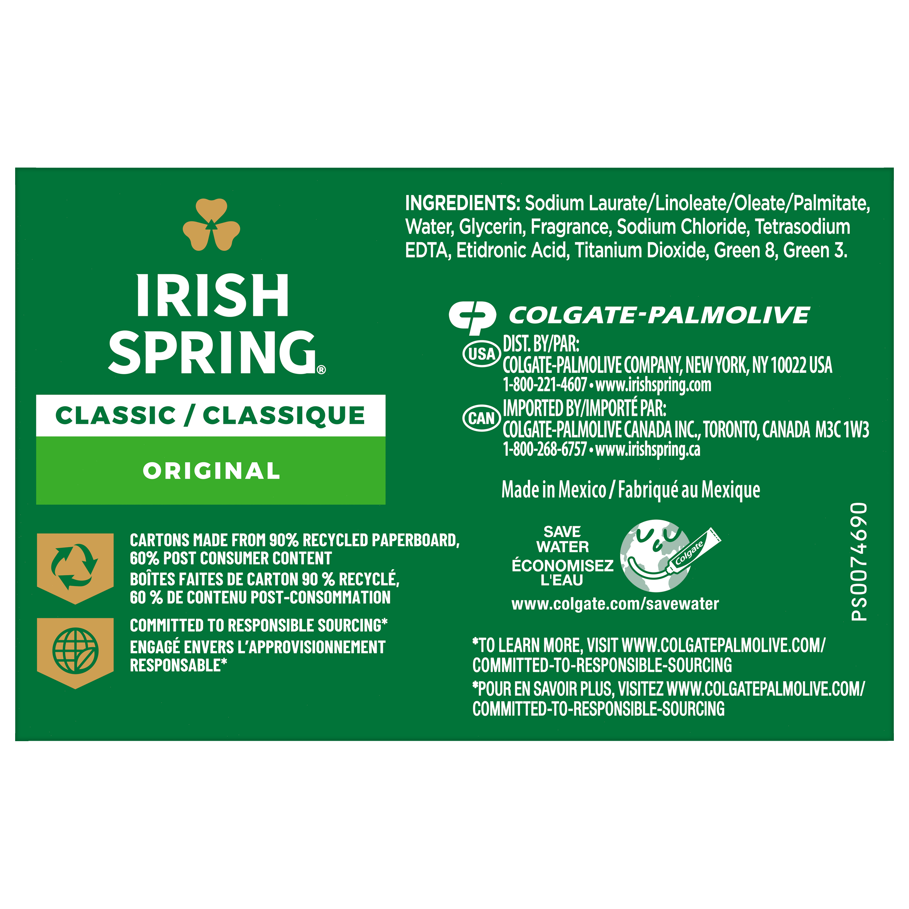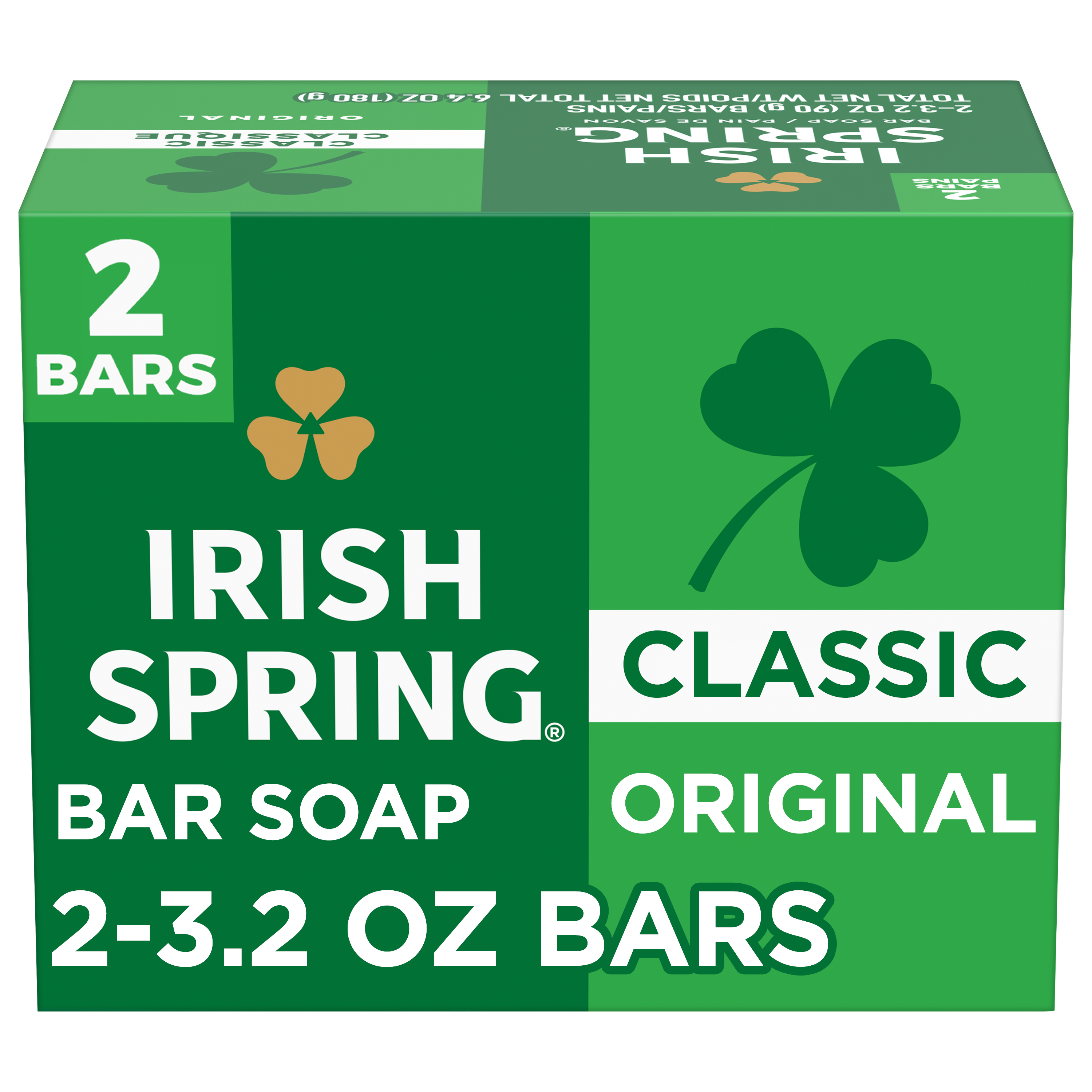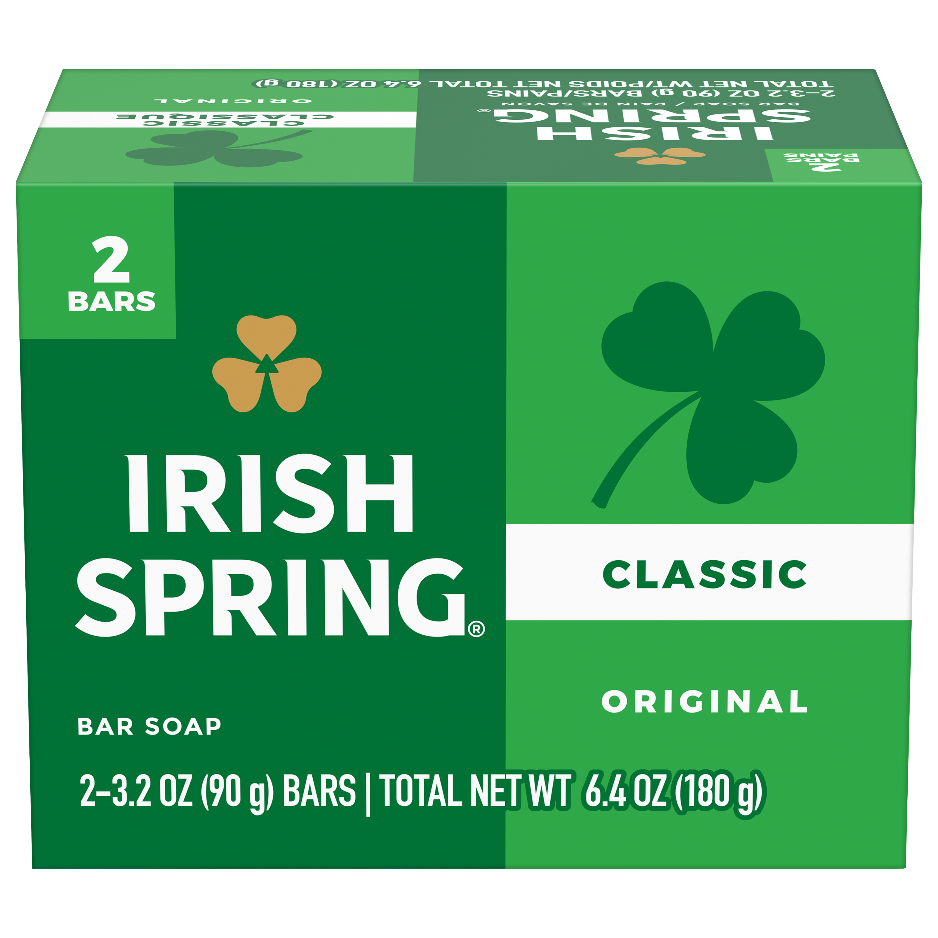 SKU 61036499 Consumer Unit - GTIN 00035000144249 Case - GTIN 10827854010781 Product Category Personal Care Product Sub Category Bar Soap Product Equity (Brand) Irish Spring Product Sub Brand Irish Spring BS Product Title Irish Spring Original Deodorant Bar Soap for Men, With Flaxseed Oil, 12 Hour Fresh Deodorant Soap, 3.2 oz Bar (2 Pack) Product Description Count on Irish Spring Original Bar Soap to leave your skin feeling clean and fresh. Our deodorant bar soap for men is made with a 98% naturally derived formula that keeps you fresh for 12 hours and is suitable for all skin types. Irish Spring Original Bar Soap can be used as a hand soap or face wash. This bar soap is suitable for all skin types, including normal, oily, and dry skin, ensuring an effective cleanse. It is also paraben, phthalate, and gluten free and has flaxseed oil. Add some adventure to your everyday life with the entire Irish Spring line of body washes and bar soaps for men. eCommerce Copy- Long Description Irish Spring Classic Original Deodorant Bar Soap, Smell fresh all day with Irish Spring Bar Soap. Irish Spring Classic Original bar soap provides deep moisturization and is made with a 98% naturally derived formula. Count on Irish Spring Bar Soap to leave your skin feeling clean — our bar soap for men keeps you fresh for 12 hours. Fresh Look, Great Smell Bar Soap for Body and Hands Irish Spring Bar Soap has a sudsy lather that washes away bacteria, so you can use it as a hand soap bar and keep the fresh smell going all day long. Plus, this soap bar is mild for skin. It’s paraben, phthalate and gluten free. Feel good while washing your hands and body with Irish Spring. Irish Spring Bar Soap Pack Never go without smelling your best. The Irish Spring bar soap pack is conveniently packaged so that you can stock up. Keep some in your bathroom, in the pantry, give some to your friends and keep the good smells going. Bullet 1 What’s Included: Two 3.2 oz soap bars of Irish Spring Original Deodorant Bar Soap for Men Bullet 2 Deodorant Soap: Our bar soap leaves your skin feeling clean Bullet 3 Versatile Use: Irish Spring bar soap can be used as a hand soap or a face wash Bullet 4 Infused with Flaxseed Oil: This bar soap is crafted with flaxseed oil Bullet 5 Natural Ingredients: 98% naturally derived formula, gluten free, paraben free, and formulated without phthalates Bullet 6 Sustainably Packaged: Carton made from 90% recycled paperboard, 60% post-consumer content Bullet 7 Refreshing Scent: That cool outdoor Freshness? We’re bringing it to the palm of your hand Walmart RPC 12443200 Walmart URL (Computed) https://www.walmart.com/ip/a/12443200 Dollar Tree RPC 162836