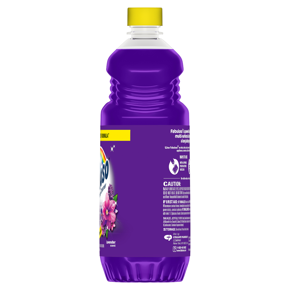 SKU 61037883 Consumer Unit - GTIN 00827854010357 Case - GTIN 10827854010354 Product Category Home Care Product Sub Category Cleaners Liquid / Gel Product Equity (Brand) Fabuloso Product Sub Brand Fabuloso Liq Cln Product Title Fabuloso 2X Multi-Purpose Cleaner, No Rinse Floor Cleaner, Long-Lasting Freshness, Lavender Scent, 56 fl oz Product Description Discover the exceptional cleaning power and long-lasting freshness of Fabuloso 2X Multi-Purpose Cleaner with Lavender scent. This cleaner features the soothing essence of lavender blended with citrus and mint, complemented by a floral-fruity heart of jasmine and raspberry, and finished with warm amber, sandalwood, and vanilla undertones, leaving your home feeling fresh and revitalized. Fabuloso 2X concentrated formula provides 2X more uses in the same bottle compared to non-concentrated Fabuloso Original. The no rinse floor cleaner provides long-lasting freshness and is safe for everyday cleaning on floors, sinks, toilets, tubs, showers, sealed wood, appliances, counters, walls, doorknobs, and furniture. Ideal as a kitchen cleaner and bathroom cleaner, it keeps every room smelling fresh long after you clean. For best results, follow dosing instructions by mixing 1/8 cup of Fabuloso to a bucket of water for mopping, or use undiluted on a sponge for general surface cleaning and spot treatment, giving you flexibility for all your cleaning needs. Keep in a cool, dry place and do not freeze; if the product freezes, simply defrost and shake well before use to restore optimal cleaning performance. Experience the confidence of a powerful, reliable cleaner that transforms your entire home with every use, backed by the trusted Fabuloso brand families have depended on for generations. eCommerce Copy- Long Description Fabuloso® Multi-Purpose Cleaner, 2X Concentrated Formula, Lavender Scent Fabuloso® Multi-Purpose Cleaner, 2X Concentrated Formula in Lavender Scent transforms your home with a fresh scent that lasts. Bring the fragrance of lavender indoors, and experience a warm, joyful feeling your friends and family will love. Fabuloso®’s 2X Concentrated Formula now provides 2X more active ingredients compared to non-concentrated Fabuloso Original, giving you 2X the dosage in the same bottle. Every colorful pour from the easy-pour bottle delivers a long-lasting, unmistakable freshness and leaves your home bright and clean. Use Fabuloso® Multi-Purpose Cleaner, on sinks, toilets, tubs, showers, kitchen and bathroom floors, sealed wood surfaces, appliances, counters, windows, mirrors, walls, doorknobs and furniture, and fill every room in your home with joy. Uplifting fragrances. Clean surfaces. Irresistible joy. Life isn’t always easy, but cleaning it up sure can be. Fabuloso® combines cleaning power with fresh scents that fill your home with joy, to make it a welcoming place no matter how hard your day. Fabuloso®’s 2X Concentrated Formula provides 2X more uses in the same bottle compared to non-concentrated Fabuloso Original. From the kitchen to the bathroom and beyond, Fabuloso® Multi-Purpose, Cleaner 2X Concentrated has a wide variety of long-lasting fragrances that deliver hope for a better tomorrow. Try all of our uplifting scents: Refreshing Lemon, Passion of Fruits, Citrus & Fruits with Baking Soda, Bleach Alternative† Spring Fresh, Tropical Spring, and Orange Scent with Baking Soda. † Bleach-free option with 20% more active ingredients vs other Fabuloso 2X Concentrated products Bullet 1 Includes one 56 fl oz bottle of Fabuloso 2X Multi-Purpose Cleaner, Lavender Scent Bullet 2 Enjoy the fresh lavender scent of Fabuloso blended with citrus, mint, jasmine, and raspberry, finished with warm amber, sandalwood, and vanilla Bullet 3 Fabuloso 2X concentrated formula provides 2X more uses in the same bottle compared to non-concentrated Fabuloso Original Bullet 4 This all-purpose cleaner can be used on floors, sinks, toilets, tubs, showers, sealed wood, appliances, counters, walls, doorknobs, and furniture Bullet 5 Fabuloso is ready to use: add 1/8 cup to a bucket of water for mopping, or use undiluted on a sponge for general surface cleaning and spot treatment Bullet 6 Keep Fabuloso in a cool, dry place and do not freeze; if the product freezes, simply defrost and shake well before use Bullet 7 Fabuloso is the perfect cleaning product for families and households delivering the trusted clean you love Bullet 8 Also available in: Refreshing Lemon Scent, Passion of Fruits Scent, Citrus & Fruits with Baking Soda Scent, Bleach Alternative† Spring Fresh Scent Scent, Tropical Spring Scent, and Orange Scent with Baking Soda † Bleach-free option with 20% more active ingredients vs other Fabuloso® 2X Concentrated Liquid Multi-Purpose Cleaning Products Bullet 9 Fabuloso® 2X Concentrated Liquid Multi-Purpose Cleaner comes in a variety of convenient sizes: 16.9 oz, 28 oz, 33.8 oz, 56 oz, 128 oz, 169 oz, 210 oz Amazon RPC B0BYLN716Y AMZ URL https://www.amazon.com/dp/B0BYLN716Y Target RPC 88667984 Target URL https://www.target.com/p/a/-/A-88667984
