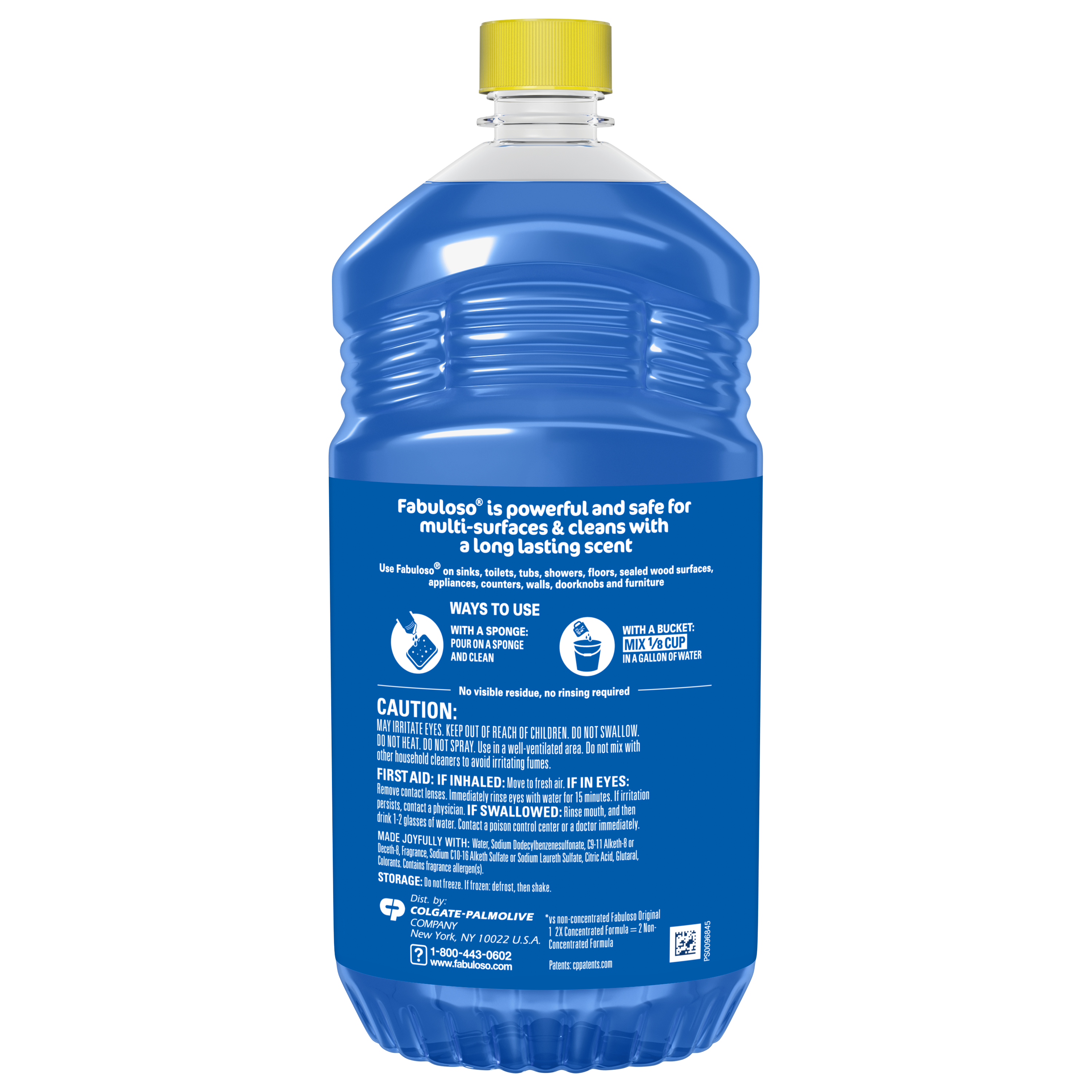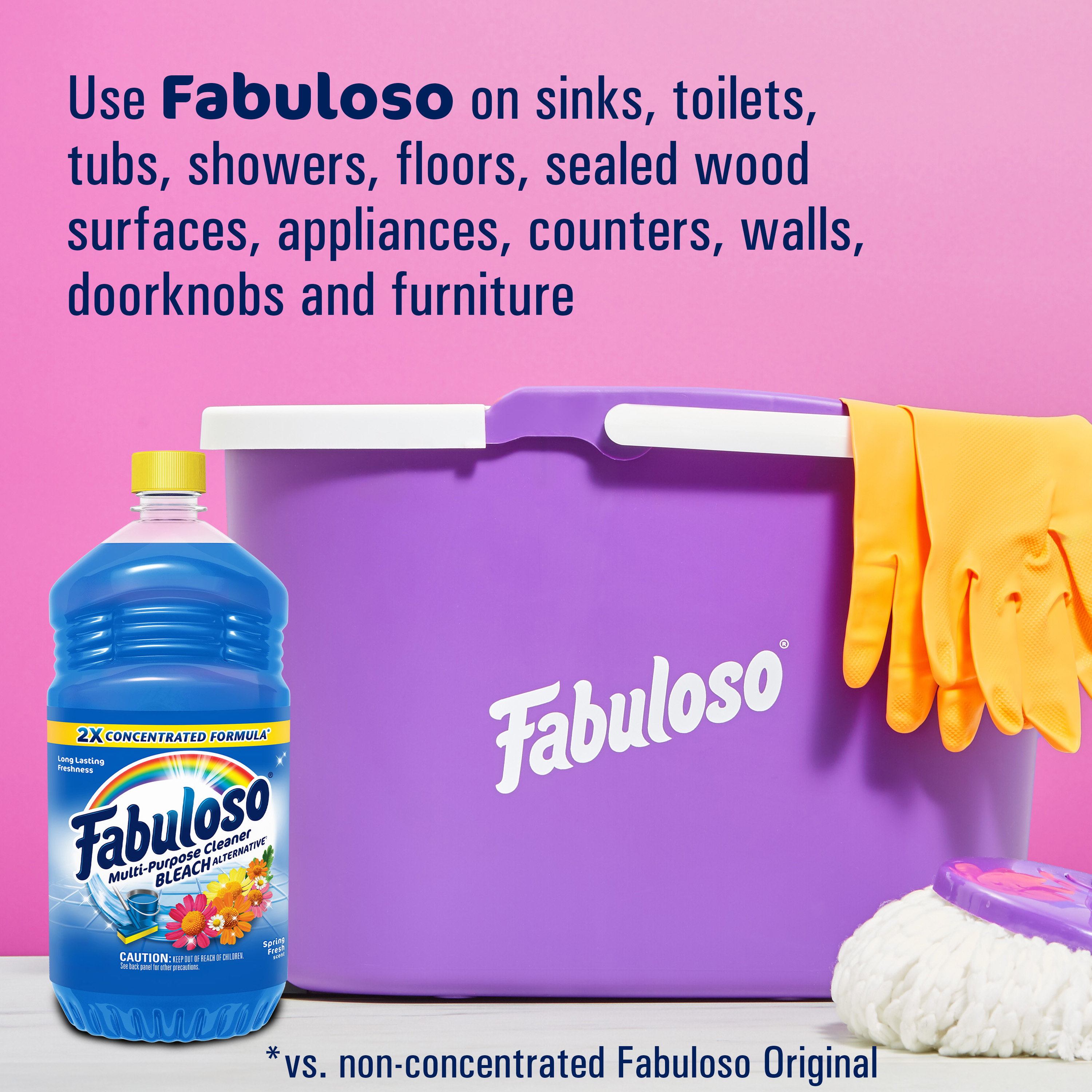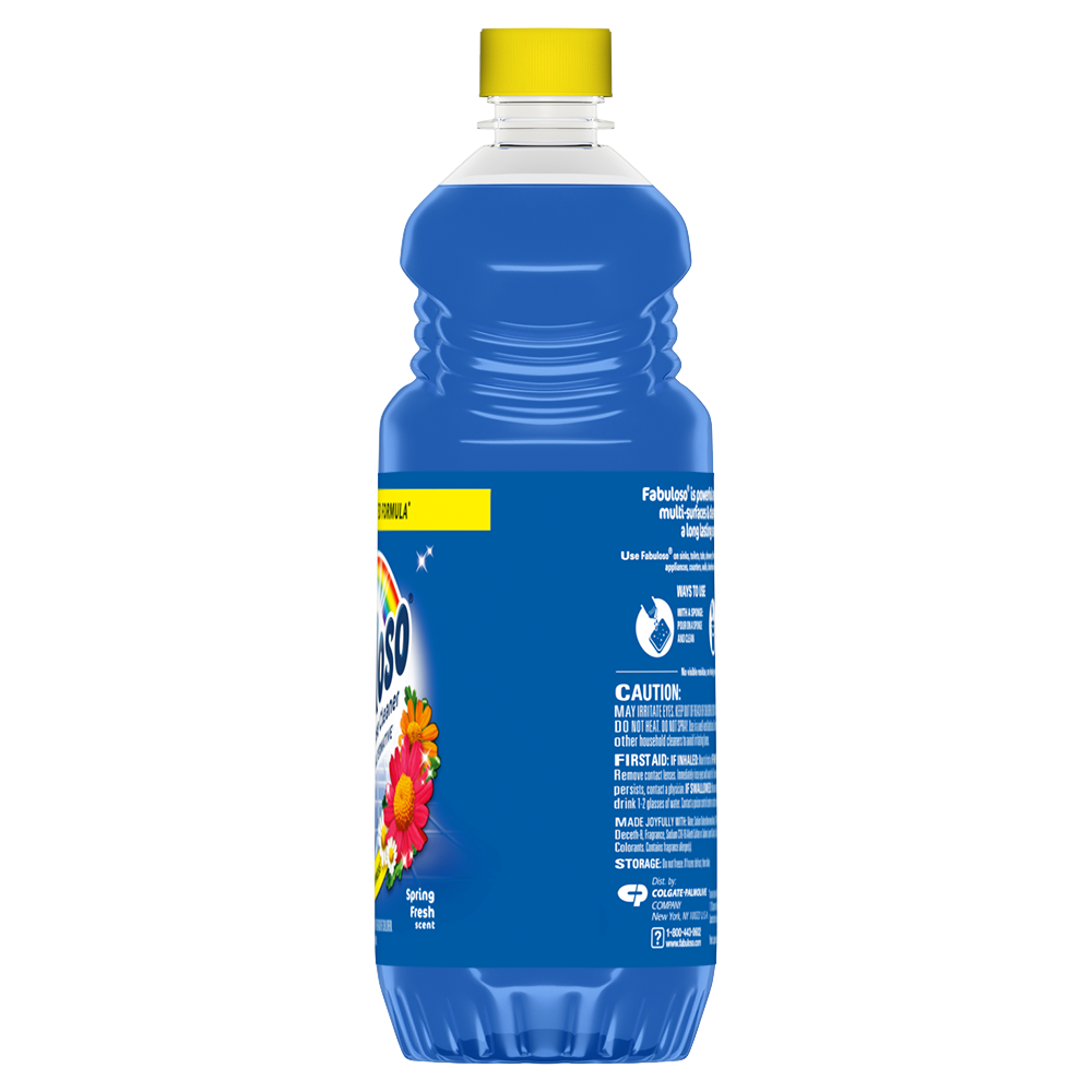 SKU 61037886 Consumer Unit - GTIN 00827854010388 Case - GTIN 10827854010385 Product Category Home Care Product Sub Category Cleaners Liquid / Gel Product Equity (Brand) Fabuloso Product Sub Brand Fabuloso Liq Cln Product Title Fabuloso Multi-Purpose Cleaner, 2X Concentrated Formula, Spring Fresh Scent, 56 oz Product Description Fabuloso 2X Multi-Purpose Cleaner is the perfect solution for anyone looking for an effective way to keep their home clean and smelling great. Whether used as a bathroom cleaner, kitchen cleaner, or floor cleaner, the long-lasting spring fresh scent will fill your home with joy. Our multi-purpose cleaner cuts through grease, grime, and dirt. Its easy-pour bottle delivers a colorful and satisfying pour every time. We understand that life isn't always easy, but cleaning it up can be with Fabuloso multi-purpose surface cleaner. Our 2X concentrated formula provides 2x more uses and 2x more active ingredients vs our non-concentrated Fabuloso Original. It also uses 50% less plastic by following dosing instructions and getting twice as many uses out of one bottle vs. the same size of Fabuloso Original. It's important to use Fabuloso cleaning products safely, please follow the instructions on the label. Mix 1/8 cup in a gallon of water or pour on a sponge and clean. eCommerce Copy- Long Description Fabuloso® Multi-Purpose Cleaner, 2X Concentrated Formula, Bleach Alternative† Spring Fresh Fabuloso® Multi-Purpose Cleaner, 2X Concentrated Formula in Bleach Alternative† Spring Fresh Scent transforms your home with a fresh scent that lasts. Bring the fragrance of lavender indoors, and experience a warm, joyful feeling your friends and family will love. Fabuloso®’s 2X Concentrated Formula now provides 2X more active ingredients compared to non-concentrated Fabuloso Original, giving you 2X the dosage in the same bottle. Every colorful pour from the easy-pour bottle delivers a long-lasting, unmistakable freshness and leaves your home bright and clean. Use Fabuloso® Multi-Purpose Cleaner, on sinks, toilets, tubs, showers, kitchen and bathroom floors, sealed wood surfaces, appliances, counters, windows, mirrors, walls, doorknobs and furniture, and fill every room in your home with joy. Uplifting fragrances. Clean surfaces. Irresistible joy. Life isn’t always easy, but cleaning it up sure can be. Fabuloso® combines cleaning power with fresh scents that fill your home with joy, to make it a welcoming place no matter how hard your day. Fabuloso®’s 2X Concentrated Formula provides 2X more uses in the same bottle compared to non-concentrated Fabuloso Original. From the kitchen to the bathroom and beyond, Fabuloso® Multi-Purpose, Cleaner 2X Concentrated has a wide variety of long-lasting fragrances that deliver hope for a better tomorrow. Try all of our uplifting scents: Lavender, Refreshing Lemon, Citrus & Fruits with Baking Soda, Tropical Spring, Passion of Fruits, and Orange Scent with Baking Soda. † Bleach-free option with 20% more active ingredients vs other Fabuloso 2X Concentrated products Shared Moments of Joy All Over the World Our story begins in Venezuela, circa 1980. Cleaning products lacked fragrance and distinction. But families wanted lasting scents that kept their homes fresh and clean for hours. Enter the bold colors and joyful fragrances of Fabuloso® ! 16 years later, families across America also got to experience the joy: we became a household staple thanks to our rainbow of colors and playful, distinctive scents. Today, across the world, we’re more than cleaning products. We’re a catalyst for joy. Bullet 1 2X concentrated formula provides 2X more active ingredients compared to non-concentrated Fabuloso Original Bullet 2 Multi-purpose cleaner for a wide range of surfaces, from floors to furniture to appliances Bullet 3 Mix 1/8 cup in a gallon of water or pour on a sponge and clean Bullet 4 Spring fresh scent provides long-lasting freshness Bullet 5 Uses 50% less plastic by following dosing instructions to get twice as many uses out of one bottle v. the same size of Fabuloso Original Bullet 8 Also available in: Lavender Scent, Refreshing Lemon Scent, Passion of Fruits Scent, Citrus & Fruits with Baking Soda Scent, Tropical Spring Scent, and Orange Scent with Baking Soda † Bleach-free option with 20% more active ingredients vs other Fabuloso® 2X Concentrated Liquid Multi-Purpose Cleaning Products Bullet 9 Fabuloso® 2X Concentrated Liquid Multi-Purpose Cleaner comes in a variety of convenient sizes: 16.9 oz, 28 oz, 33.8 oz, 56 oz, 128 oz, 169 oz, 210 oz Amazon RPC B0BYLQ7BWW AMZ URL https://www.amazon.com/dp/B0BYLQ7BWW Target RPC 88667985 Target URL https://www.target.com/p/a/-/A-88667985