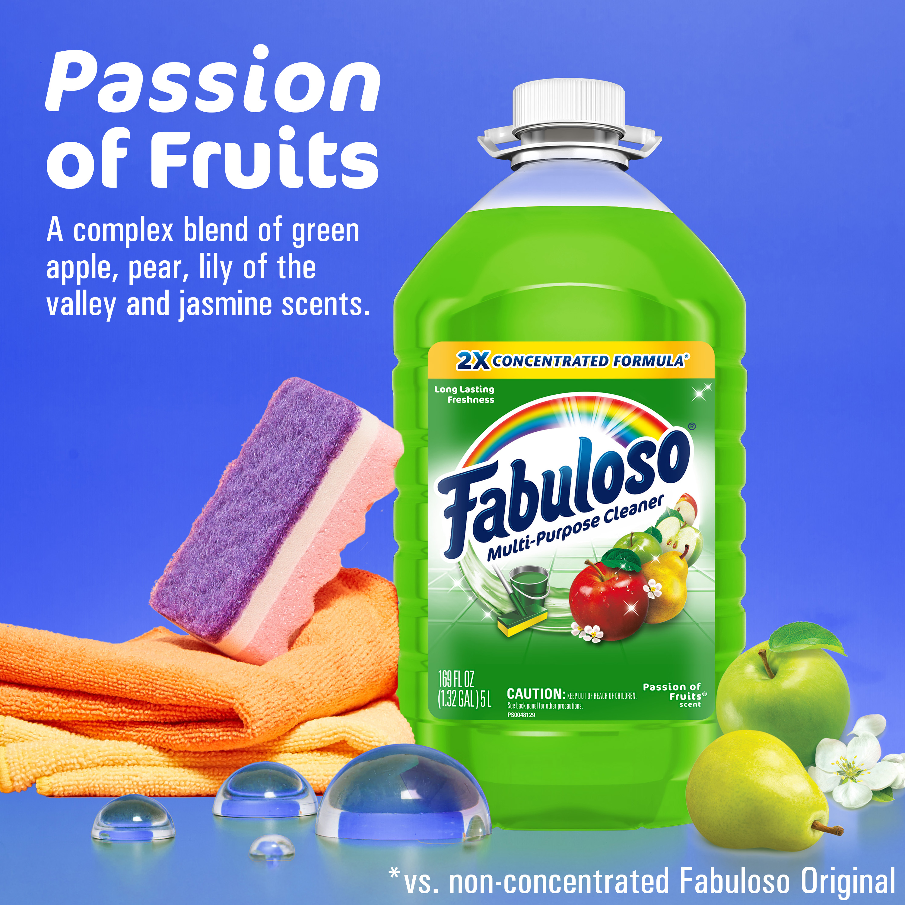 SKU 61037887 Consumer Unit - GTIN 00827854010395 Case - GTIN 10827854010392 Product Category Home Care Product Sub Category Cleaners Liquid / Gel Product Equity (Brand) Fabuloso Product Sub Brand Fabuloso Liq Cln Product Title Fabuloso Multi-Purpose Cleaner, 2X Concentrated Formula, Passions of Fruit Scent, 169 oz (3 ct) Product Description Fabuloso 2x Multi-Purpose Cleaner is the perfect solution for anyone looking for an effective way to keep their home clean and smelling great. Whether used as a bathroom cleaner, kitchen cleaner, or floor cleaner, the long-lasting passions of fruit scent will fill your home with joy. Our multi-purpose cleaner cuts through grease, grime, and dirt. Its easy-pour bottle delivers a colorful and satisfying pour every time. We understand that life isn't always easy, but cleaning it up can be with Fabuloso multi-purpose surface cleaner. Our 2X concentrated formula provides 2x more uses and 2x more active ingredients vs our non-concentrated Fabuloso Original. It also uses 50% less plastic by following dosing instructions and getting twice as many uses out of one bottle vs. the same size of Fabuloso Original. It's important to use Fabuloso cleaning products safely, please follow the instructions on the label. Mix 1/8 cup in a gallon of water or pour on a sponge and clean. eCommerce Copy- Long Description Fabuloso® Multi-Purpose Cleaner, 2X Concentrated Formula, Passion of Fruits Scent Fabuloso® Multi-Purpose Cleaner, 2X Concentrated Formula in Passion of Fruits Scent transforms your home with a fresh scent that lasts. Bring the fragrance of lavender indoors, and experience a warm, joyful feeling your friends and family will love. Fabuloso®’s 2X Concentrated Formula now provides 2X more active ingredients compared to non-concentrated Fabuloso Original, giving you 2X the dosage in the same bottle. Every colorful pour from the easy-pour bottle delivers a long-lasting, unmistakable freshness and leaves your home bright and clean. Use Fabuloso® Multi-Purpose Cleaner, on sinks, toilets, tubs, showers, kitchen and bathroom floors, sealed wood surfaces, appliances, counters, windows, mirrors, walls, doorknobs and furniture, and fill every room in your home with joy. Uplifting fragrances. Clean surfaces. Irresistible joy. Life isn’t always easy, but cleaning it up sure can be. Fabuloso® combines cleaning power with fresh scents that fill your home with joy, to make it a welcoming place no matter how hard your day. Fabuloso®’s 2X Concentrated Formula provides 2X more uses in the same bottle compared to non-concentrated Fabuloso Original. From the kitchen to the bathroom and beyond, Fabuloso® Multi-Purpose, Cleaner 2X Concentrated has a wide variety of long-lasting fragrances that deliver hope for a better tomorrow. Try all of our uplifting scents: Lavender, Refreshing Lemon, Citrus & Fruits with Baking Soda, Bleach Alternative† Spring Fresh, Tropical Spring, and Orange Scent with Baking Soda. † Bleach-free option with 20% more active ingredients vs other Fabuloso 2X Concentrated products Bullet 1 2X concentrated formula provides 2X more active ingredients compared to non-concentrated Fabuloso Original Bullet 2 Multi-purpose cleaner for a wide range of surfaces, from floors to furniture to appliances Bullet 3 Mix 1/8 cup in a gallon of water or pour on a sponge and clean Bullet 4 Passions of fruit scent provides long-lasting freshness Bullet 5 Uses 50% less plastic by following dosing instructions to get twice as many uses out of one bottle v. the same size of Fabuloso Original Bullet 8 Also available in: Lavender Scent, Refreshing Lemon Scent, Citrus & Fruits with Baking Soda Scent, Bleach Alternative† Spring Fresh Scent Scent, Tropical Spring Scent, and Orange Scent with Baking Soda † Bleach-free option with 20% more active ingredients vs other Fabuloso® 2X Concentrated Liquid Multi-Purpose Cleaning Products Bullet 9 Fabuloso® 2X Concentrated Liquid Multi-Purpose Cleaner comes in a variety of convenient sizes: 16.9 oz, 28 oz, 33.8 oz, 56 oz, 128 oz, 169 oz, 210 oz Walmart RPC 13534717012 Walmart URL (Computed) https://www.walmart.com/ip/a/13534717012