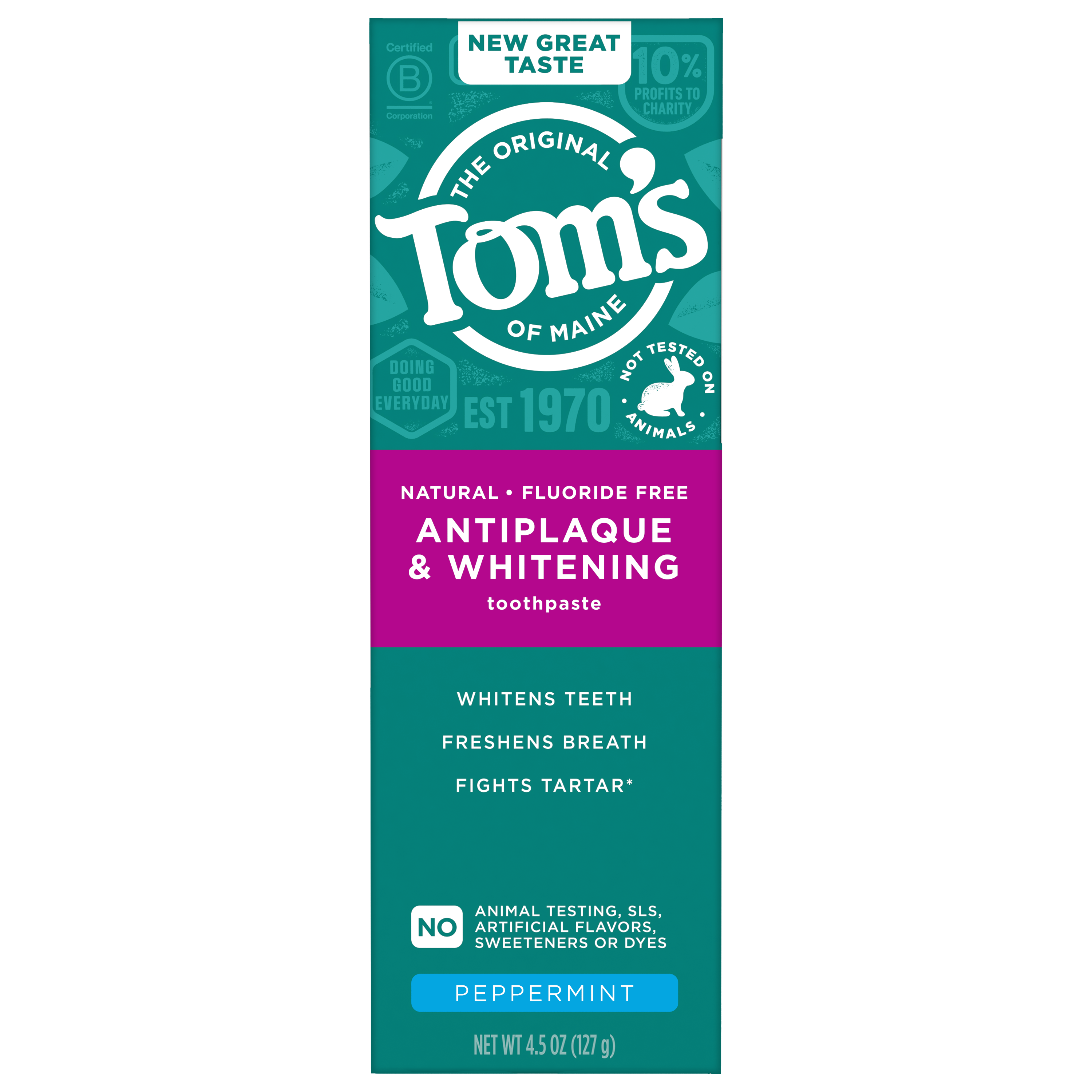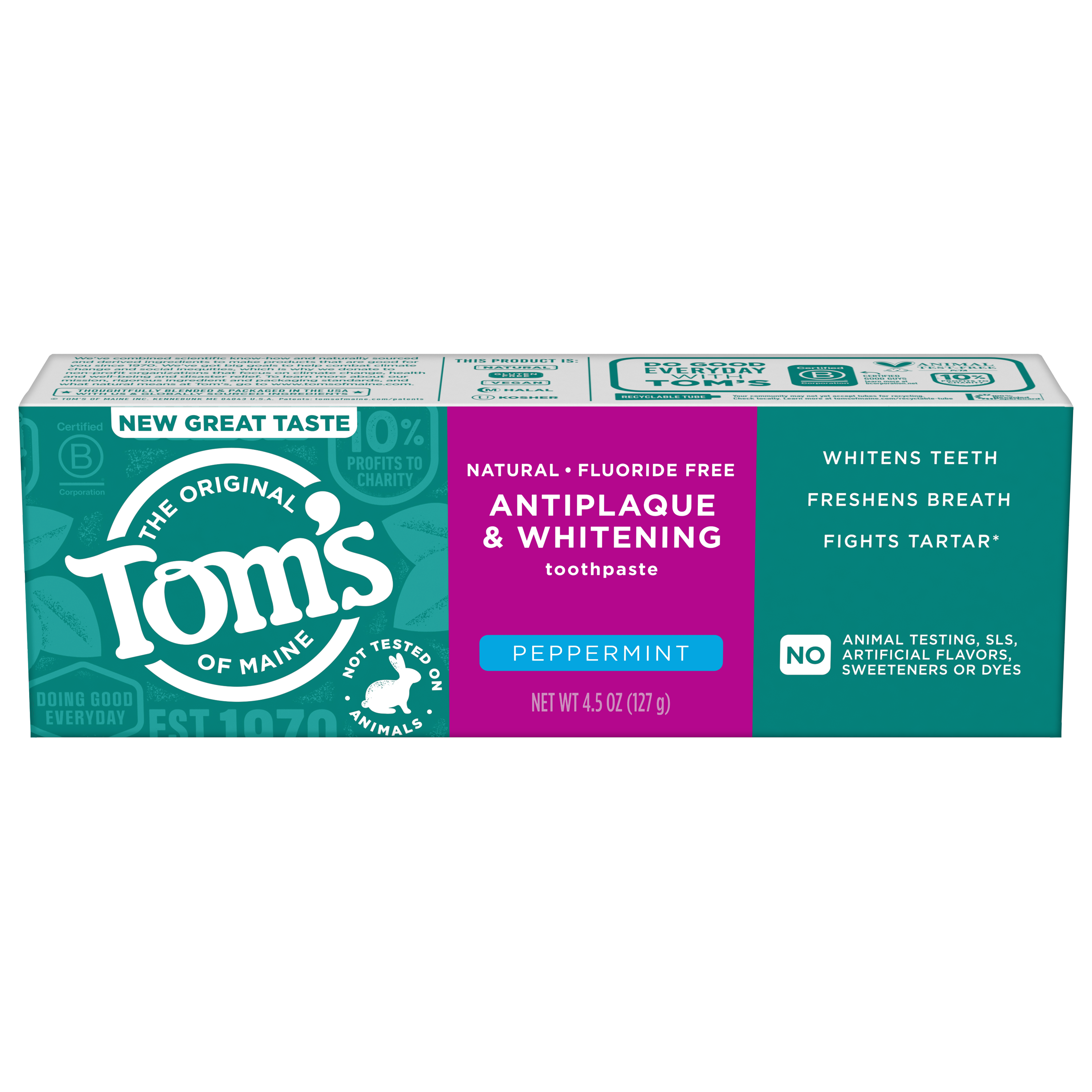Tom’s of Maine Antiplaque and Whitening Toothpaste, Fluoride Free, Peppermint, Single, 4.5 Oz