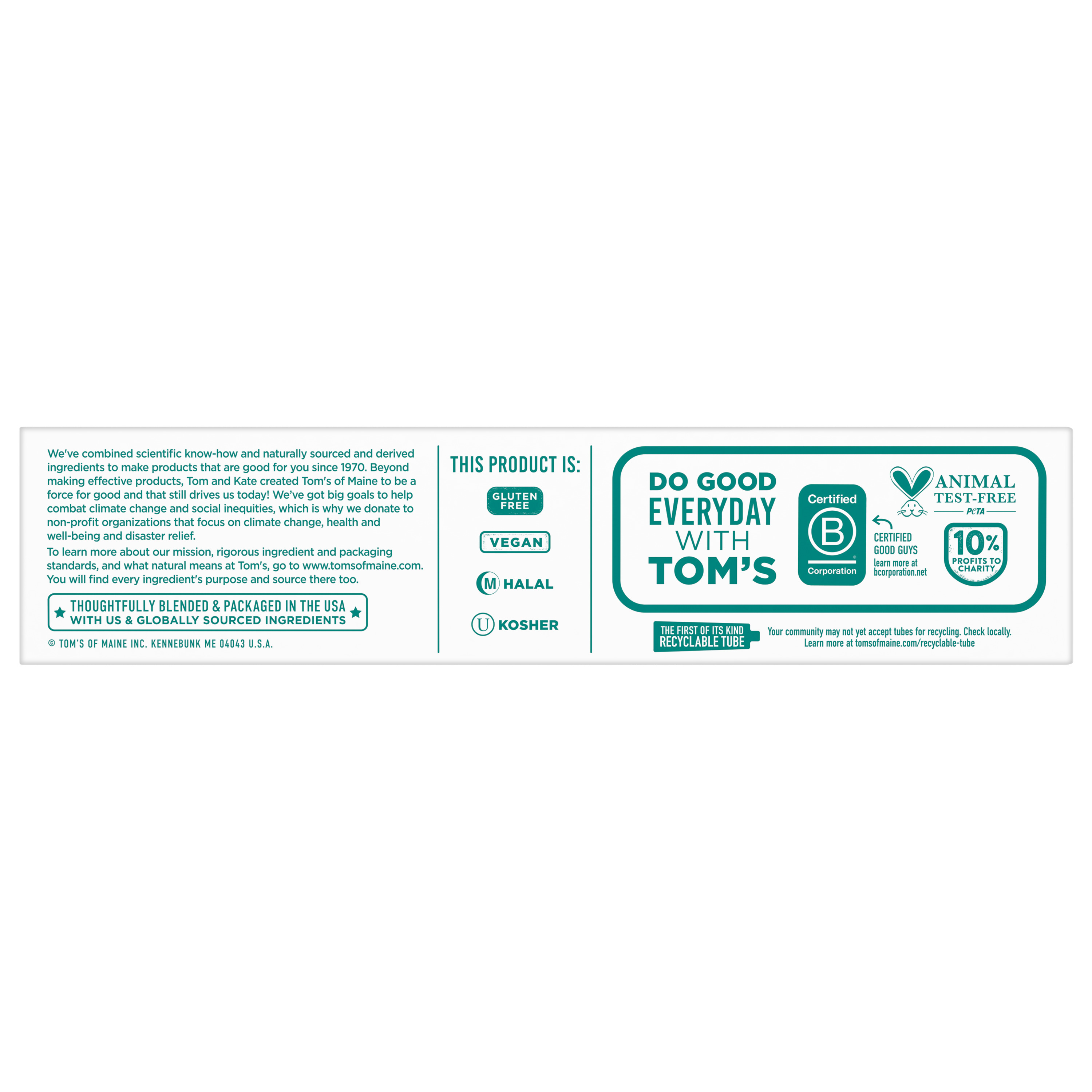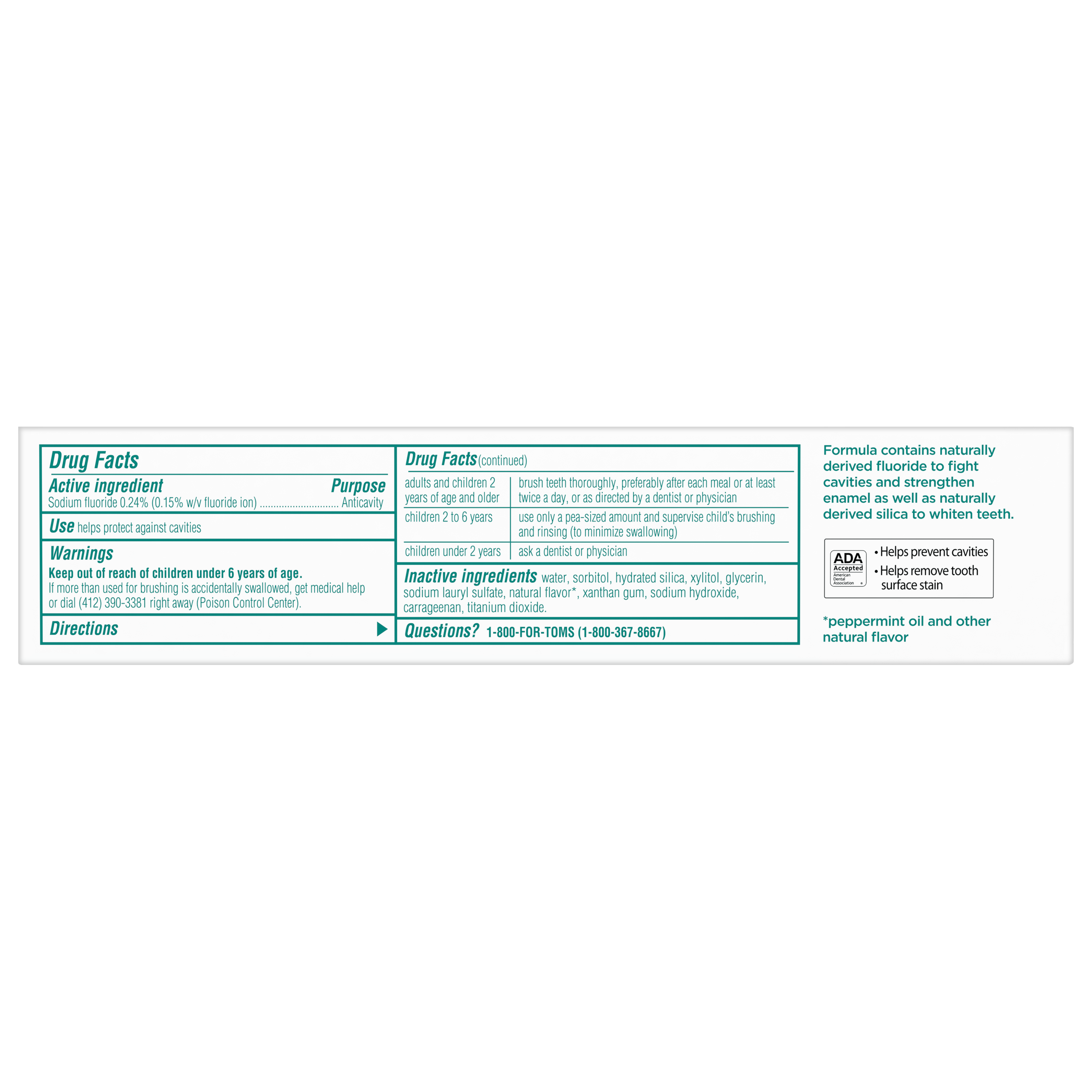 SKU 61038020 Consumer Unit - GTIN 00827854011699 Case - GTIN 10827854011696 Product Category Oral Care Product Sub Category Toothpaste Product Equity (Brand) Tom's of Maine Product Sub Brand Tom's Simply White TP Product Title Tom’s of Maine Simply White Anticavity Toothpaste with Fluoride, Clean Mint Product Description Bring back the natural beauty of your smile with the Tom’s of Maine Simply White Anticavity Toothpaste with Fluoride. This enamel repair toothpaste helps remineralize enamel for strong teeth and uses naturally derived silica to remove surface stains without using bleaching chemicals. Plus, it comes in a refreshing Clean Mint flavor to keep your breath minty fresh while you brush. Tom’s of Maine Simply White Mint Enamel Strengthening Toothpaste is a natural toothpaste with fluoride that is clinically proven to whiten teeth. This cavity protection toothpaste contains naturally derived fluoride which helps fight cavities and strengthen enamel and also contains naturally derived silica to whiten teeth. Tom's of Maine Simply White Anticavity Toothpaste is a mint toothpaste that is free from artificial flavors, sweeteners, dyes, and has not been tested on animals. Now that’s something you can feel good about. eCommerce Copy- Long Description Bring back the natural beauty of your smile with the Tom’s of Maine Simply White Anticavity Toothpaste with Fluoride. This enamel repair toothpaste helps remineralize enamel for strong teeth and uses naturally derived silica to remove surface stains without using bleaching chemicals. Plus, it comes in a refreshing Clean Mint flavor to keep your breath minty fresh while you brush. Tom’s of Maine Simply White Mint Enamel Strengthening Toothpaste is a natural toothpaste with fluoride that is clinically proven to whiten teeth. This cavity protection toothpaste contains naturally derived fluoride which helps fight cavities and strengthen enamel and also contains naturally derived silica to whiten teeth. Tom's of Maine Simply White Anticavity Toothpaste is a mint toothpaste that is free from artificial flavors, sweeteners, dyes, and has not been tested on animals. Now that’s something you can feel good about. Bullet 1 Includes one (1) 4.0 oz tube of Tom’s of Maine Simply White Anticavity Toothpaste with Fluoride, Clean Mint Toothpaste Bullet 2 Natural whitening toothpaste contains naturally derived silica which helps remove surface stains for whiter teeth Bullet 3 Refreshing Clean Mint toothpaste flavor helps freshen breath every time you brush with this fluoride toothpaste Bullet 4 Tom’s of Maine Simply White Mint Anticavity Toothpaste is a remineralizing toothpaste that is clinically proven to help whiten teeth Bullet 5 Anticavity toothpaste is made with fluoride to help fight cavities, and helps remove surface stains for whiter teeth Bullet 6 Free from artificial flavors, sweeteners, and dyes and has not been tested on animals Bullet 7 Choose a natural enamel toothpaste that’s right for your oral care needs with this whitening enamel repair toothpaste from Tom’s of Maine Bullet 8 Experience a bright smile with the Tom’s of Maine Simply White Anticavity Toothpaste with Fluoride Active Ingredients Sodium Fluoride 0.24 % (0.15% w/v fluoride ion)