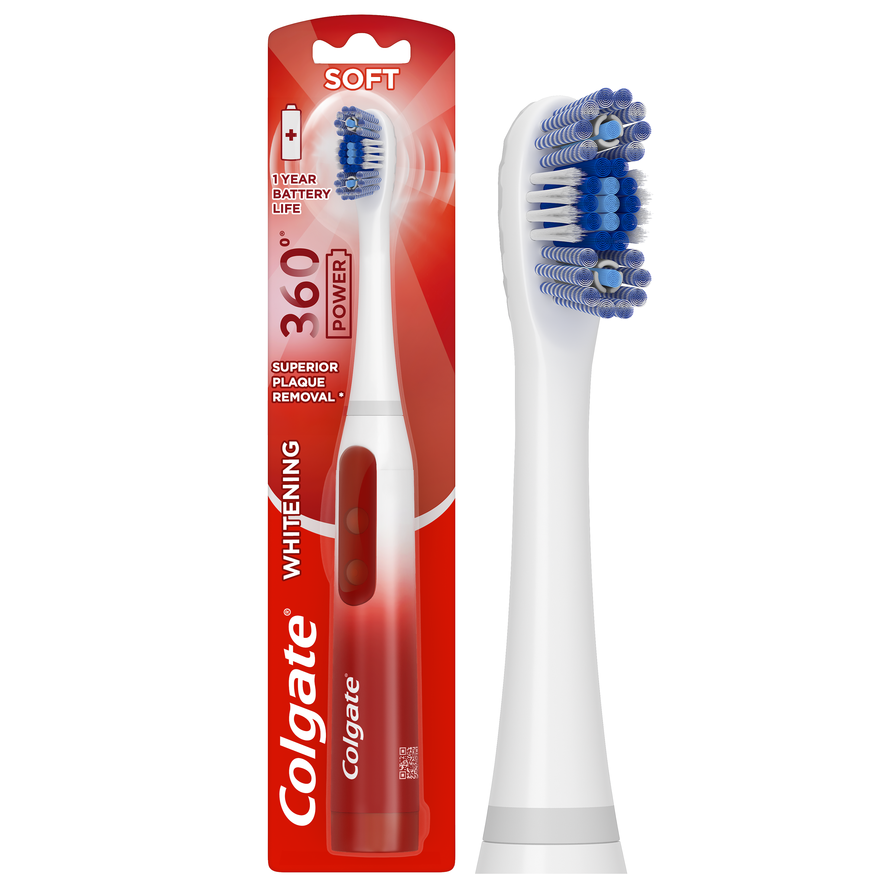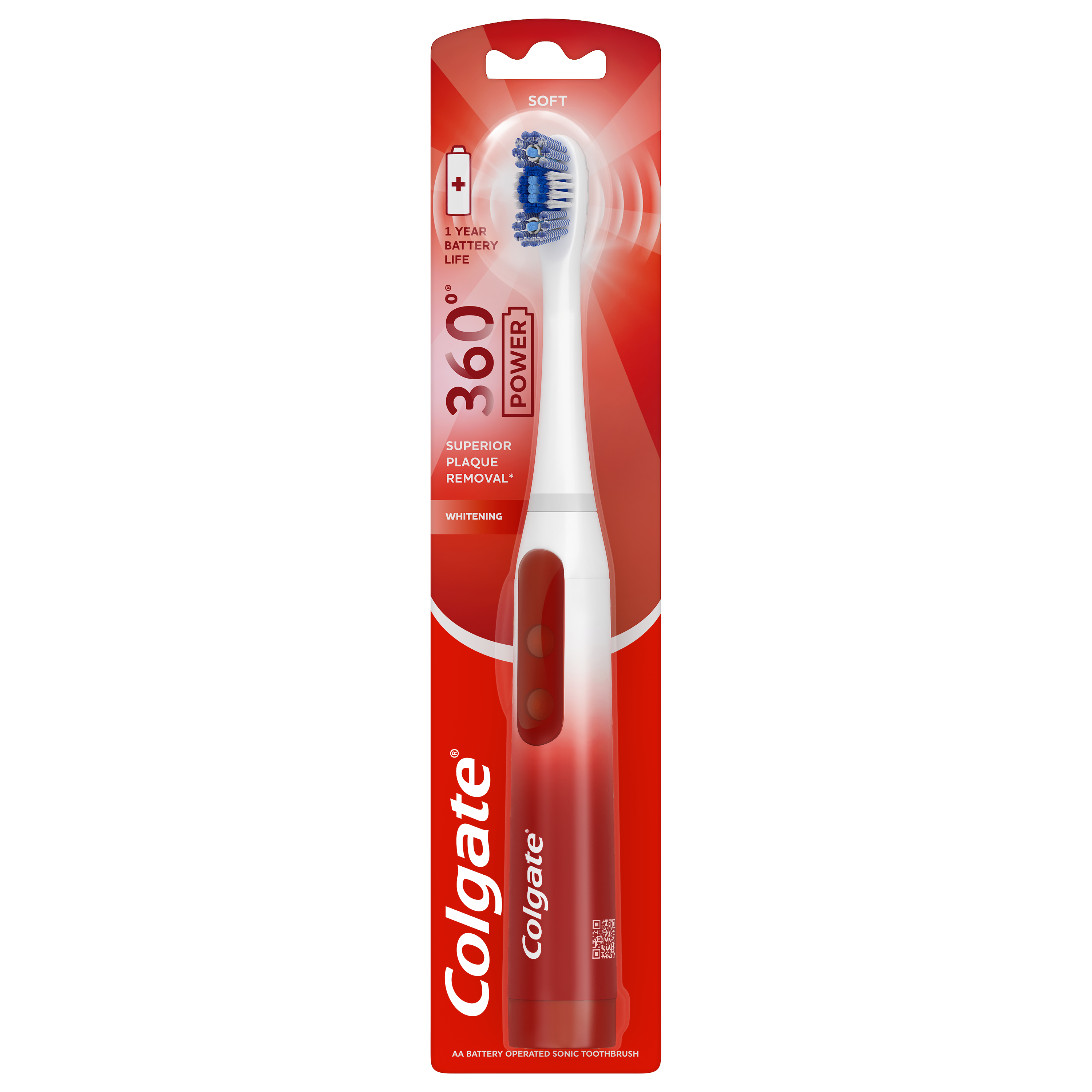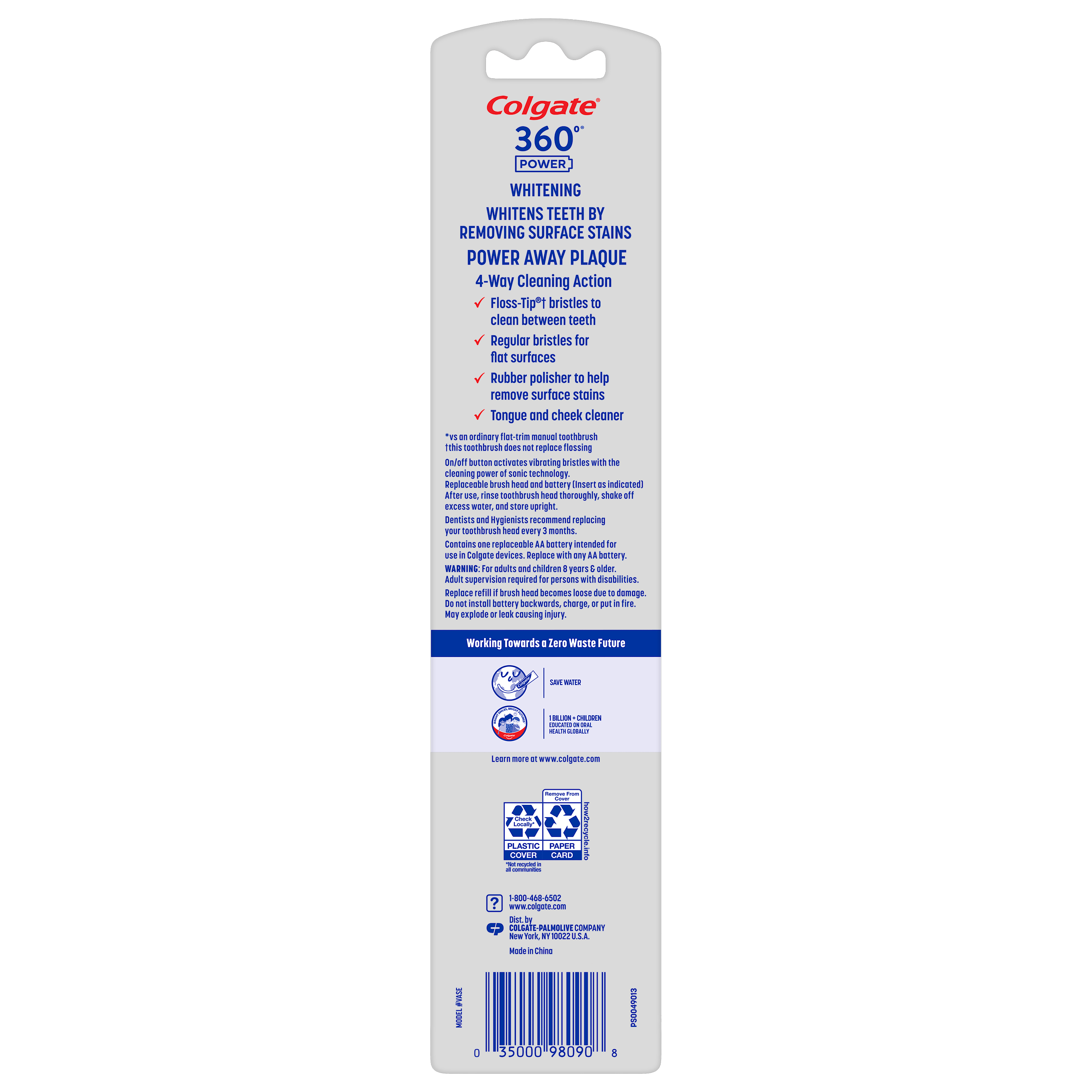 SKU 61038057 Consumer Unit - GTIN 0035000980908 Case - GTIN 10035000980905 Product Category Oral Care Product Sub Category Battery TB Product Equity (Brand) Colgate Product Sub Brand Colgate 360 ASB BTB Product Title Colgate 360 Power Whitening Battery Toothbrush eCommerce Copy- Long Description Colgate 360 Power Whitening Battery Toothbrush The Colgate 360 Power Whitening Battery Toothbrush removes more stains* for a bright smile. This battery powered toothbrush uses soft Floss Tip bristles** to clean between teeth. The adult whitening toothbrush is perfect for travel because it’s battery powered, so it can be used wherever you go (1 AA battery included). Clean Four Different Ways Colgate 360 Power Whitening Battery Toothbrush is designed to clean four different ways for a clean, fresh mouth. The soft Floss Tip bristles** clean between teeth and the regular bristles help clean flat surfaces. This soft toothbrush also features a rubber polisher to help remove surface stains and includes a tongue and cheek cleaner to help get rid of odor-causing bacteria. Replaceable Head for Longevity You can extend the product life of your Colgate 360 Battery Toothbrush by replacing the sonic toothbrush head with a new one after 3 months. Get the most out of your battery powered toothbrush with the Colgate 360 Power Whitening Battery Toothbrush. Healthy Smiles With Colgate At Colgate, we make products that promote healthy smiles. Not only because having a healthy smile is important to your overall health, but because when you have a healthy smile, you actually smile more – and that’s a powerful thing. Smiles are the simplest form of optimism, something we need now more than ever. That’s why we’re championing optimism – we are committed to creating a healthier planet and working every day to create healthy smiles for all. Everyone has the right to a bright smile. That’s why we’re committed to raising oral healthcare standards everywhere. Whether it’s building healthy new habits as kids or learning something new from the experts, we’re here for you. *vs. a regular flat trim manual toothbrush **does not replace flossing
